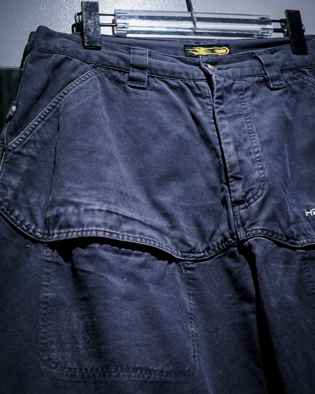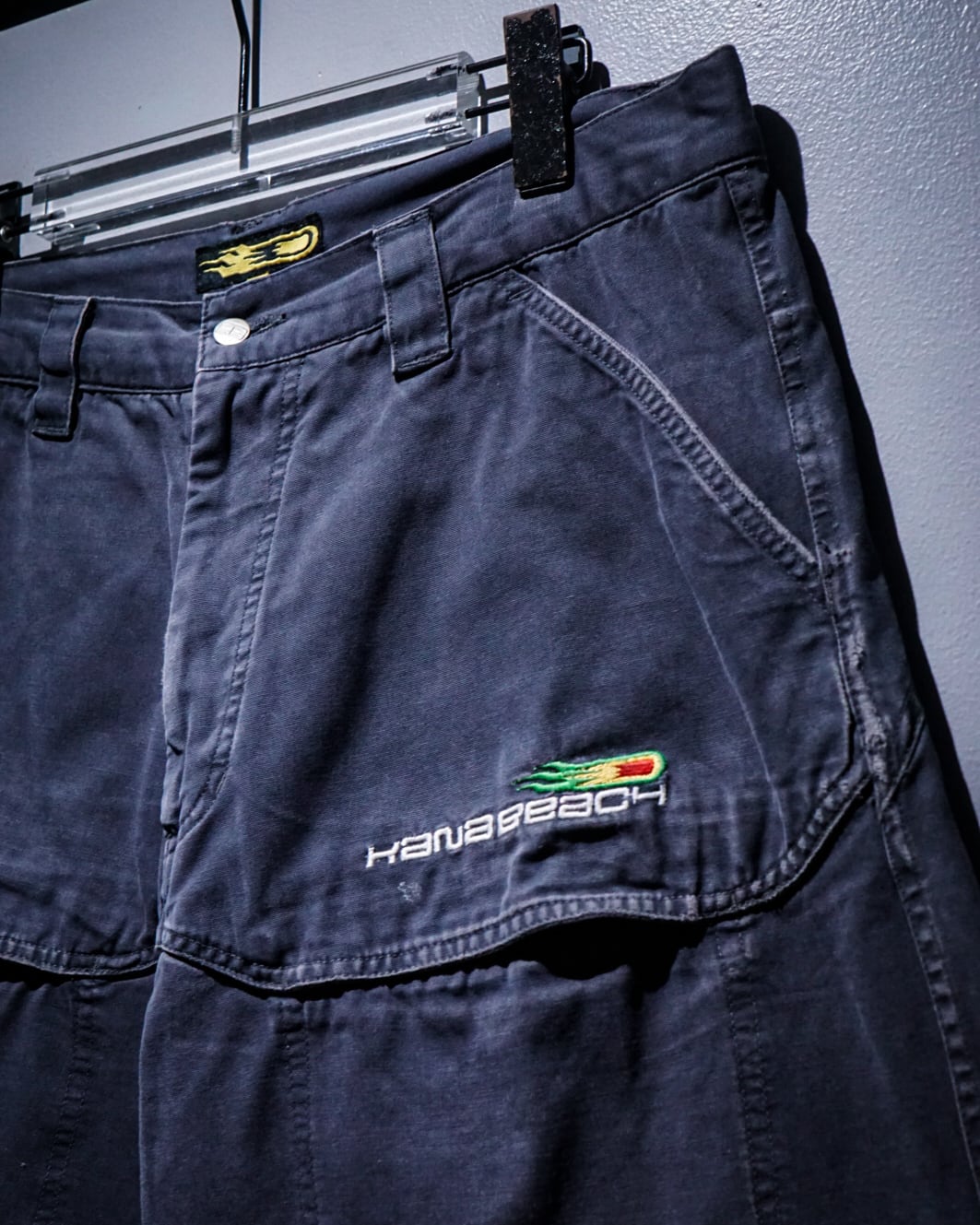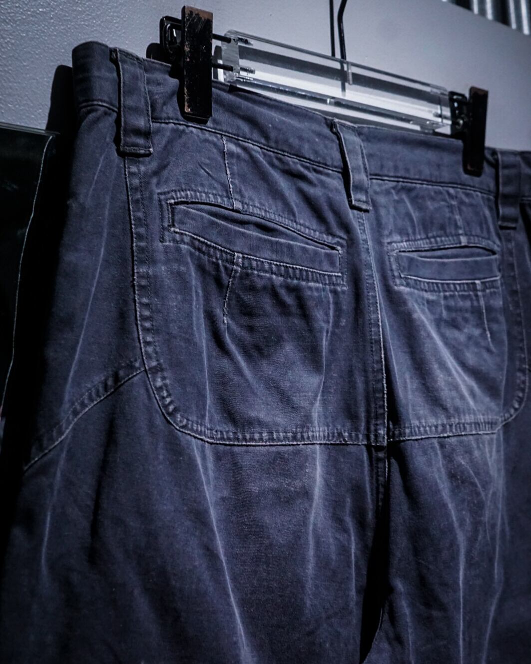 両サイドのスラッシュポケット&バックポケットに加え、フロントの切り替えを活用し、両腿にもポケットをプラスした機能的な一面も◎ワンポイントで施された刺繍によるアクセントもグッドです。