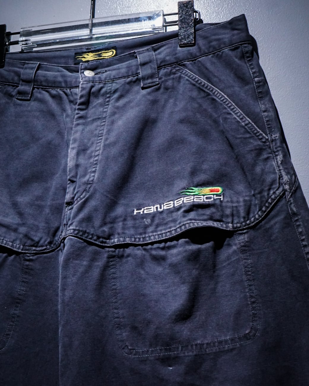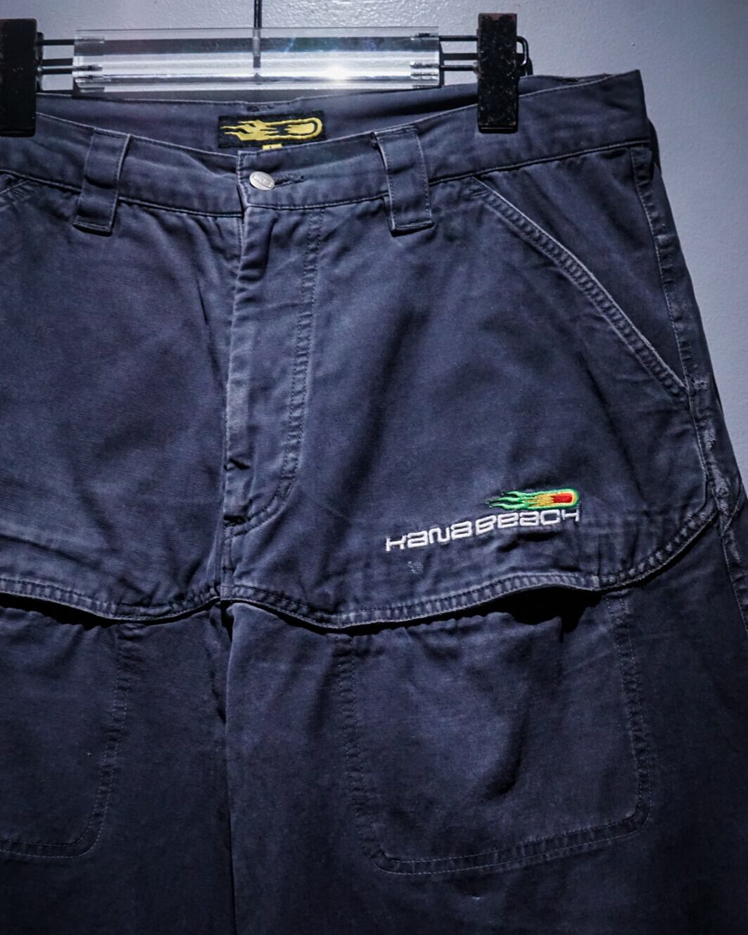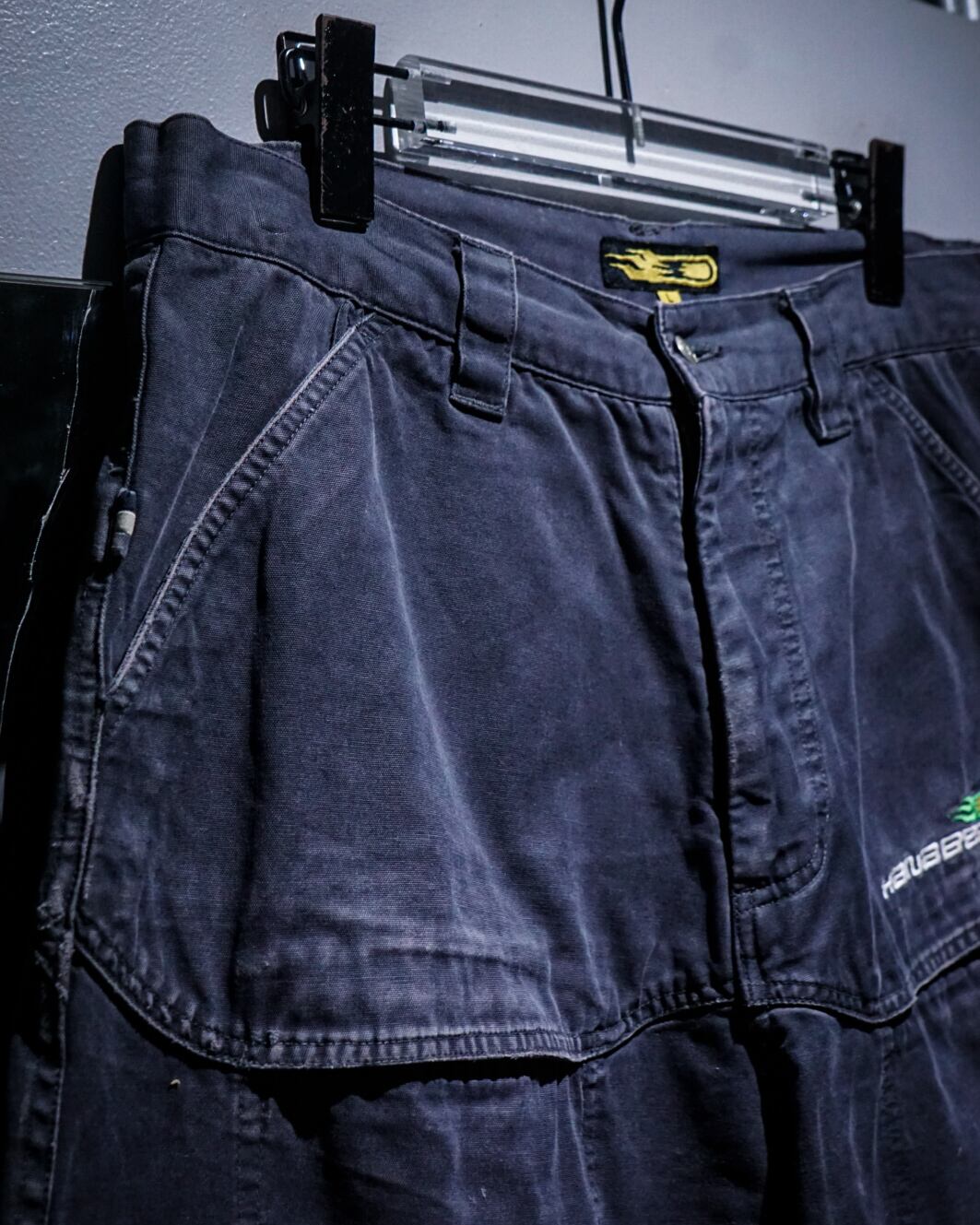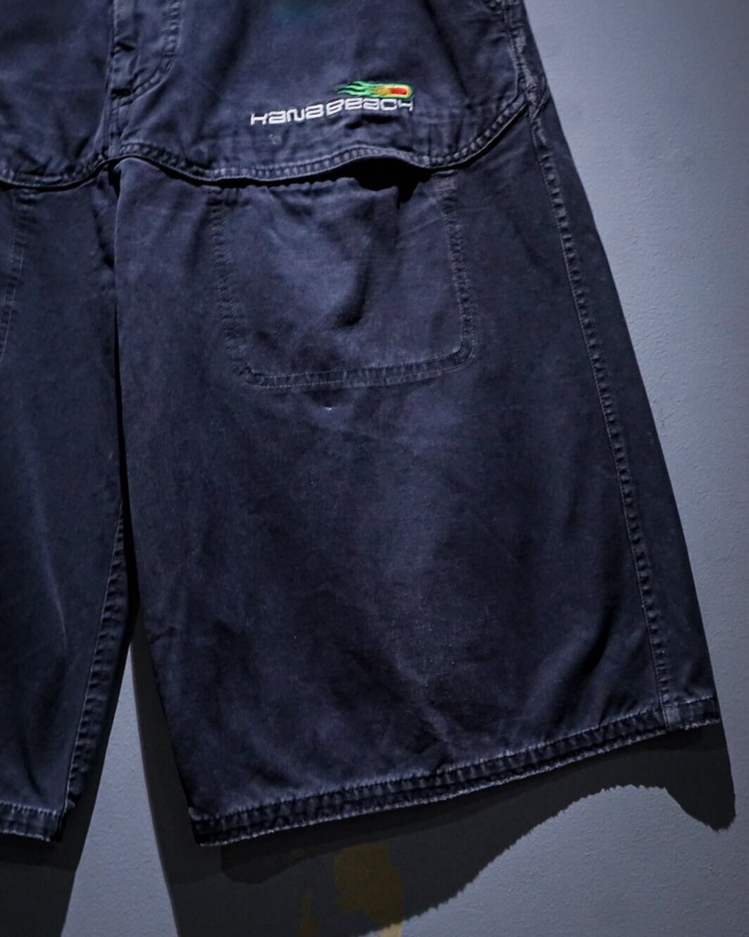 両サイドのスラッシュポケット&バックポケットに加え、フロントの切り替えを活用し、両腿にもポケットをプラスした機能的な一面も◎ワンポイントで施された刺繍によるアクセントもグッドです。