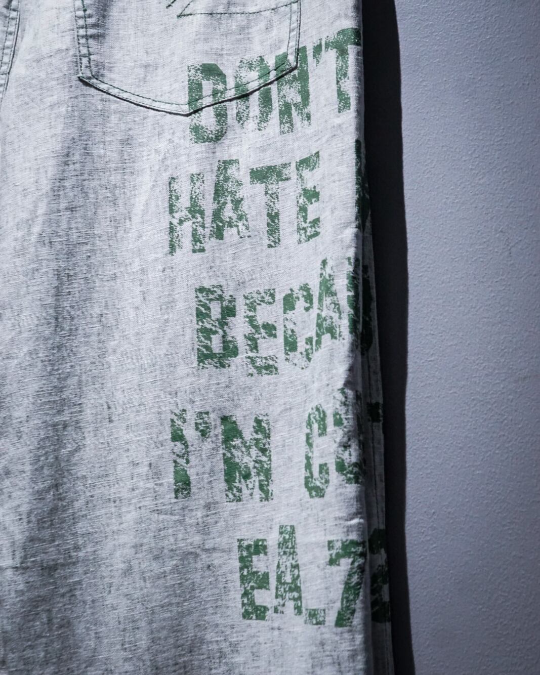 白×カーキの糸を用いた平織りで仕上げた事で生み出された、反対面の色味が表に現れた独特なカラーリングに、リネン特有の質感が掛け合わさる事で生み出された、退廃的かつモードな雰囲気漂うデザインも美しい、、、