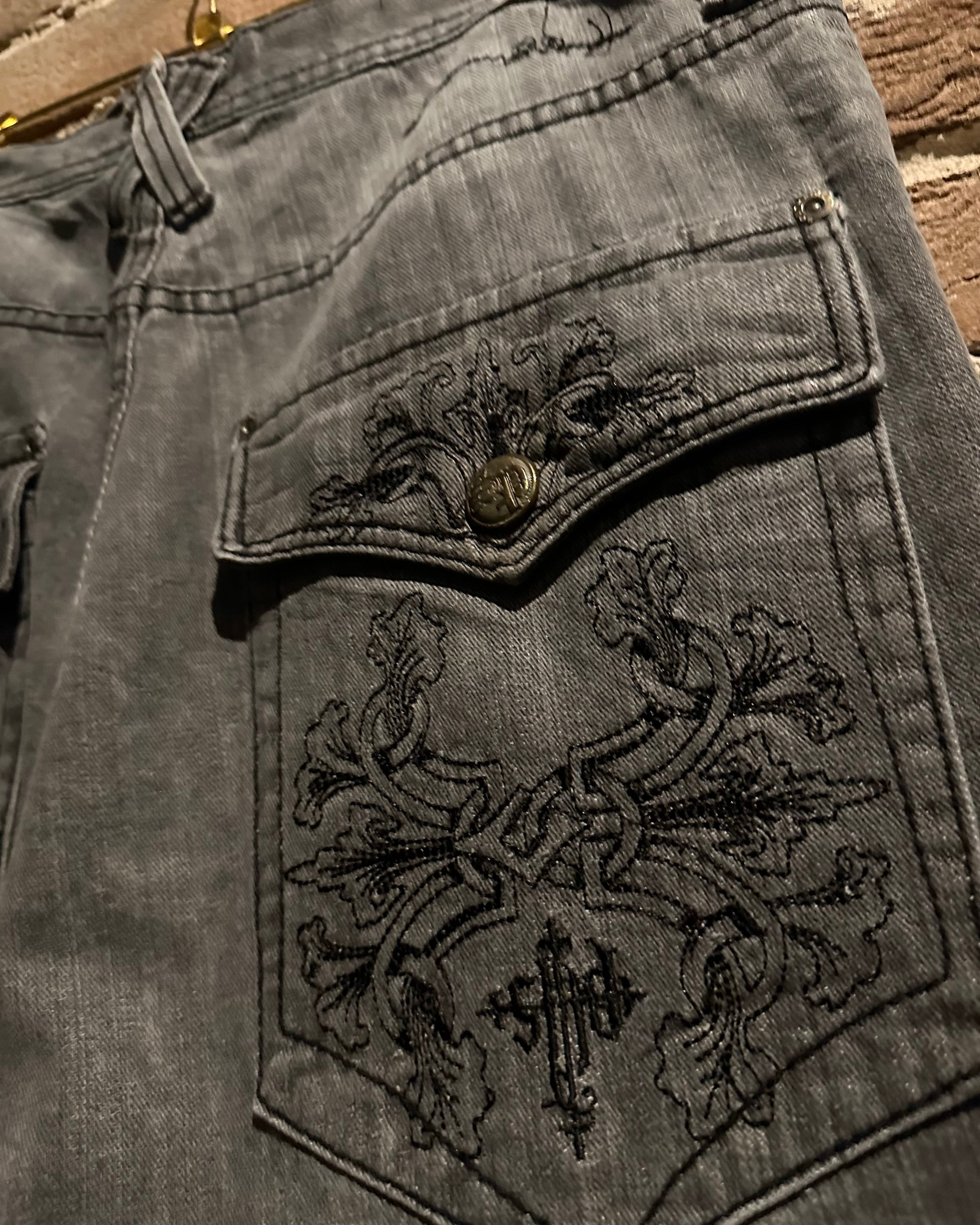 美しいフェード加工が施されたデニムをボディに使用し、バックポケットに繊細な刺繍が刻み込まれたバギーデニムショーツ。