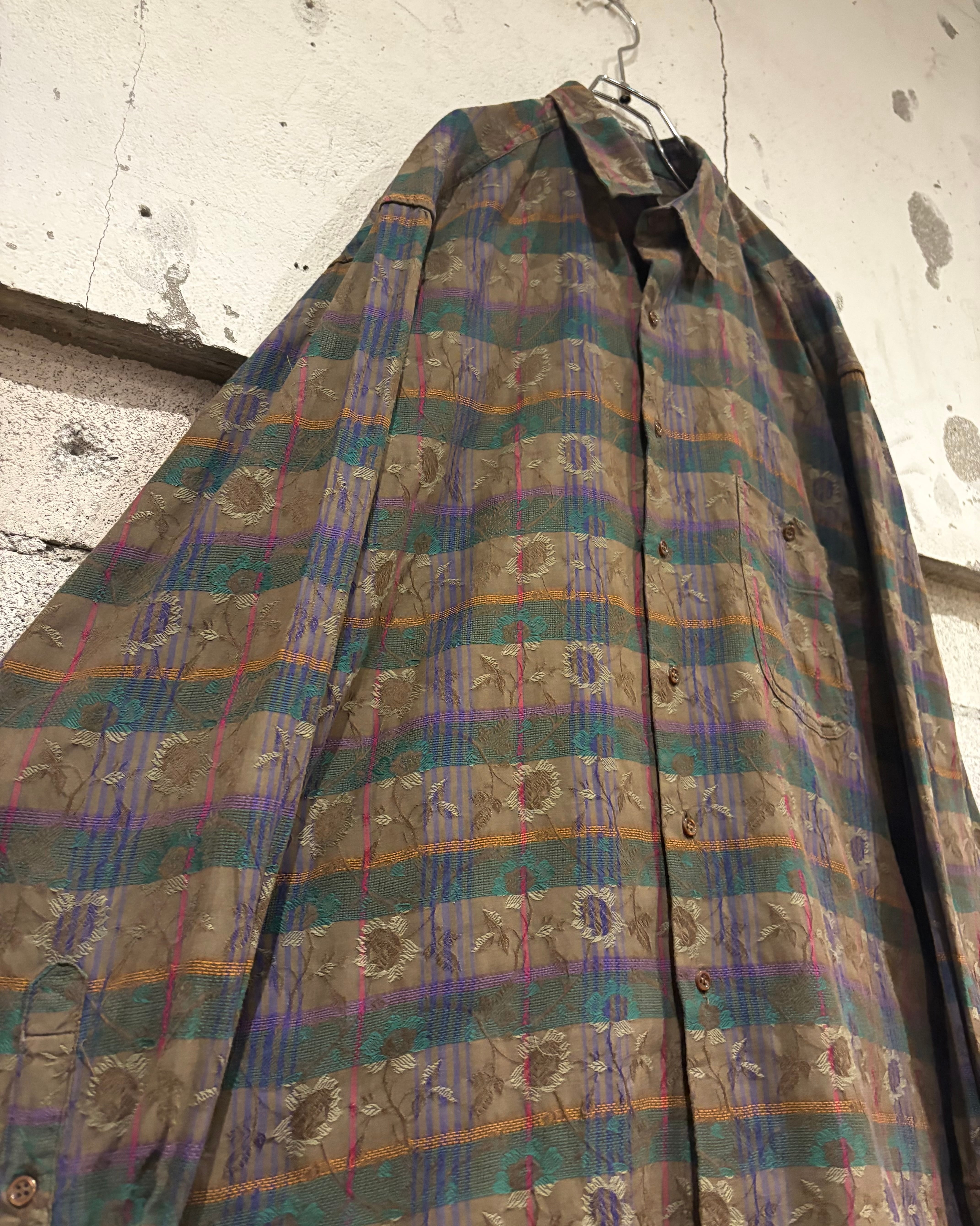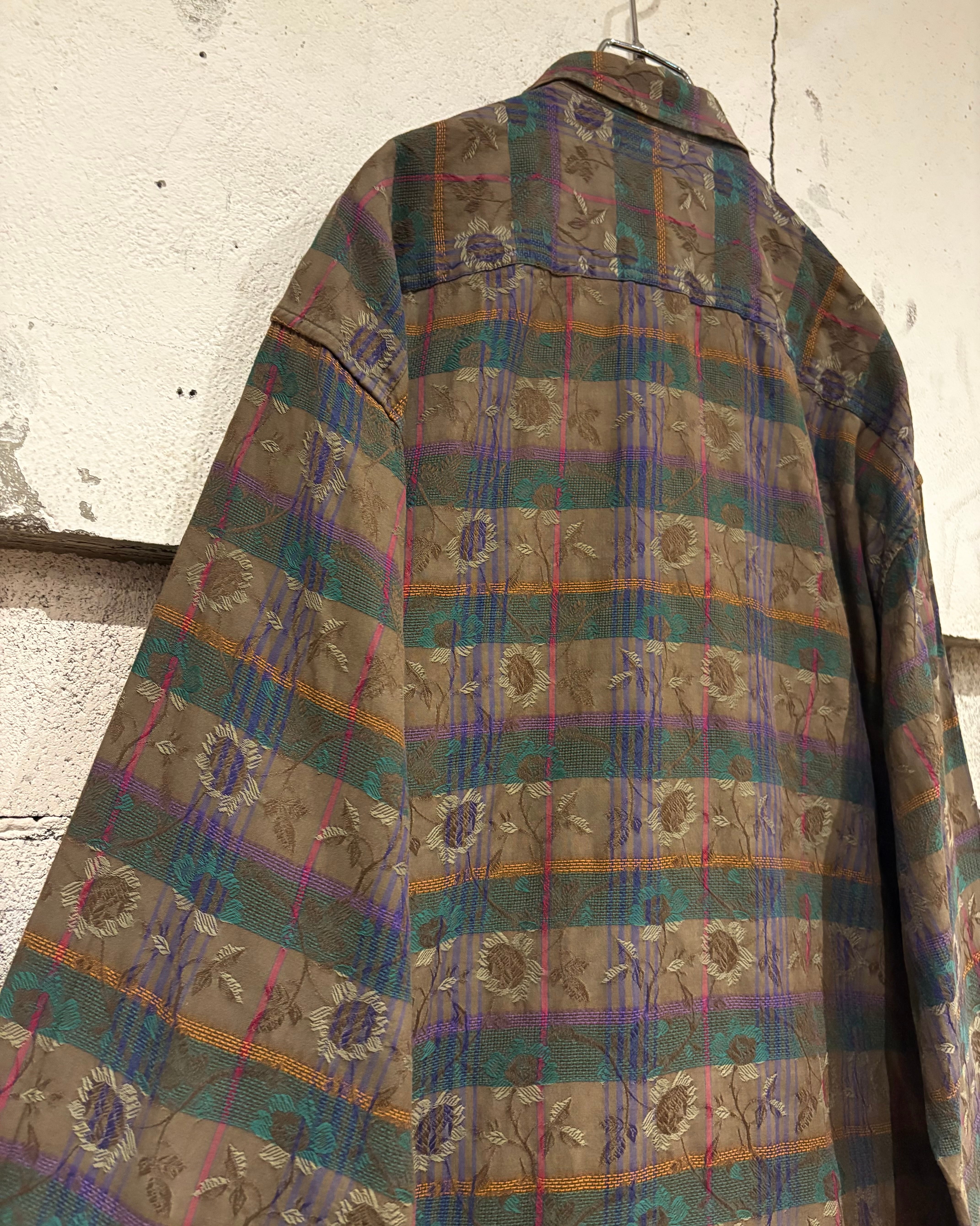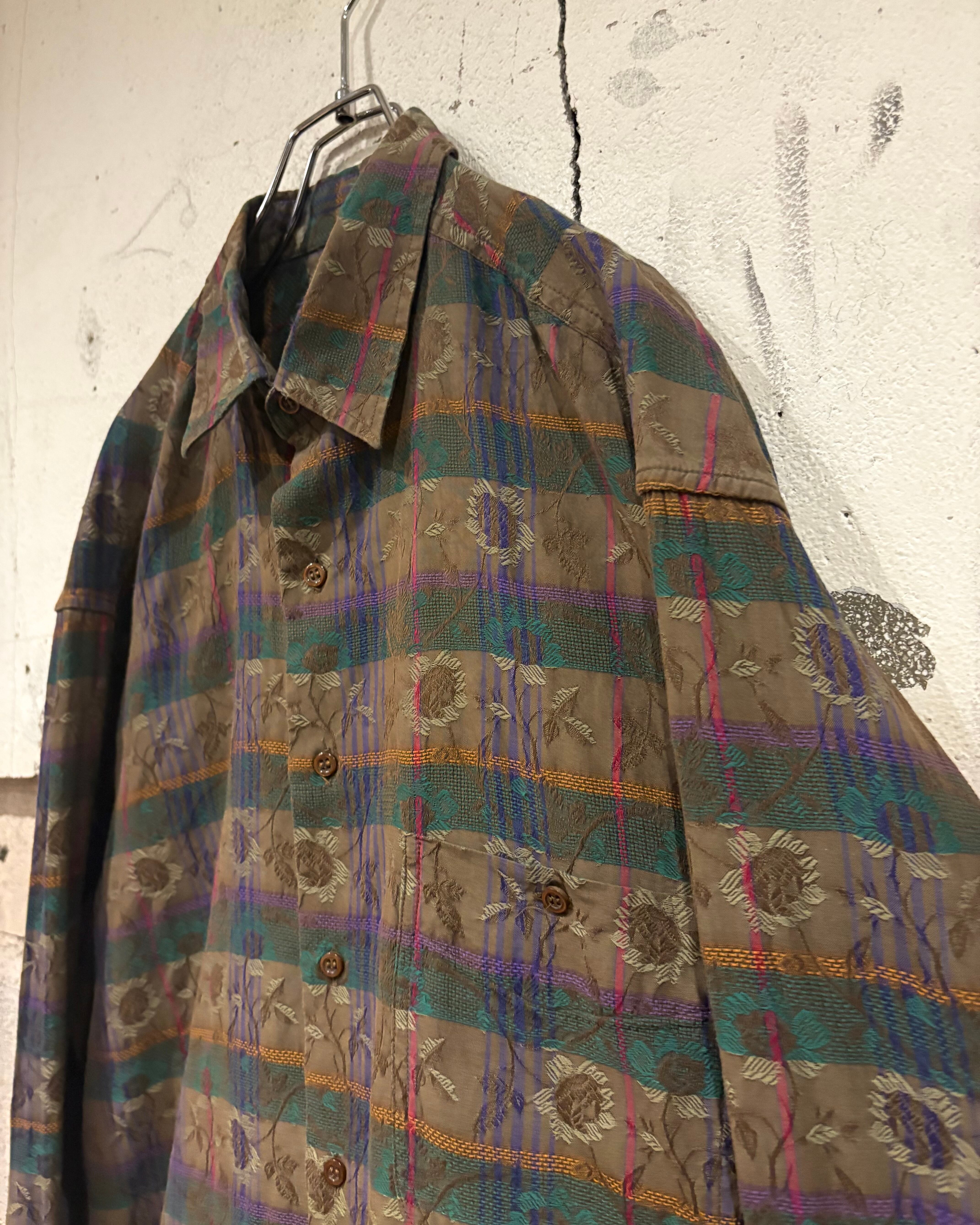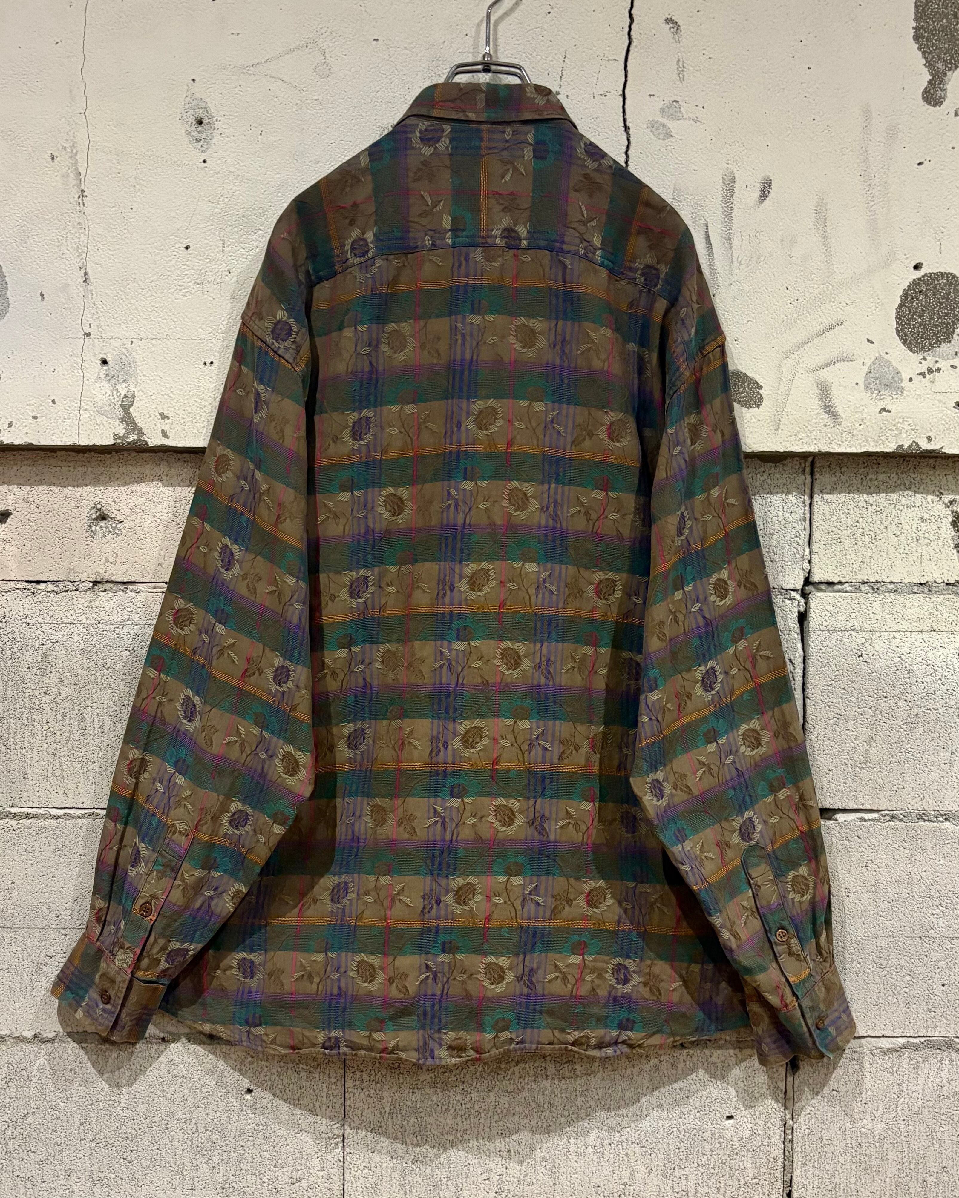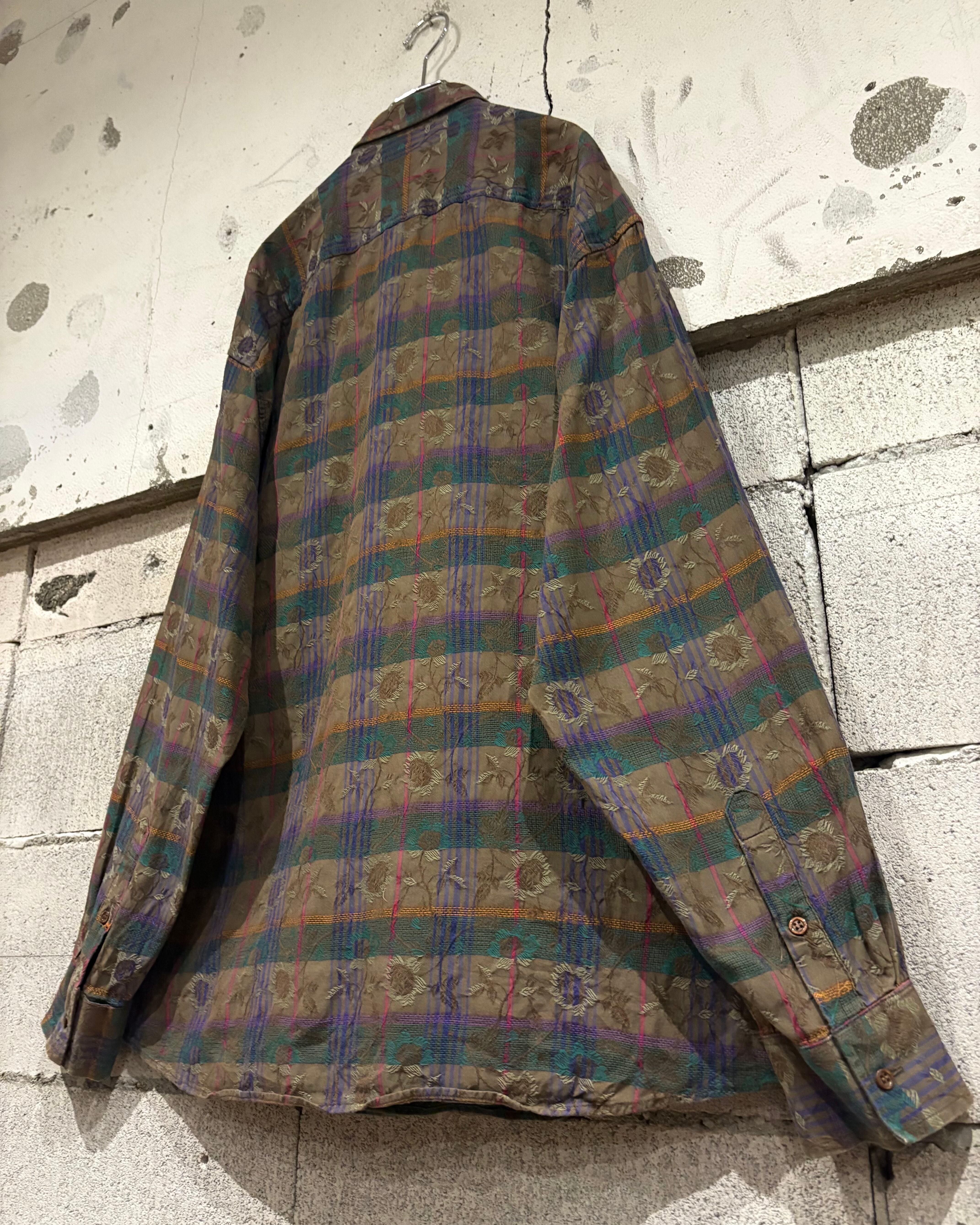 チェック柄のボディに、繊細な織りによって花柄をボディ全体に散りばめた長袖シャツ。