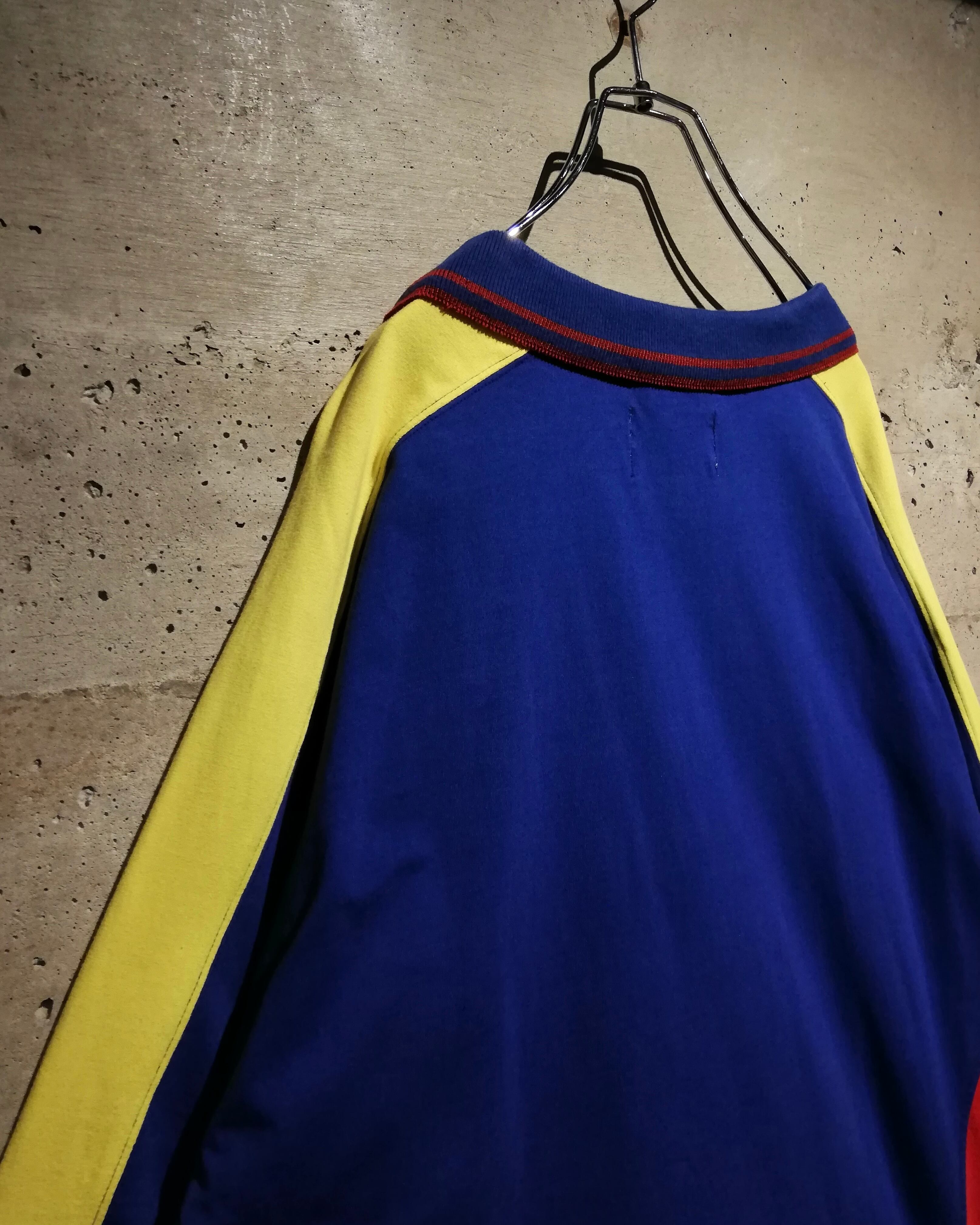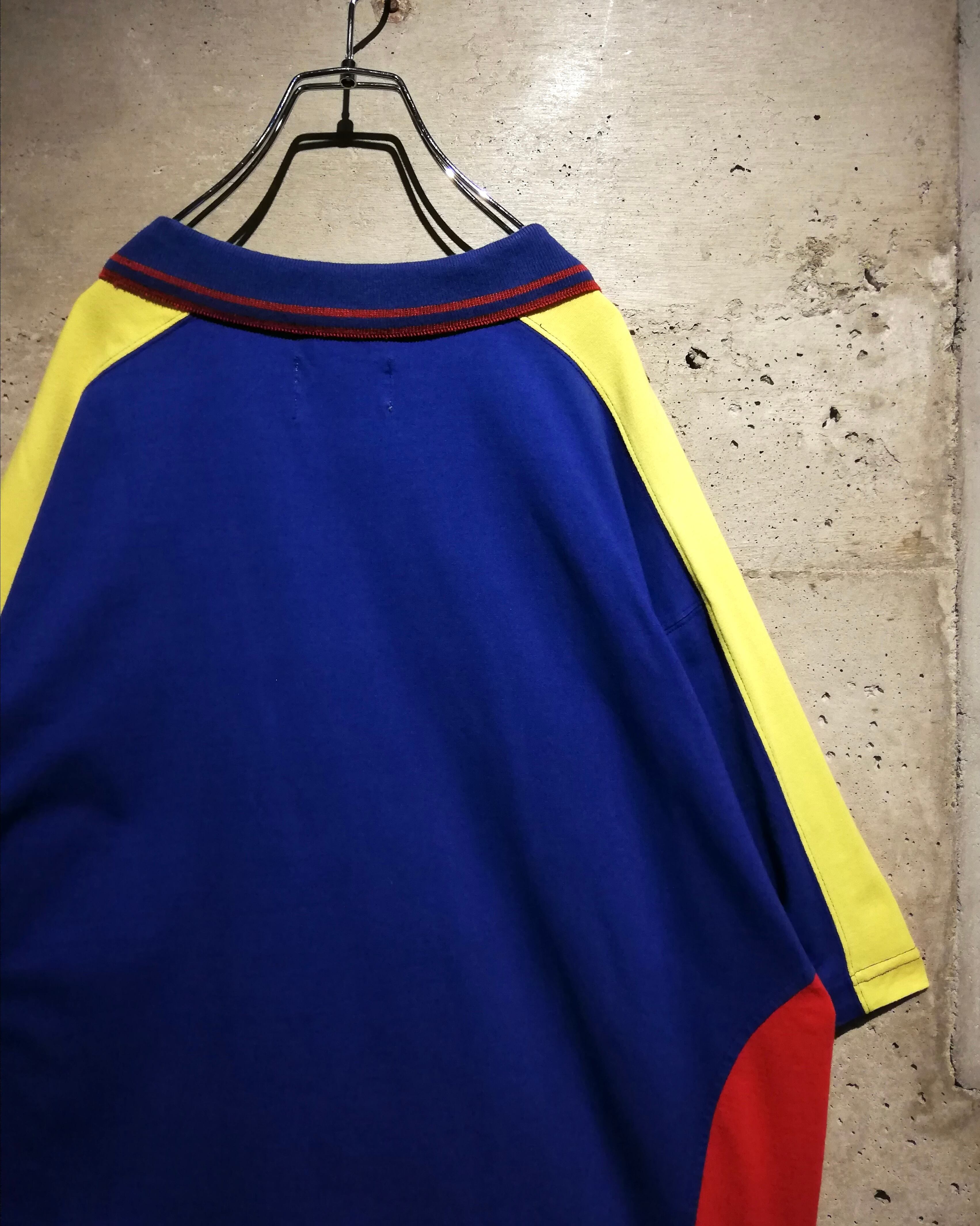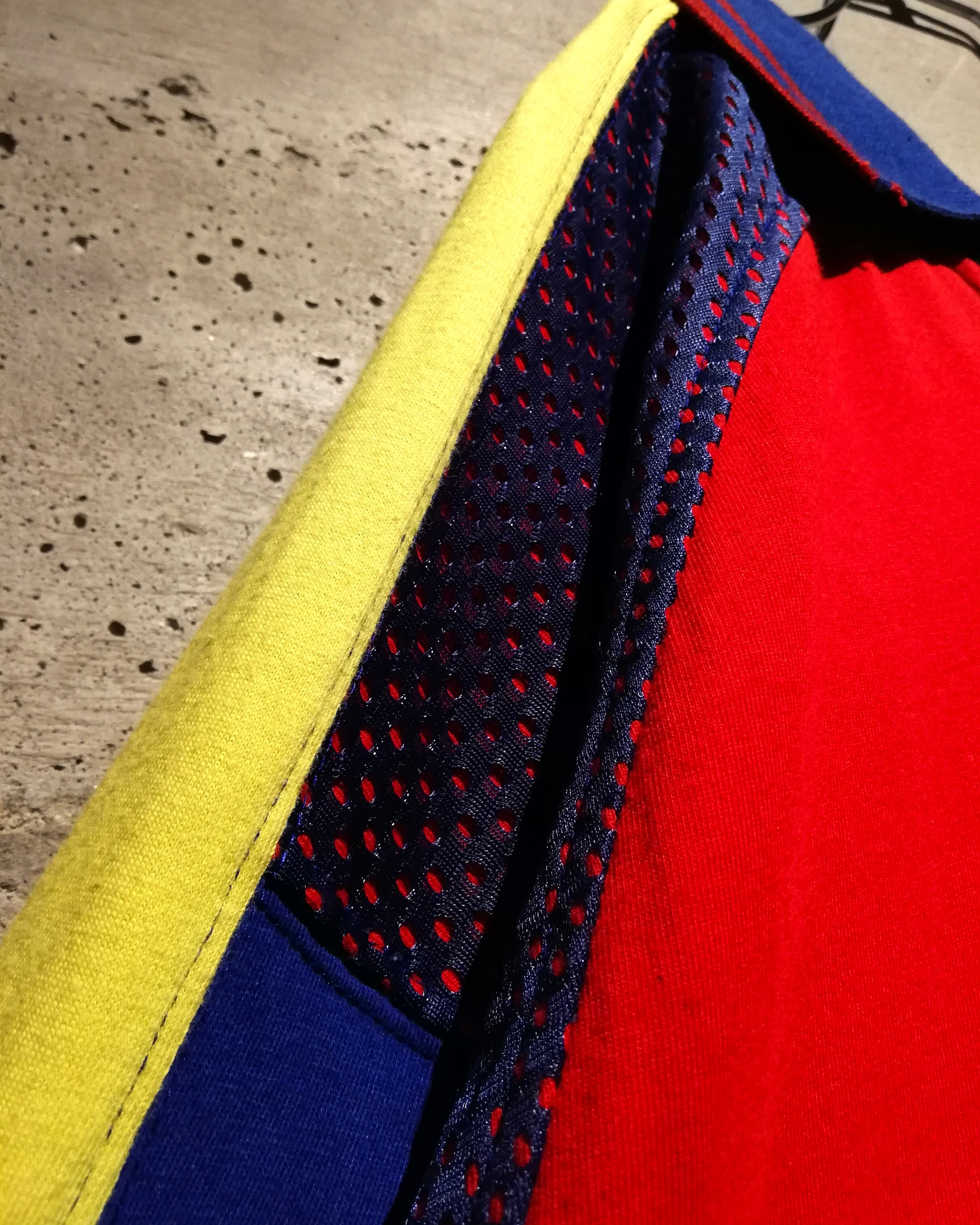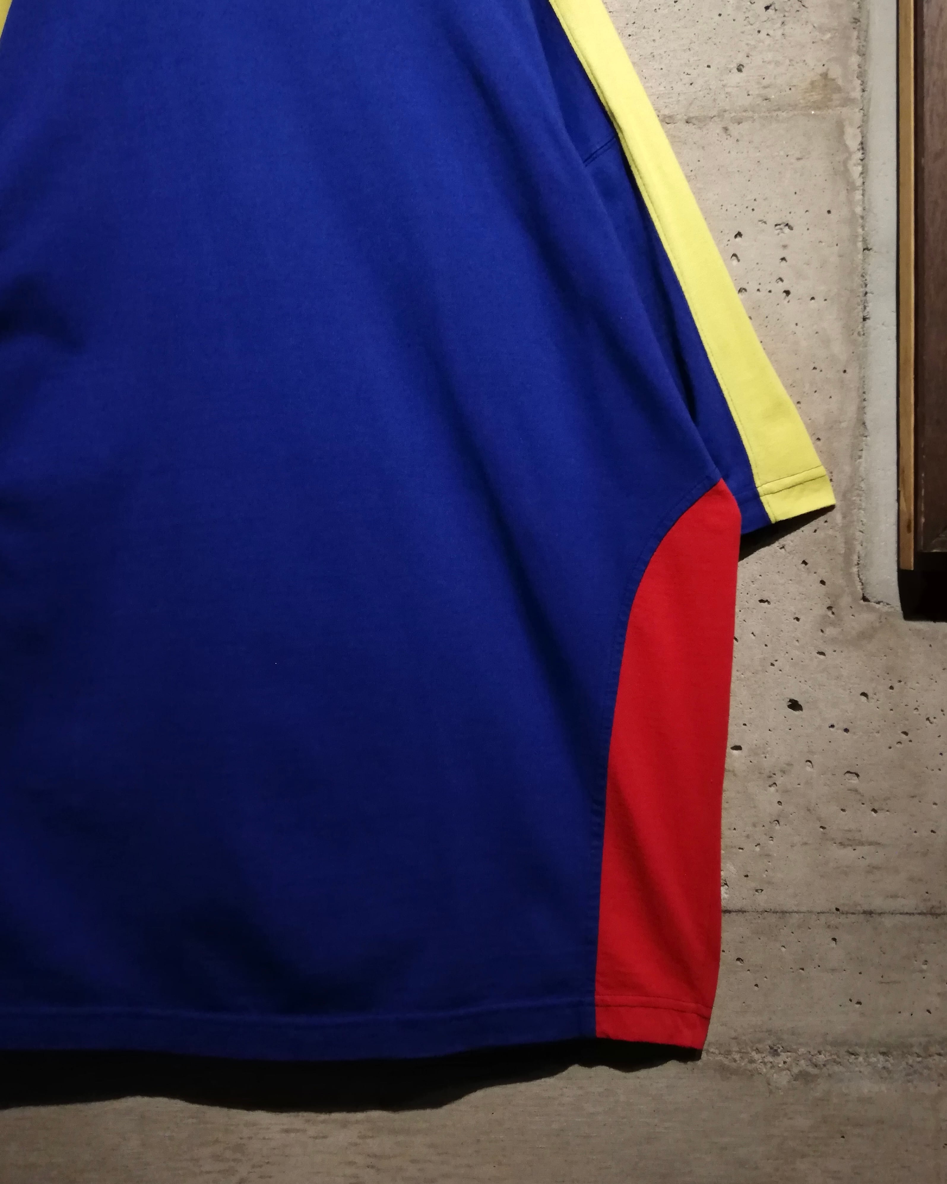 サラッとしたカットソー生地をボディに使用し、赤×青×黄の鮮やかなマルチカラーで切り替えたゲームシャツ。