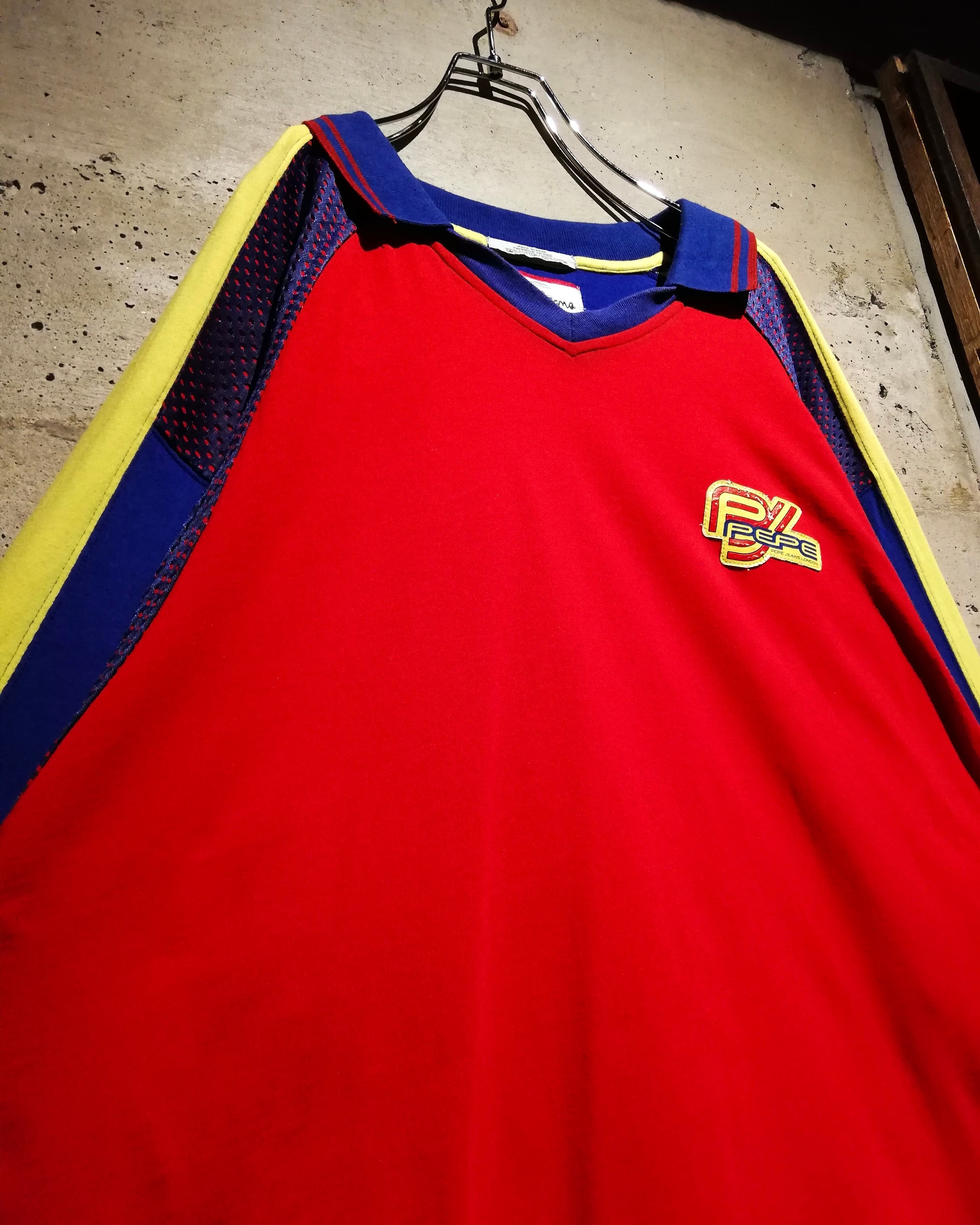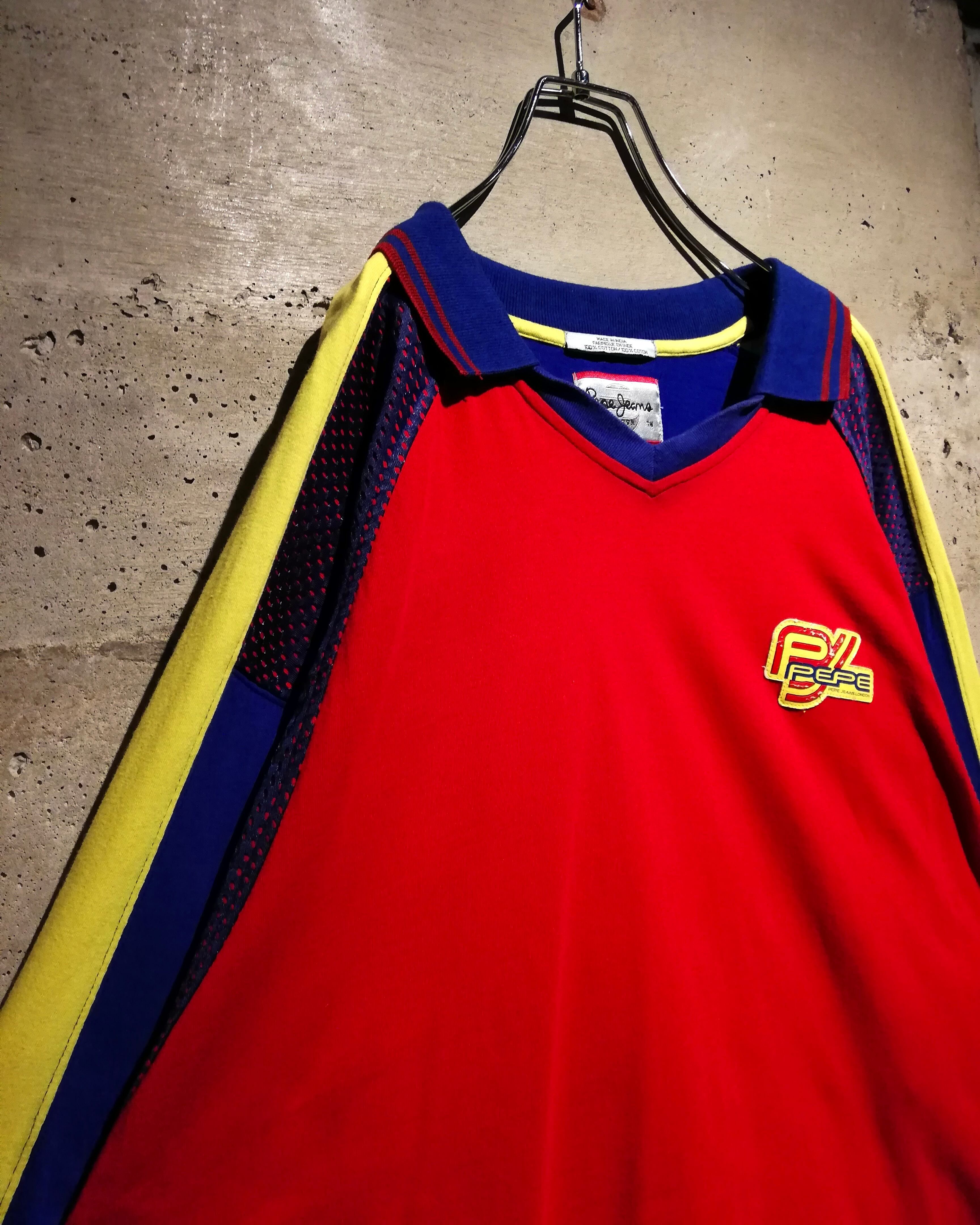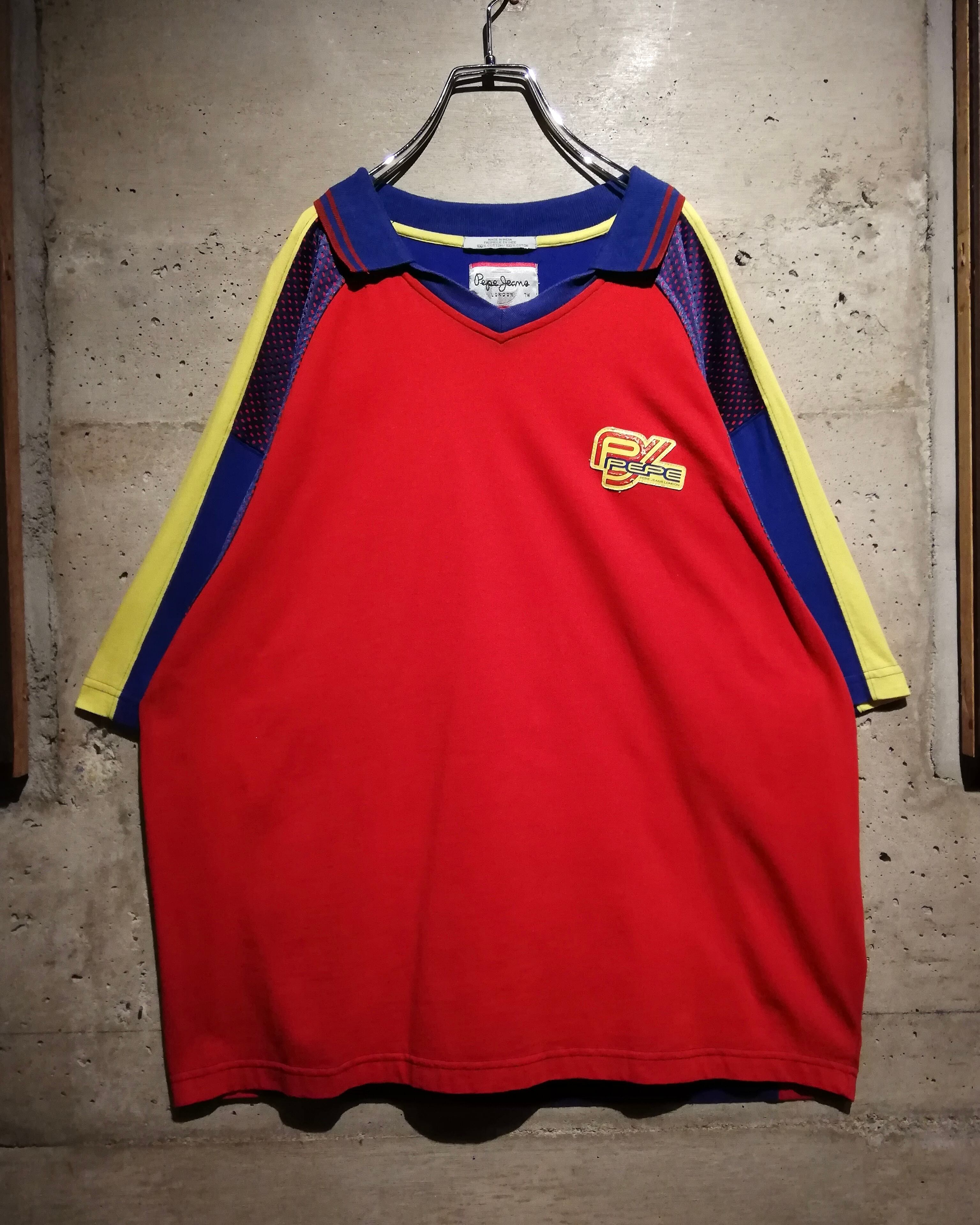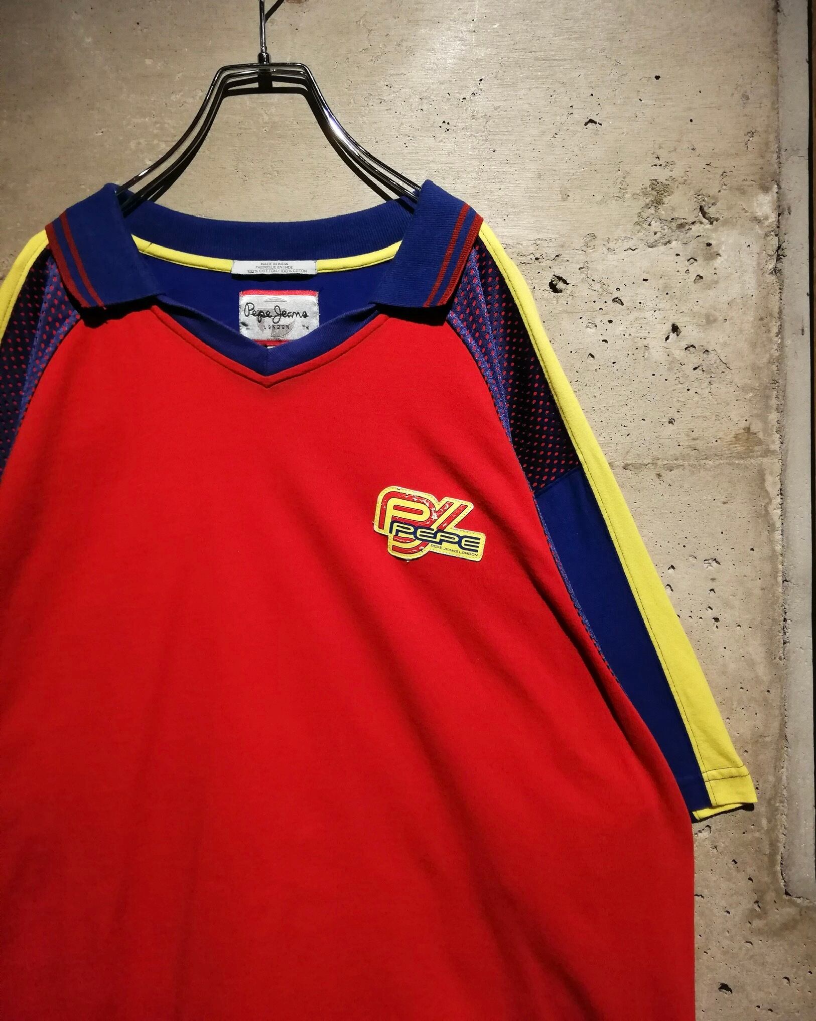 サラッとしたカットソー生地をボディに使用し、赤×青×黄の鮮やかなマルチカラーで切り替えたゲームシャツ。