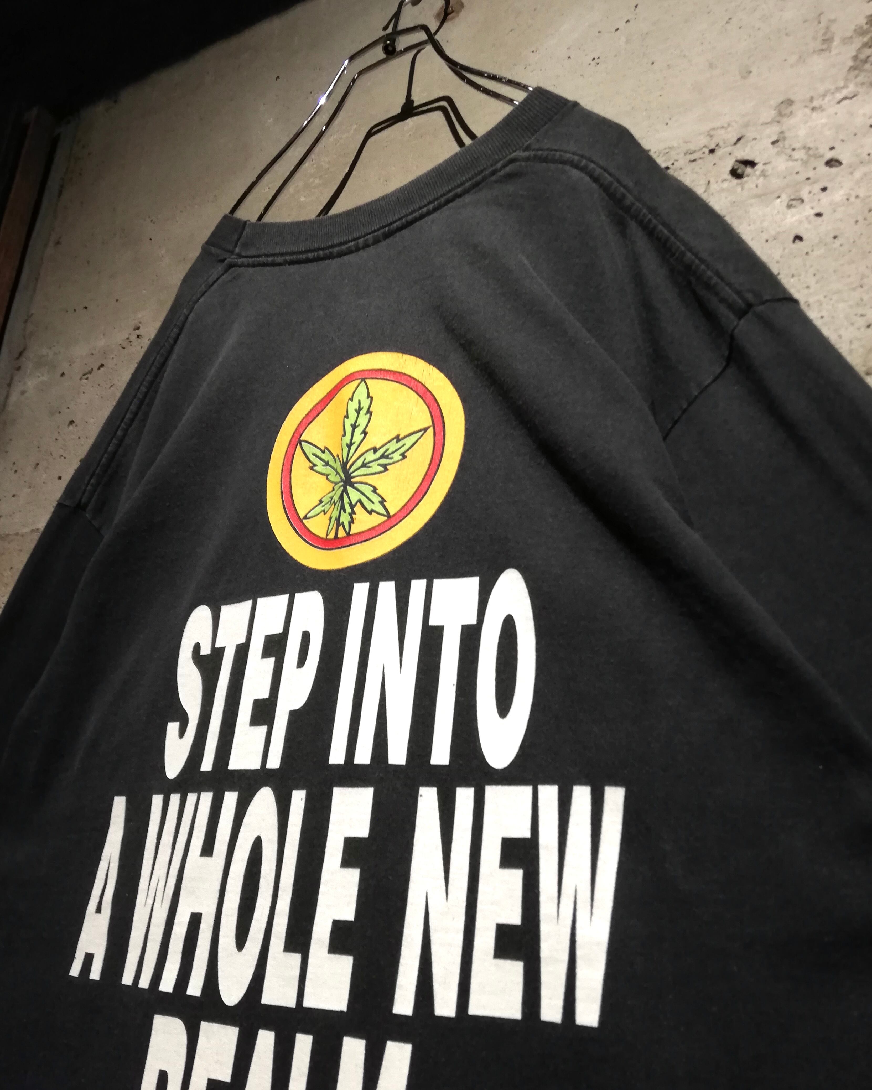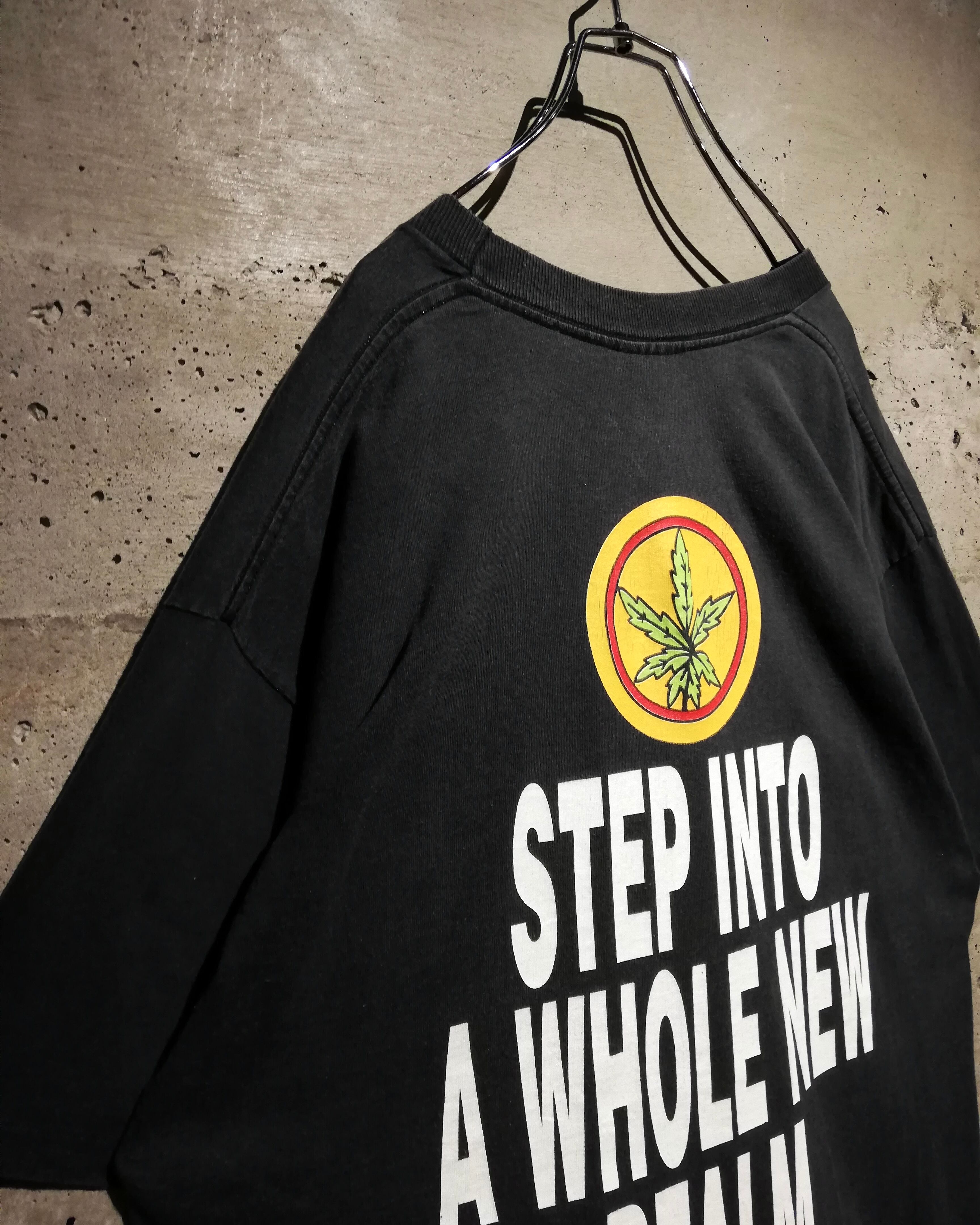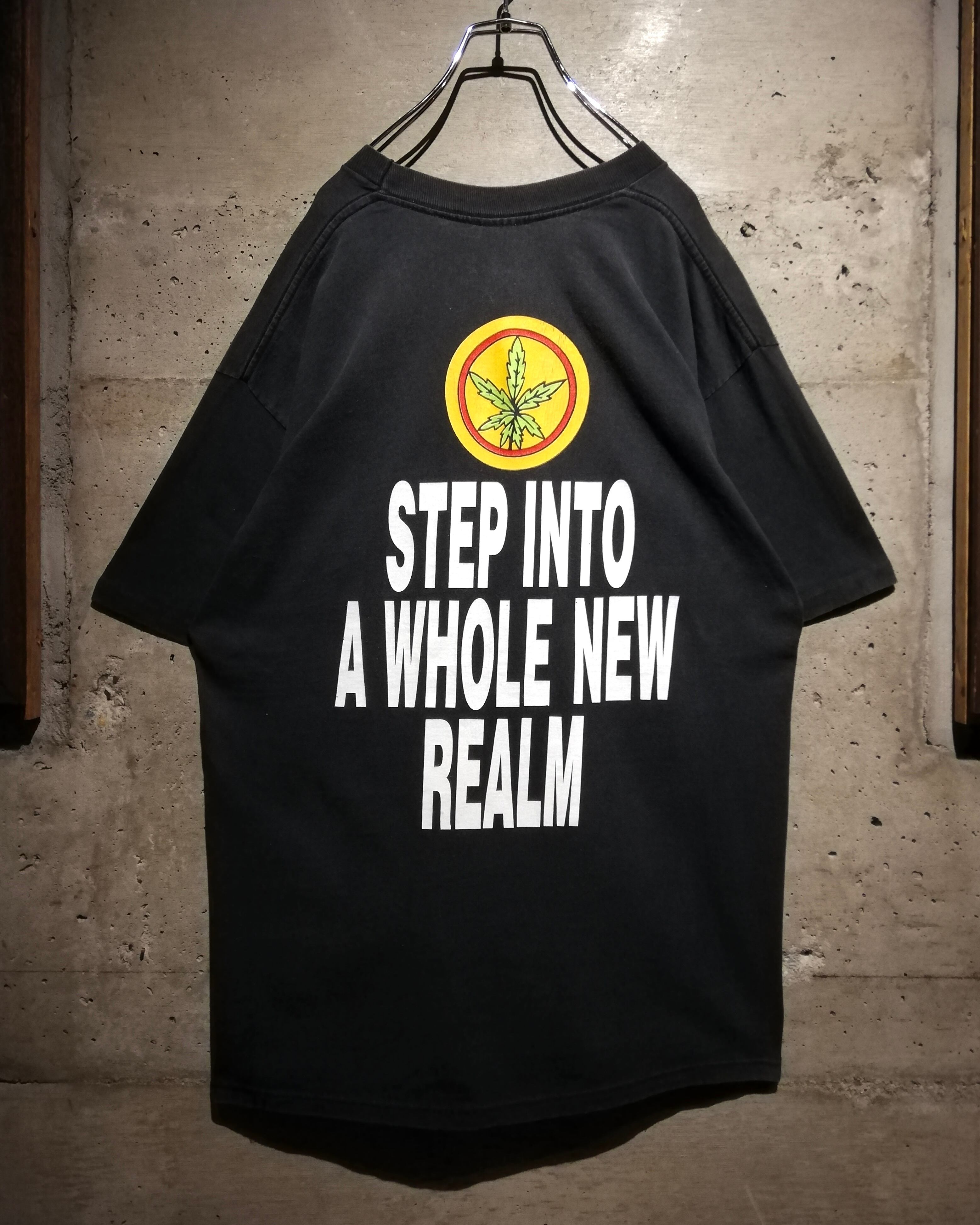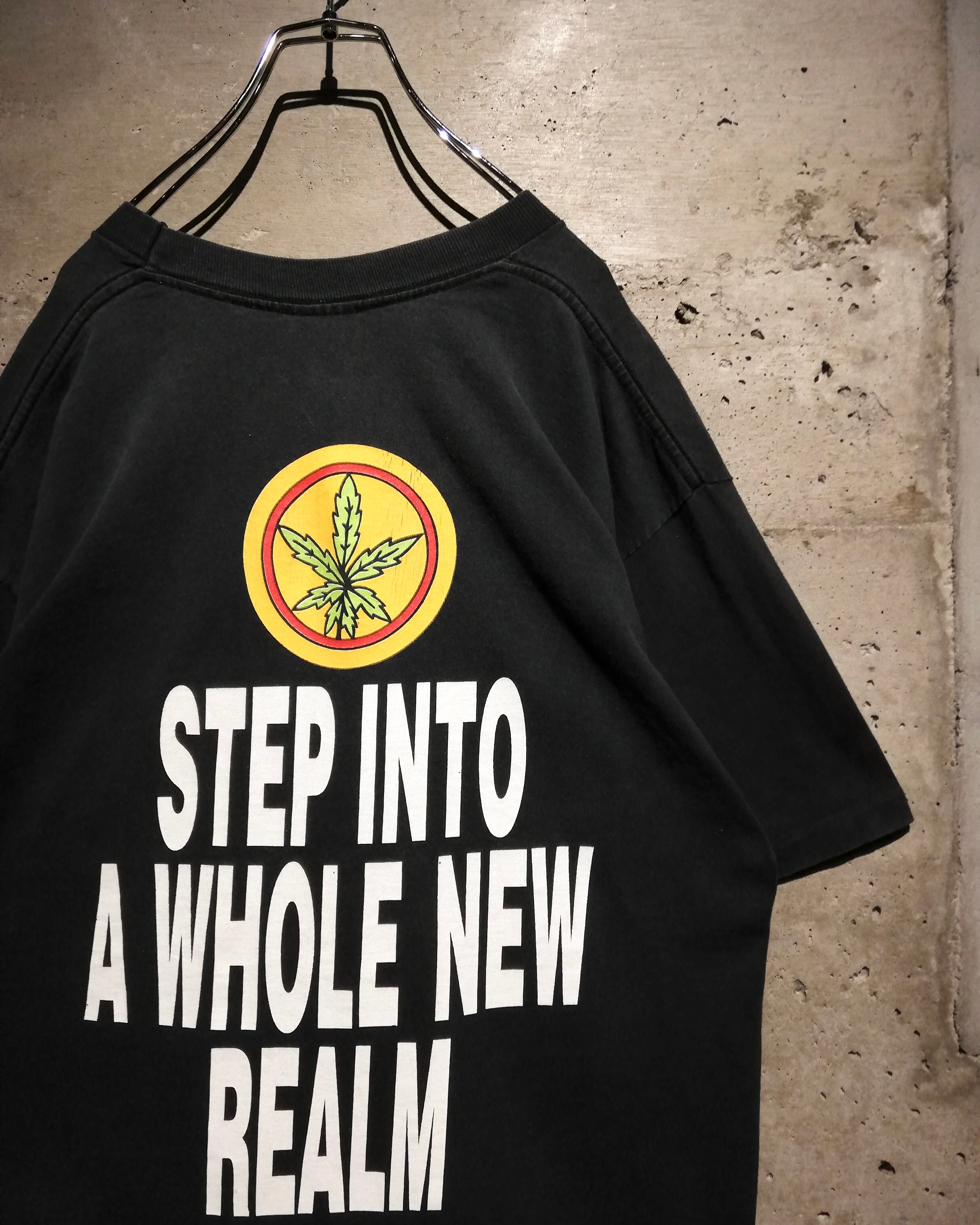 ブラックのボディに、マリファナで敷き詰められたアフロのドクロがマリファナを吸っているプリントをフロントに配置。背面にはマリファナと共に"STEP INTO A WHOLE NEW REALM(全く新しい領域に足を踏み入れる)"のメッセージを載せた、"らしさ"全開の両面プリント。
