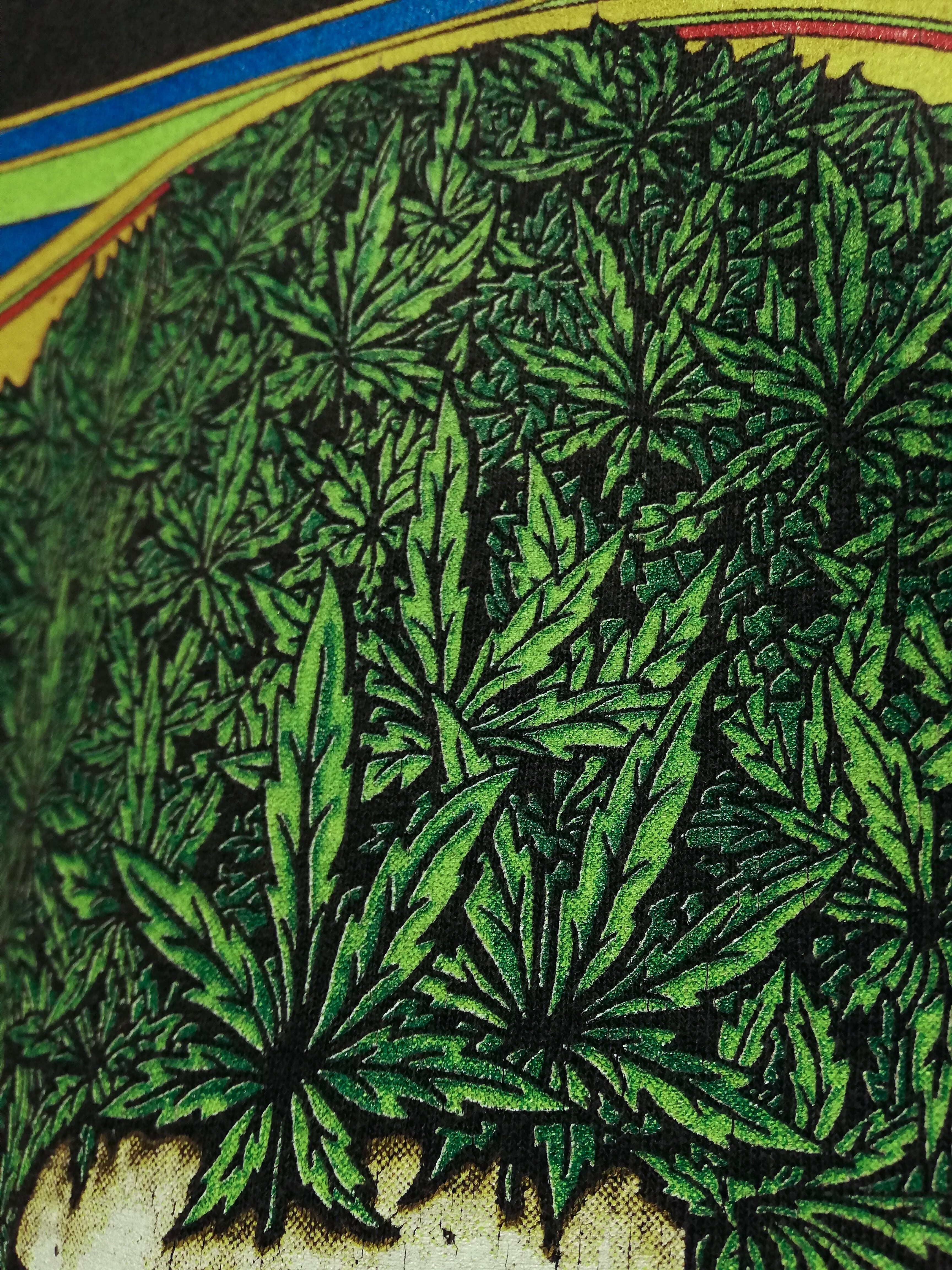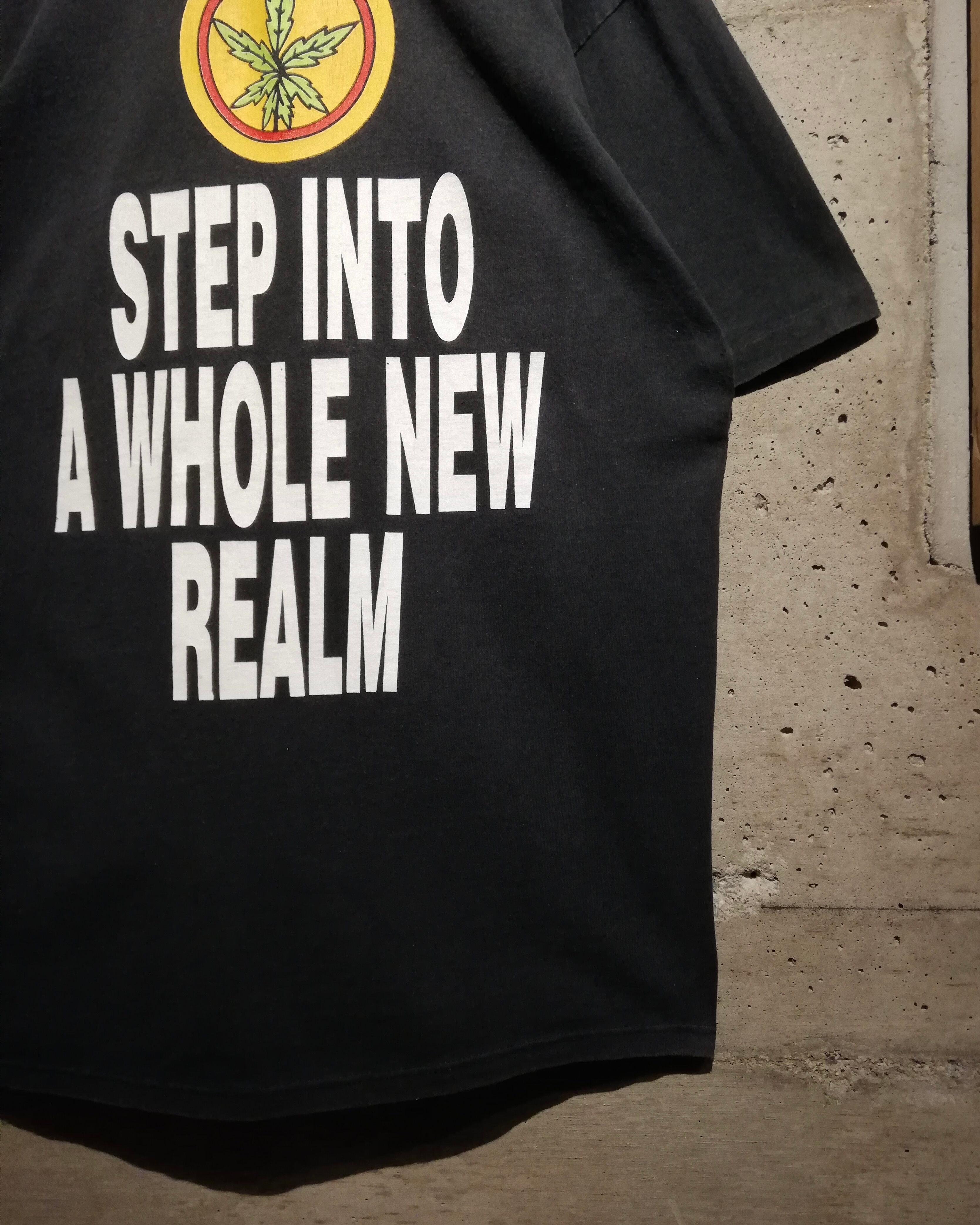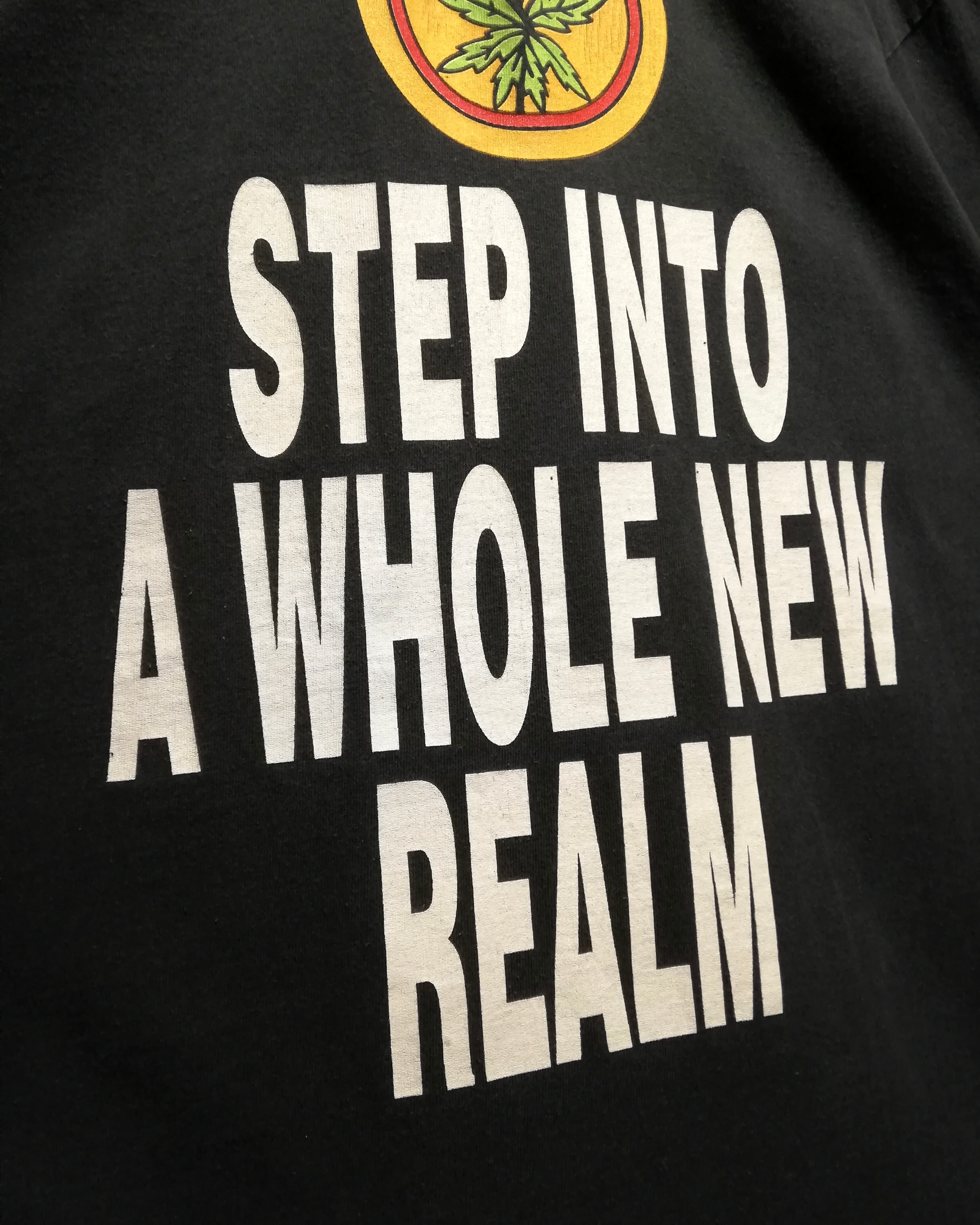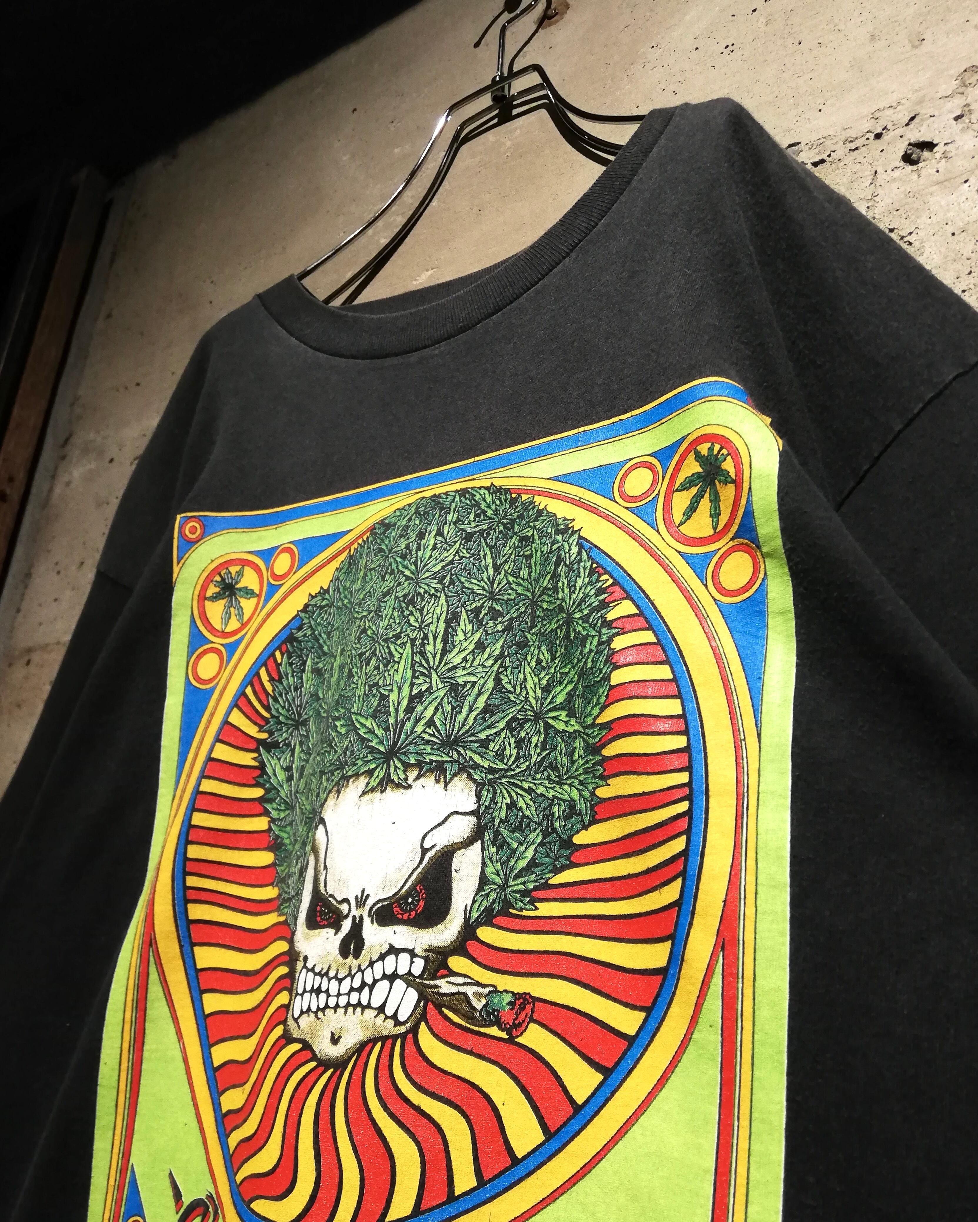 ブラックのボディに、マリファナで敷き詰められたアフロのドクロがマリファナを吸っているプリントをフロントに配置。背面にはマリファナと共に"STEP INTO A WHOLE NEW REALM(全く新しい領域に足を踏み入れる)"のメッセージを載せた、"らしさ"全開の両面プリント。
