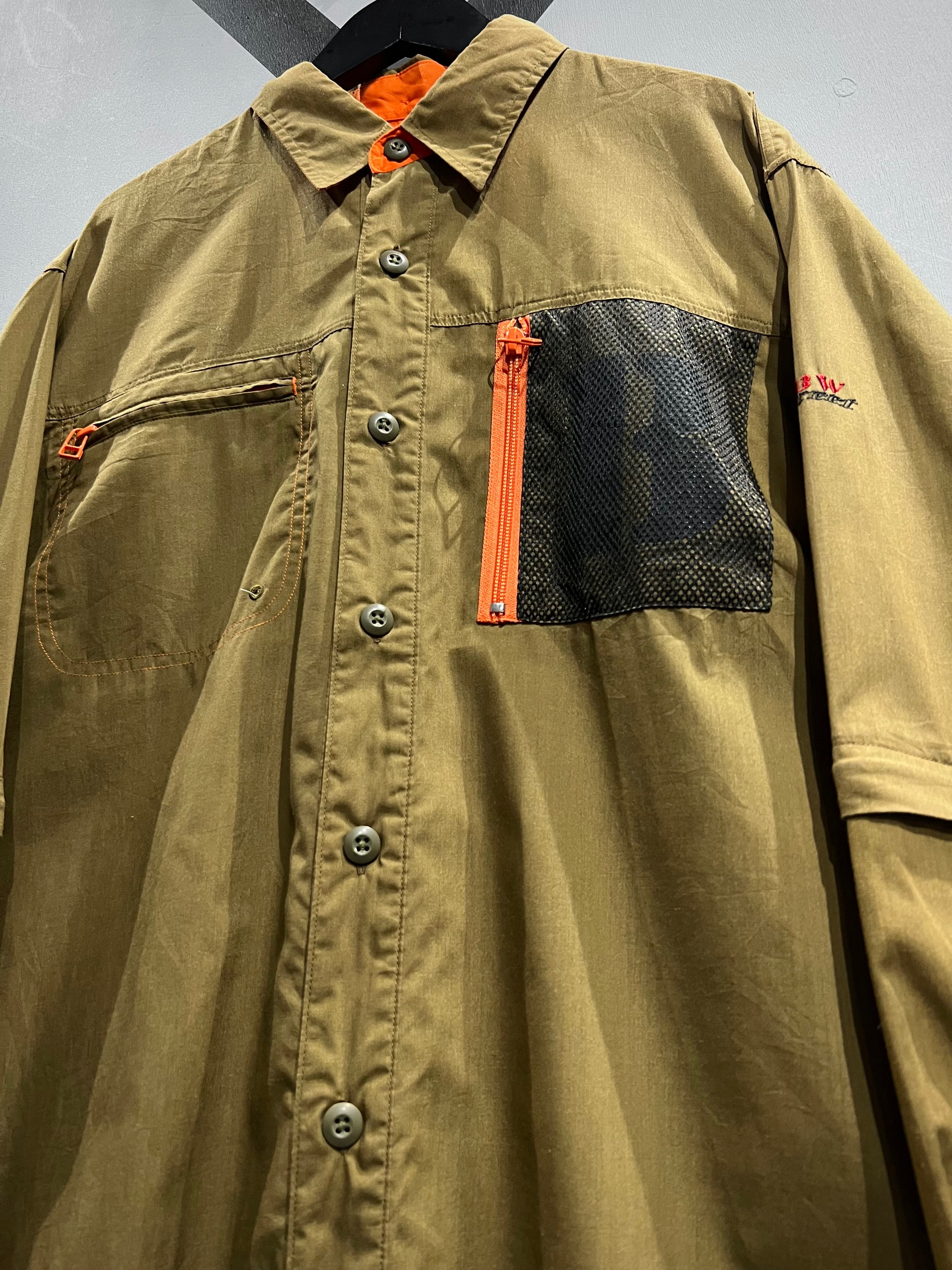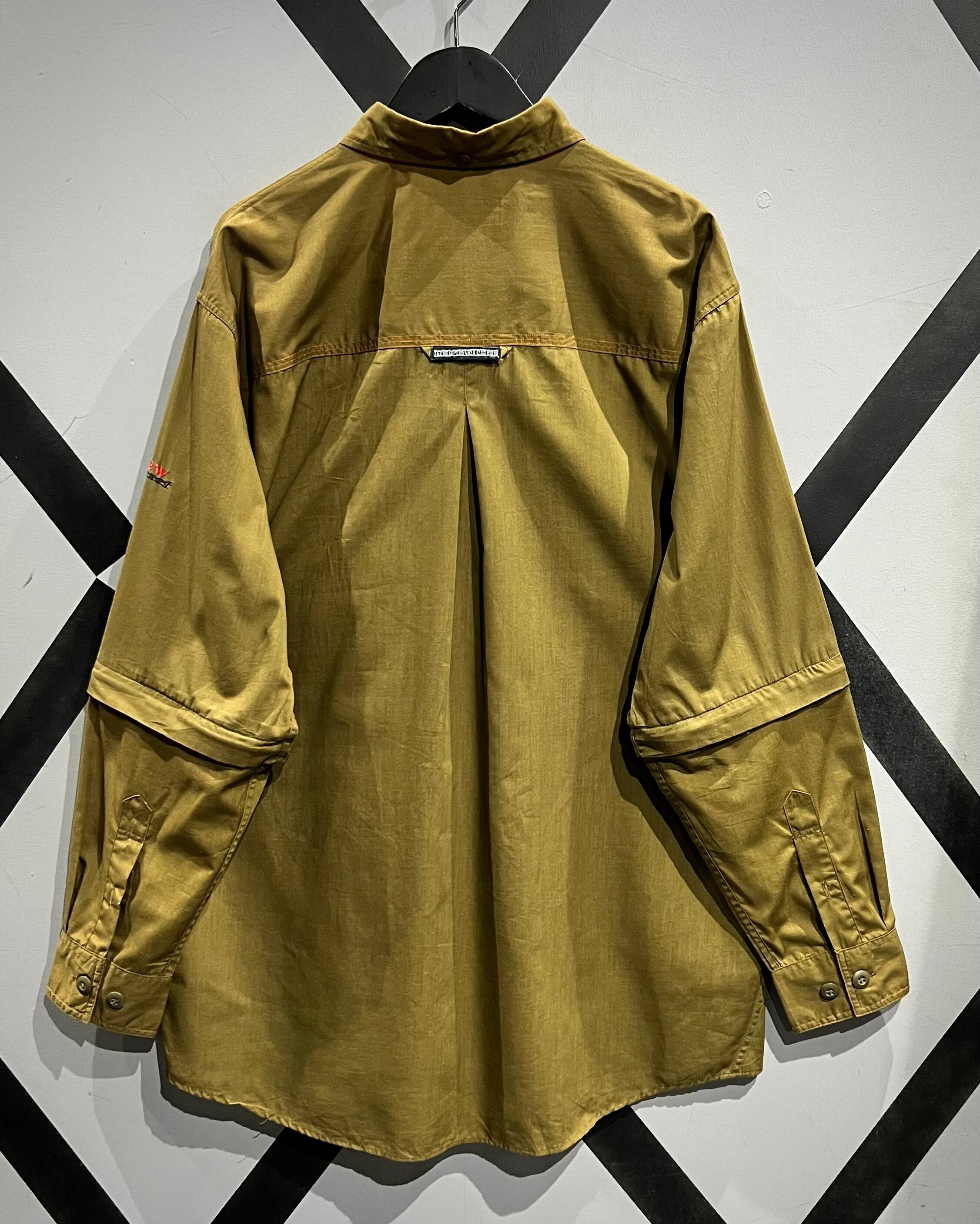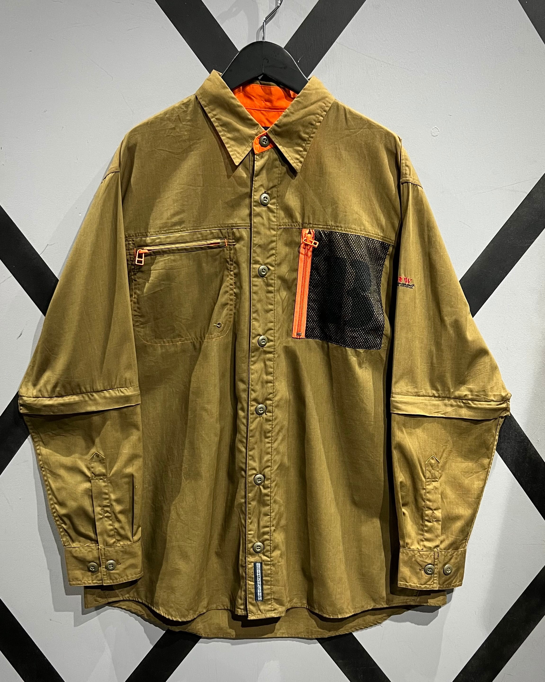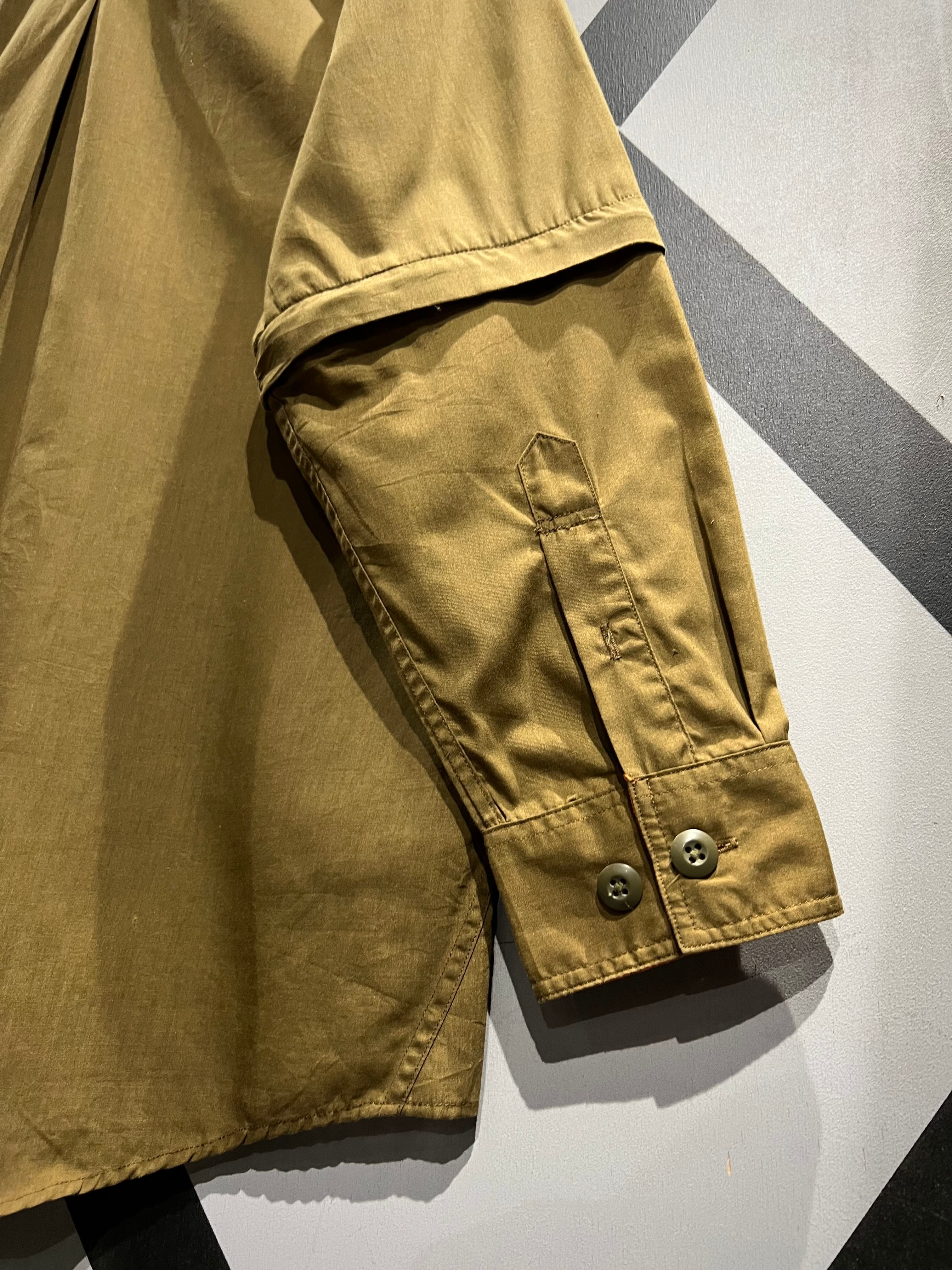 カーキを基調としたボディに、左胸にはメッシュ仕様のポケット、右胸にはジップポケットを配置。そして注目して頂きたいのは袖の作り。こちらジップによって袖が取り外し可能で、半袖で着用することも可能な2way仕様で仕上げられたコンバーチブルシャツ。