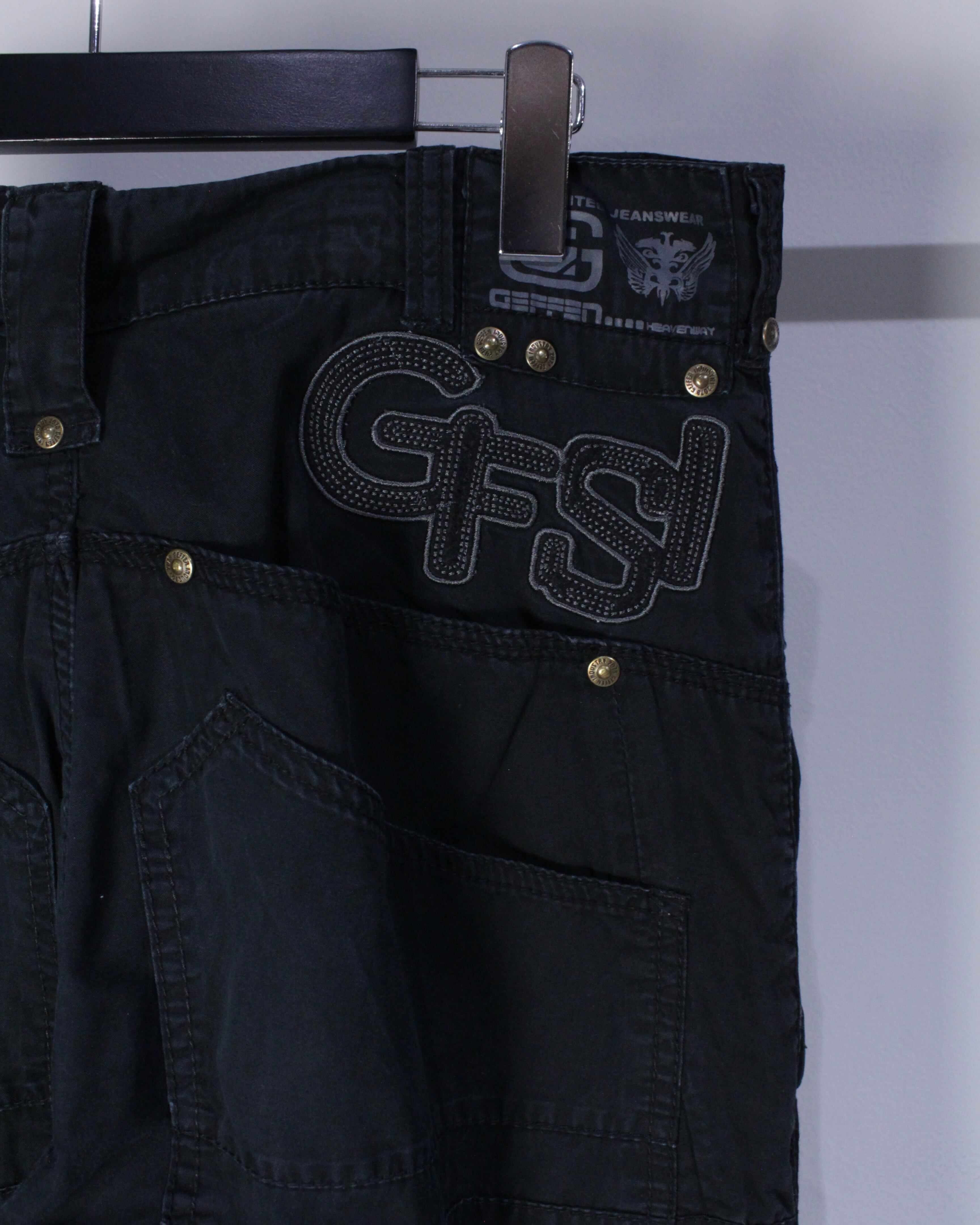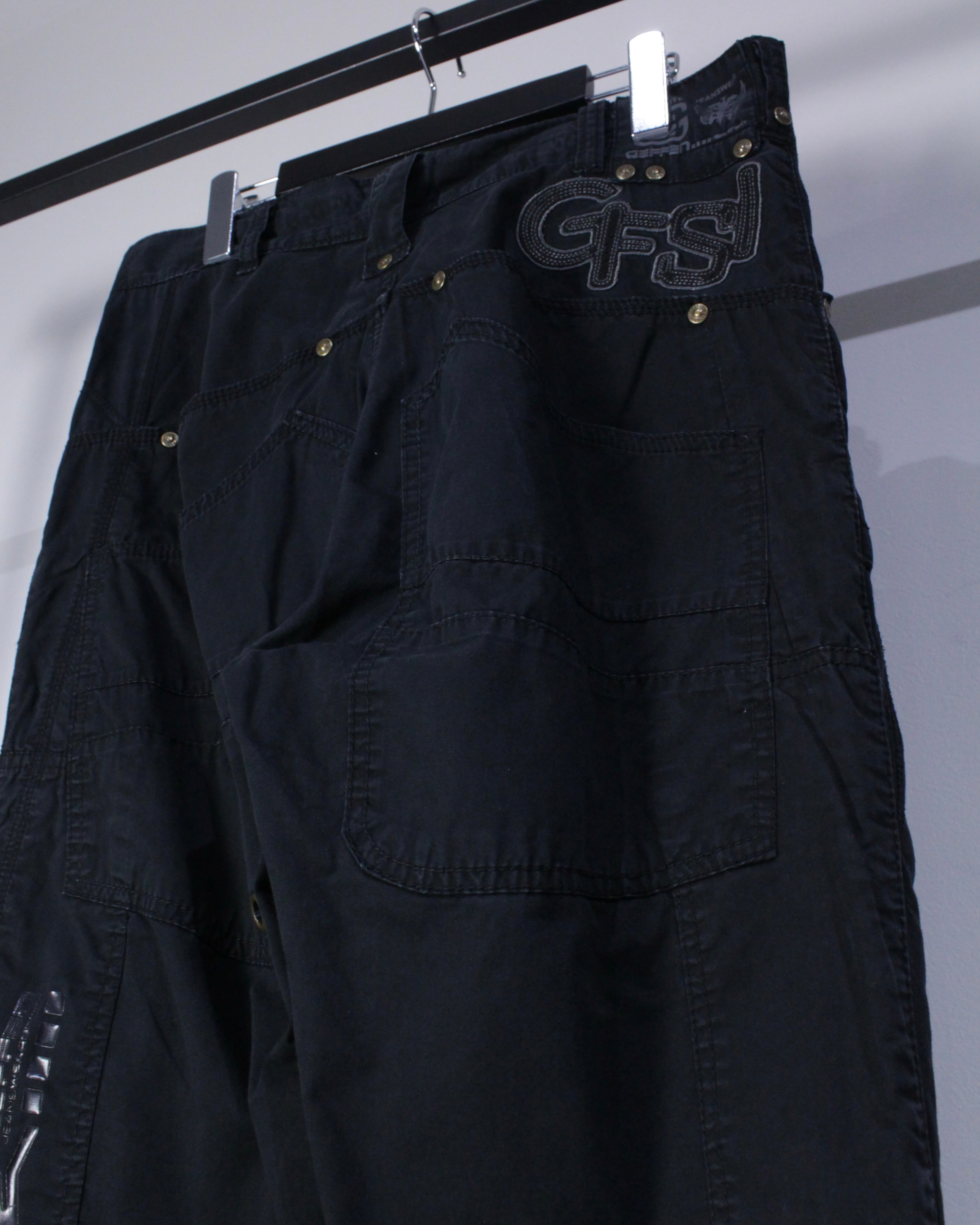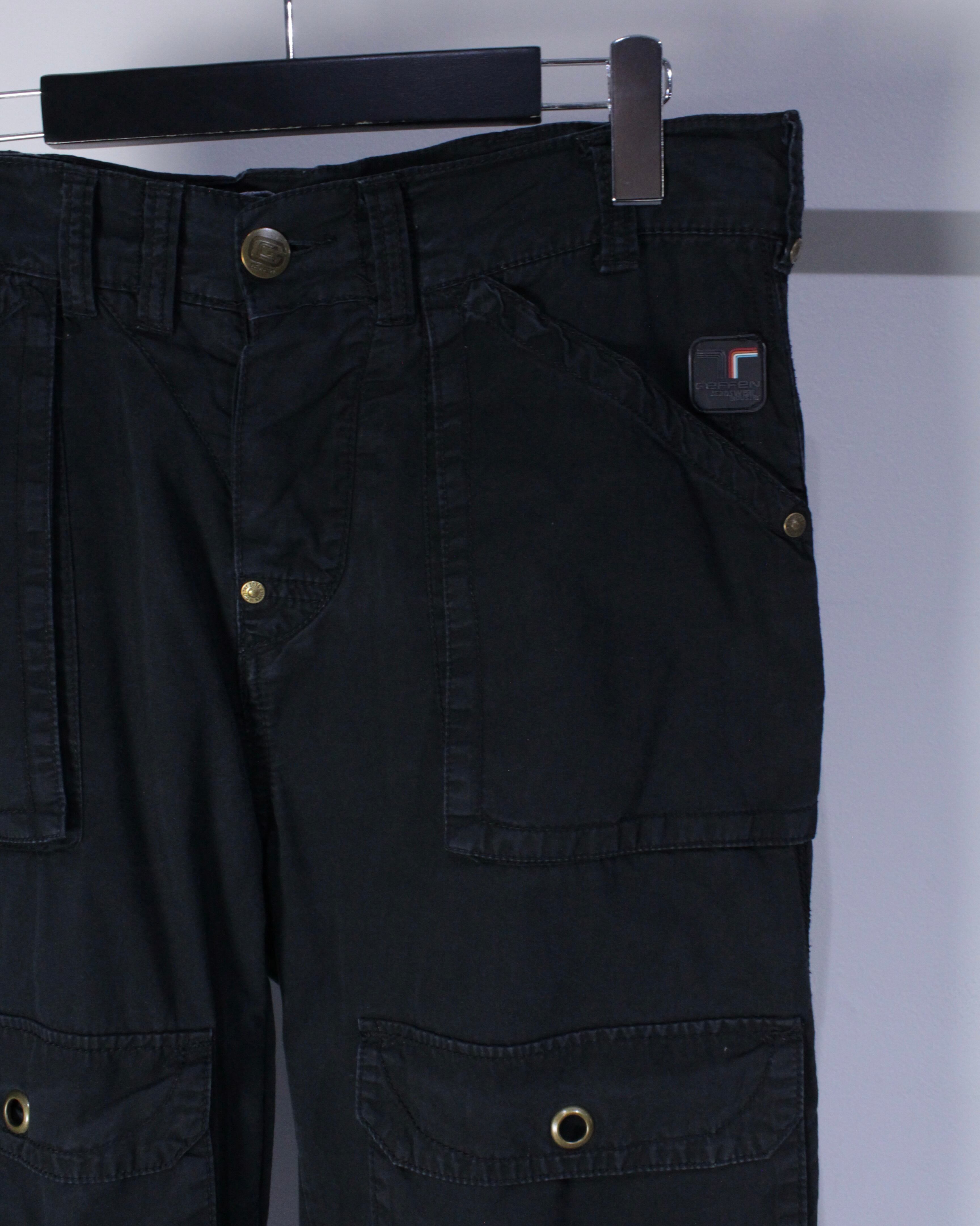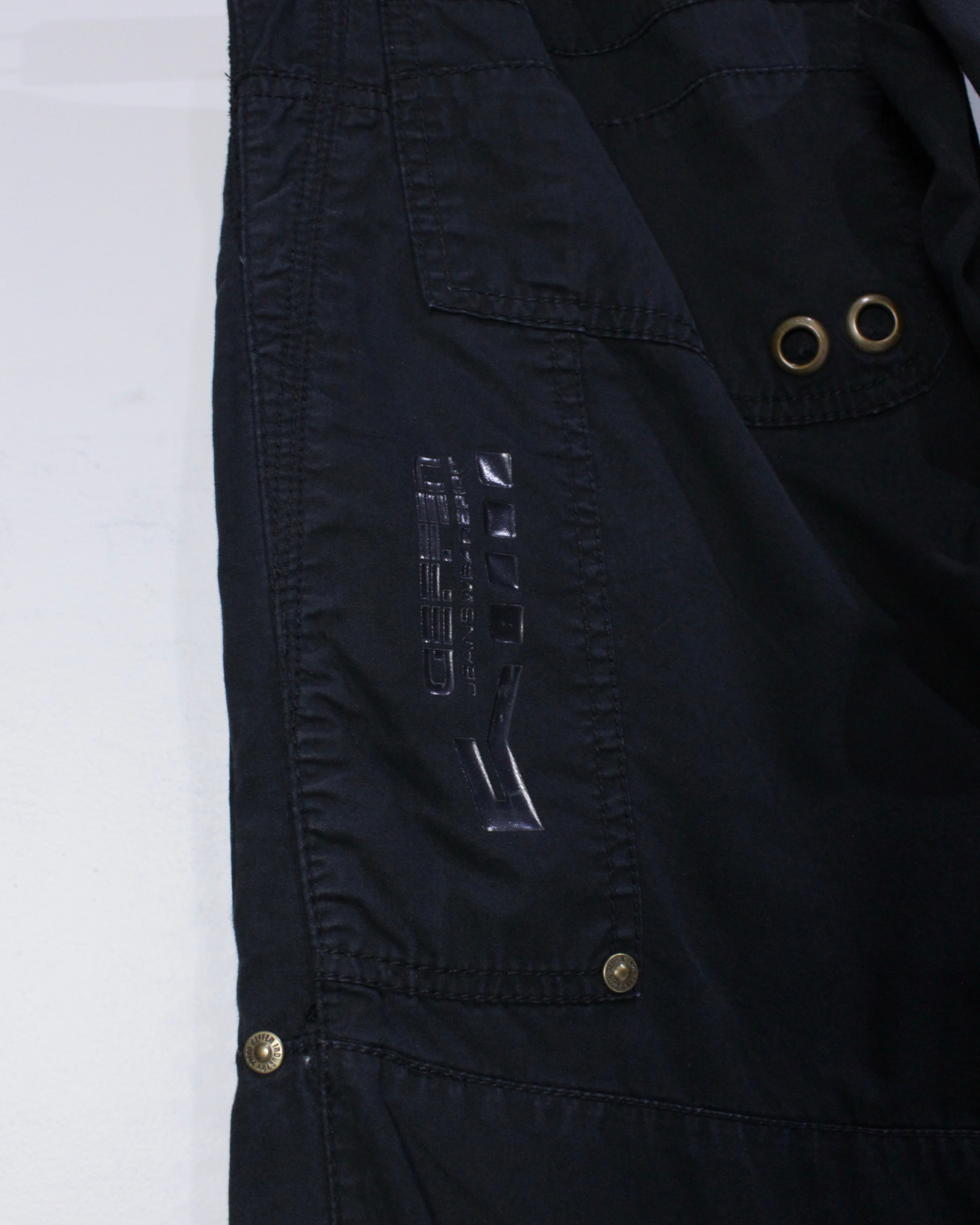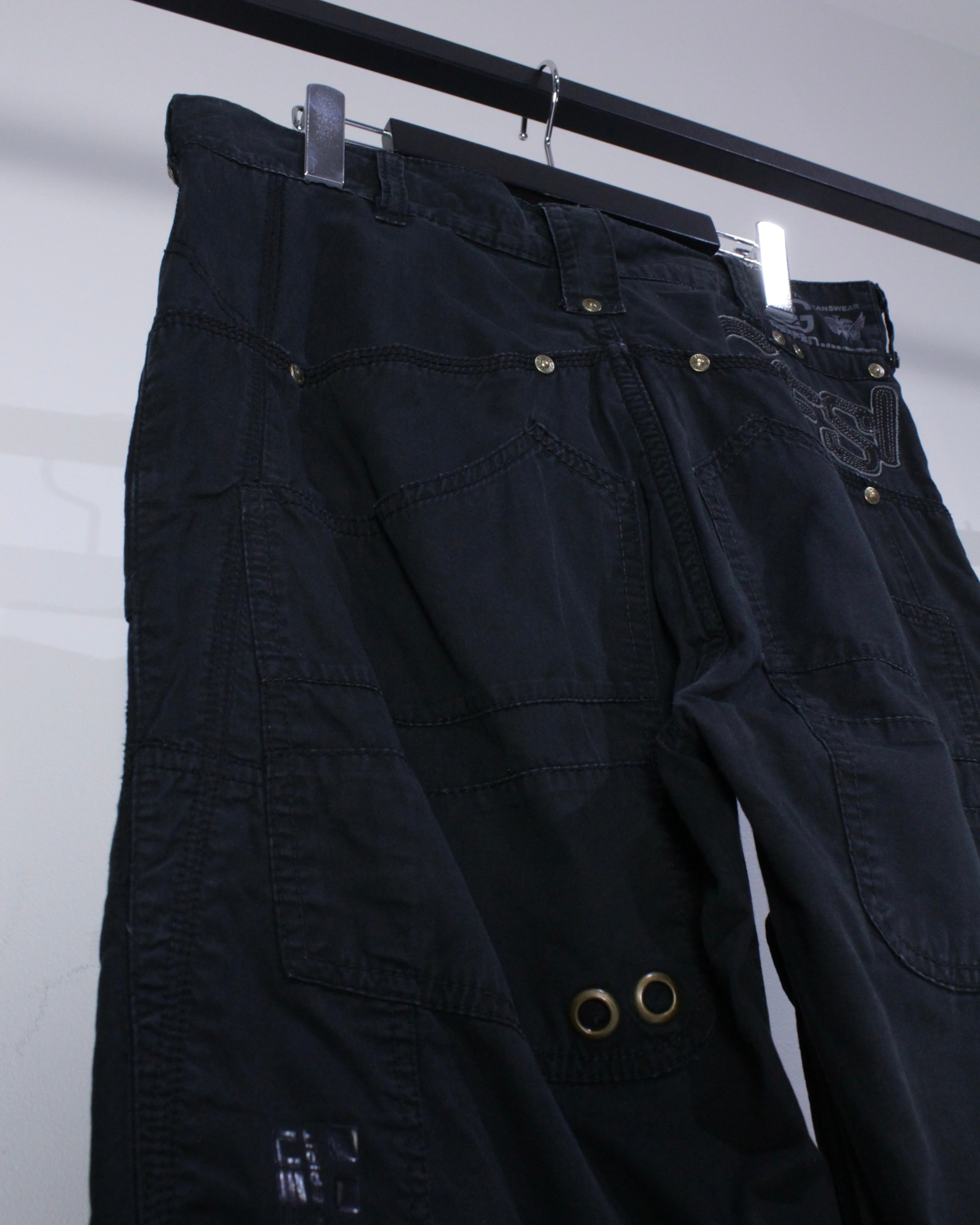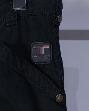 右腰部分のブランドロゴ刺繍や、ポケットに施されたボタン、ハトメが程よいアクセントになっています。