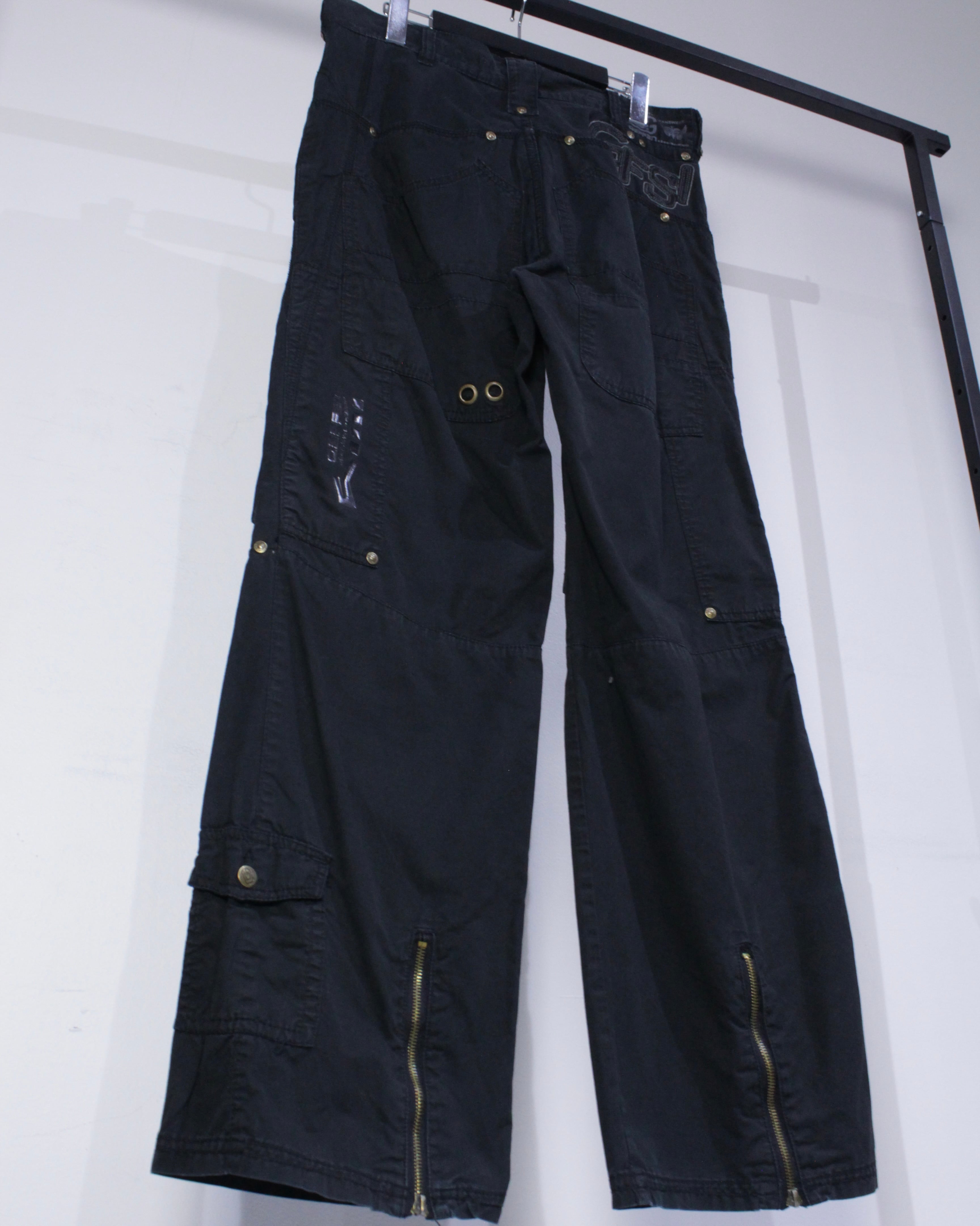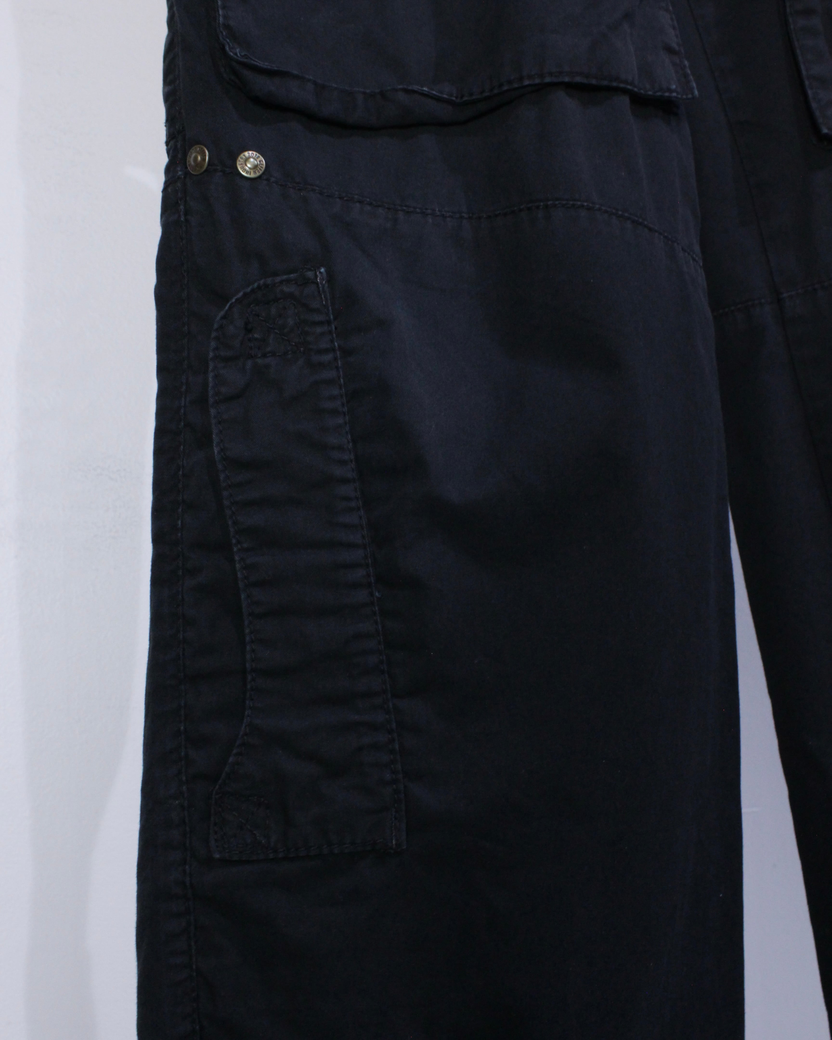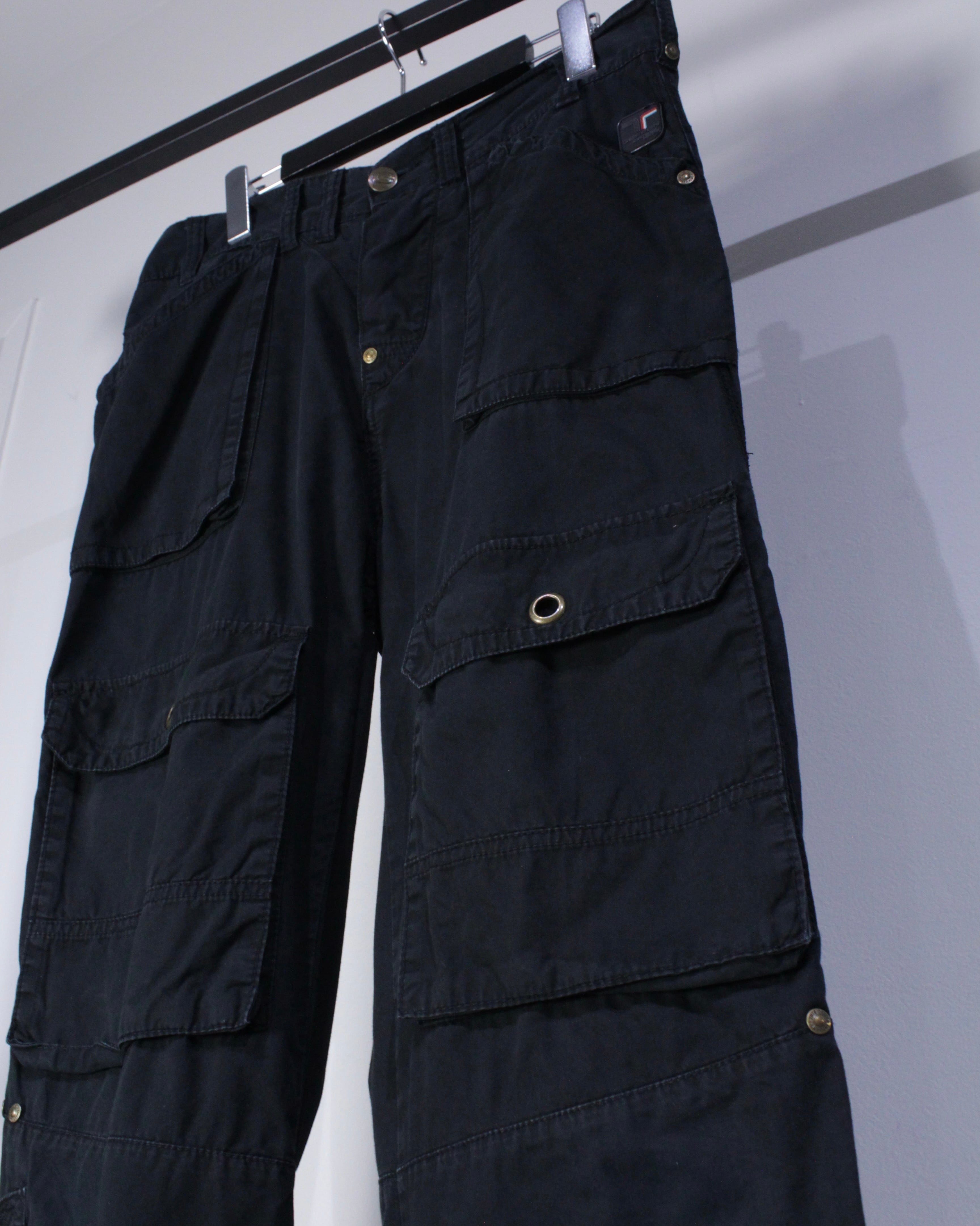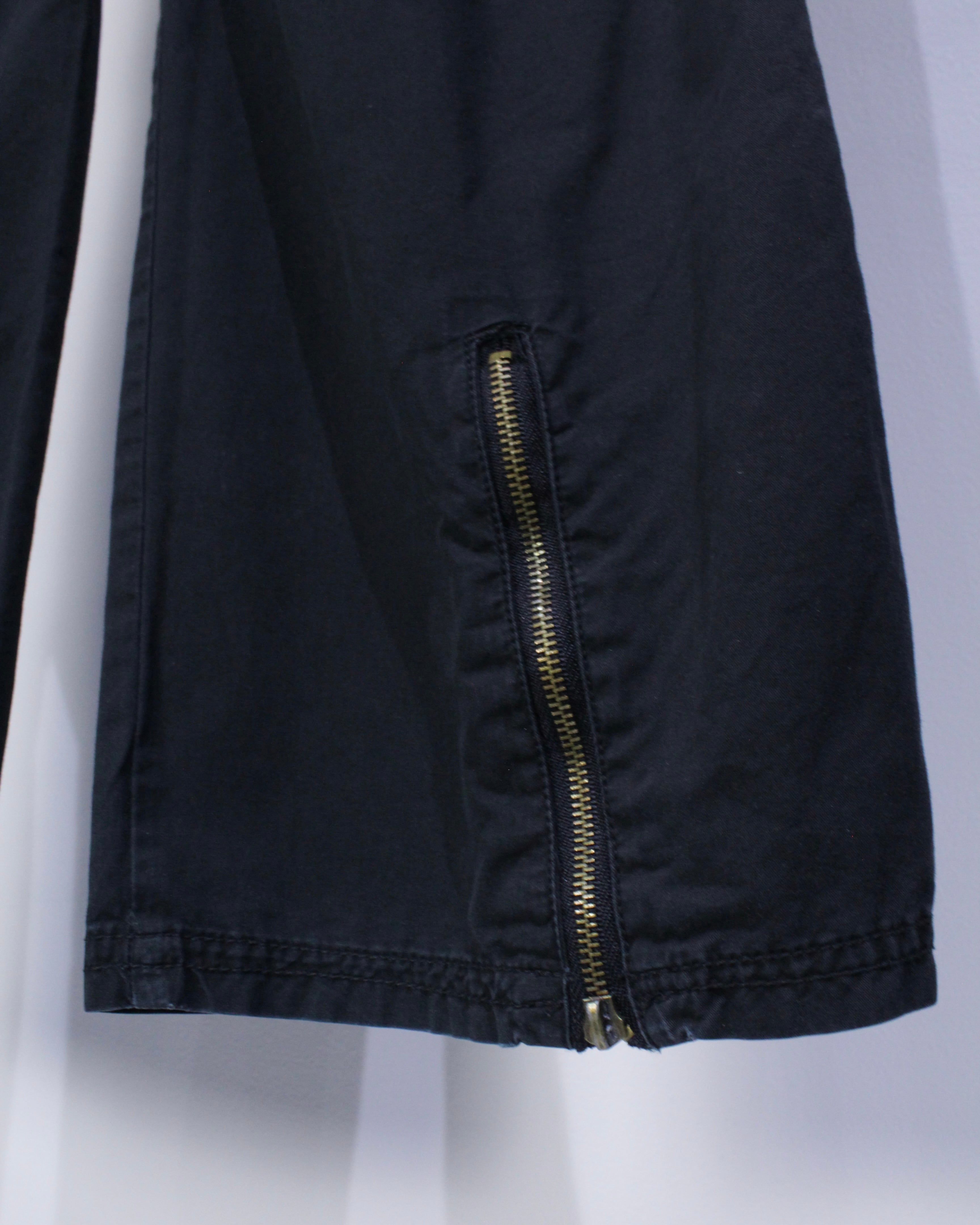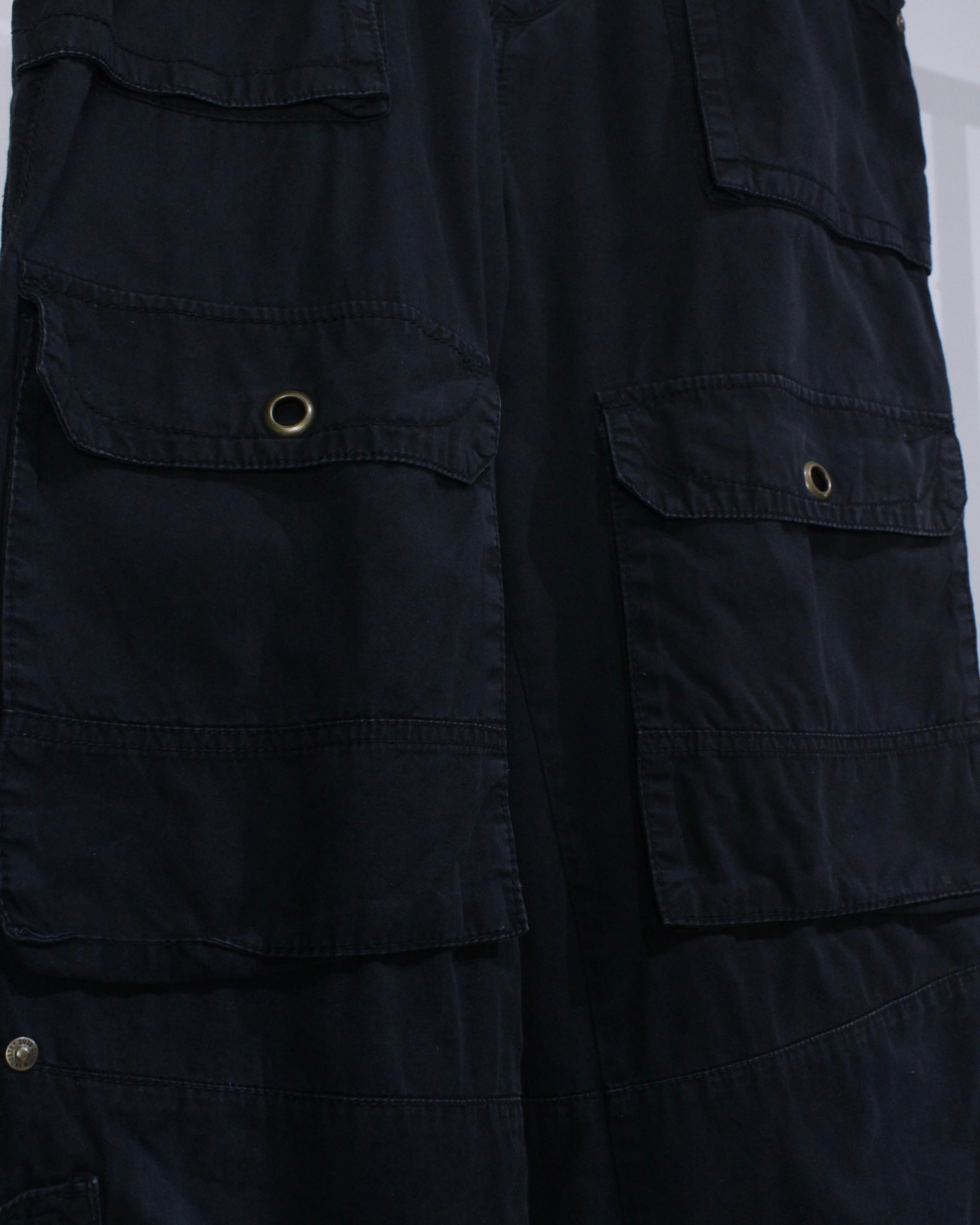フロントには左右それぞれ、大ぶりなフラップポケットを2つ、右脛部分にはスラッシュポケット、左側にはフラップポケット、バックにも4つのポケットを施した1本。非常に機能性の高いバッグ要らずなのは嬉しいポイントです。
