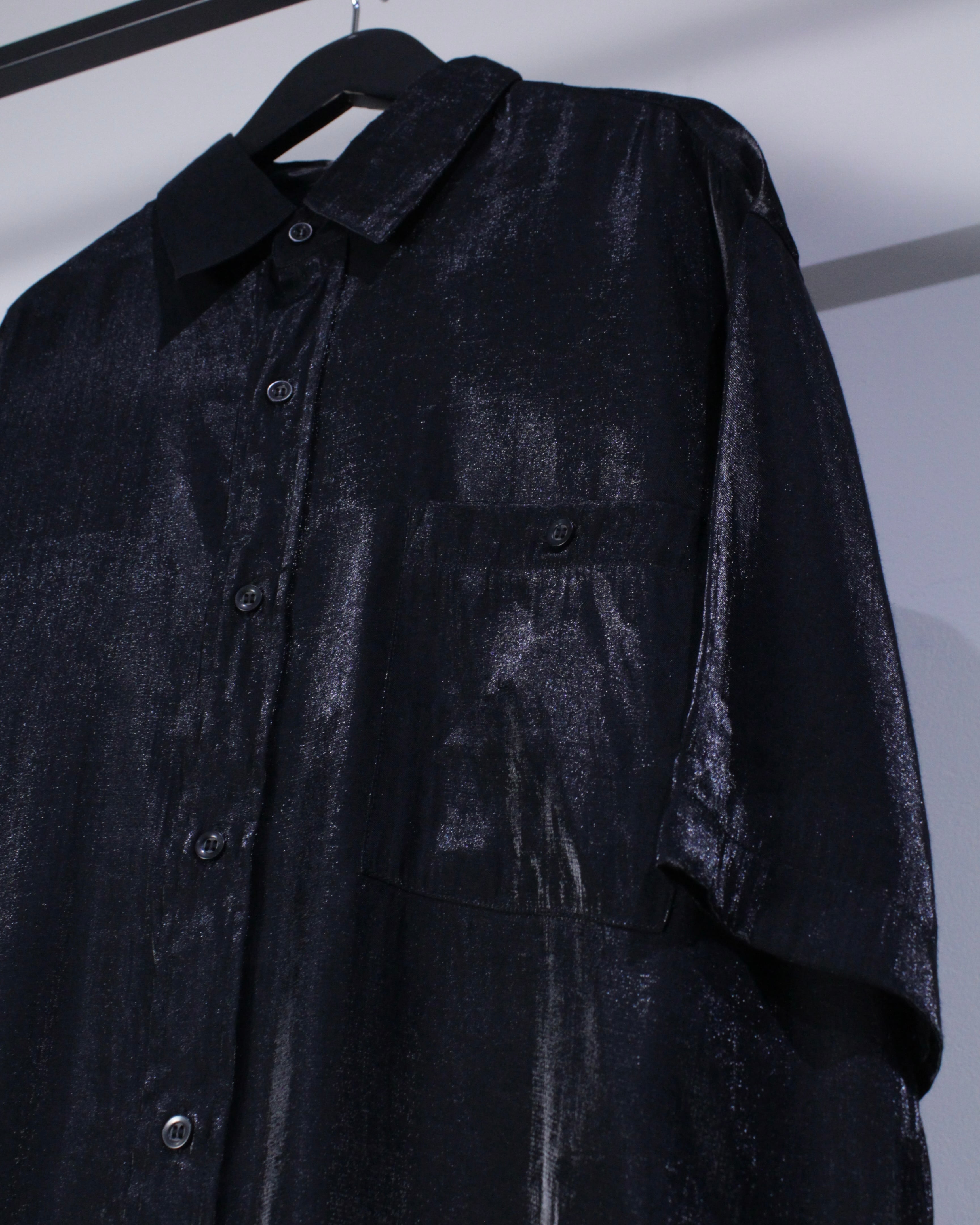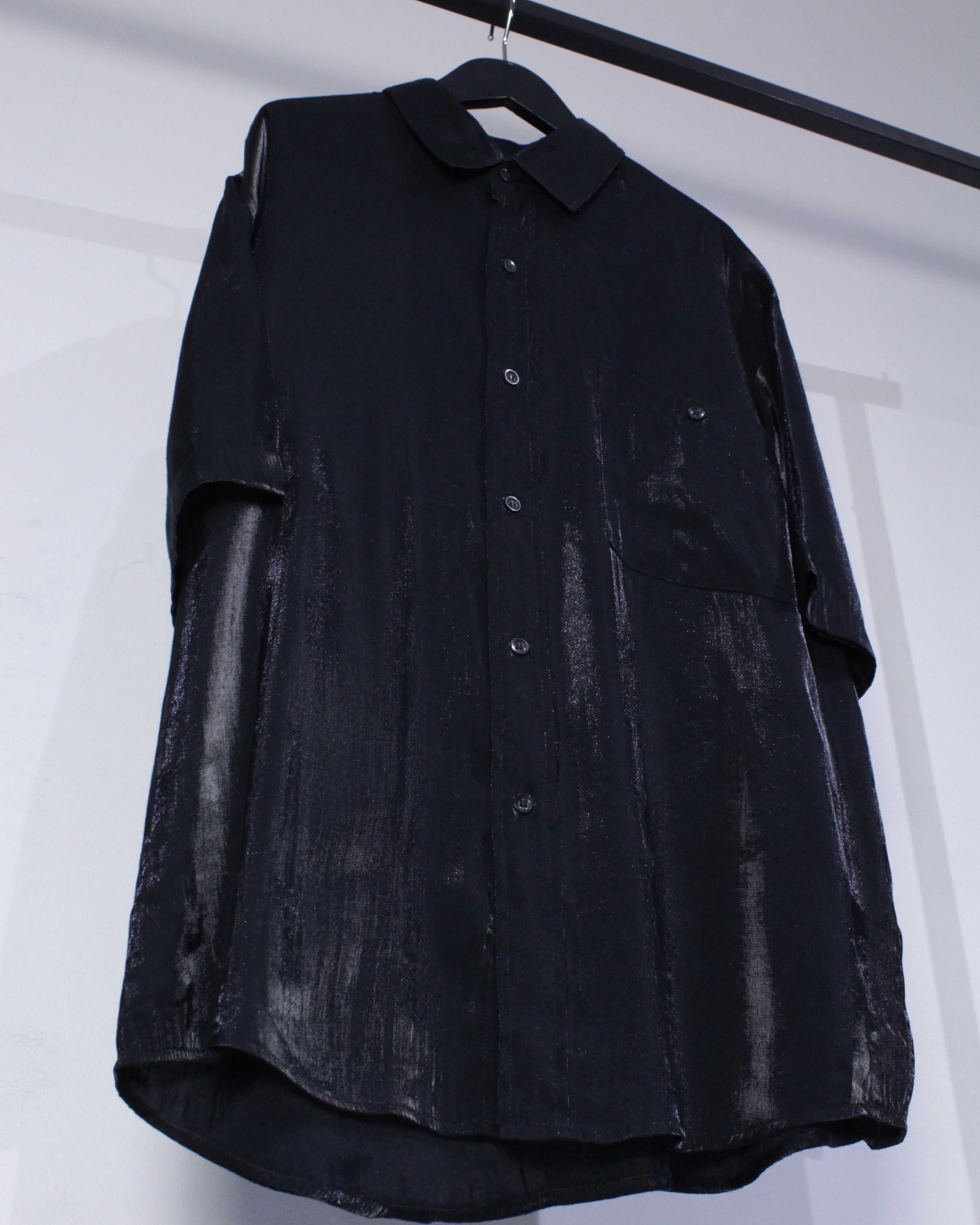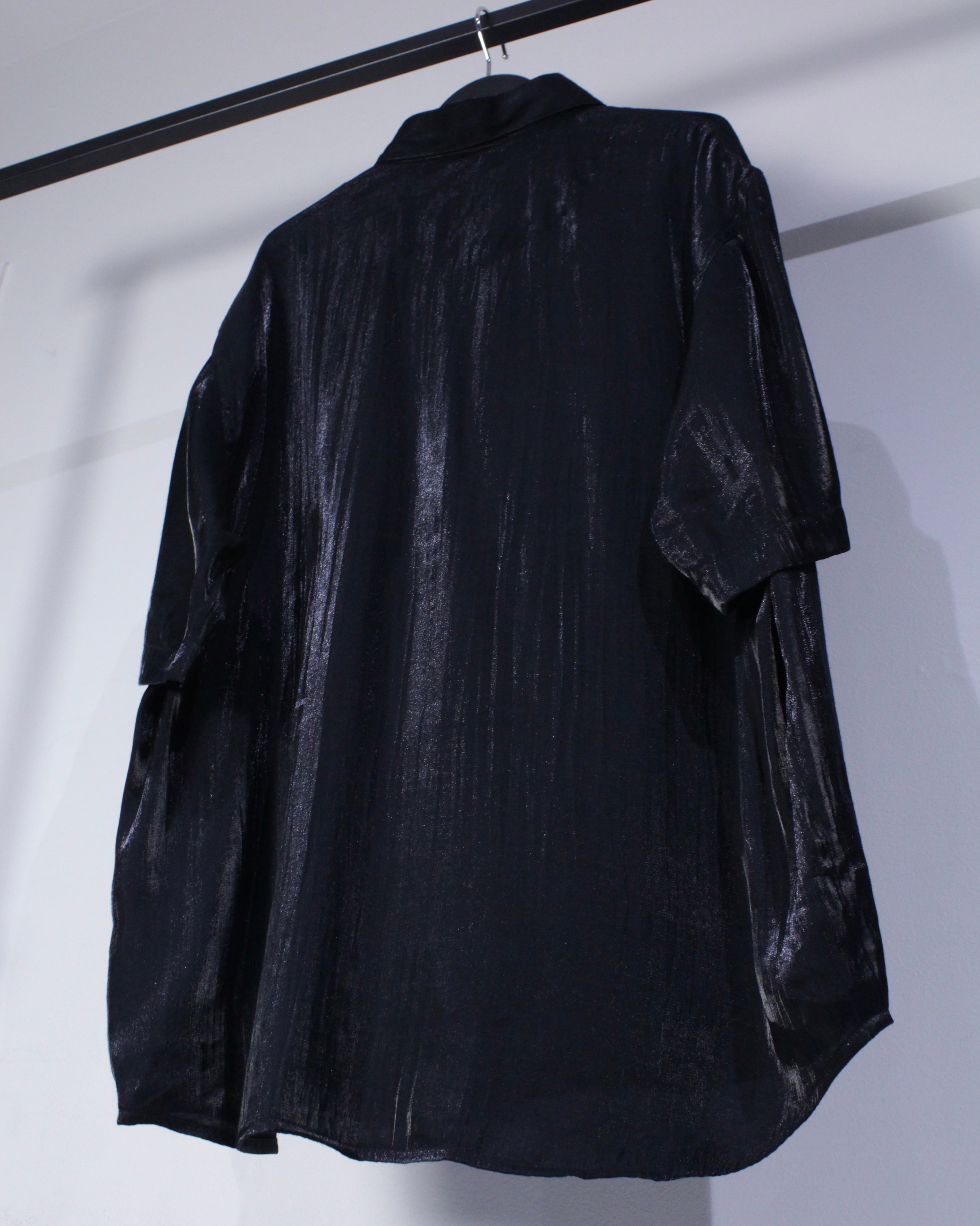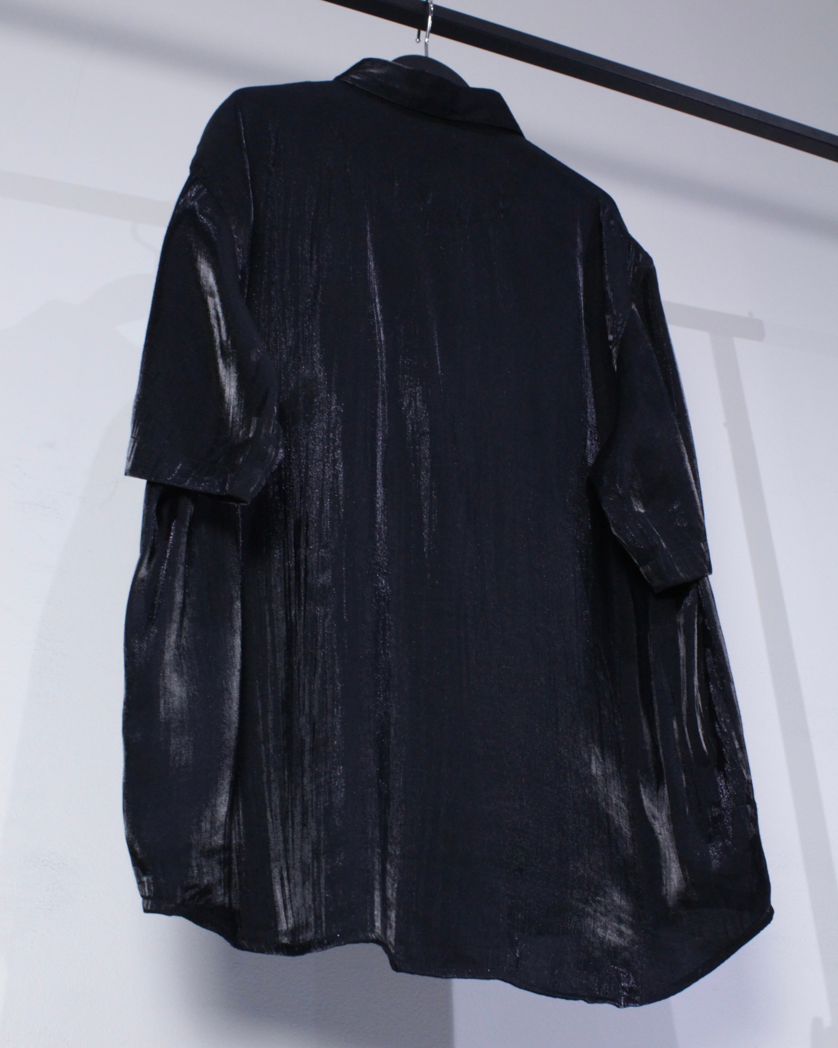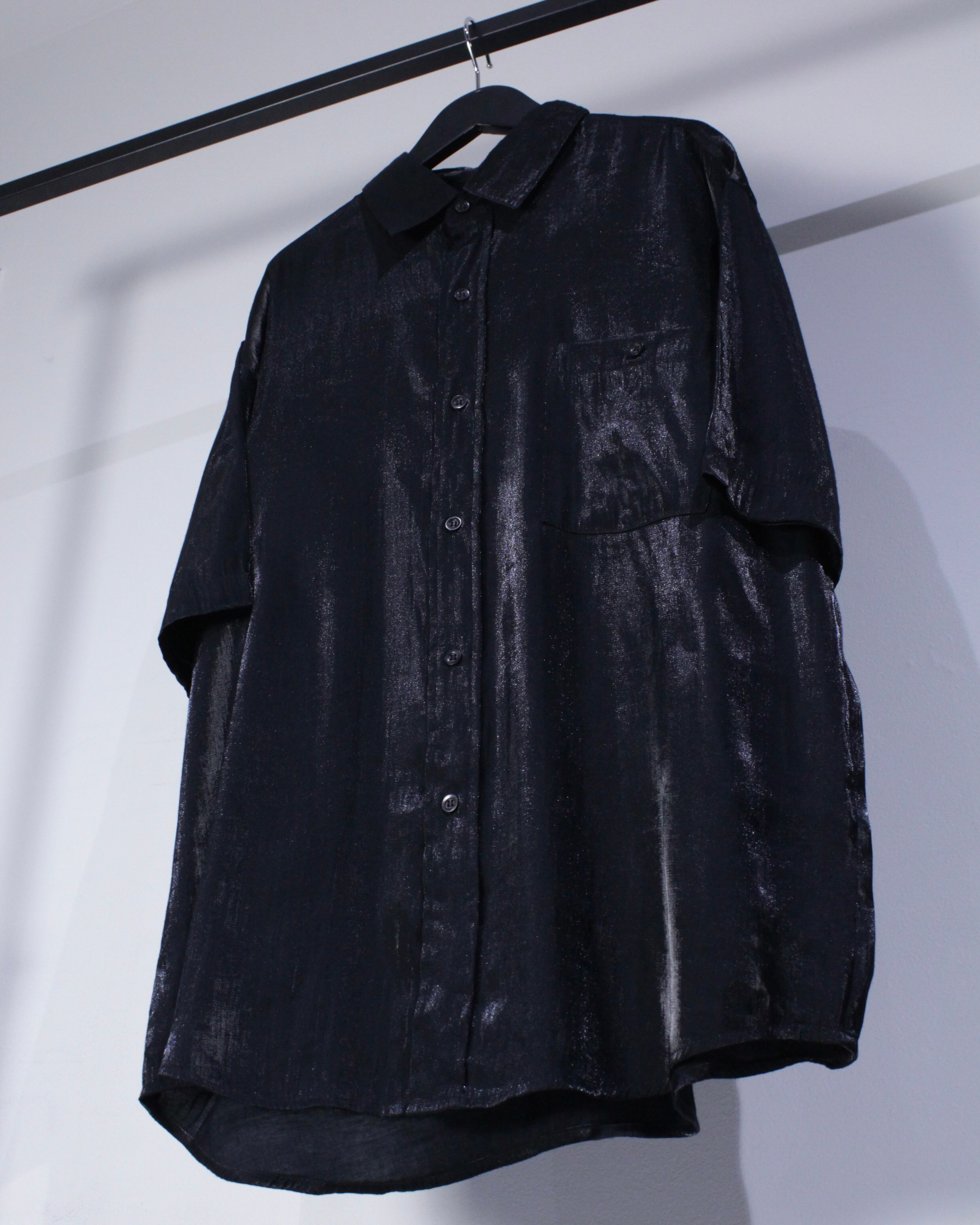 メタリックな光沢を帯びたファブリックをボディに使用した半袖シャツ。