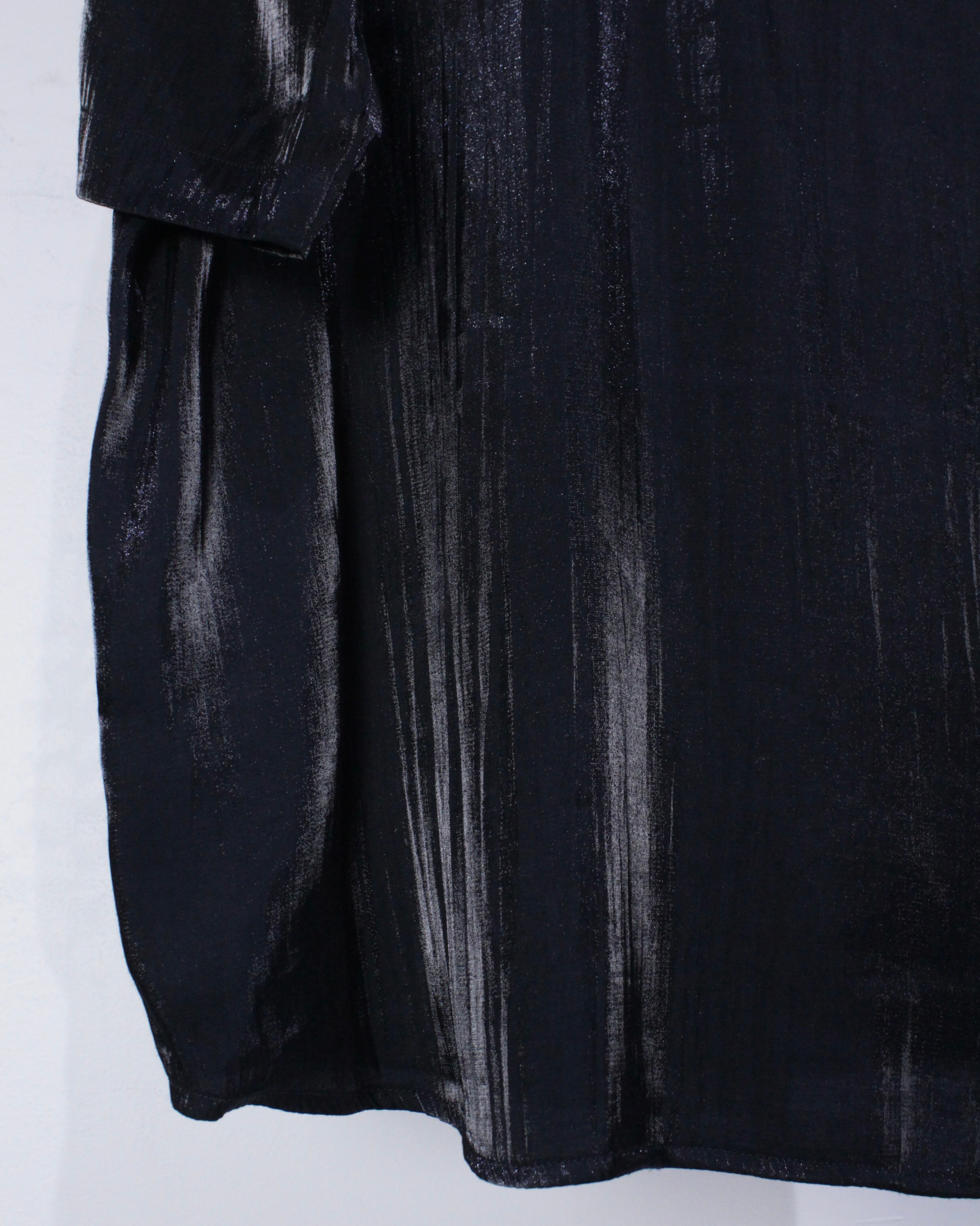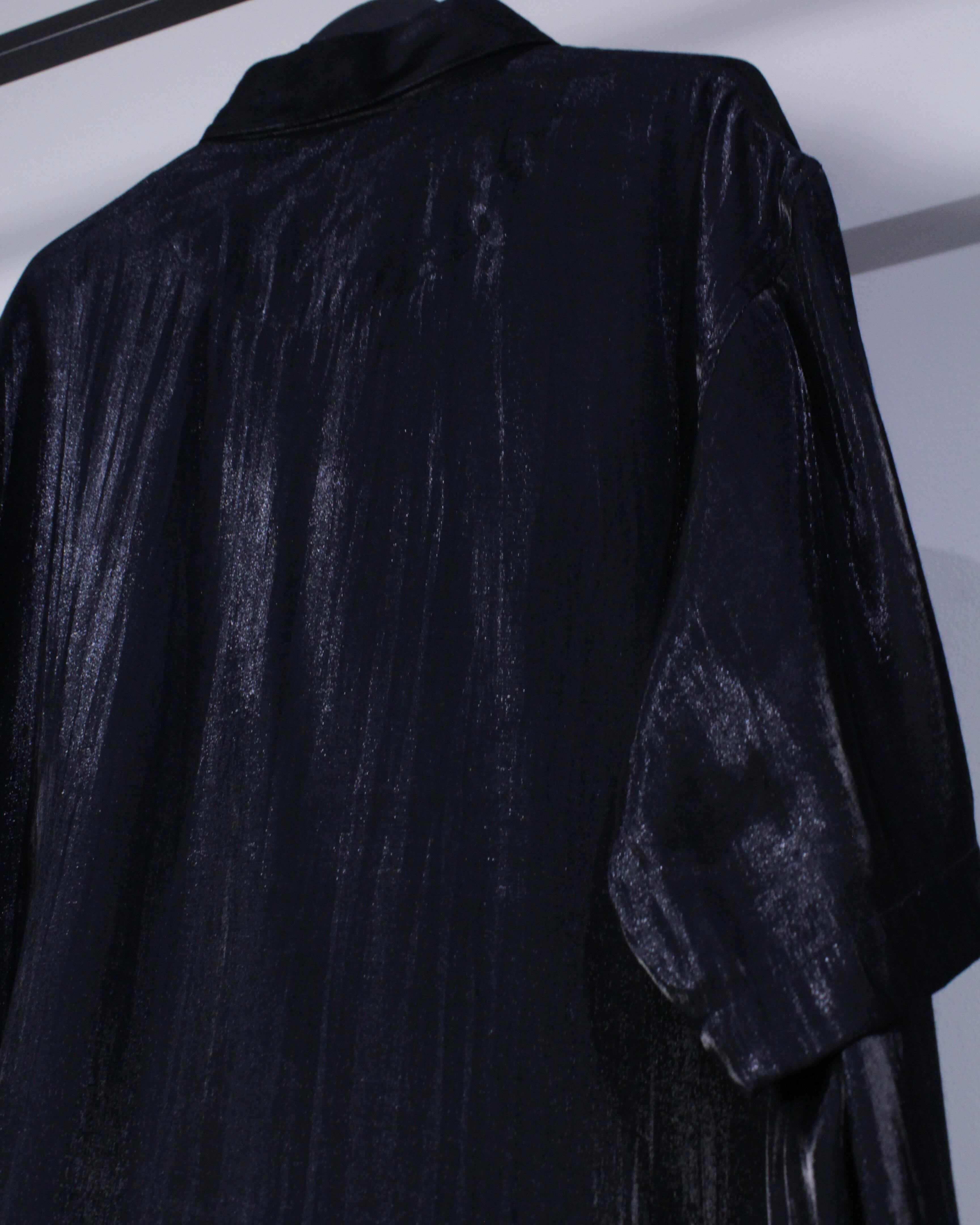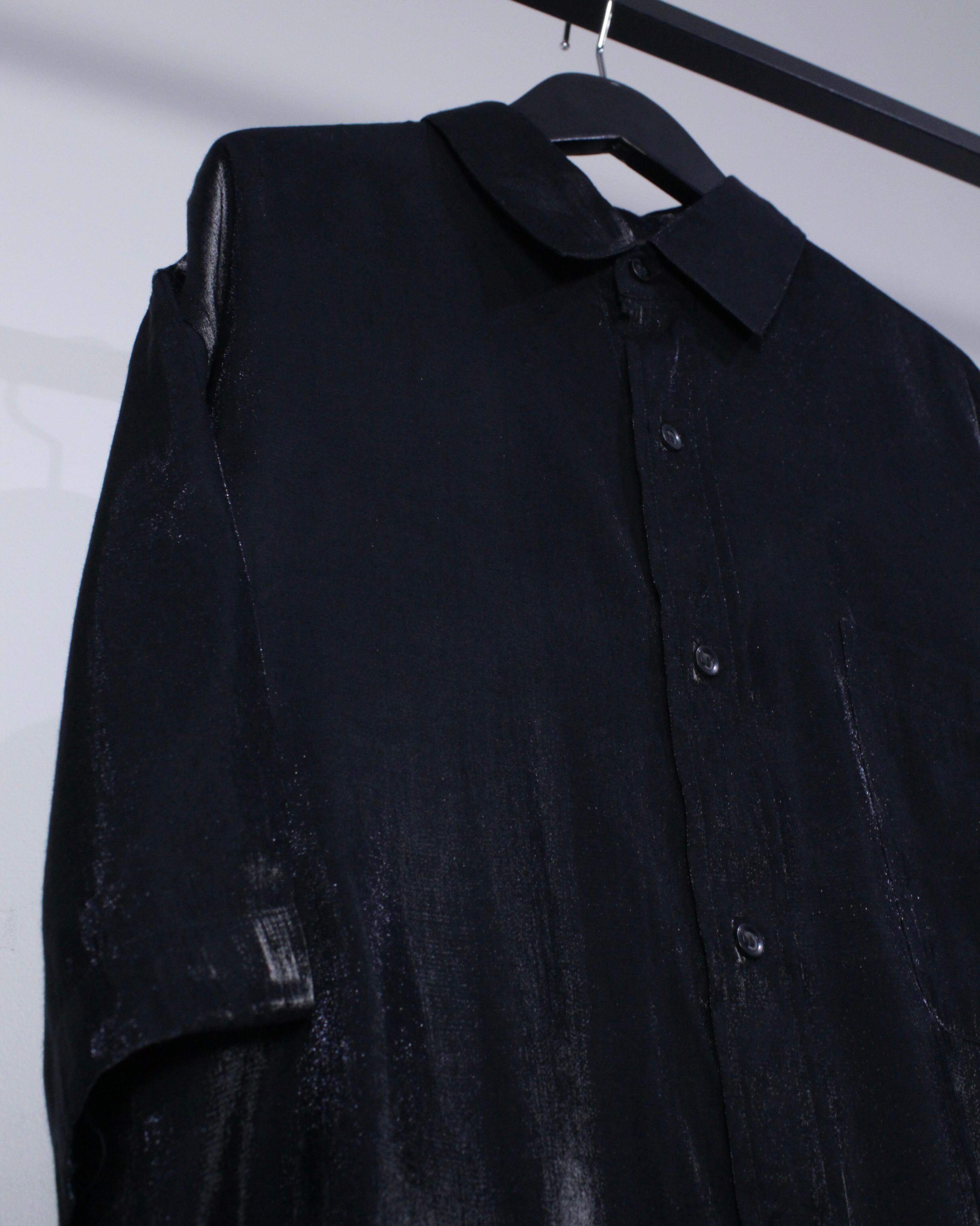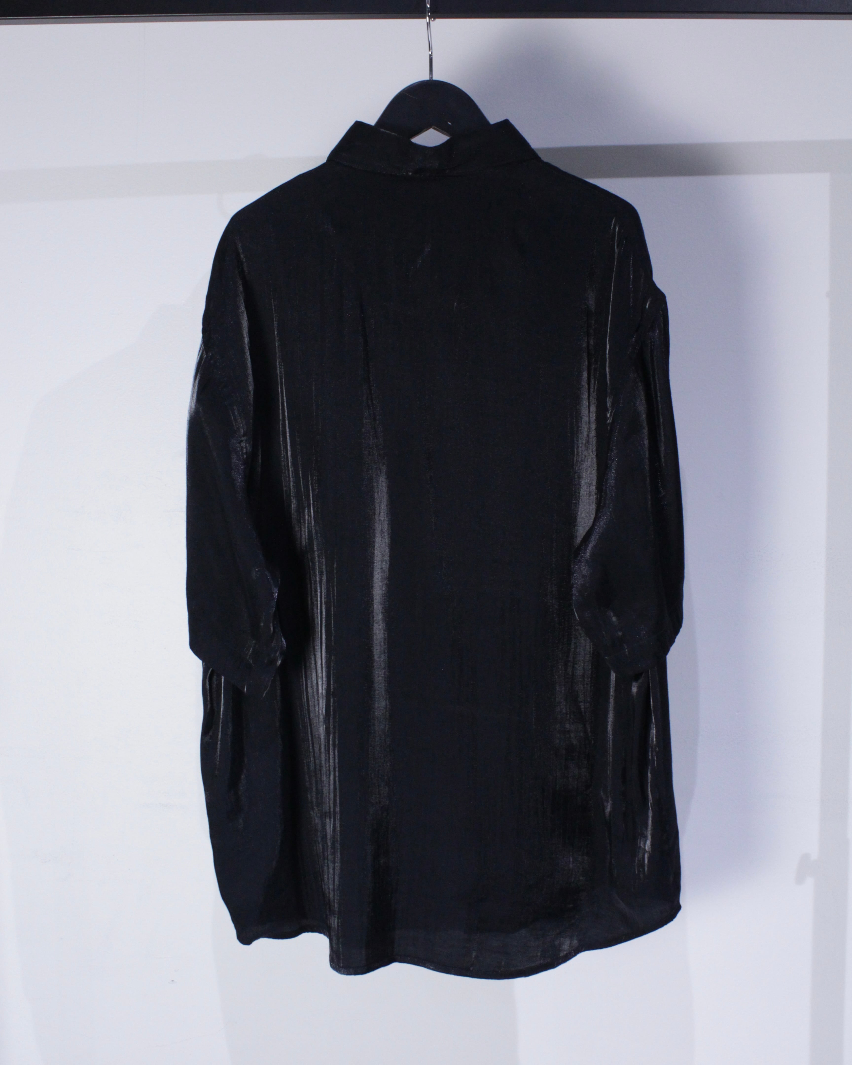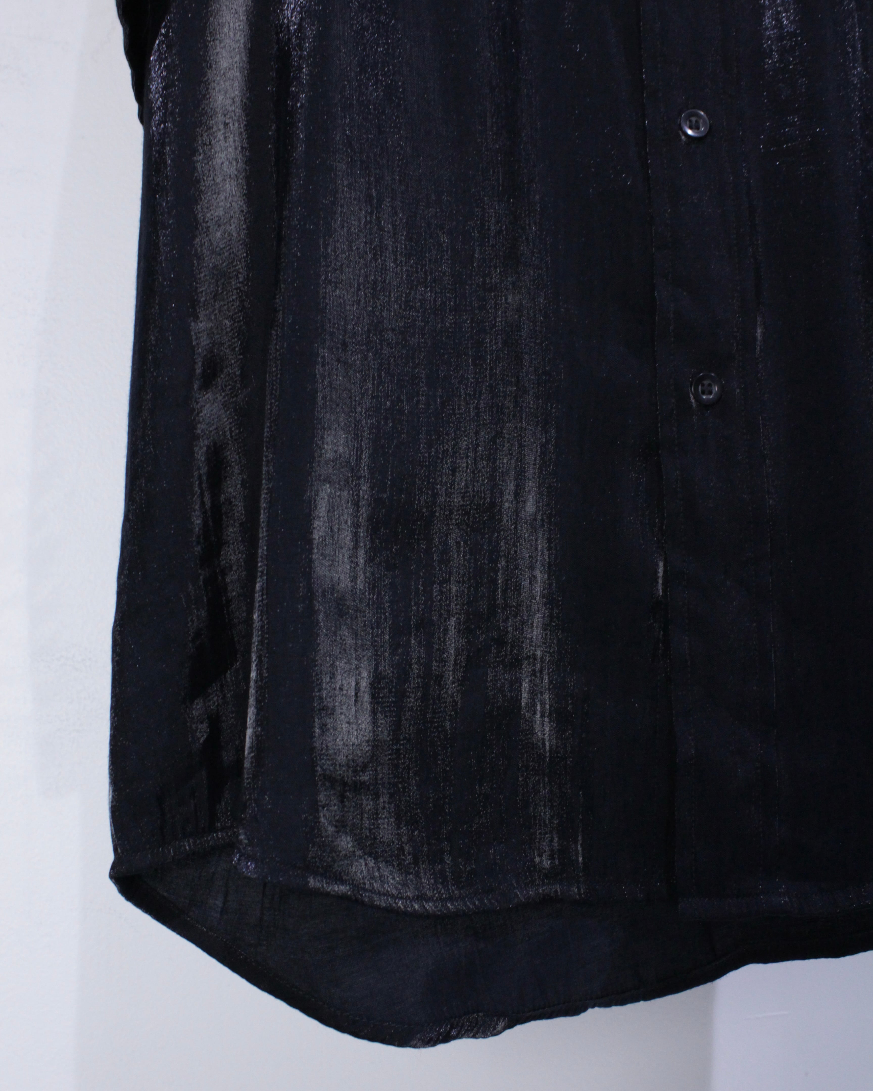 メタリックな光沢を帯びたファブリックをボディに使用した半袖シャツ。