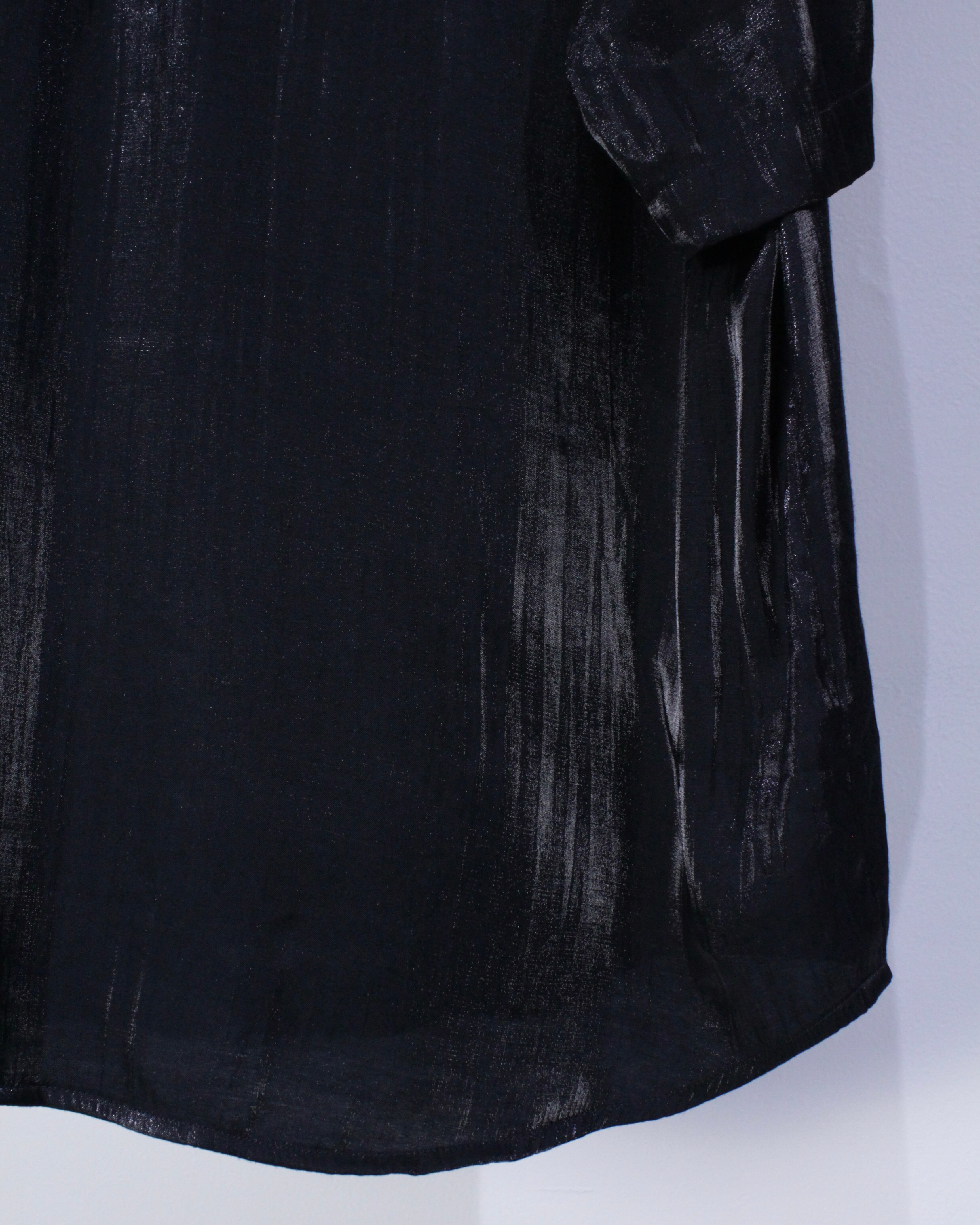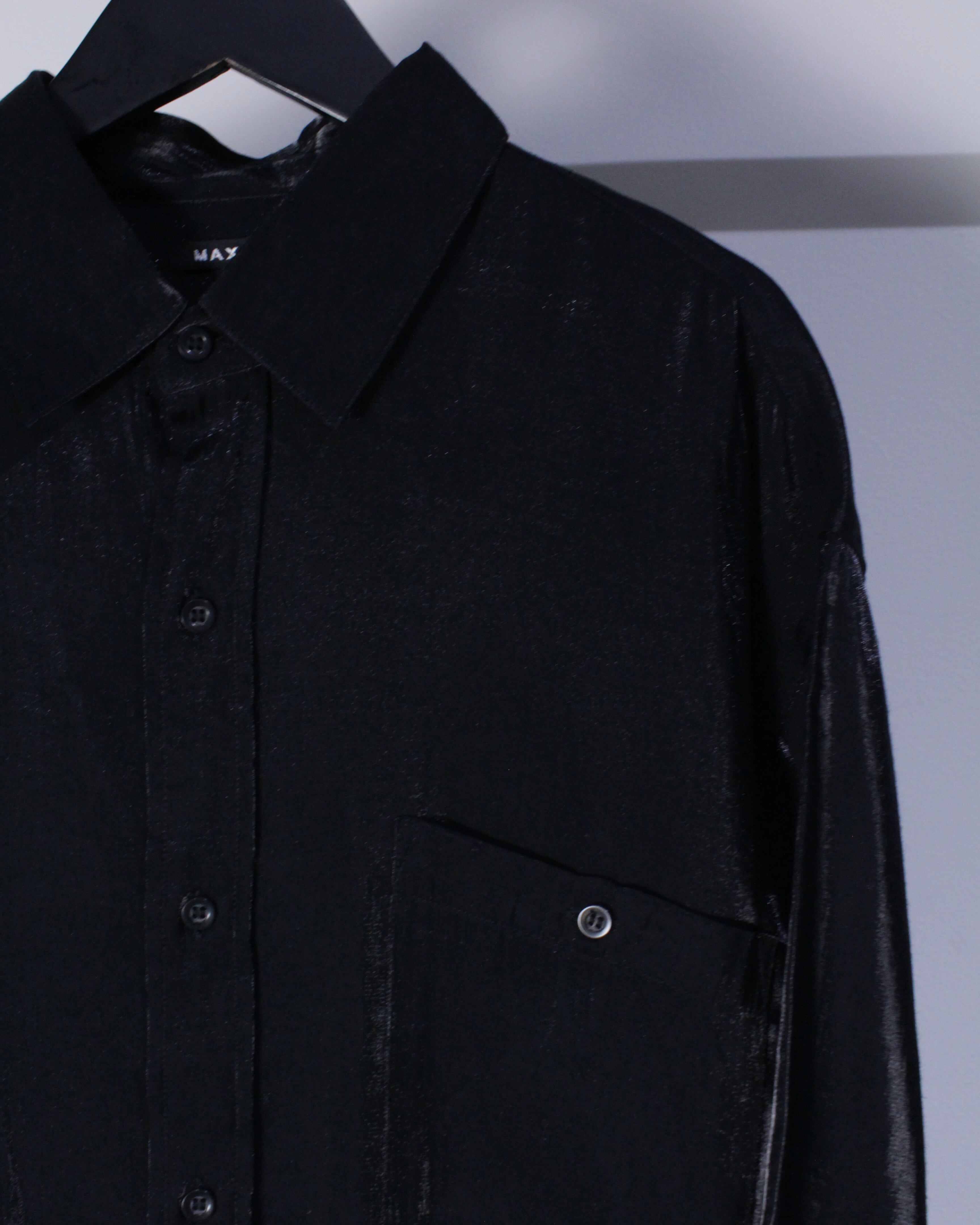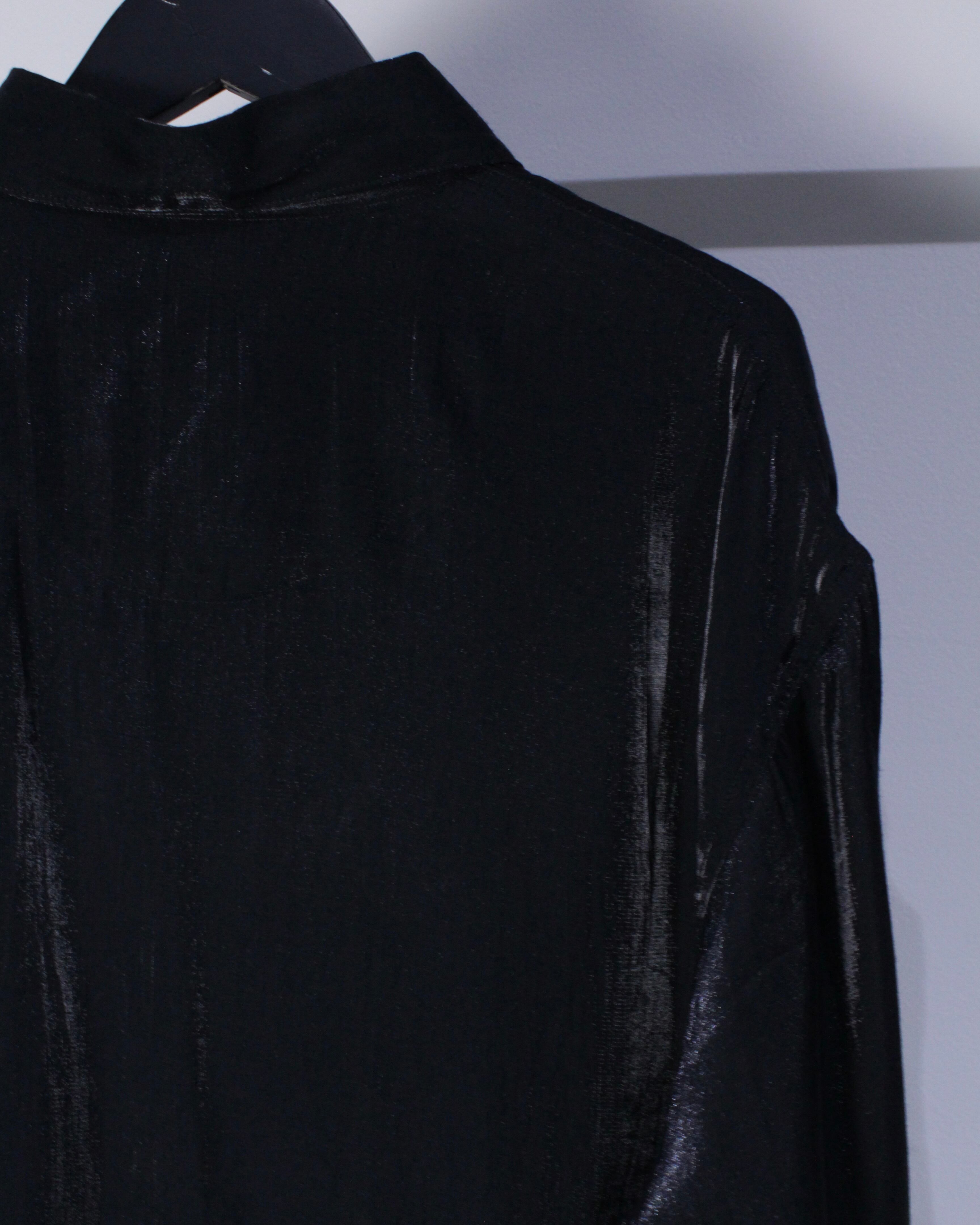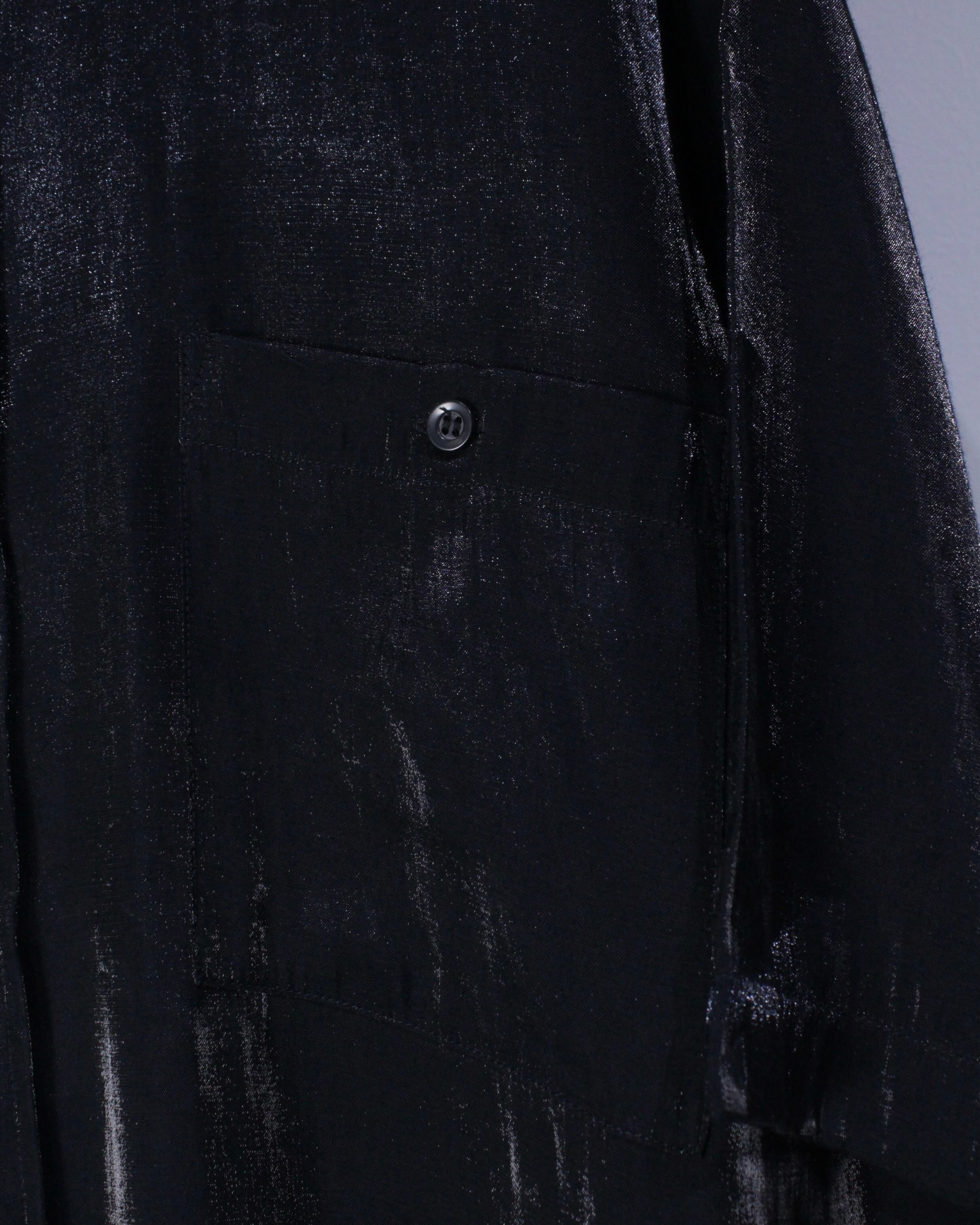 オールブラックの無地に左胸にパッチポケットを配したミニマルなデザインながらも、ハリのある光沢感が存在感を見せる1枚。