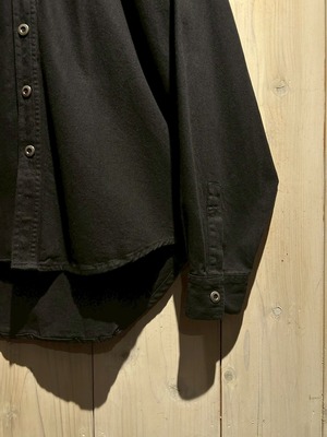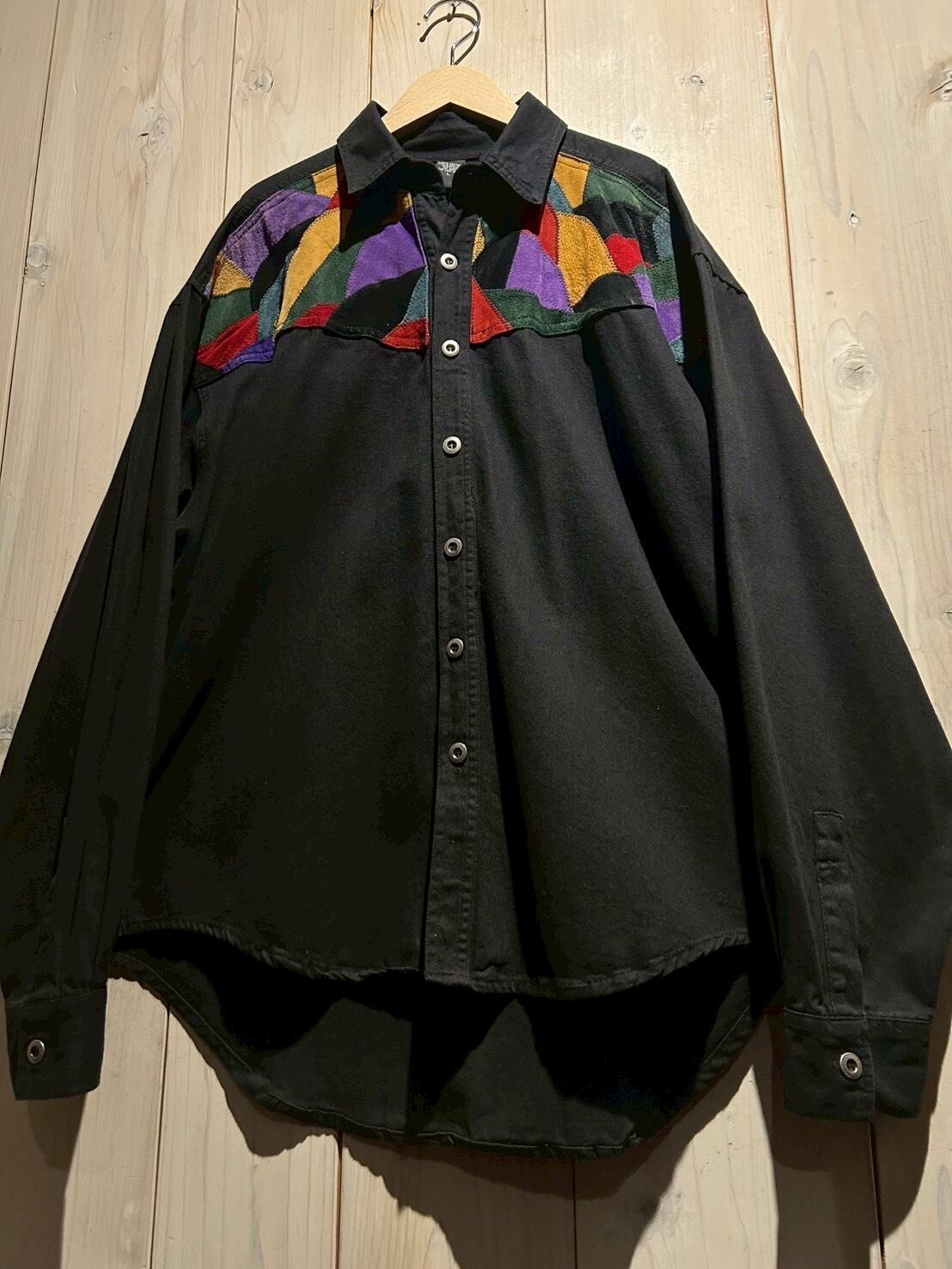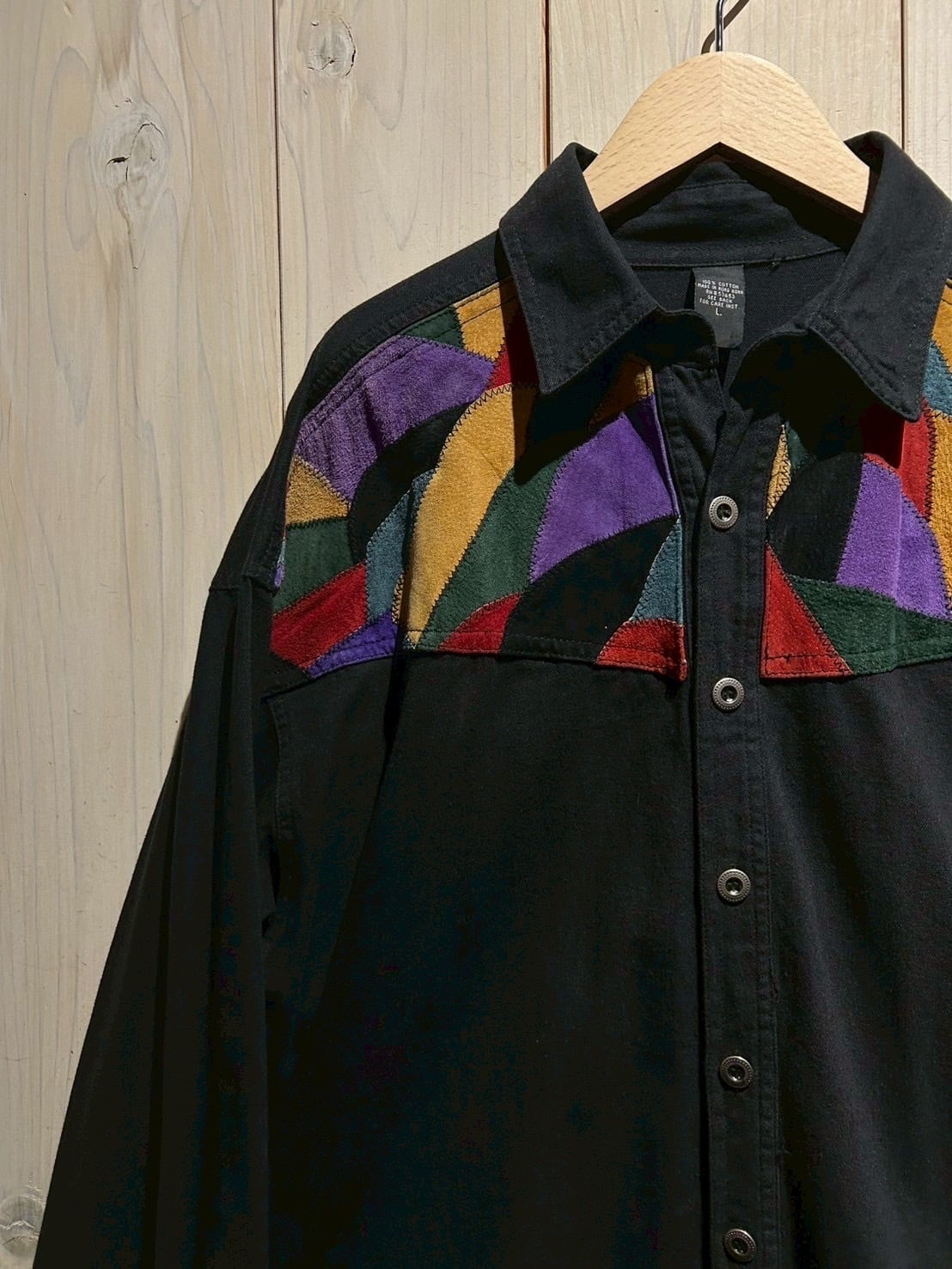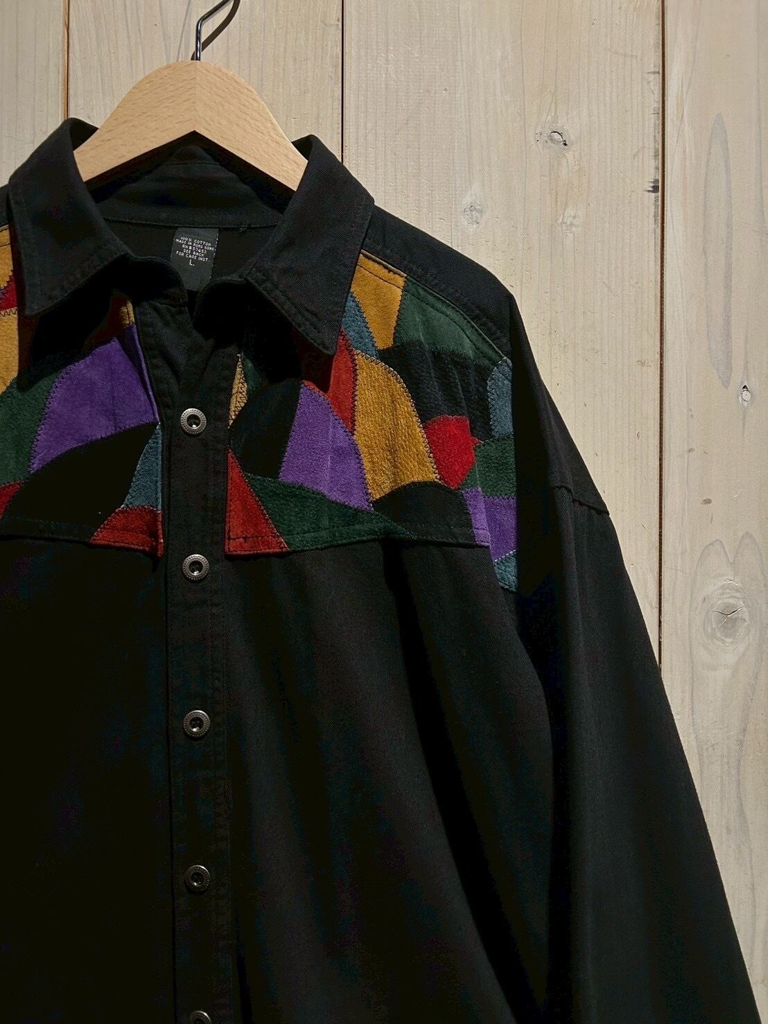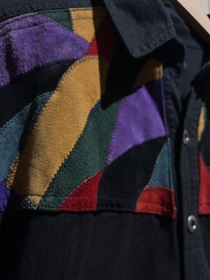 ガシッとしたブラックのコットンボディのヨーク部分に、カラフルなスエードレザーをツギハギ状に切り替えた長袖シャツ。