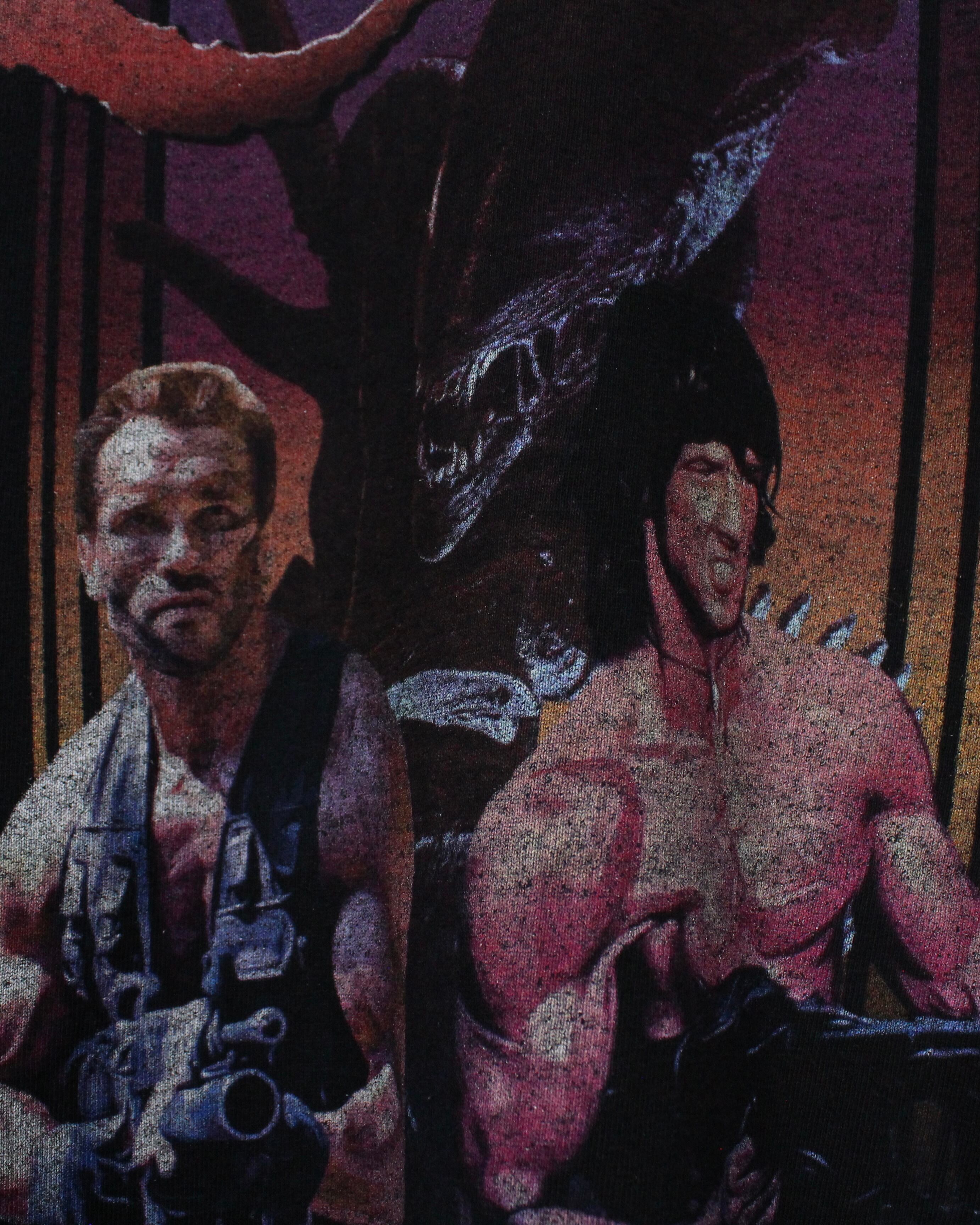 ゲームのカバーアートを本家の実写映画で再現しており、「エイリアン」や「プレデター」に登場するアーノルド・シュワルツェネッガー演じるダッチ少佐、そして「ランボー」のジョン・ランボーが並び立つ豪華な1着。