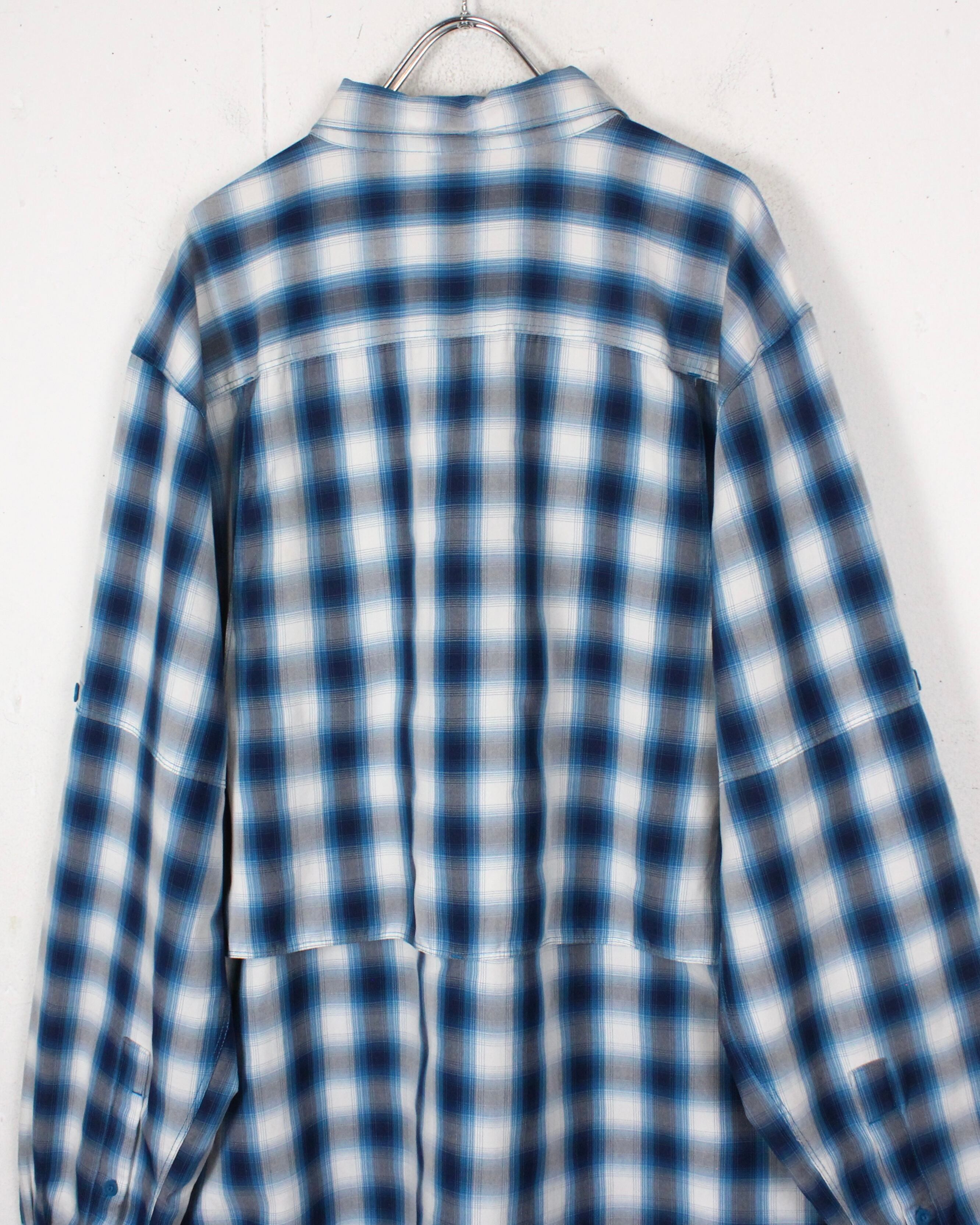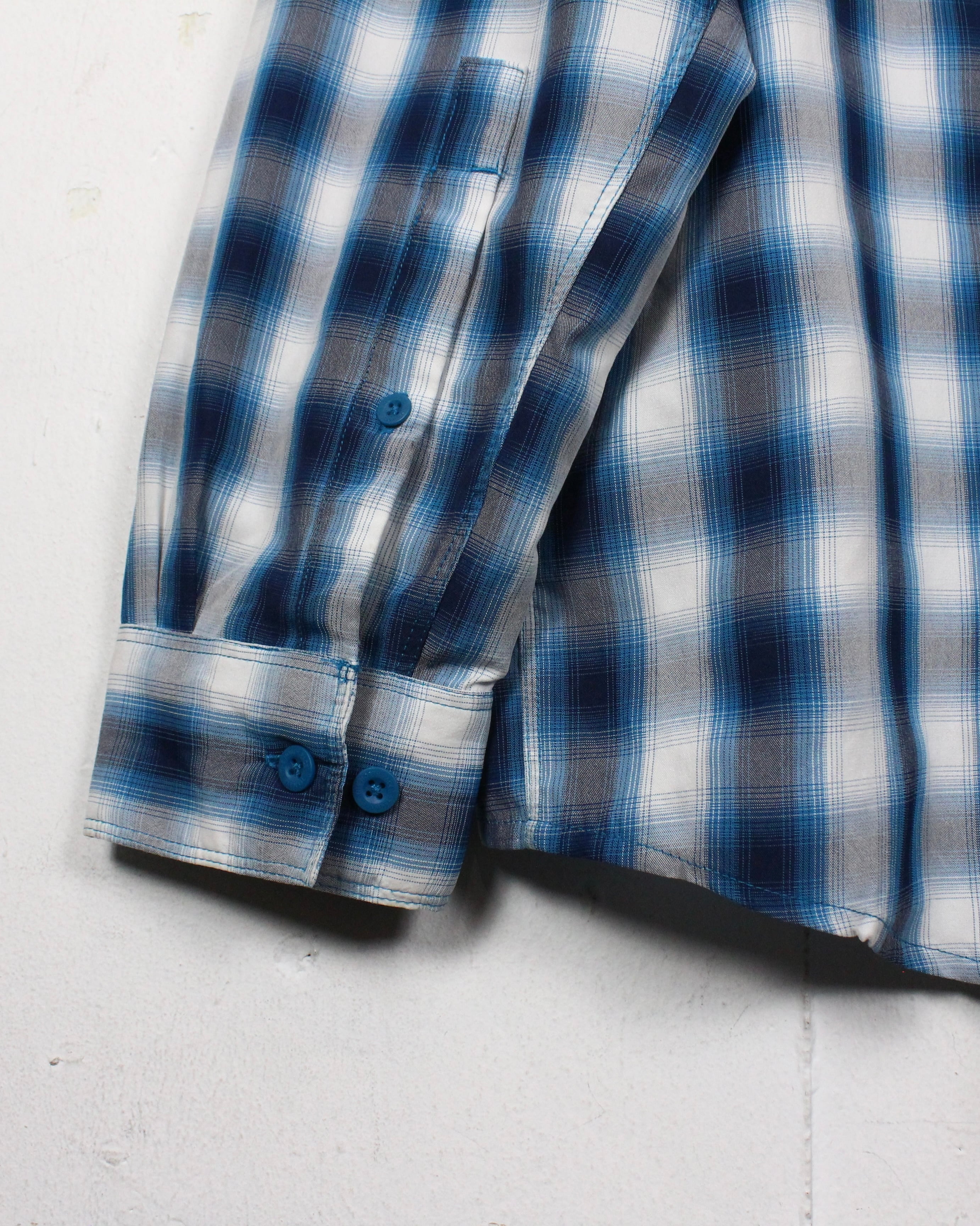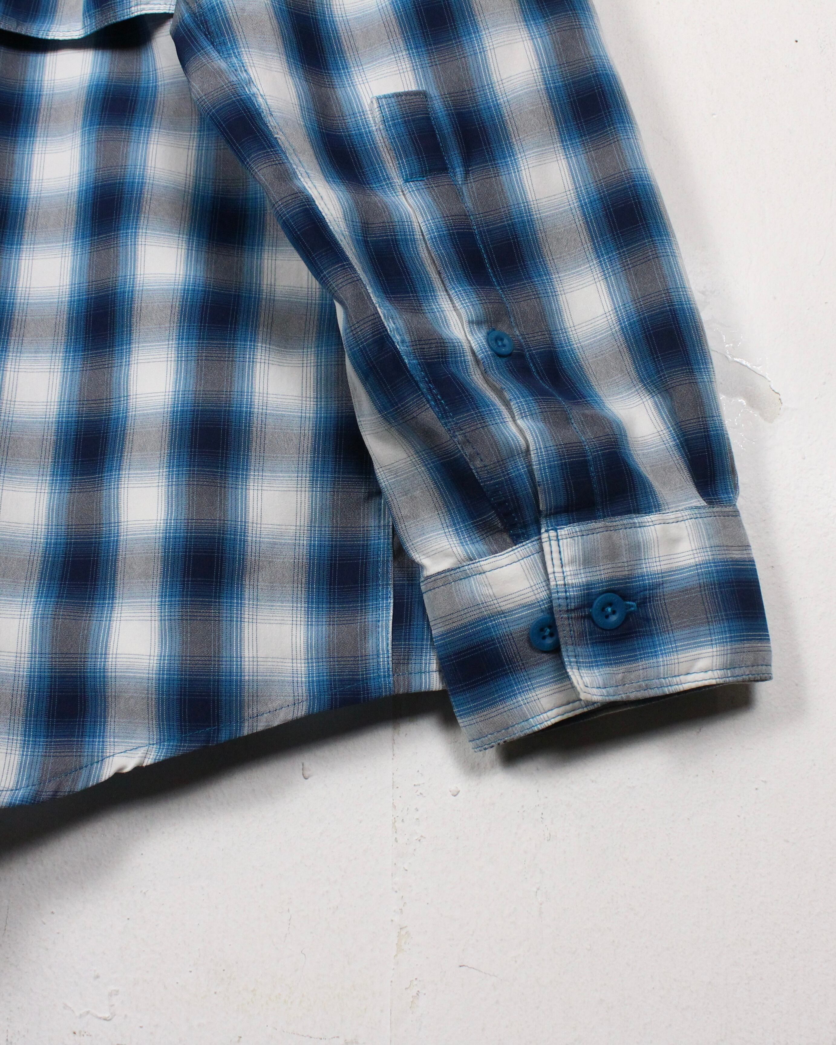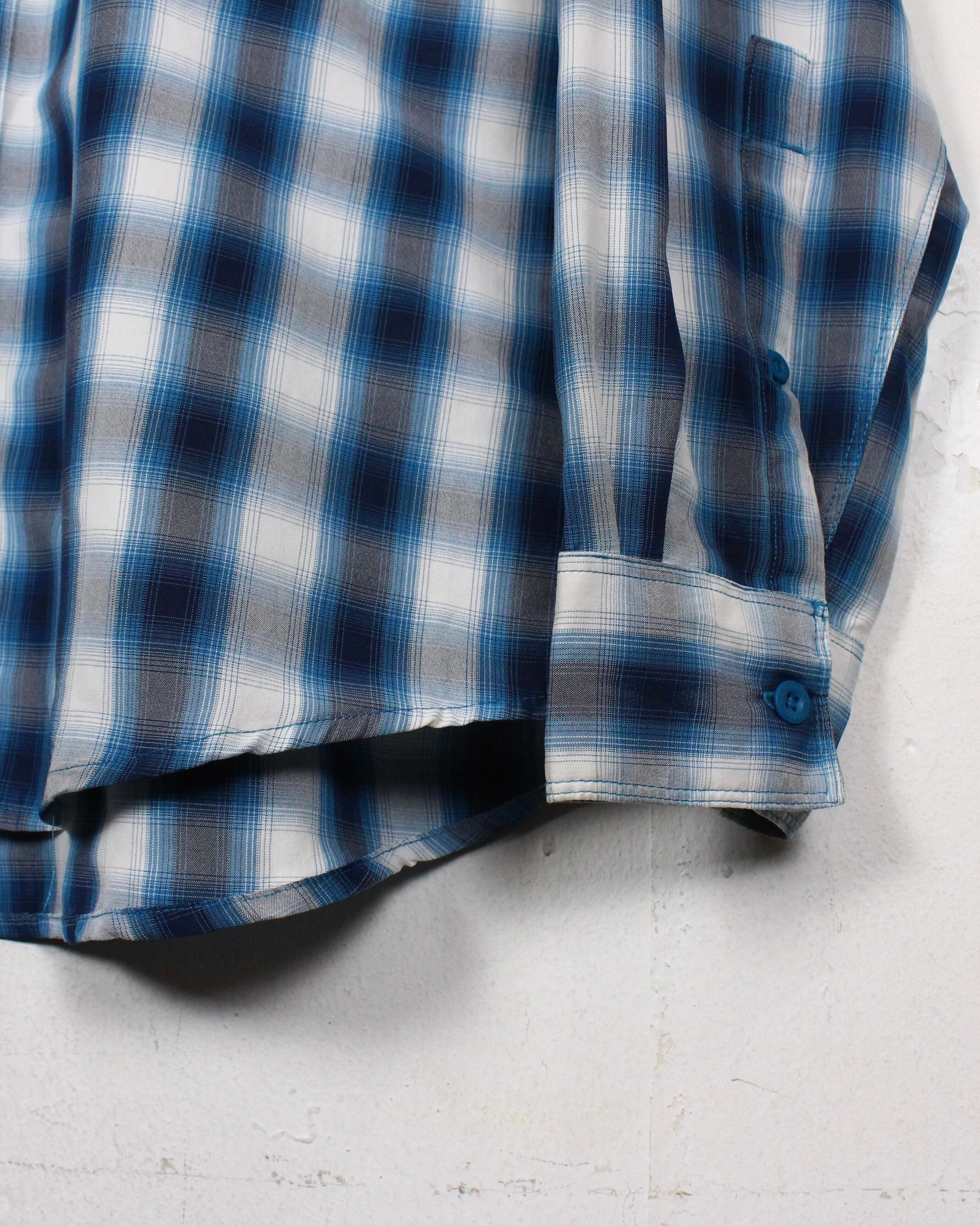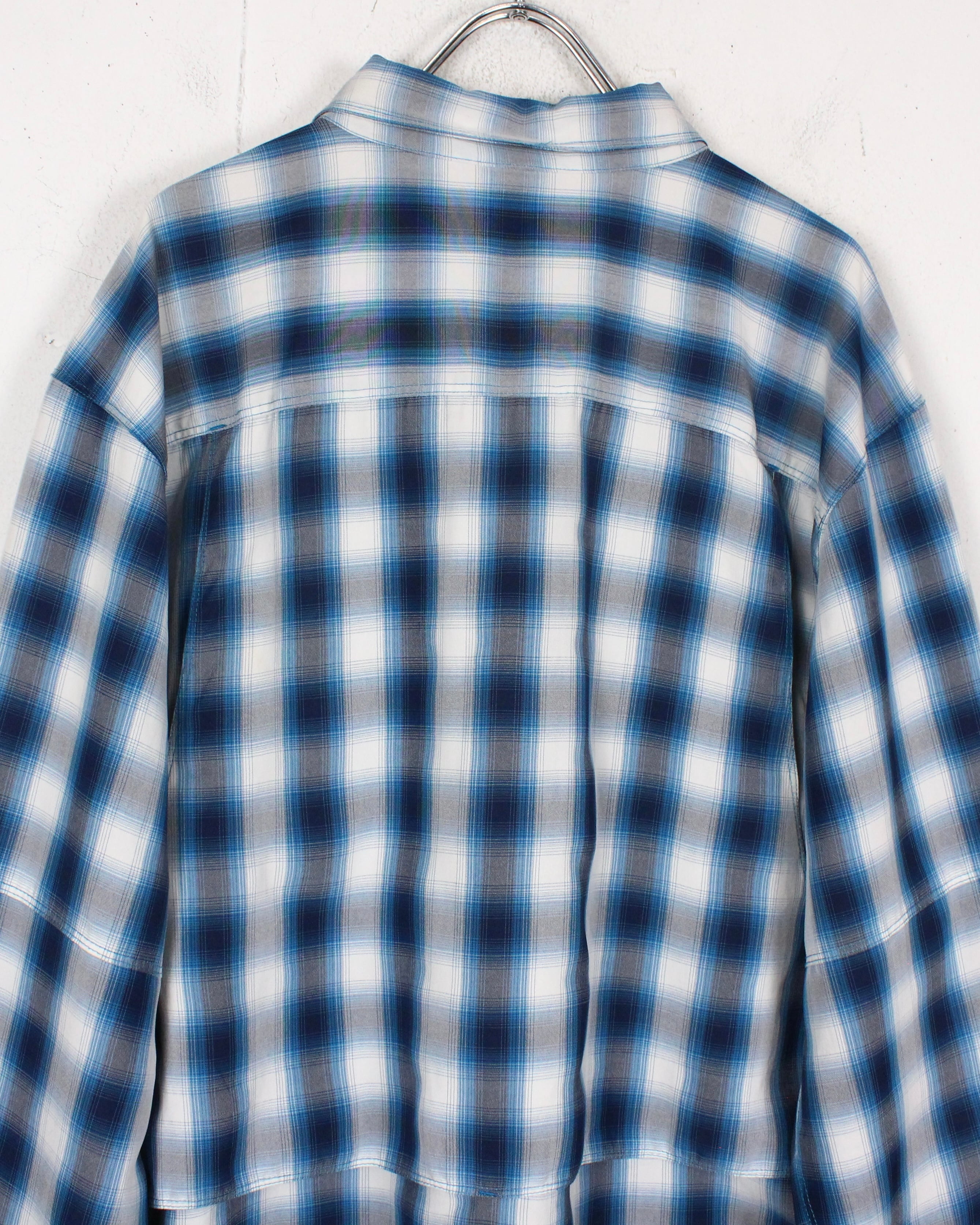 ハリを持ちつつ、とろみ、滑らかな落ち感も兼ね備えたポリレーヨンのボディに、青、グレー、白のカラーリングでオンブレチェックを載せた長袖シャツ。