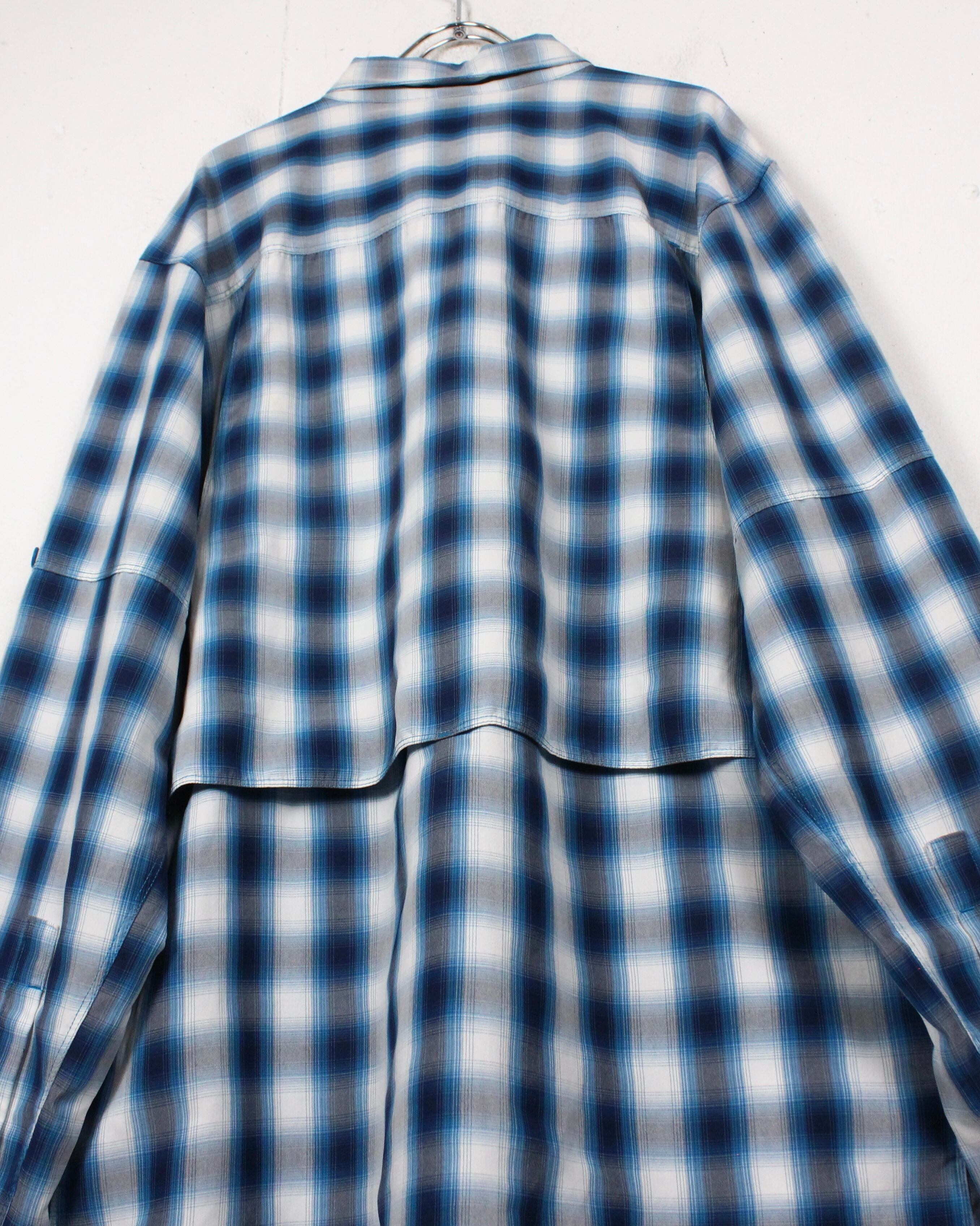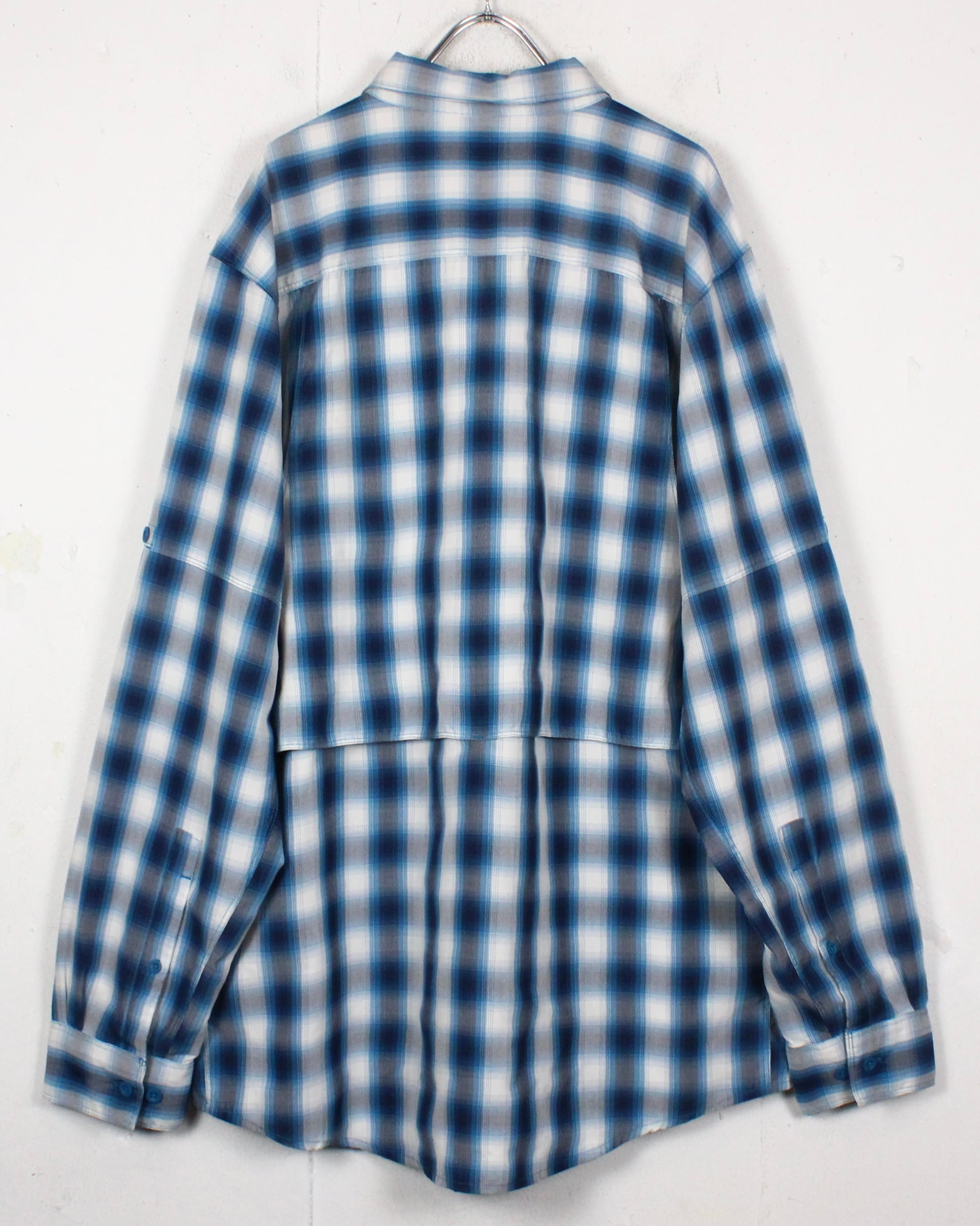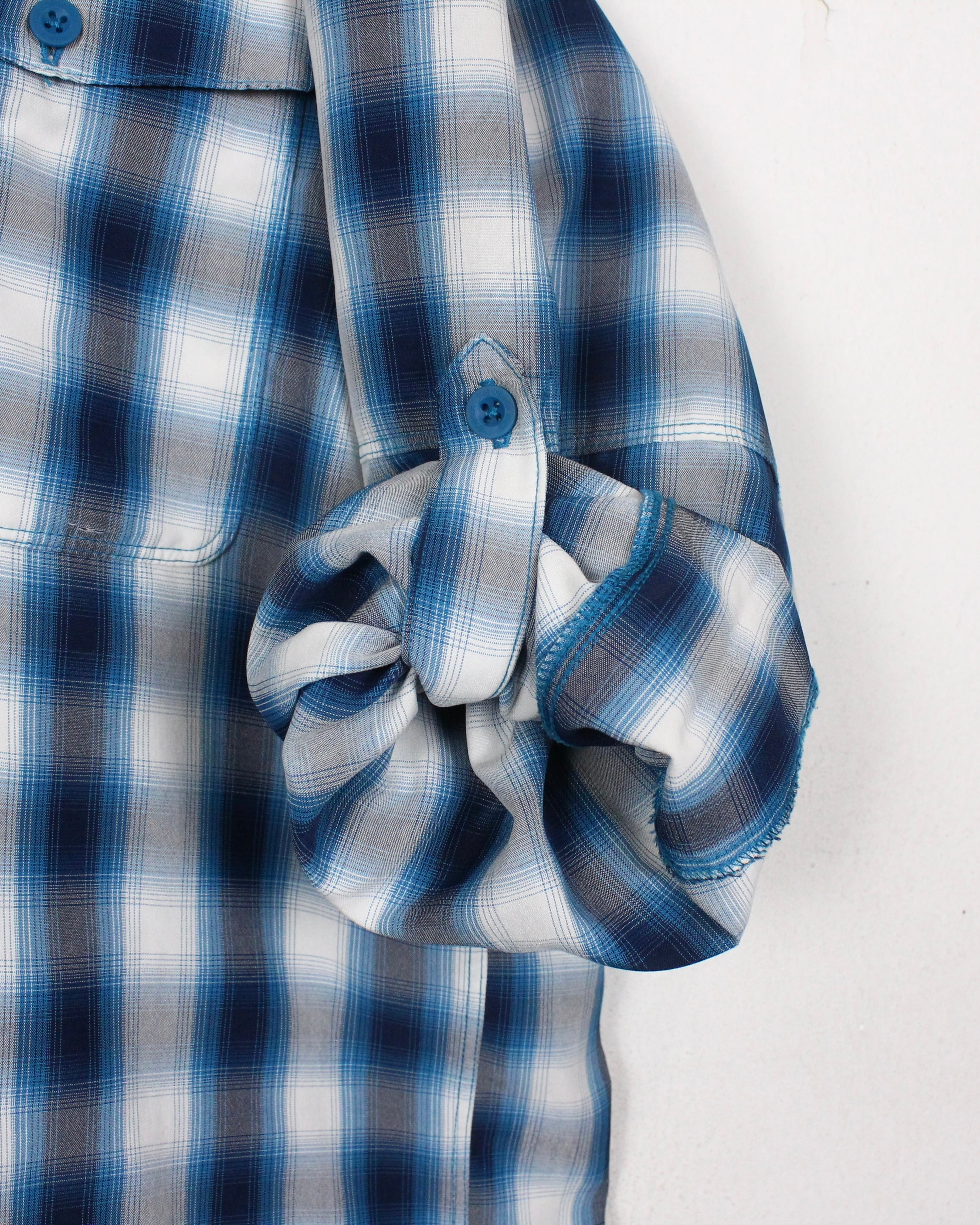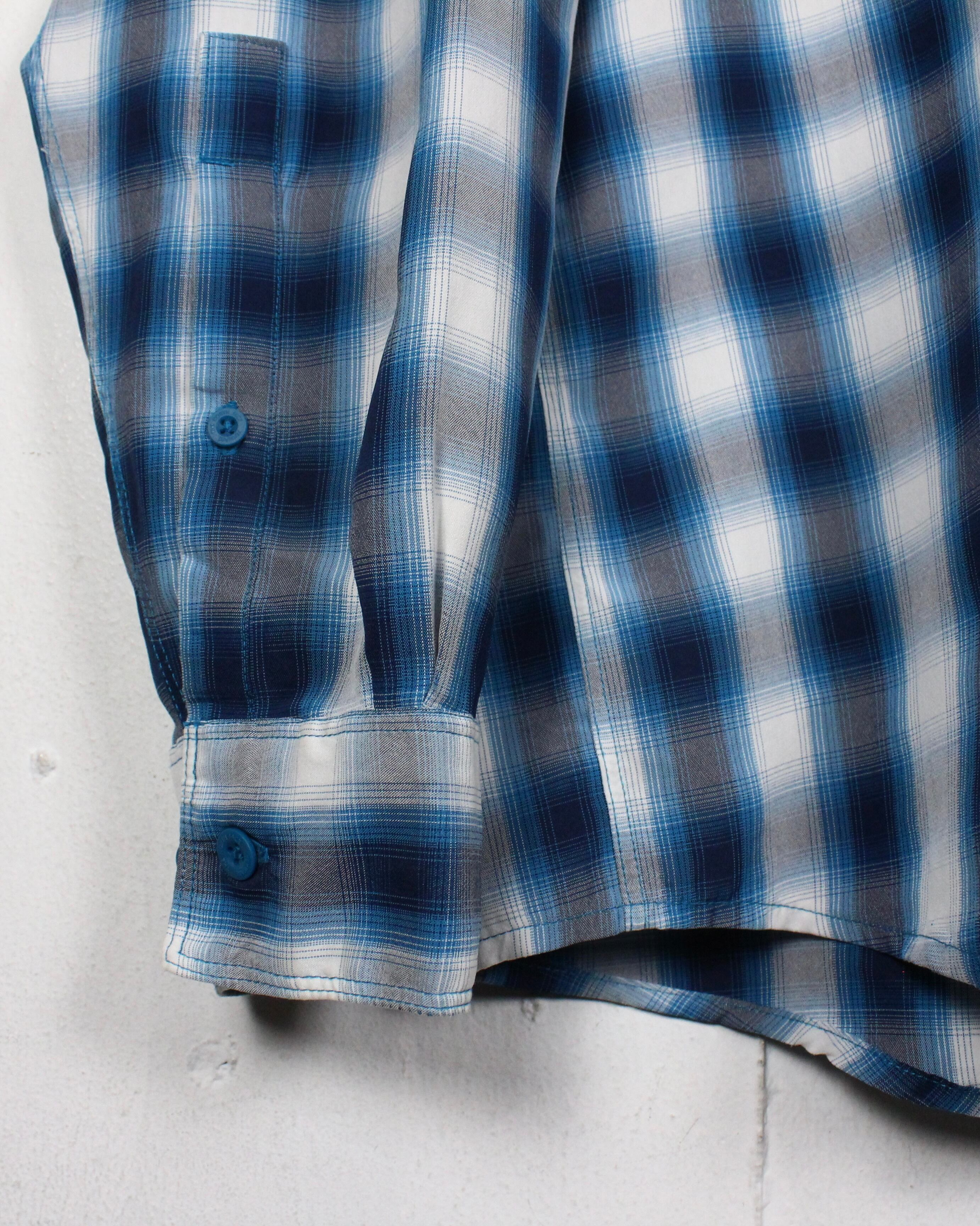 ハリを持ちつつ、とろみ、滑らかな落ち感も兼ね備えたポリレーヨンのボディに、青、グレー、白のカラーリングでオンブレチェックを載せた長袖シャツ。
