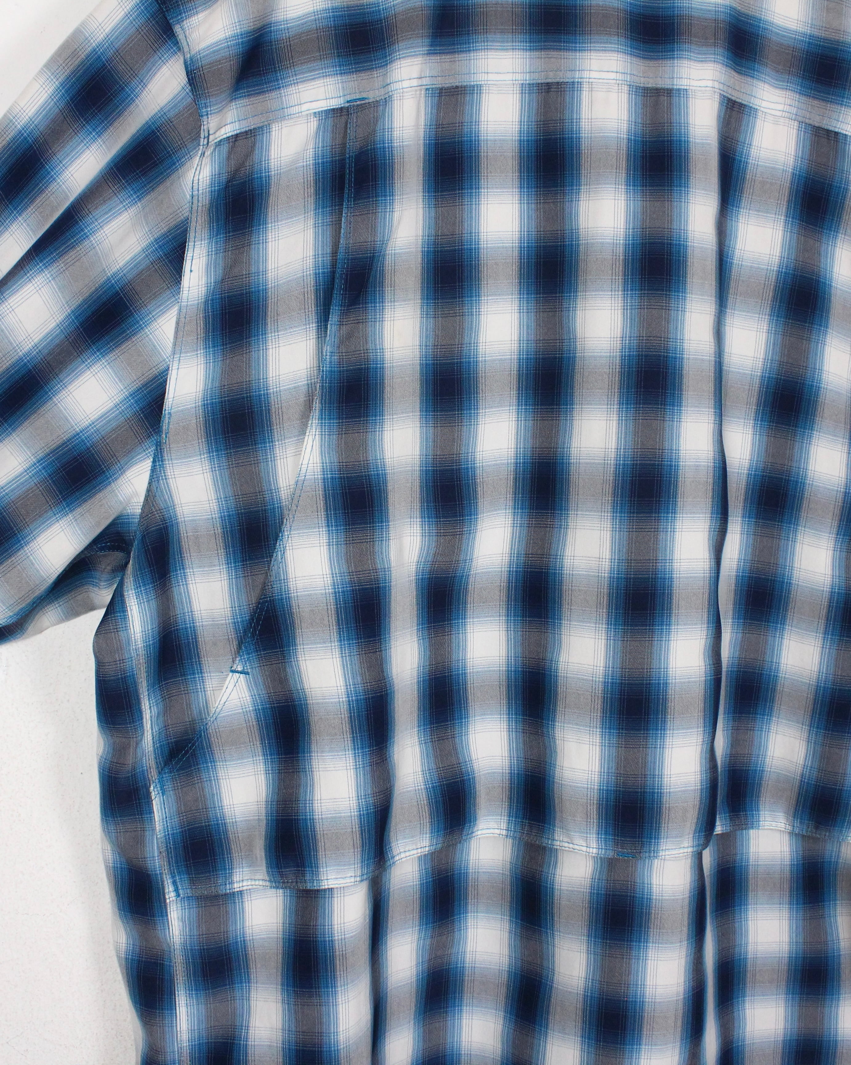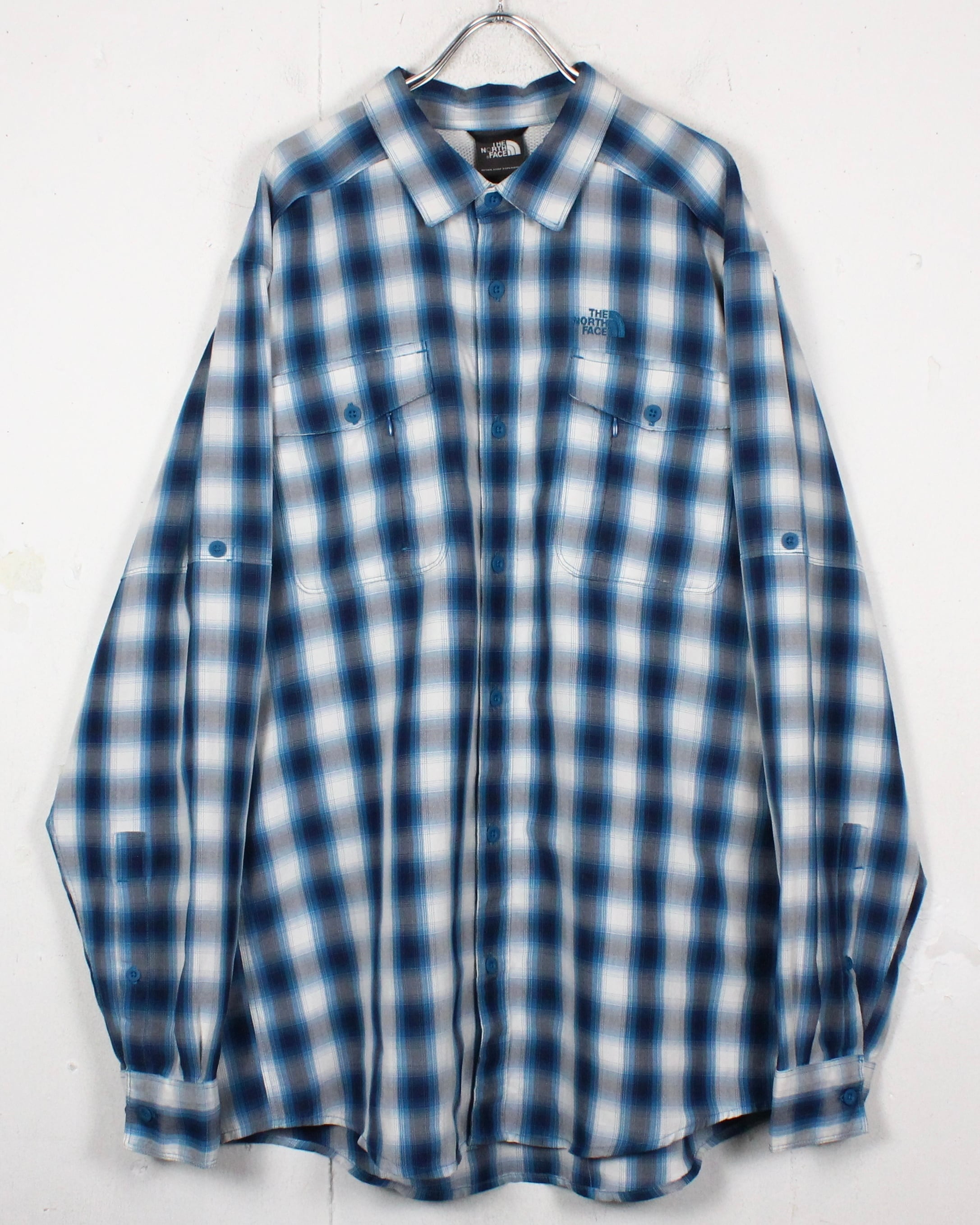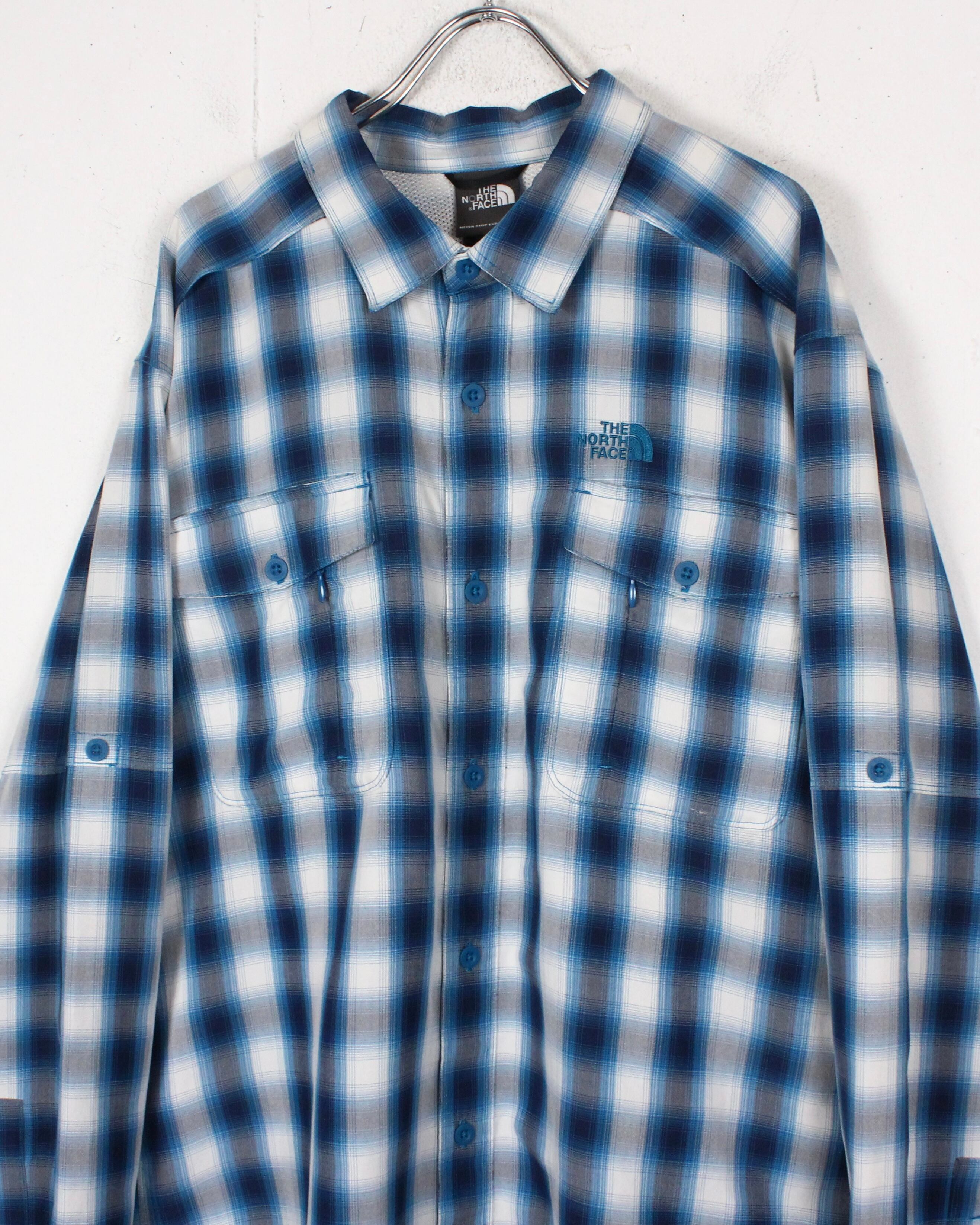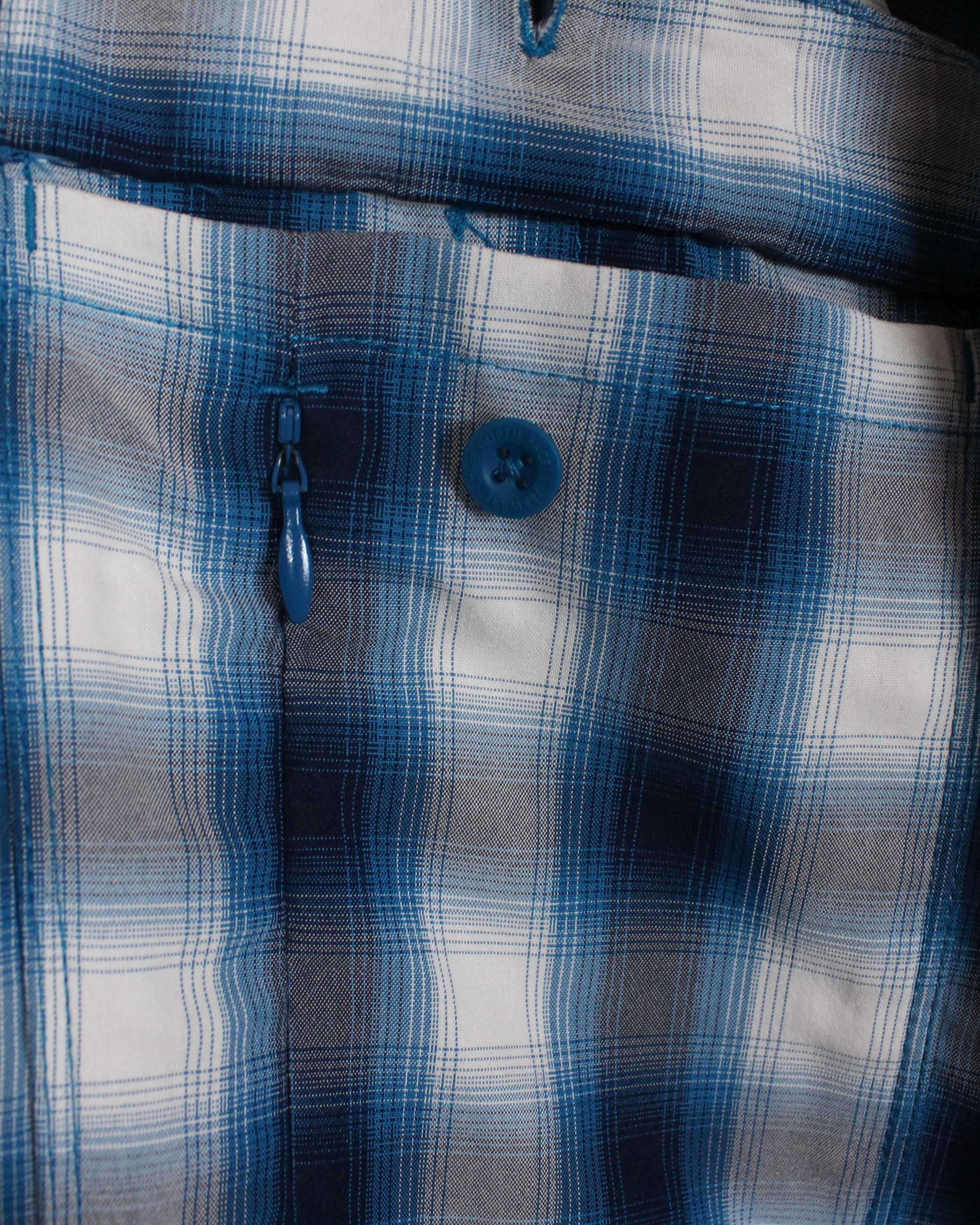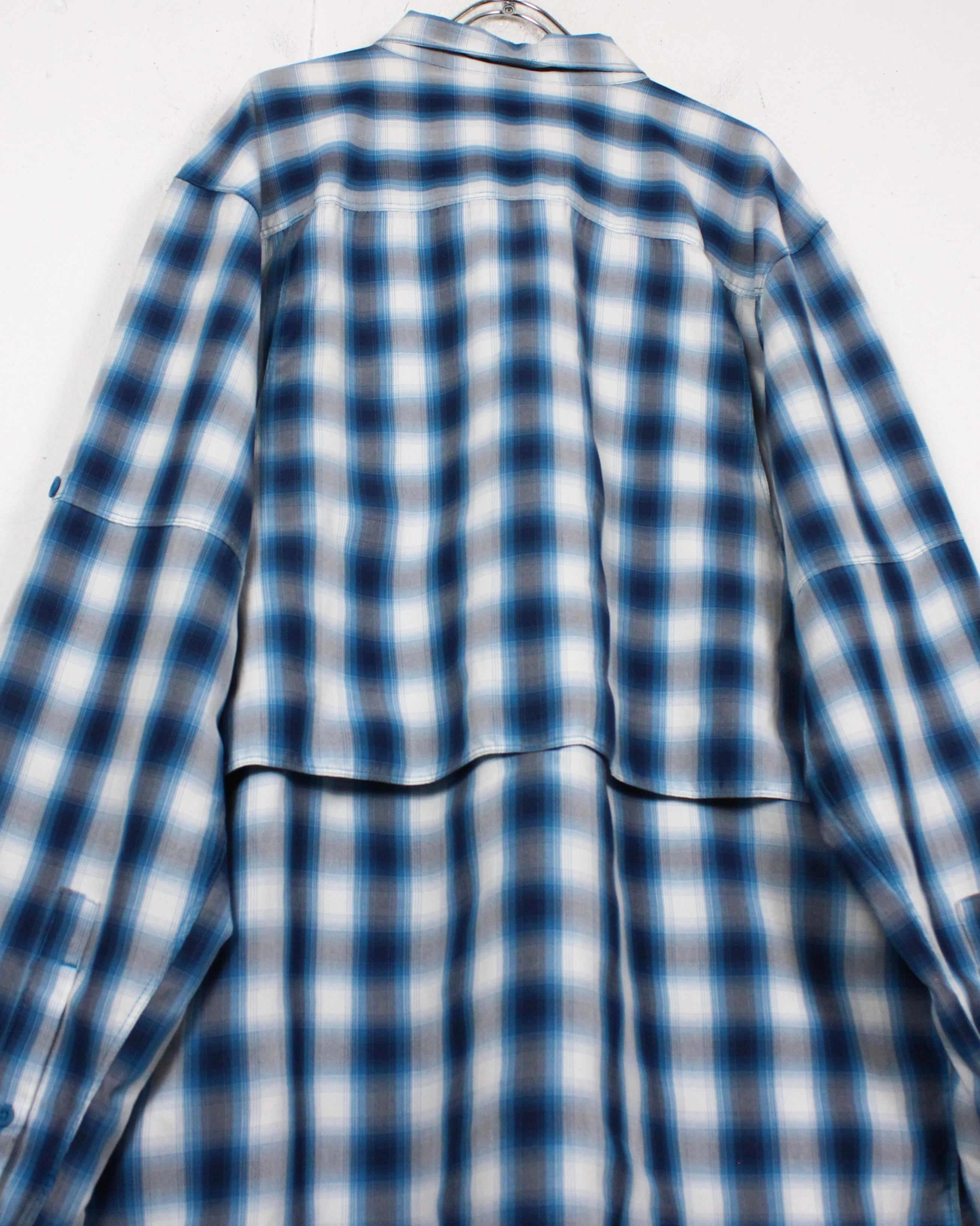 ハリを持ちつつ、とろみ、滑らかな落ち感も兼ね備えたポリレーヨンのボディに、青、グレー、白のカラーリングでオンブレチェックを載せた長袖シャツ。
