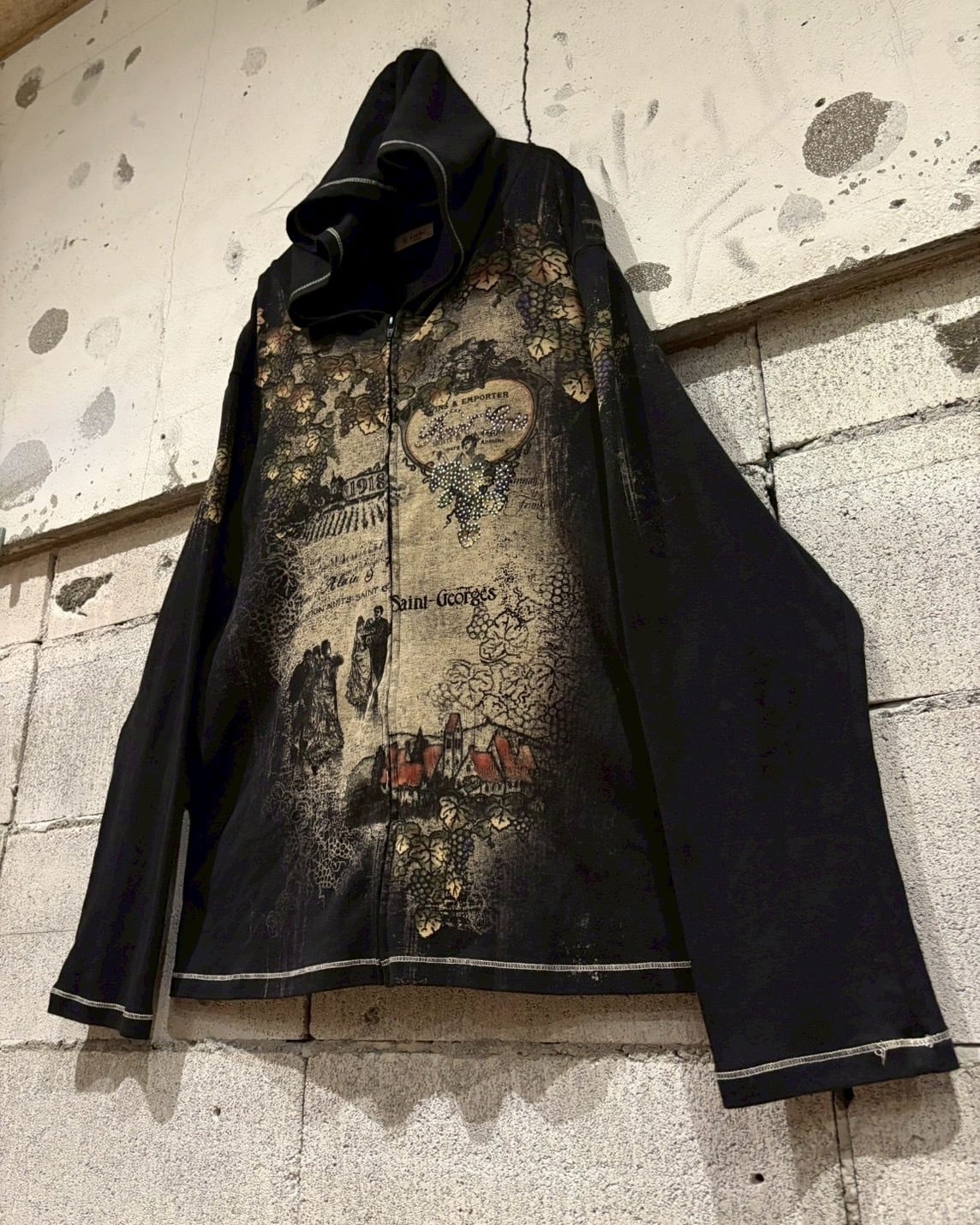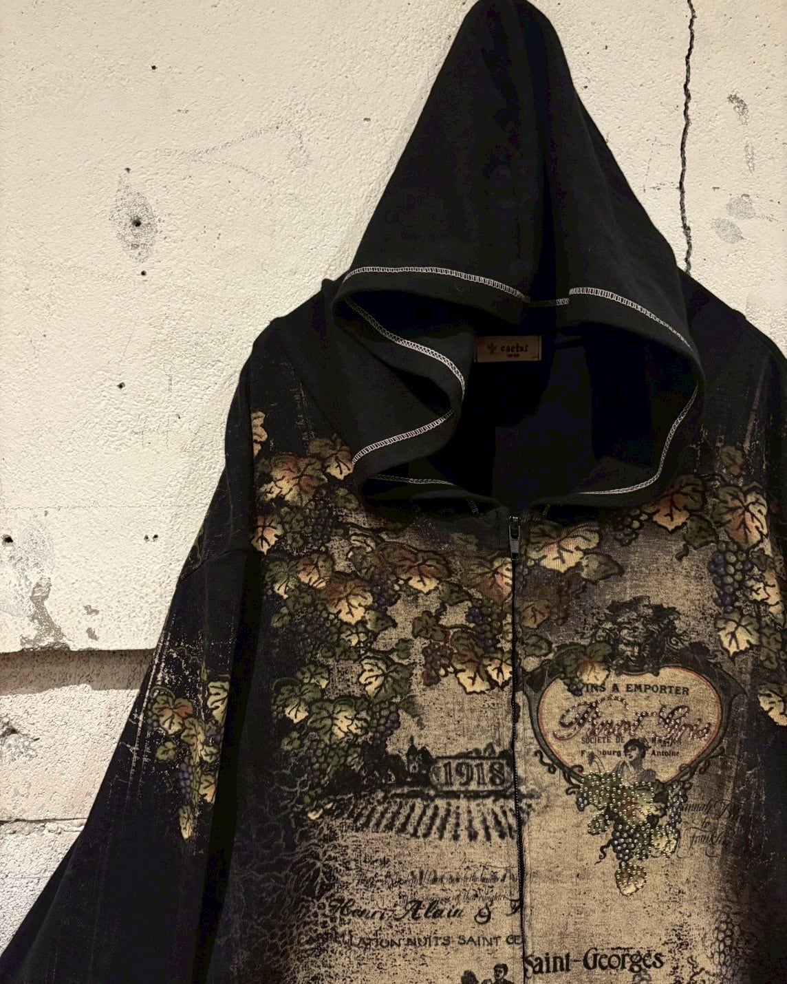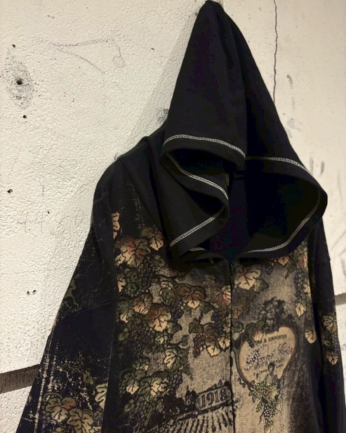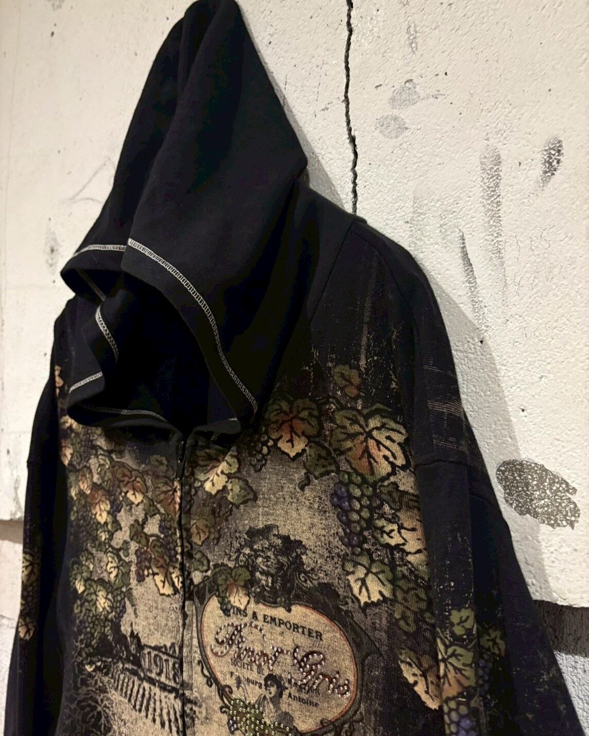 ブラックのボディをベースに、ゴシックなデザインをプリントしたジップアップフーディ。