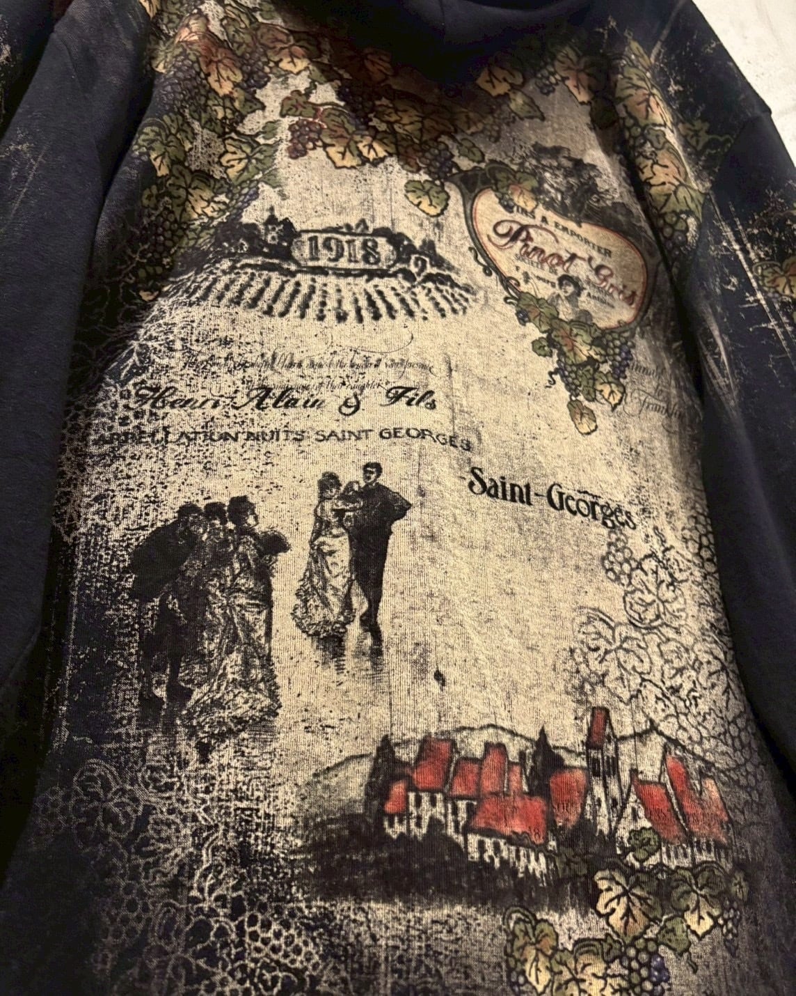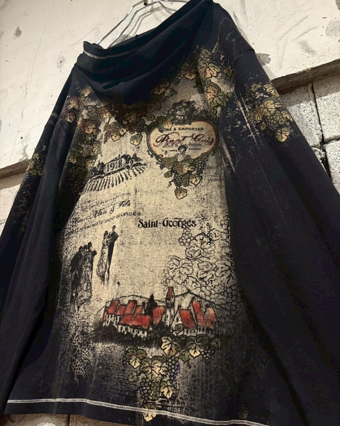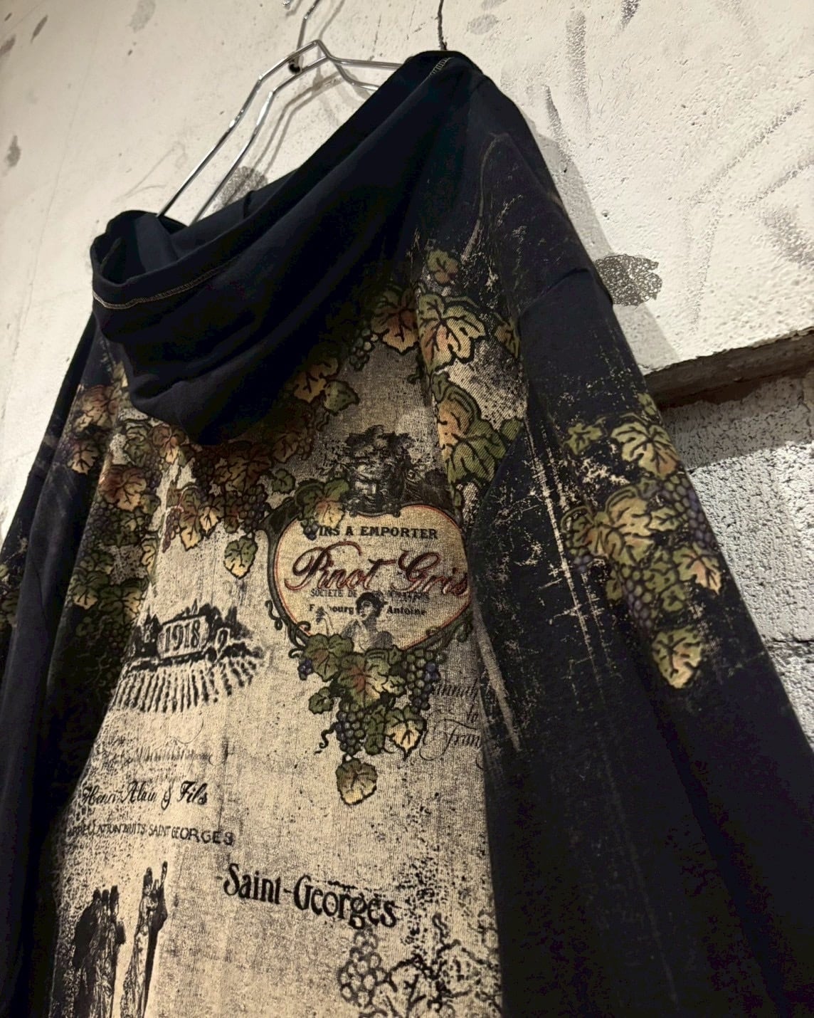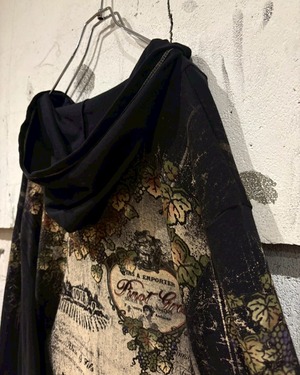 ブラックのボディをベースに、ゴシックなデザインをプリントしたジップアップフーディ。