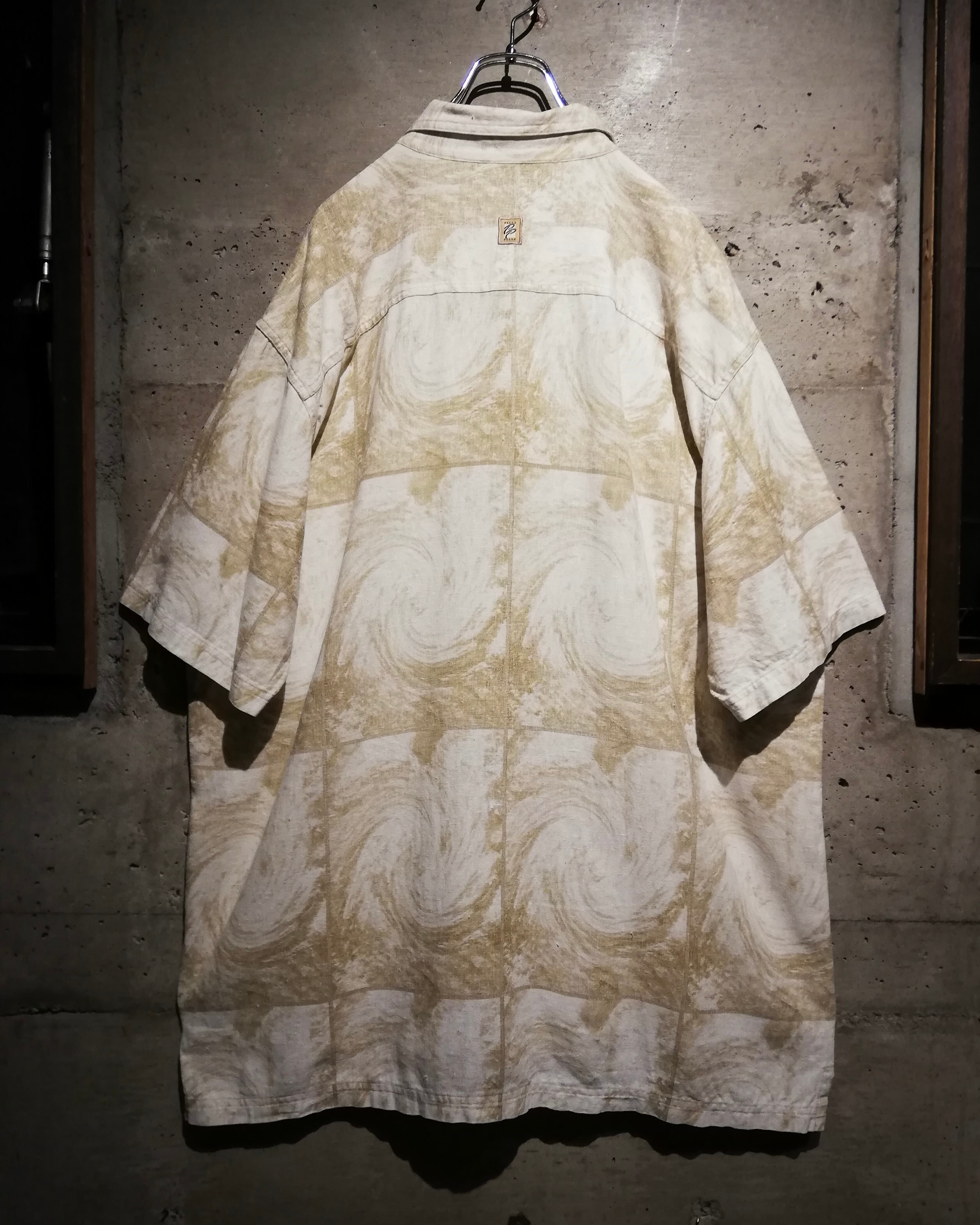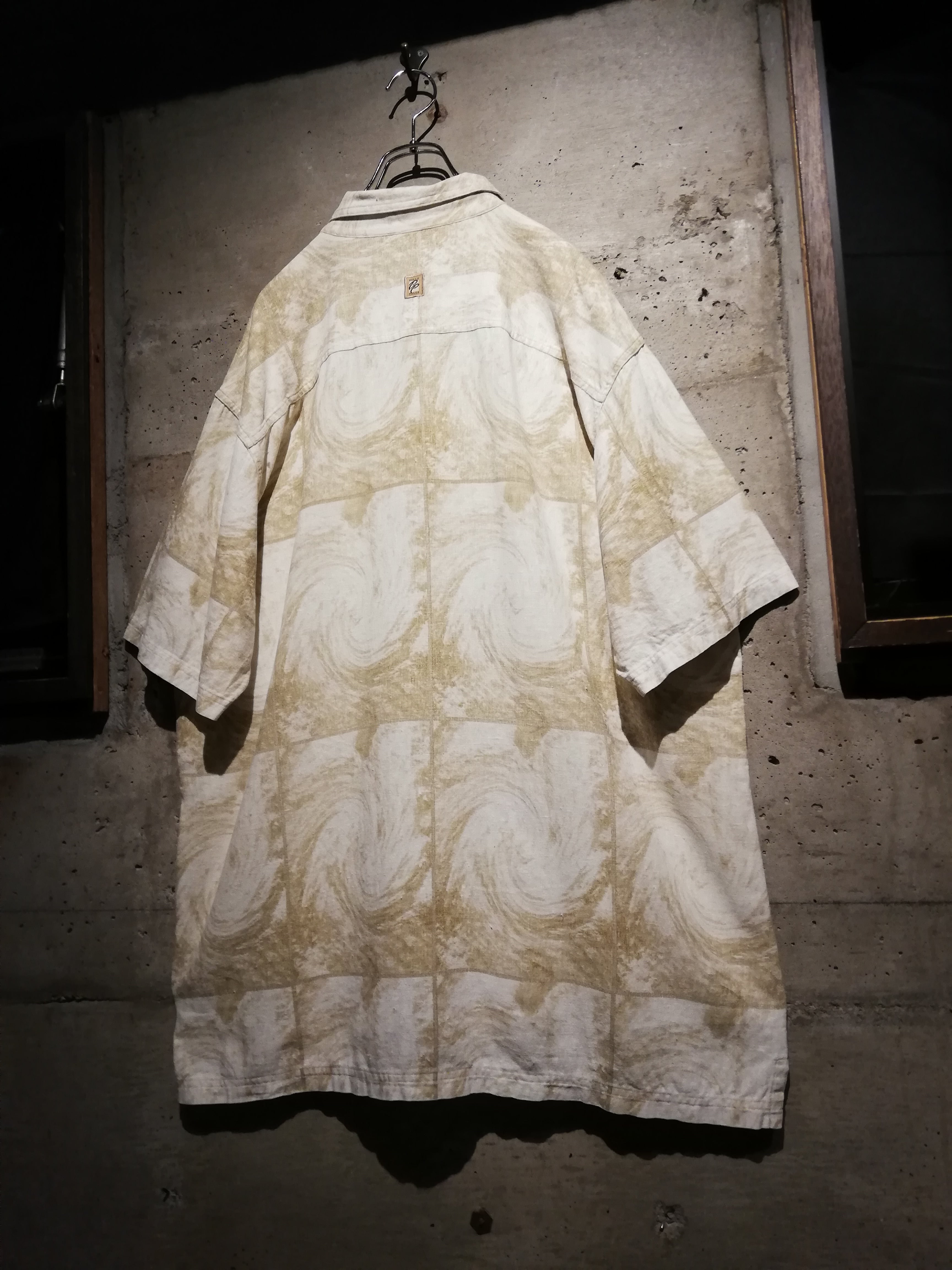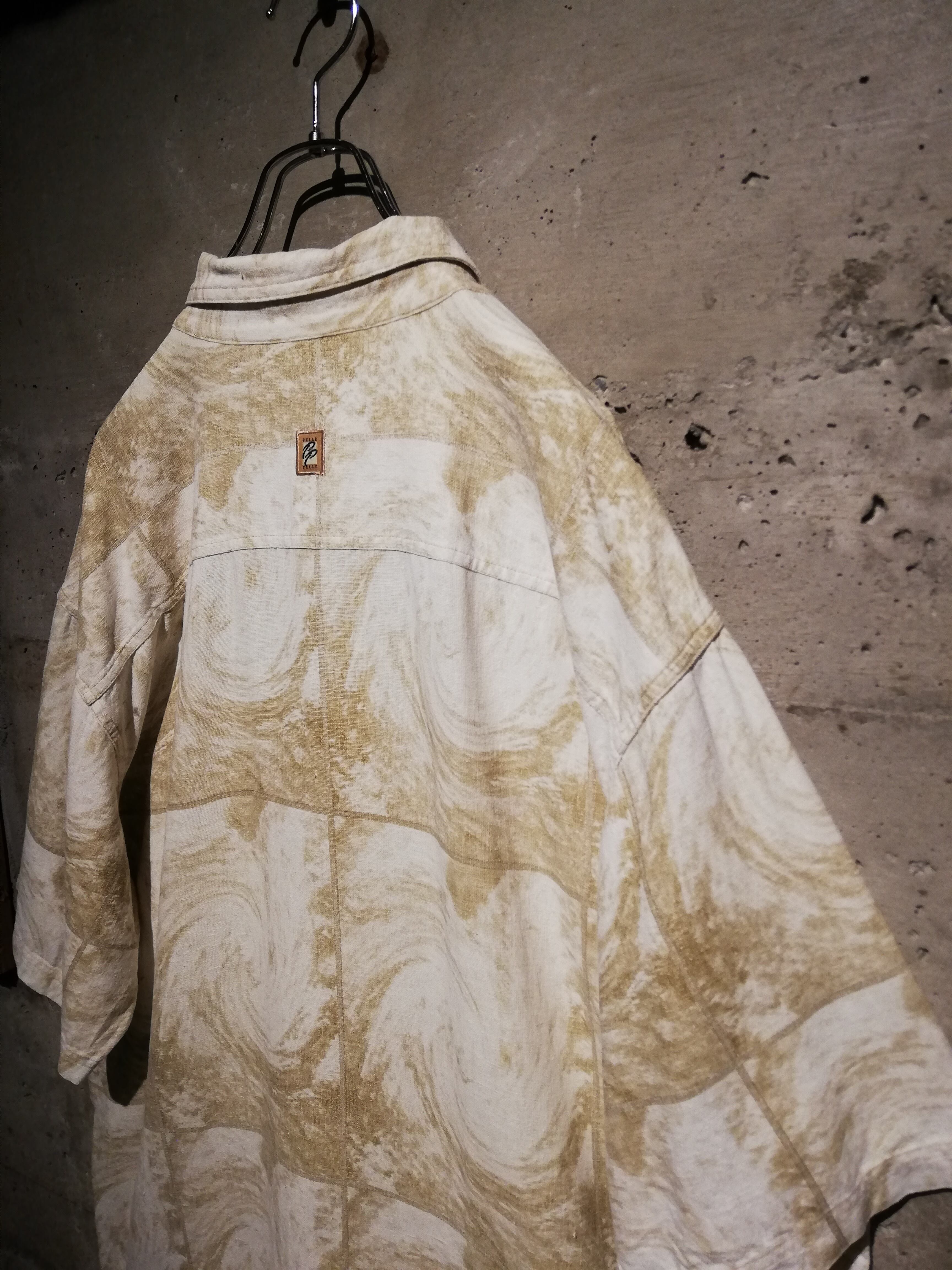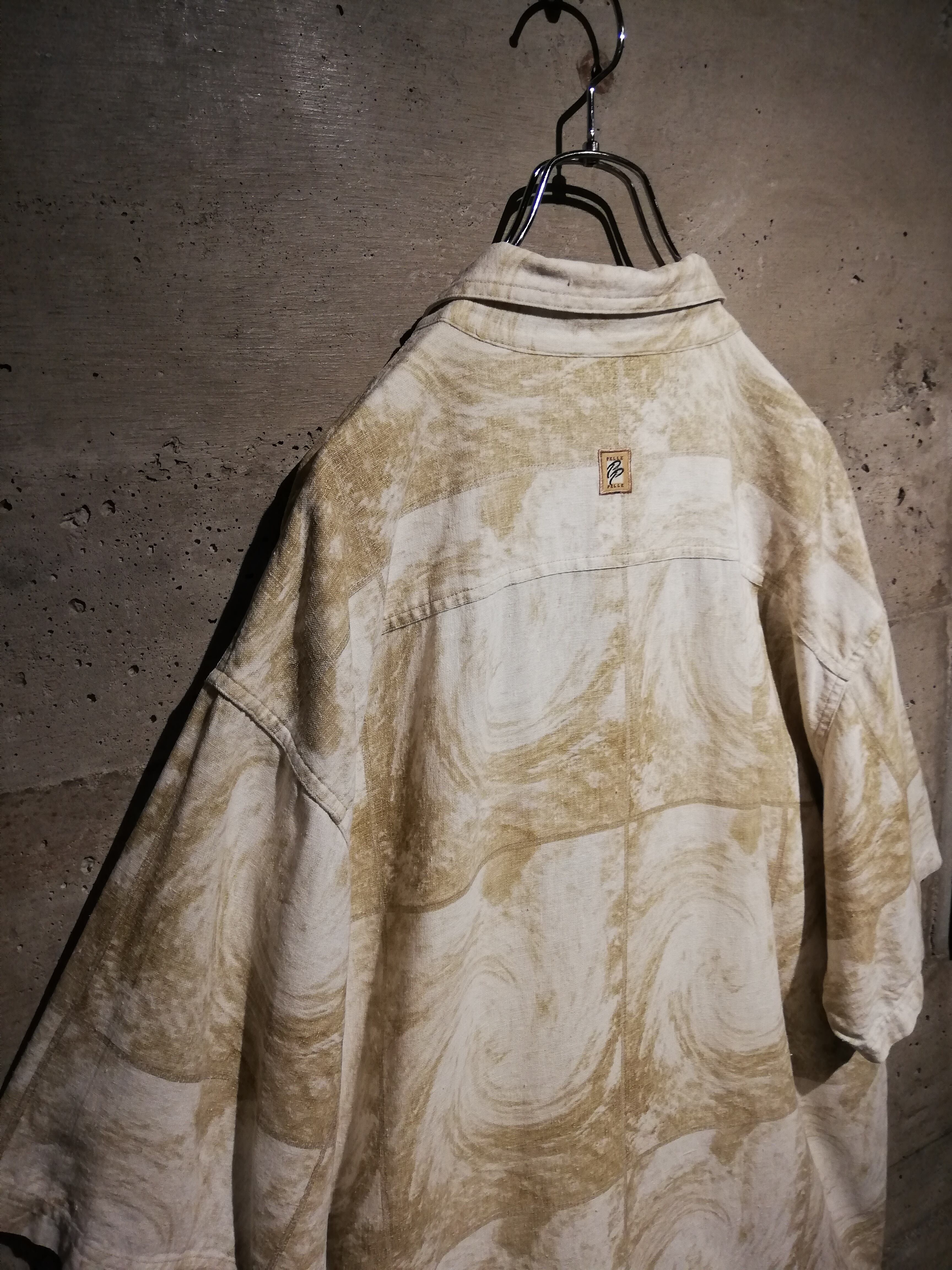 リネン×コットンを混紡した風合い豊かなボディに、アートテイストな渦巻き状の柄を全面に載せた、良い意味で裏切られた上品かつ洗練されたデザイン性を見せる1着。