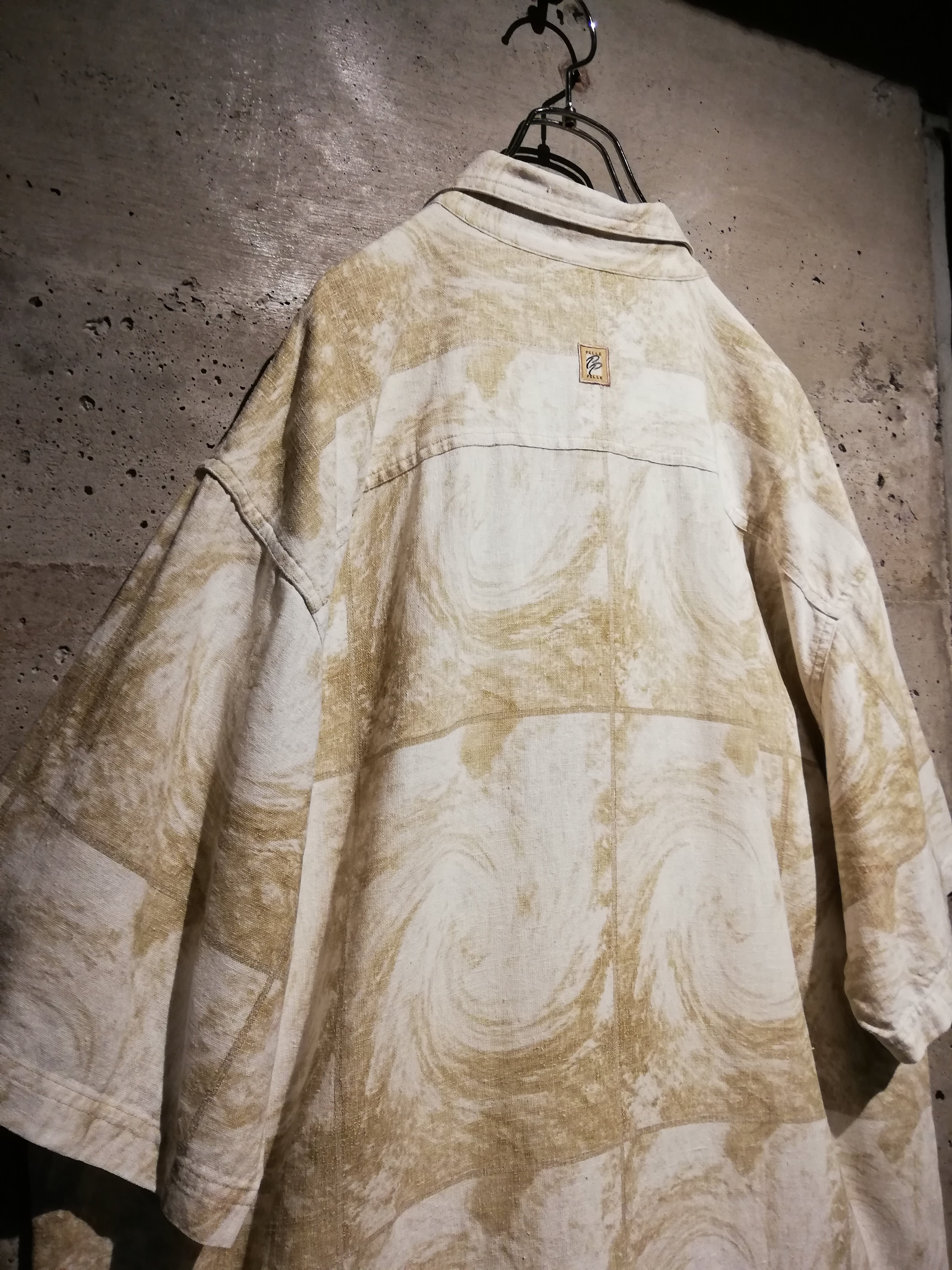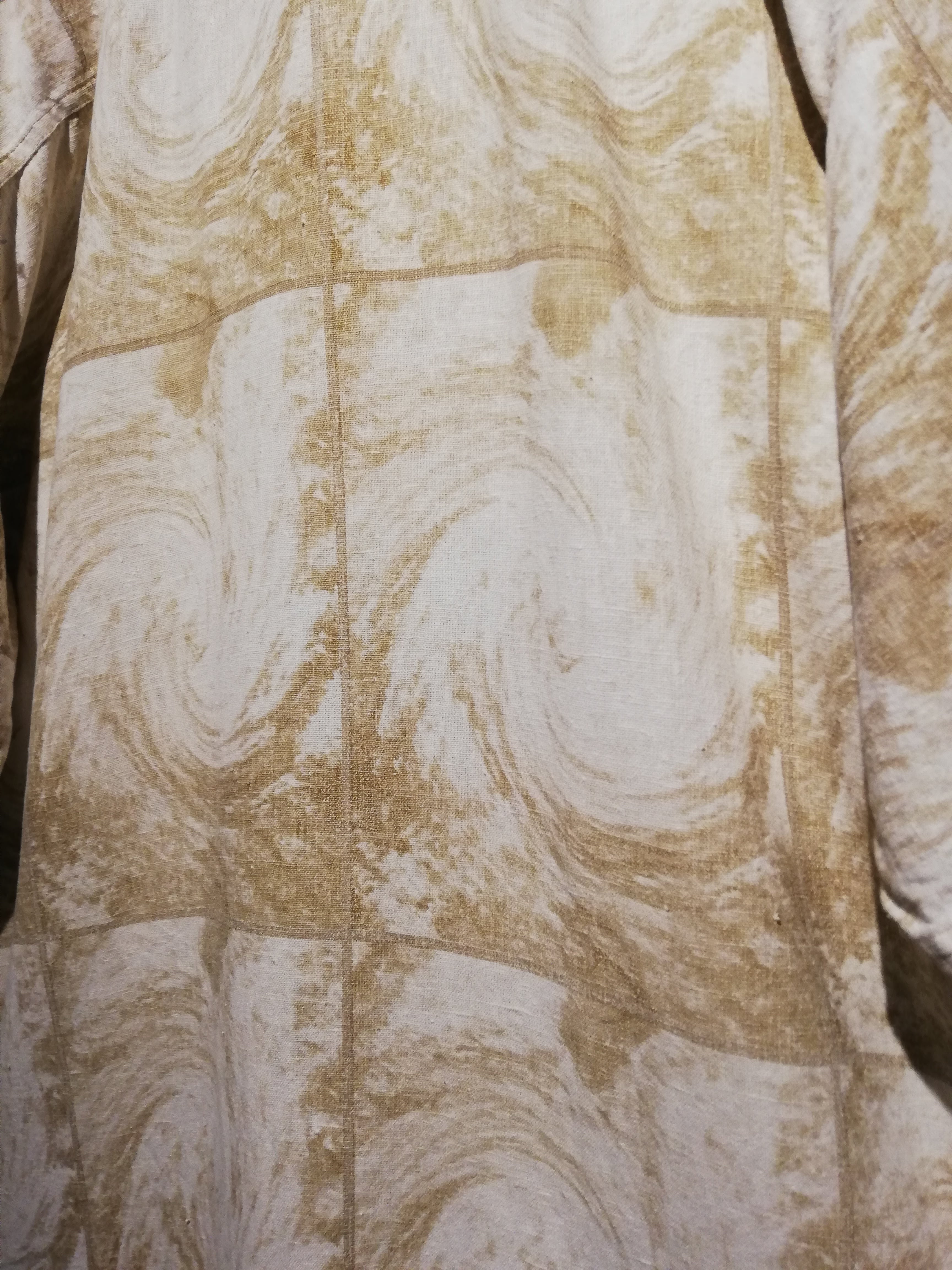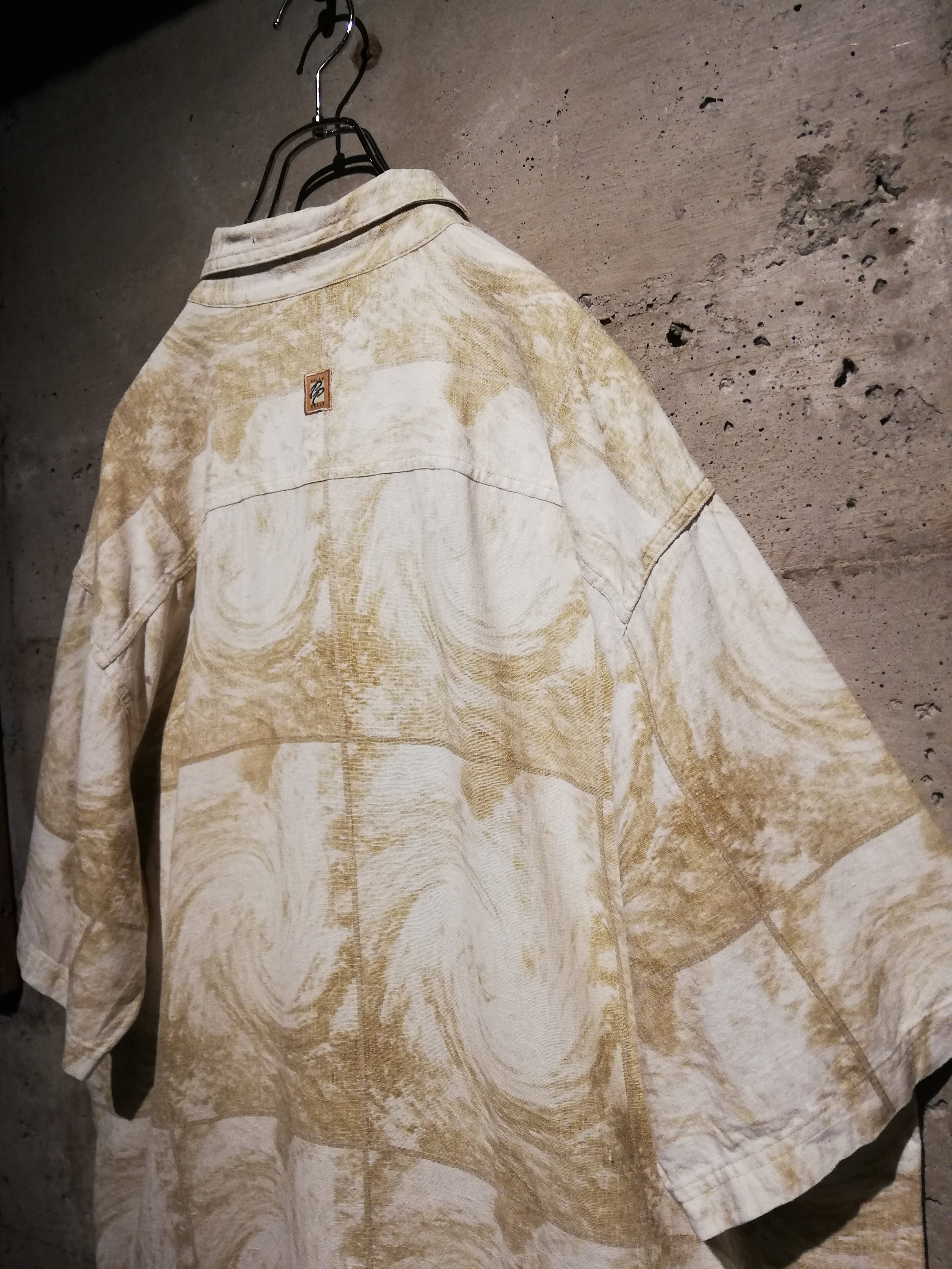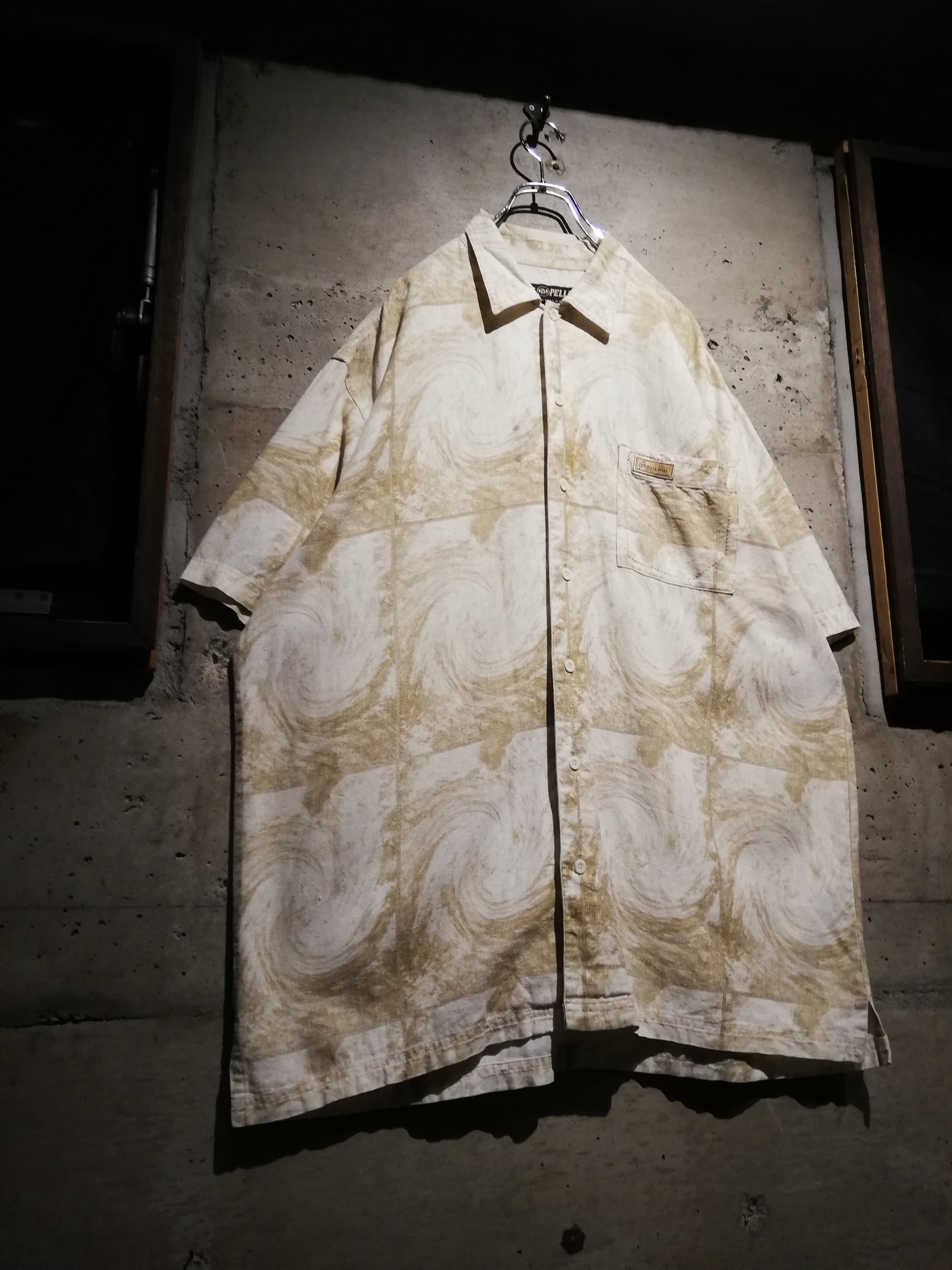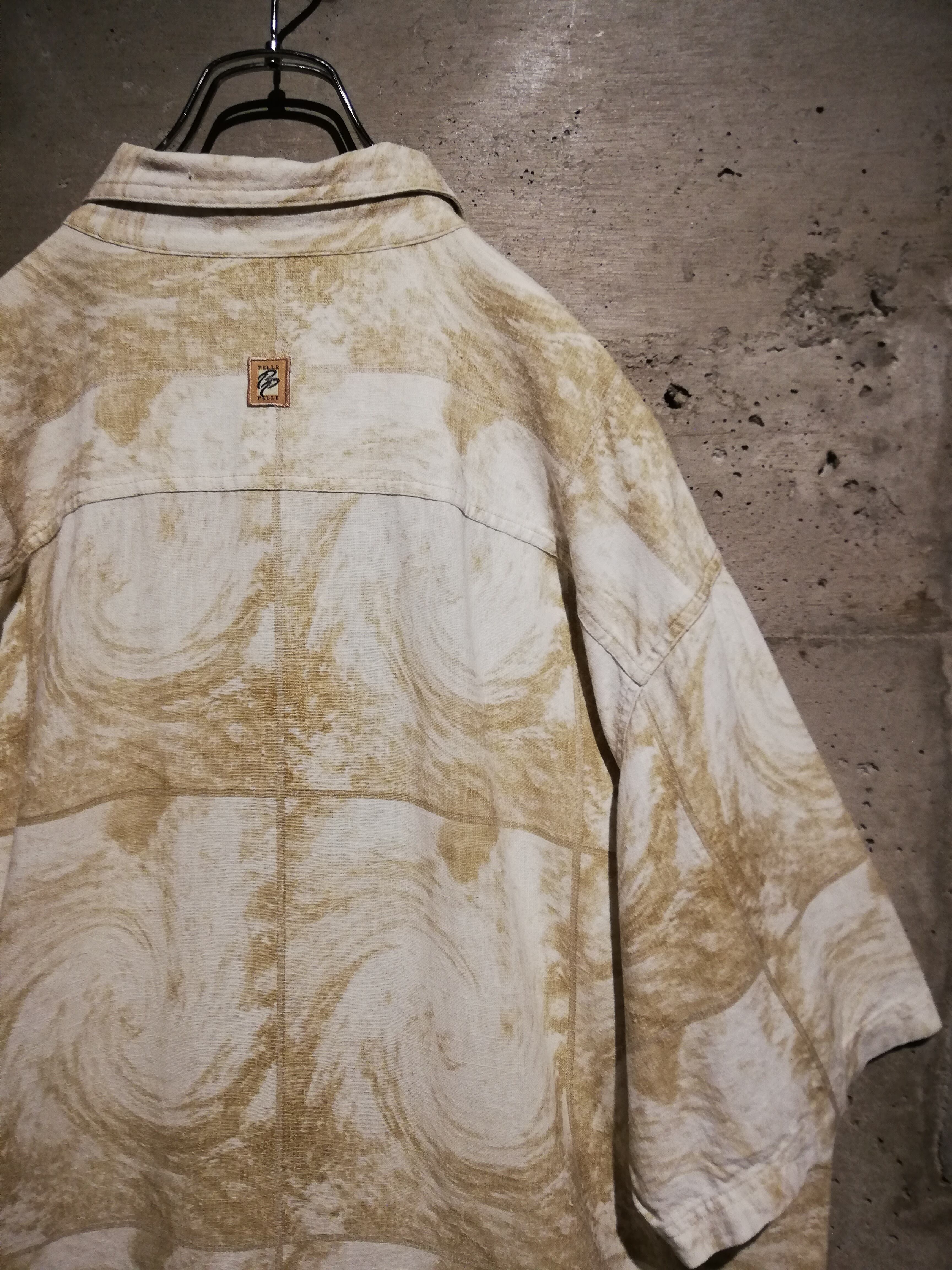 リネン×コットンを混紡した風合い豊かなボディに、アートテイストな渦巻き状の柄を全面に載せた、良い意味で裏切られた上品かつ洗練されたデザイン性を見せる1着。