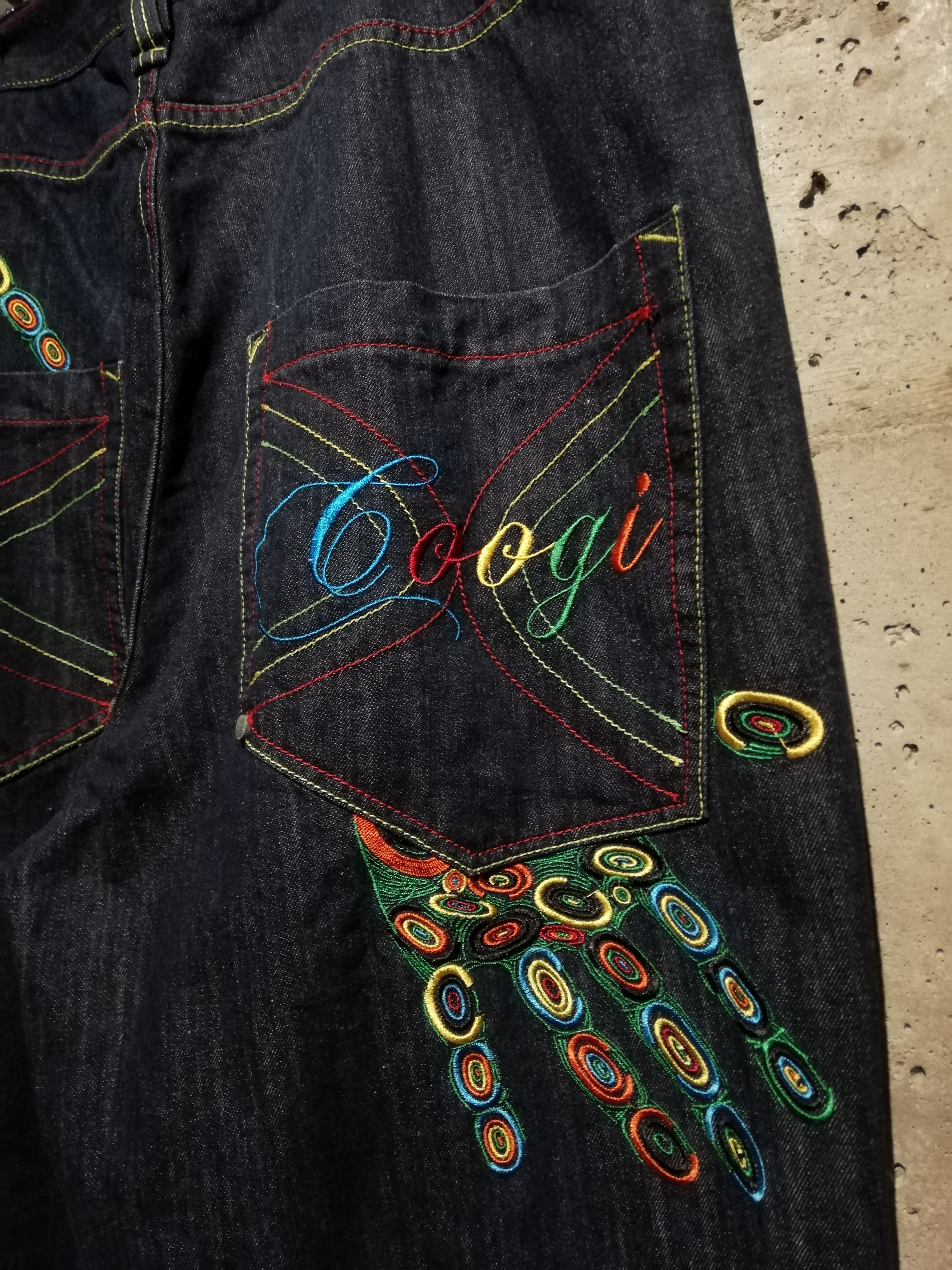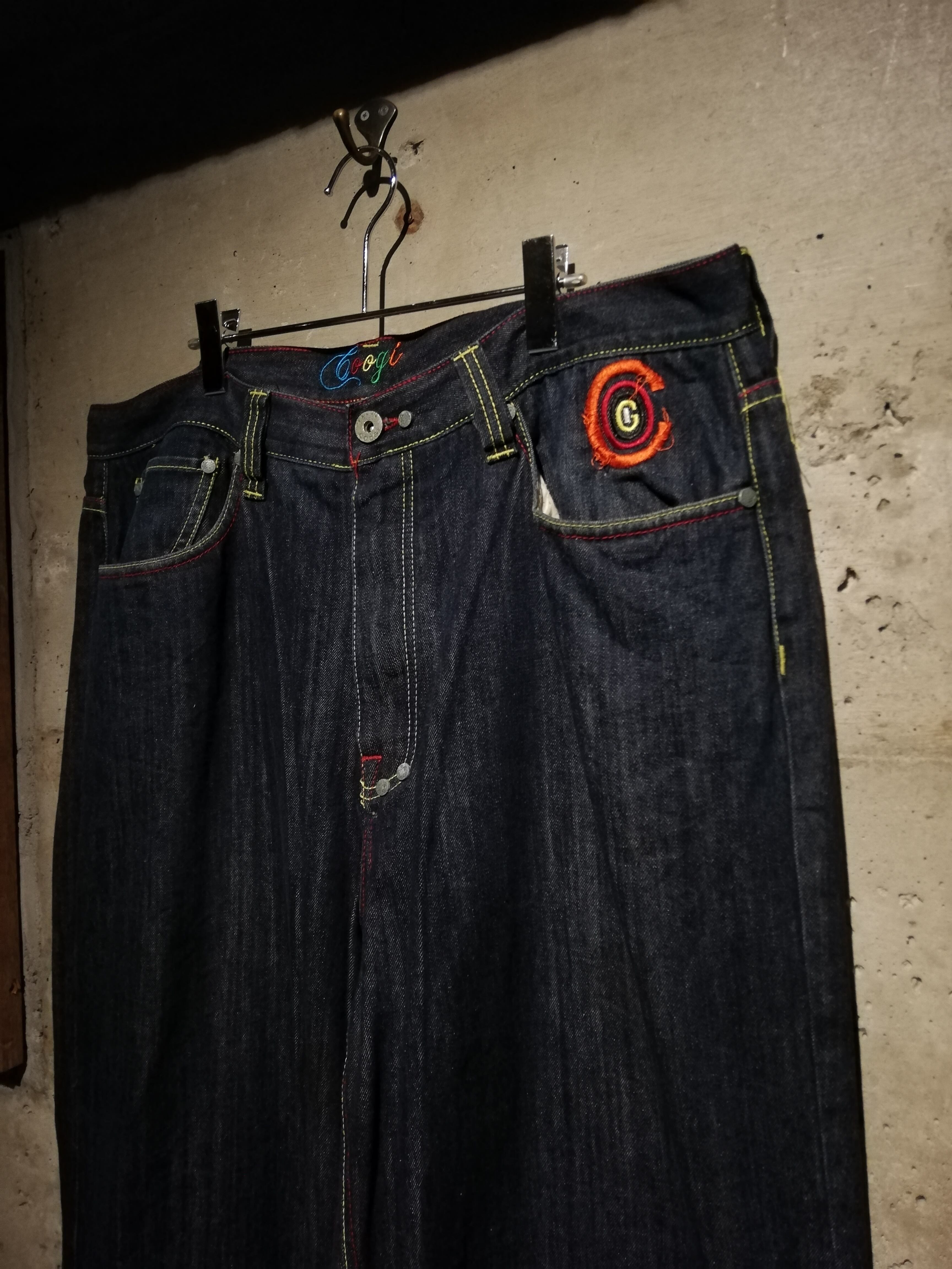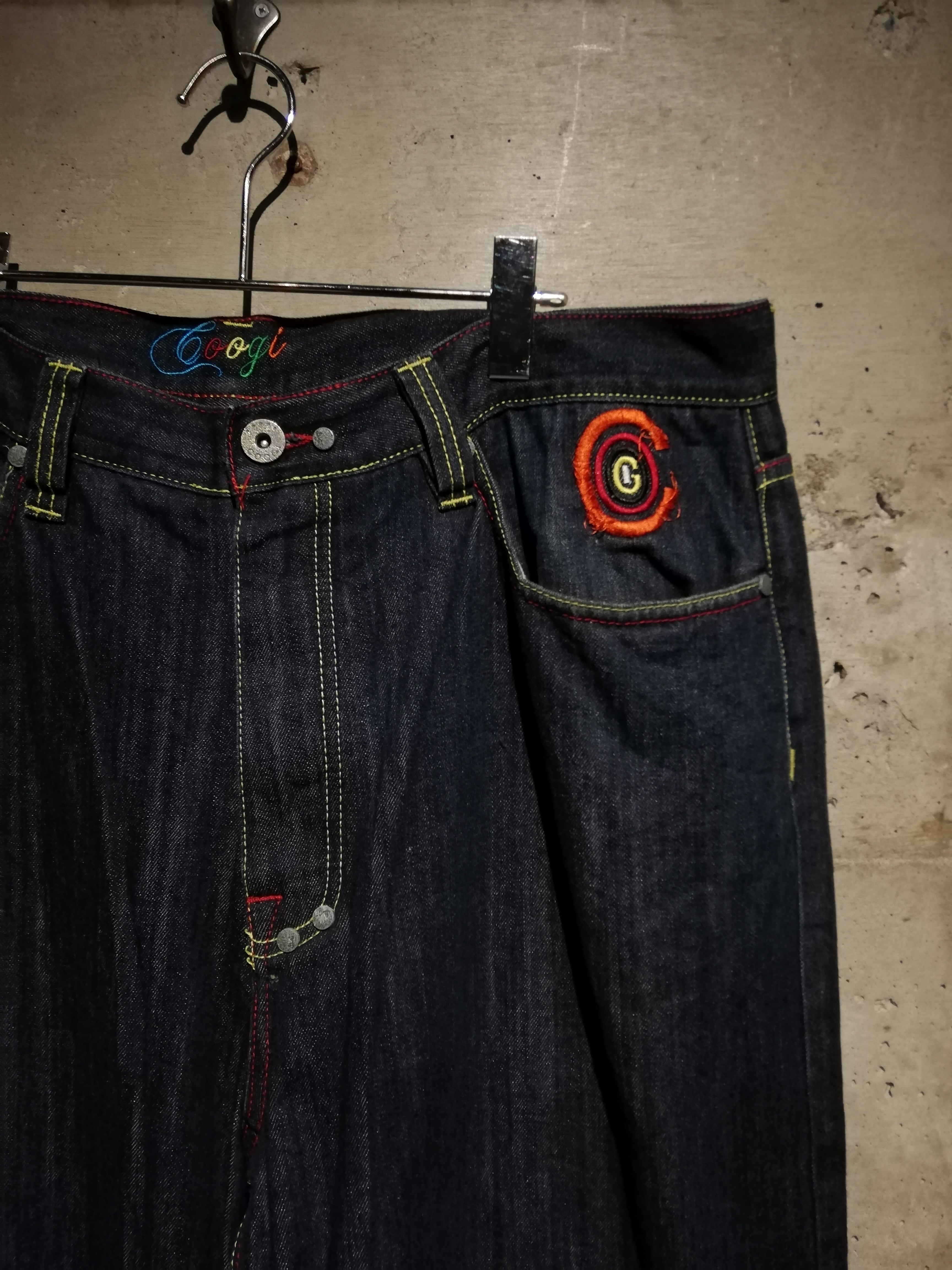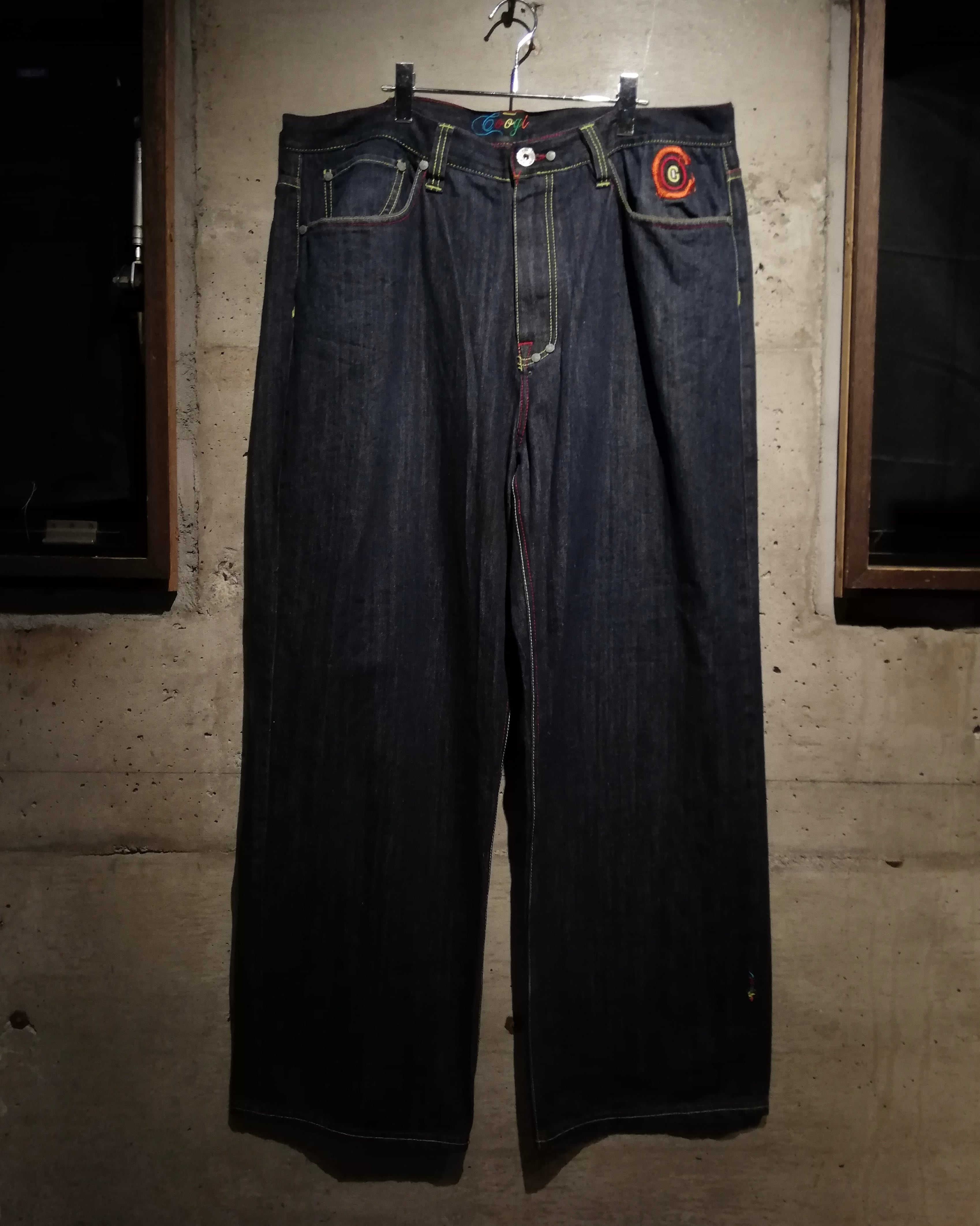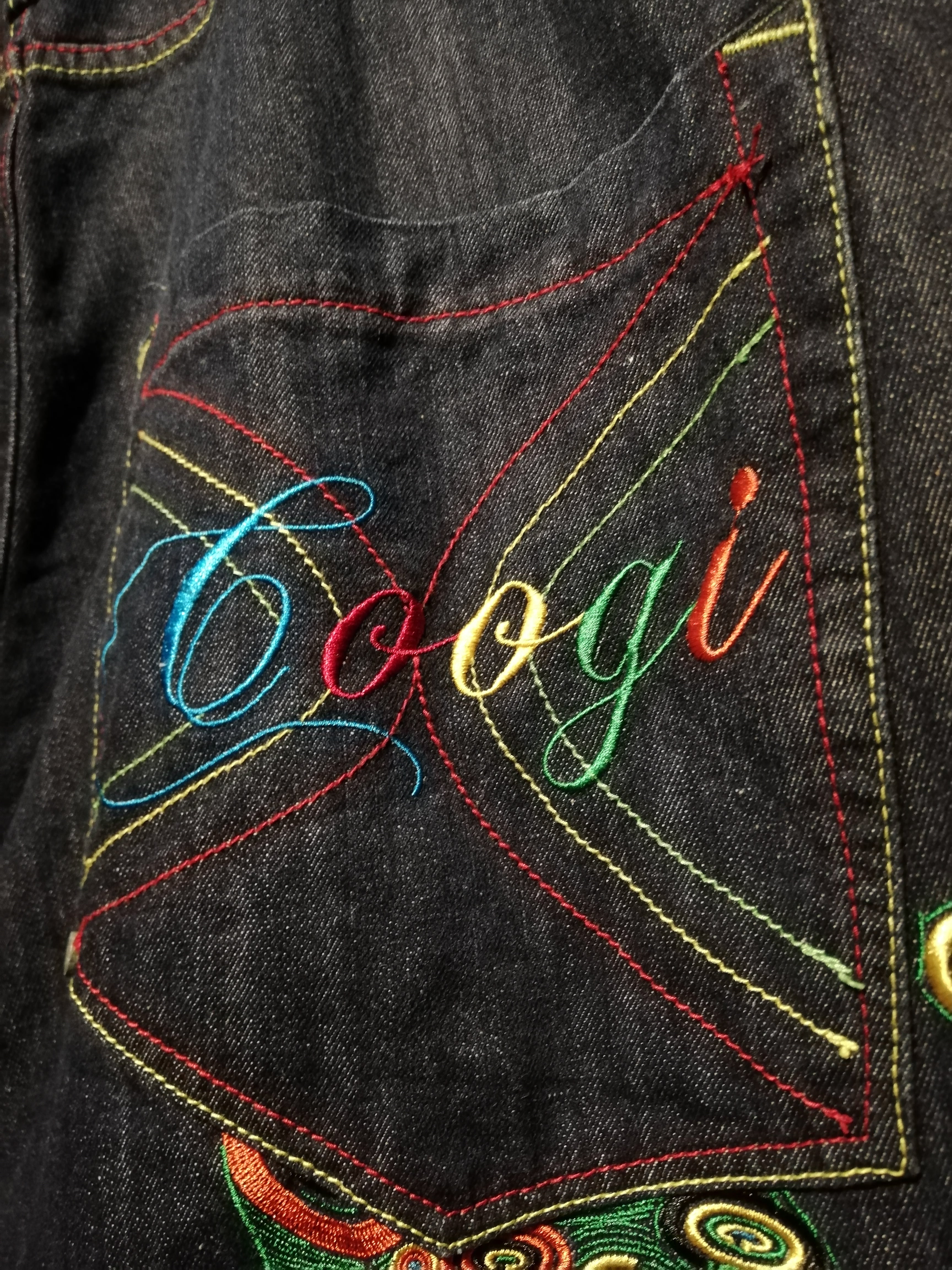 状態良好なブルーデニムのボディに、バックに"COOGI"らしさ溢れるサイケデリックなカラーリングでブランドネームや手形の刺繍を施した至極のバギーデニム。