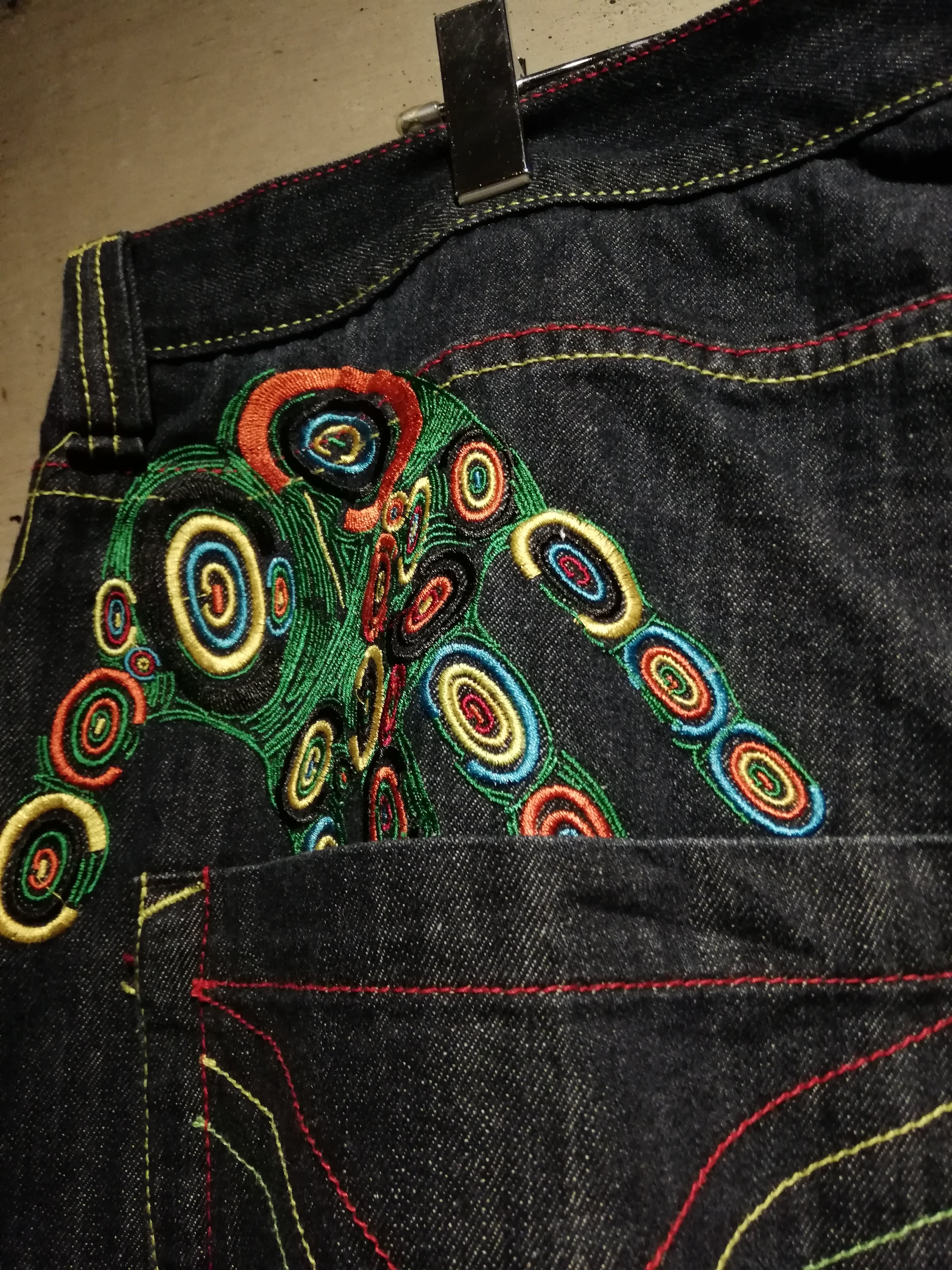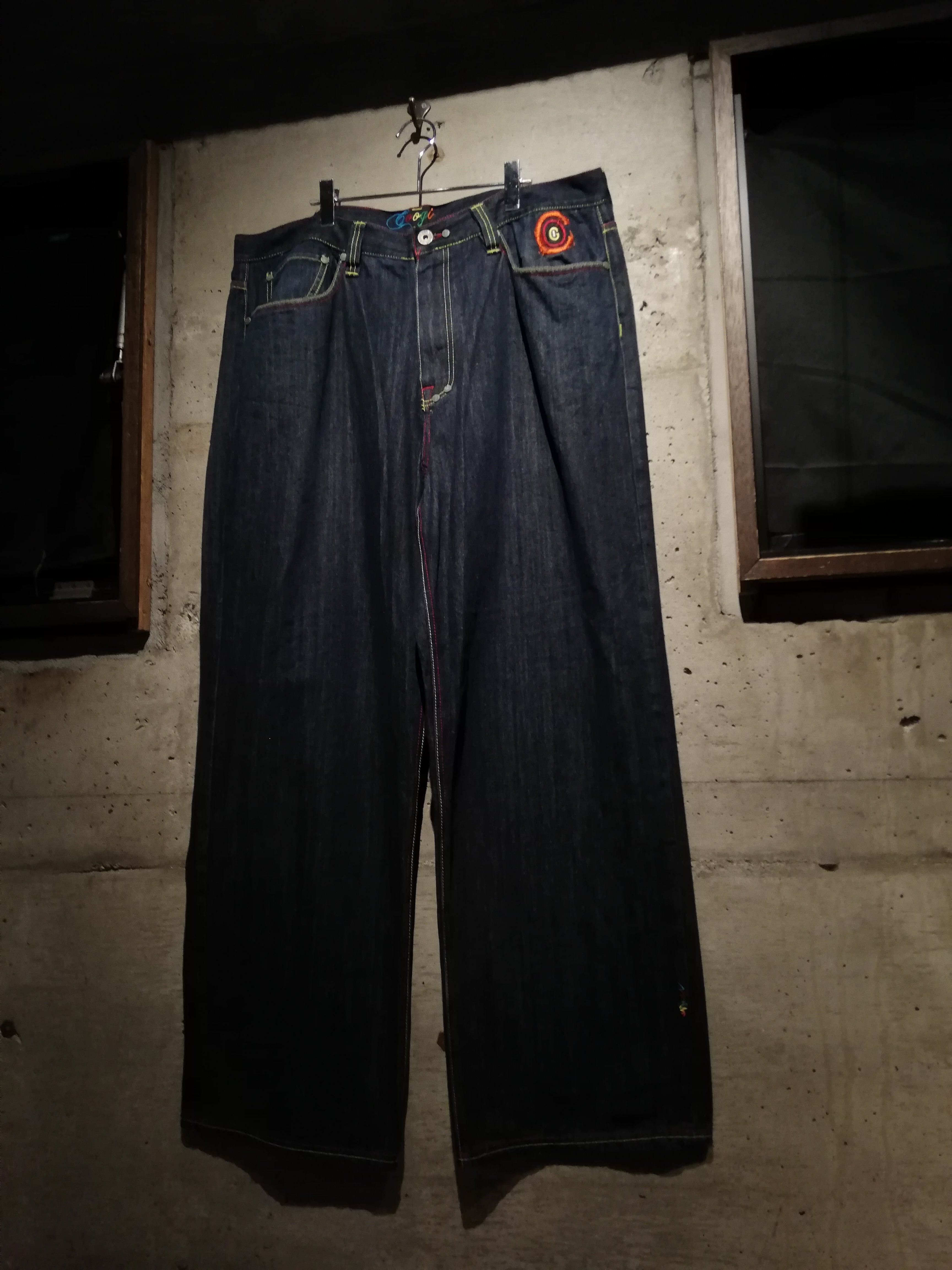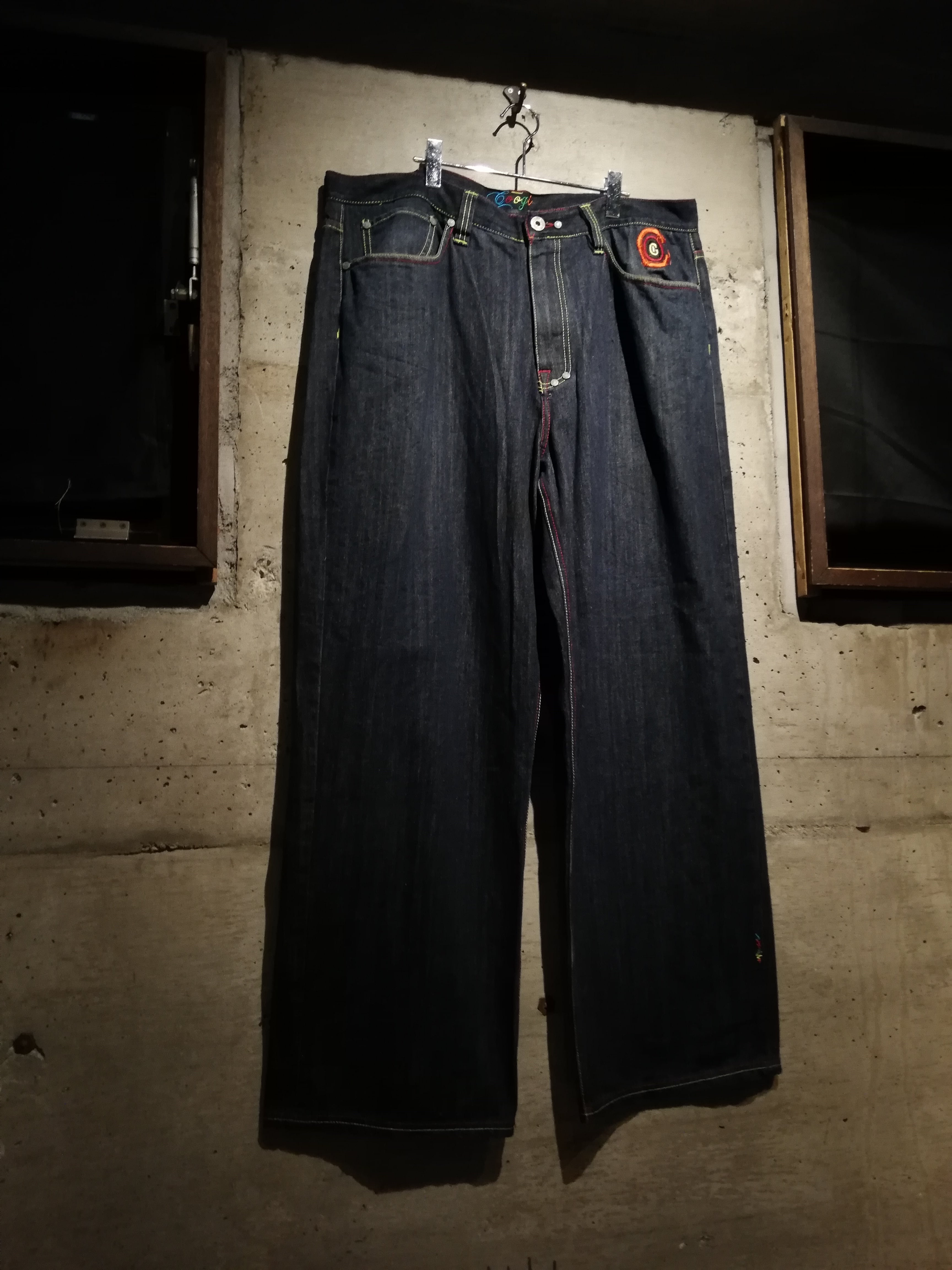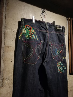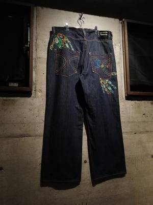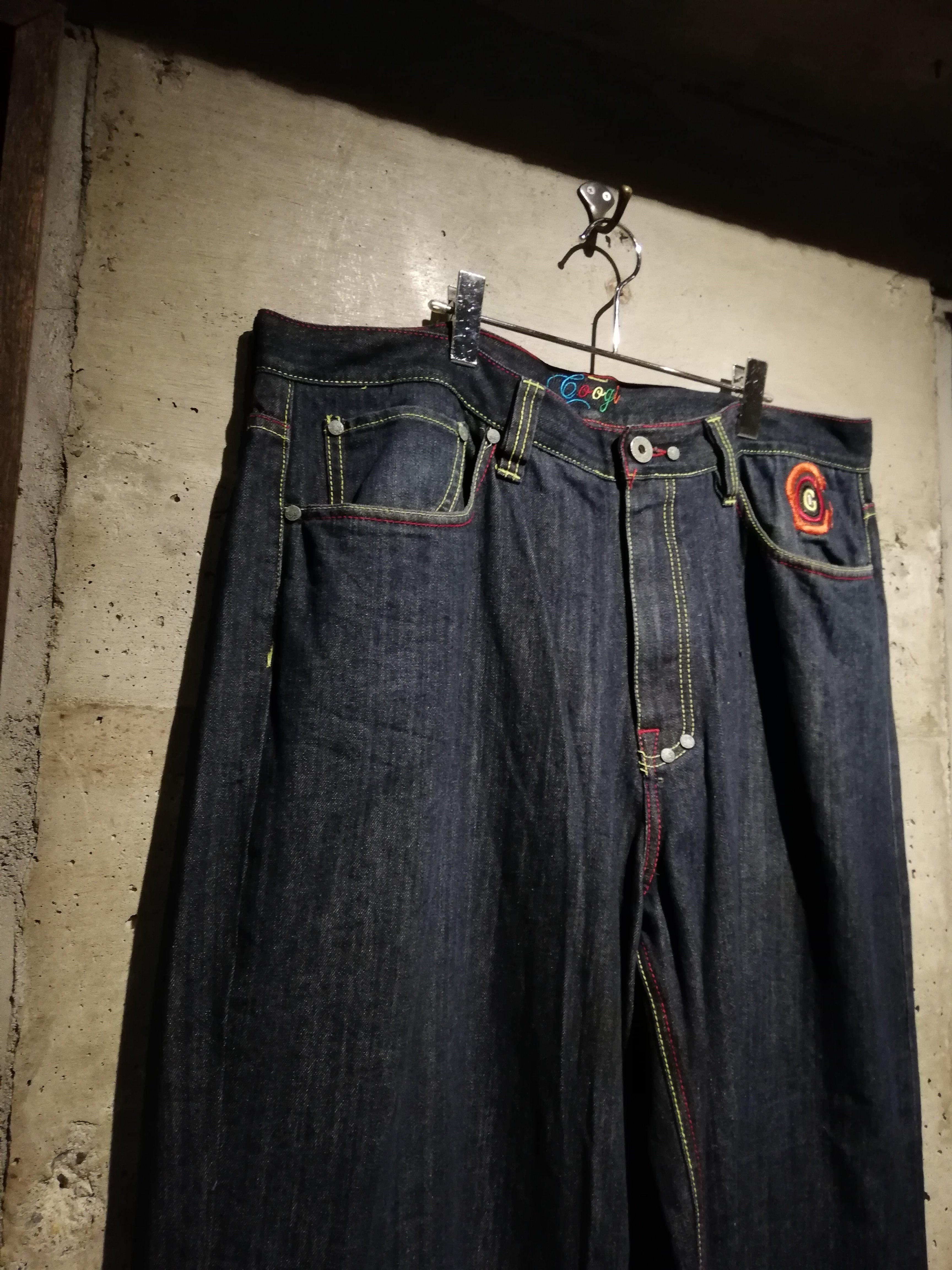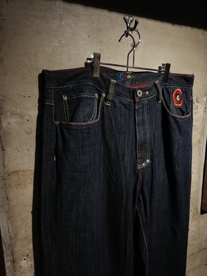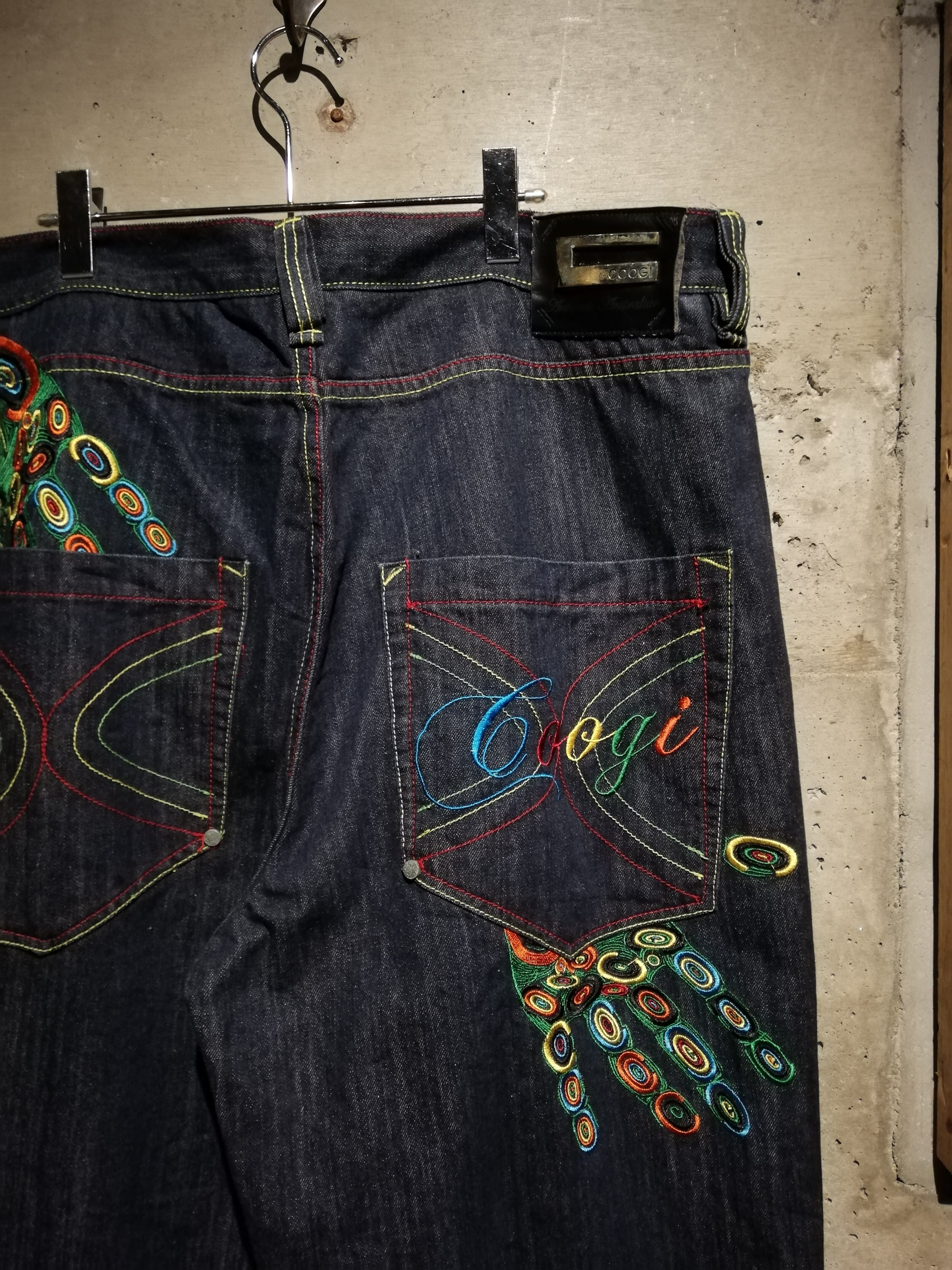 状態良好なブルーデニムのボディに、バックに"COOGI"らしさ溢れるサイケデリックなカラーリングでブランドネームや手形の刺繍を施した至極のバギーデニム。