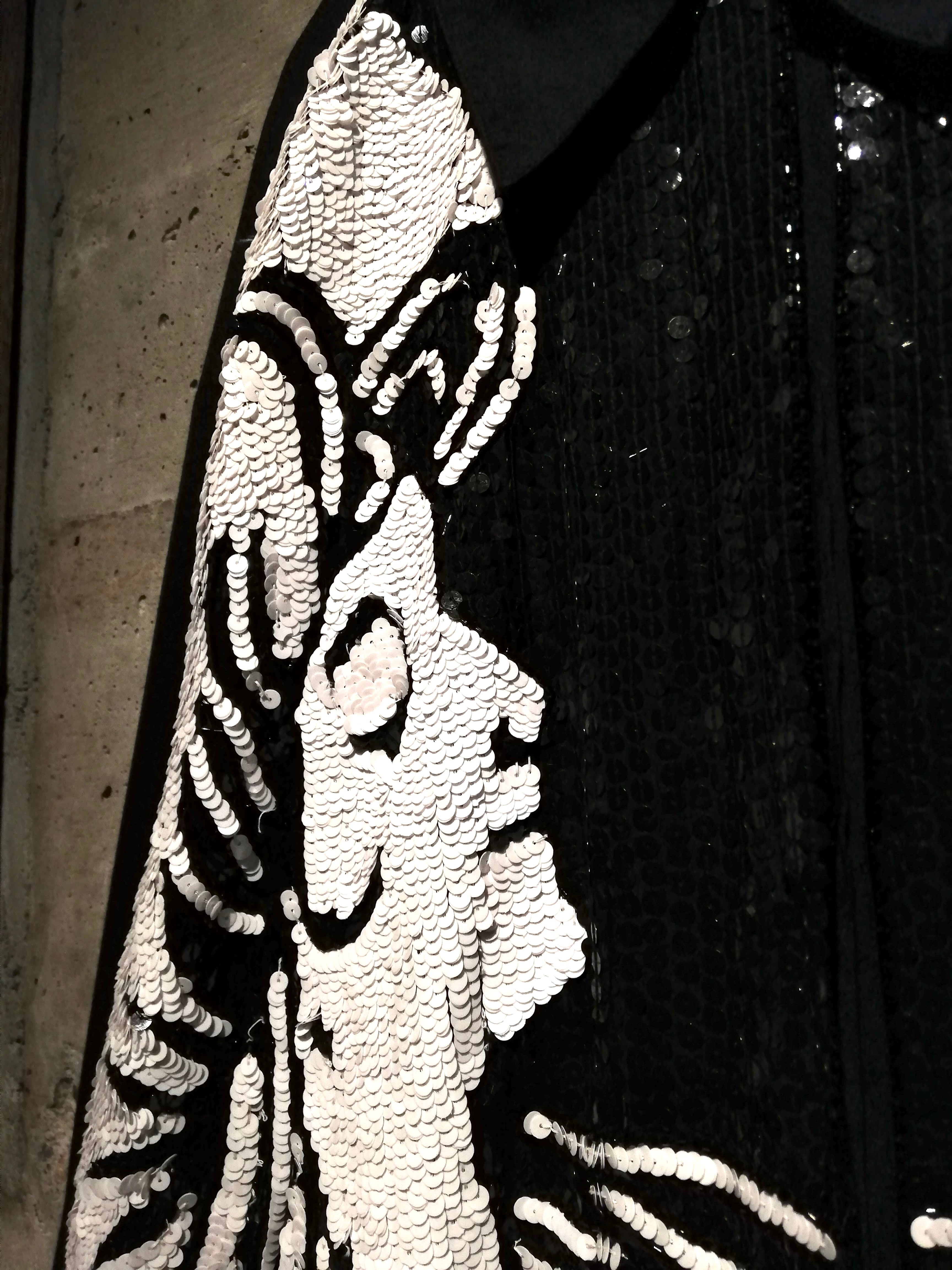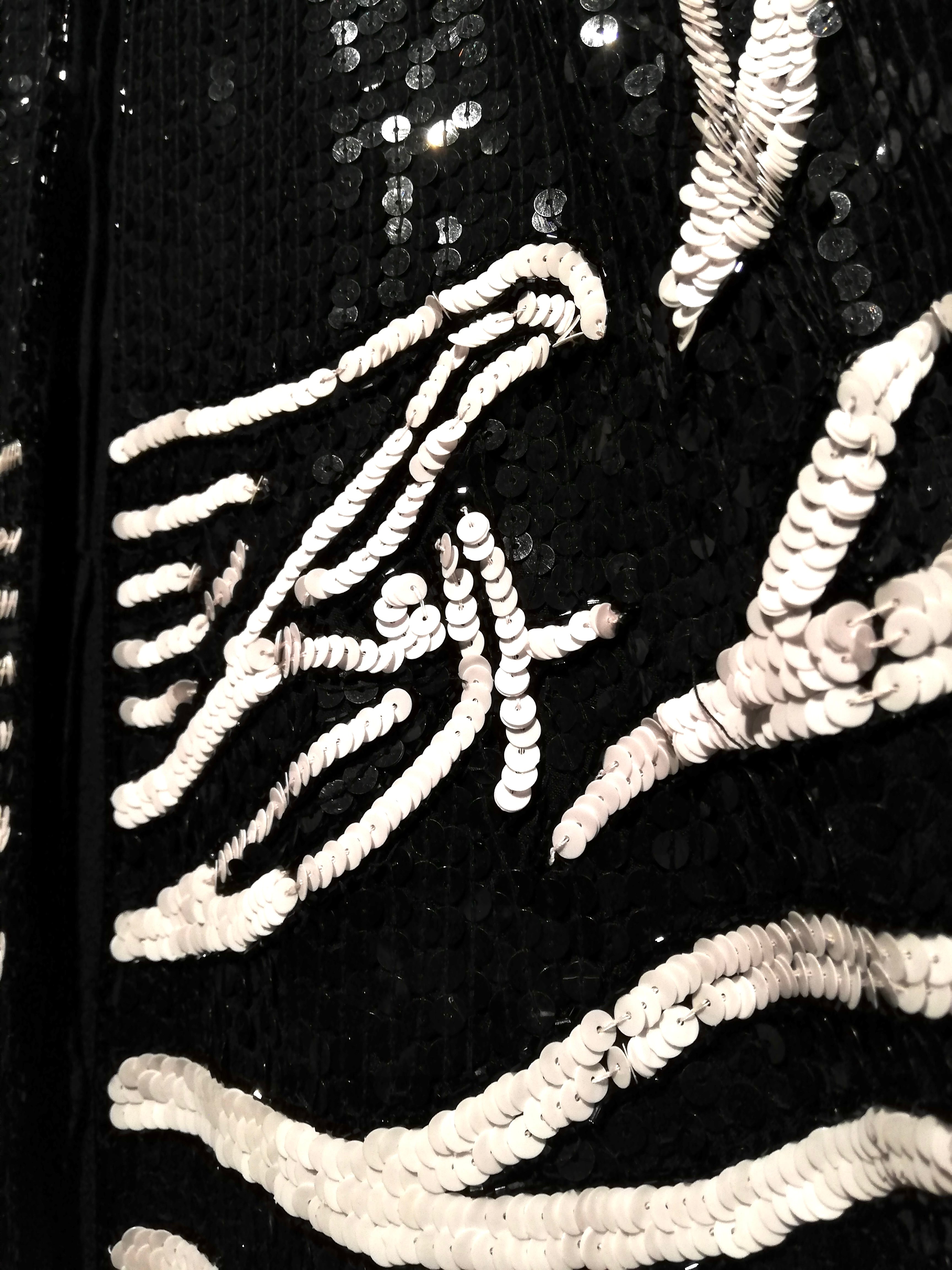 緻密に仕上げられた美しいデザインに、スパンコールの放つ光沢も相まって、ラグジュアリーかつモードな雰囲気漂うクオリティの高い1着に仕上がっています。