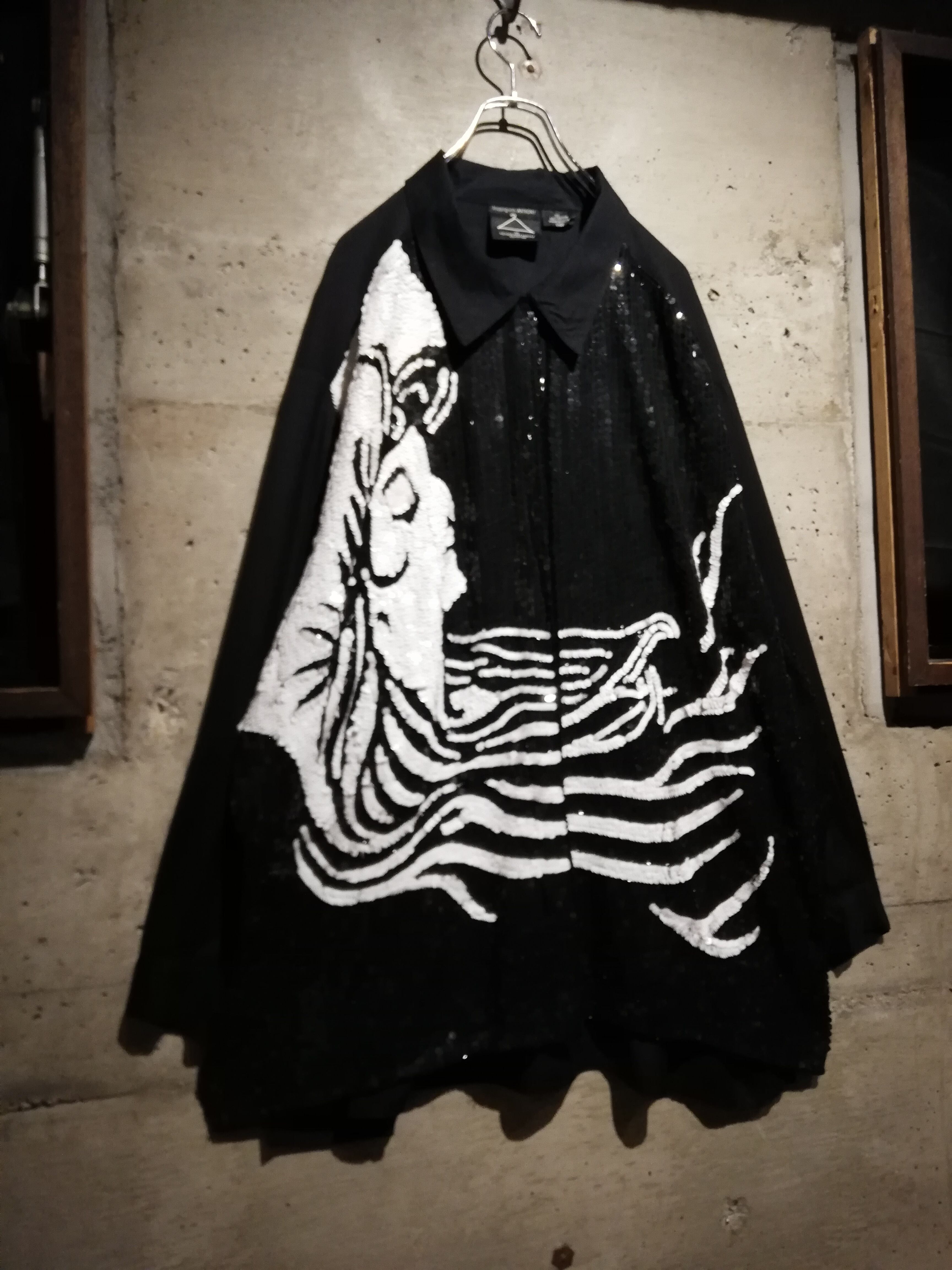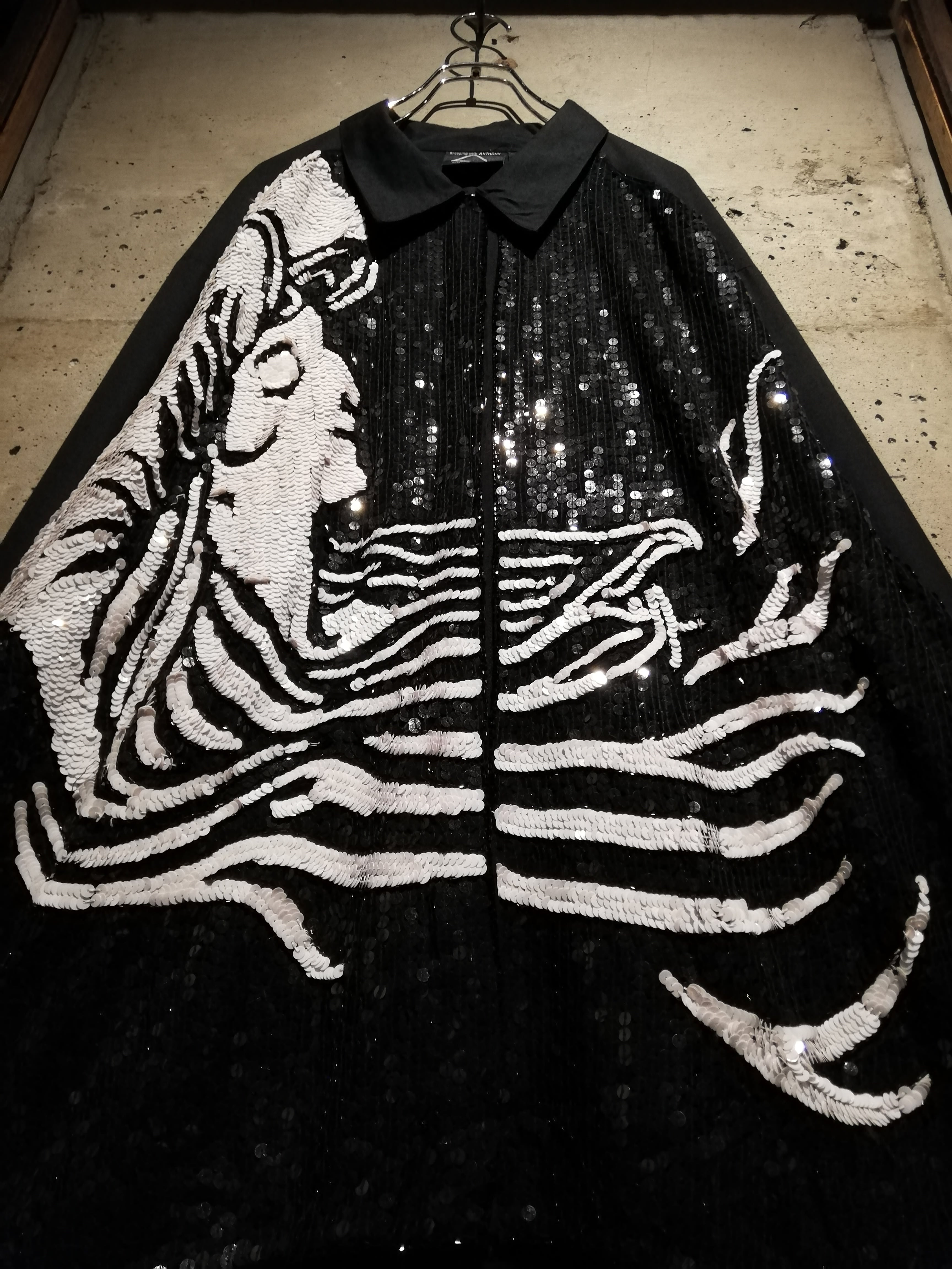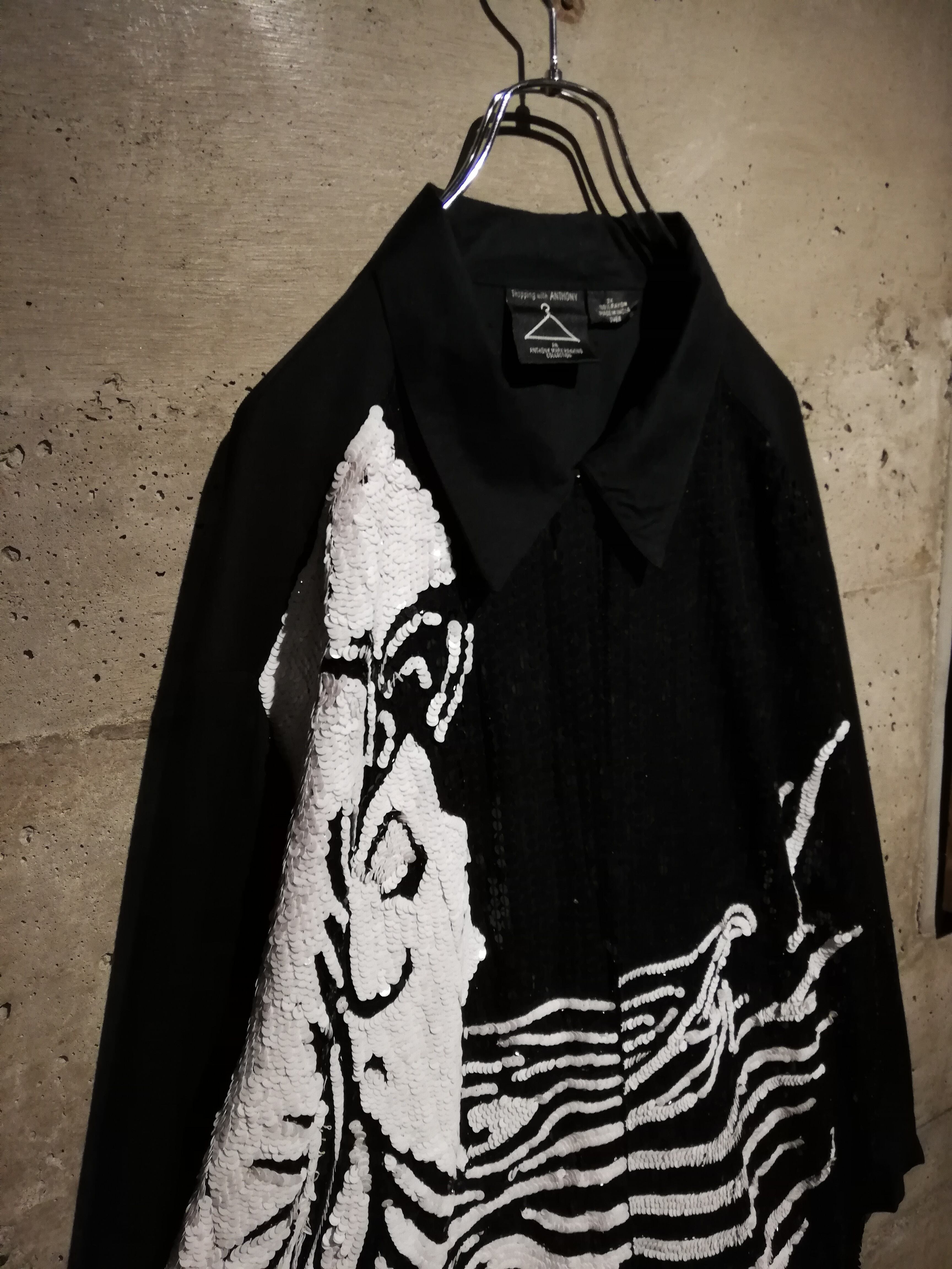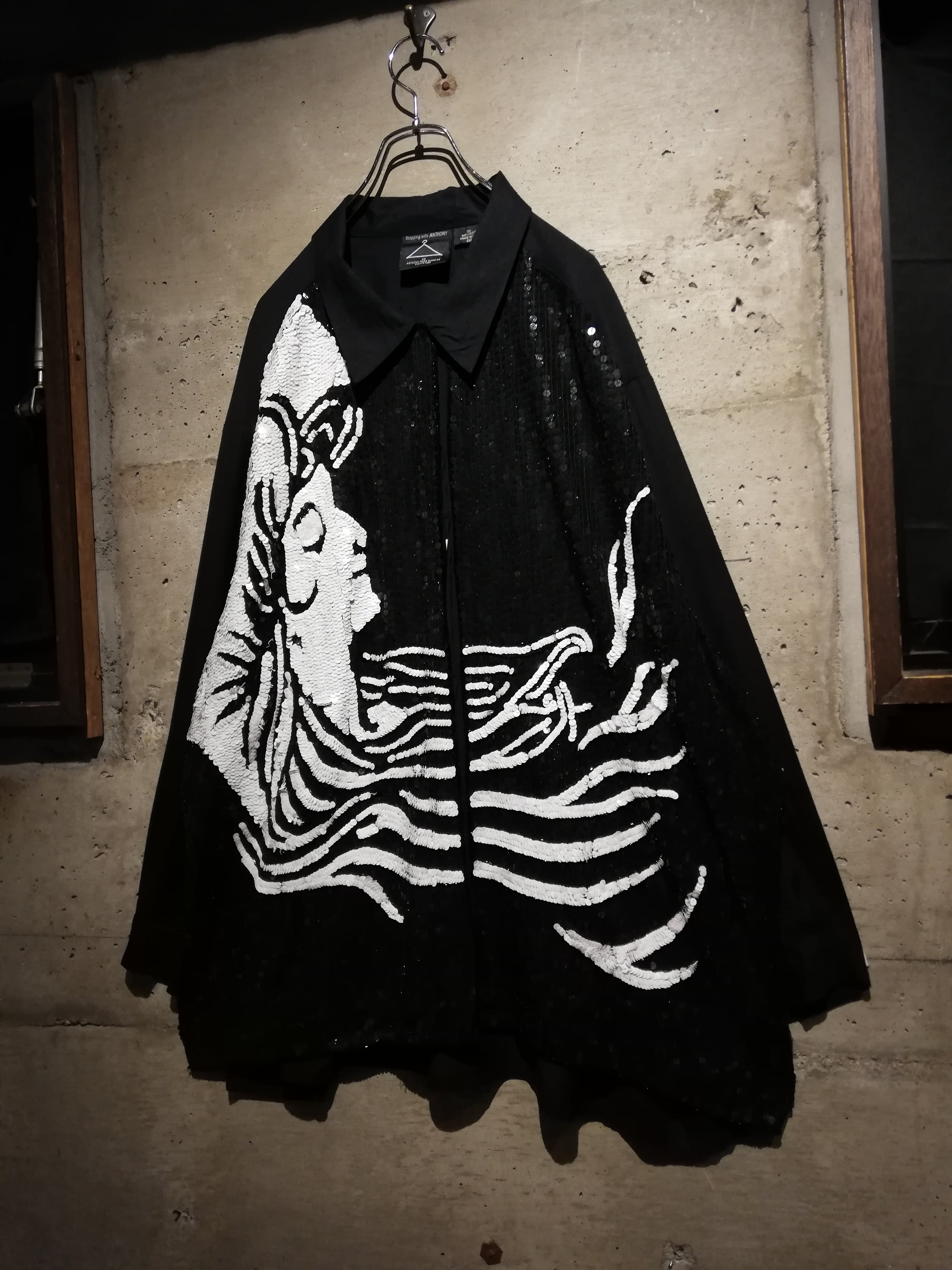 柔らかくサラッとしたレーヨン素材のボディをベースに、フロント全面にみっちりとスパンコールを施し、髪の長い女性を表現した長袖シャツ。