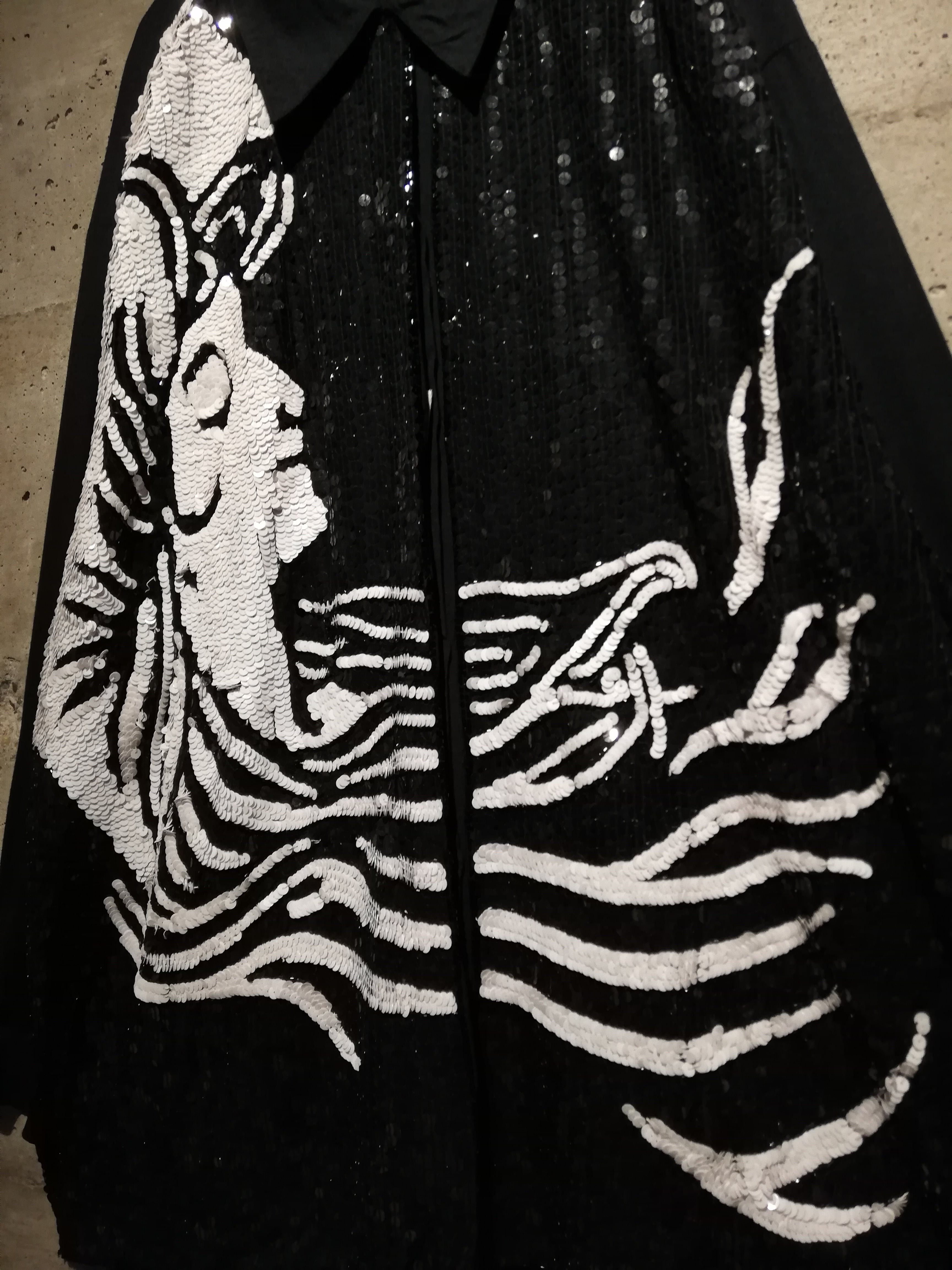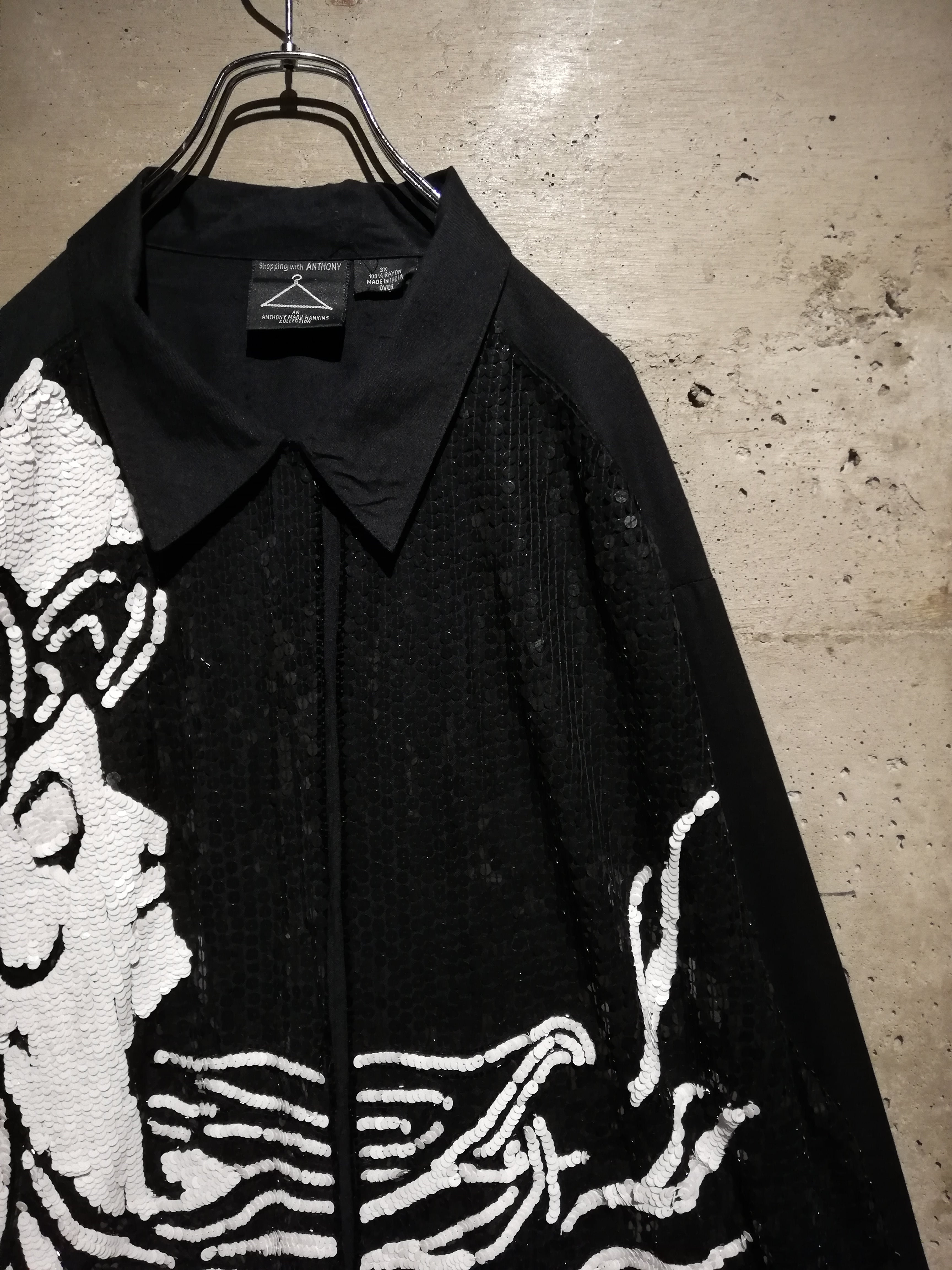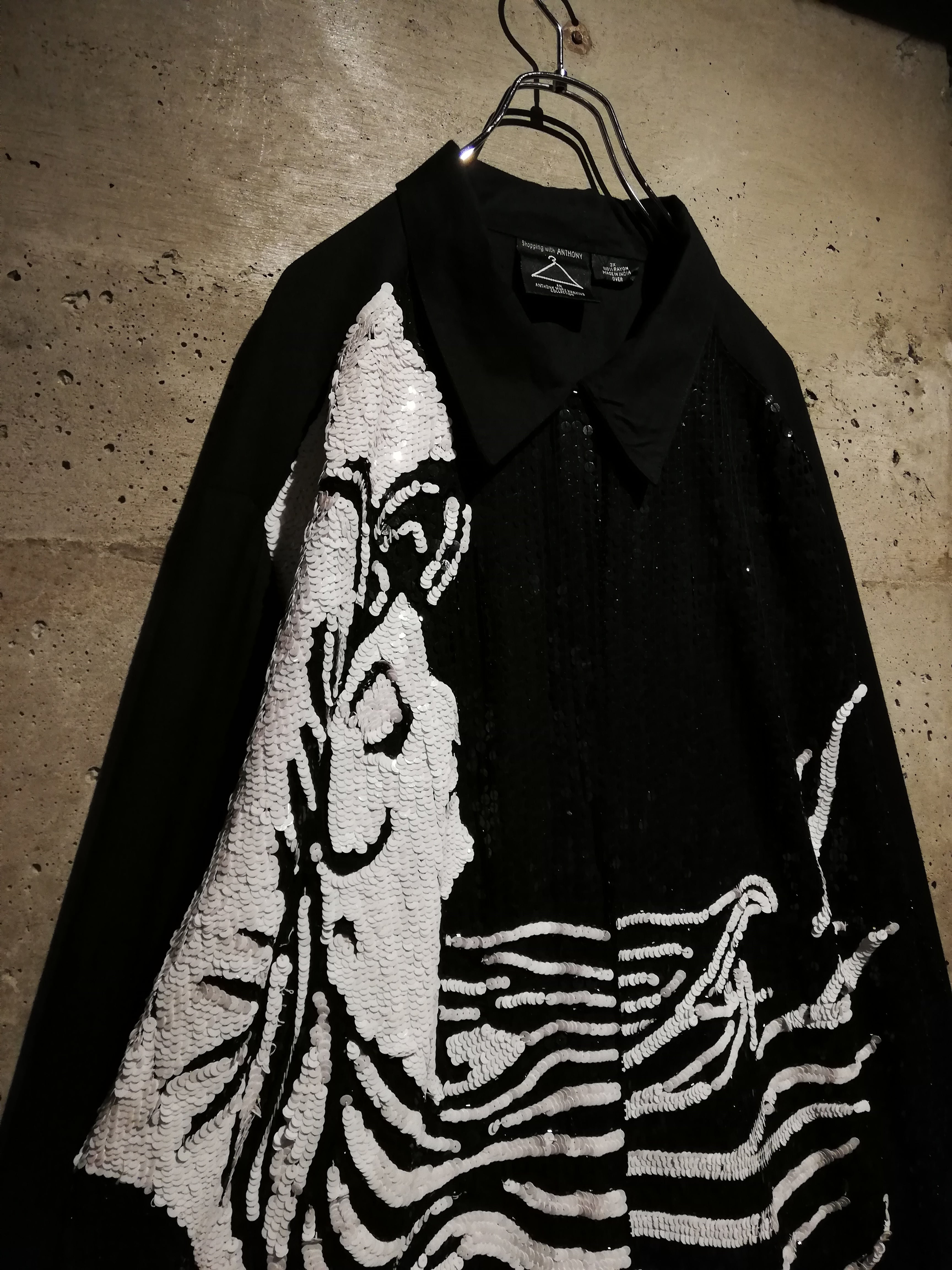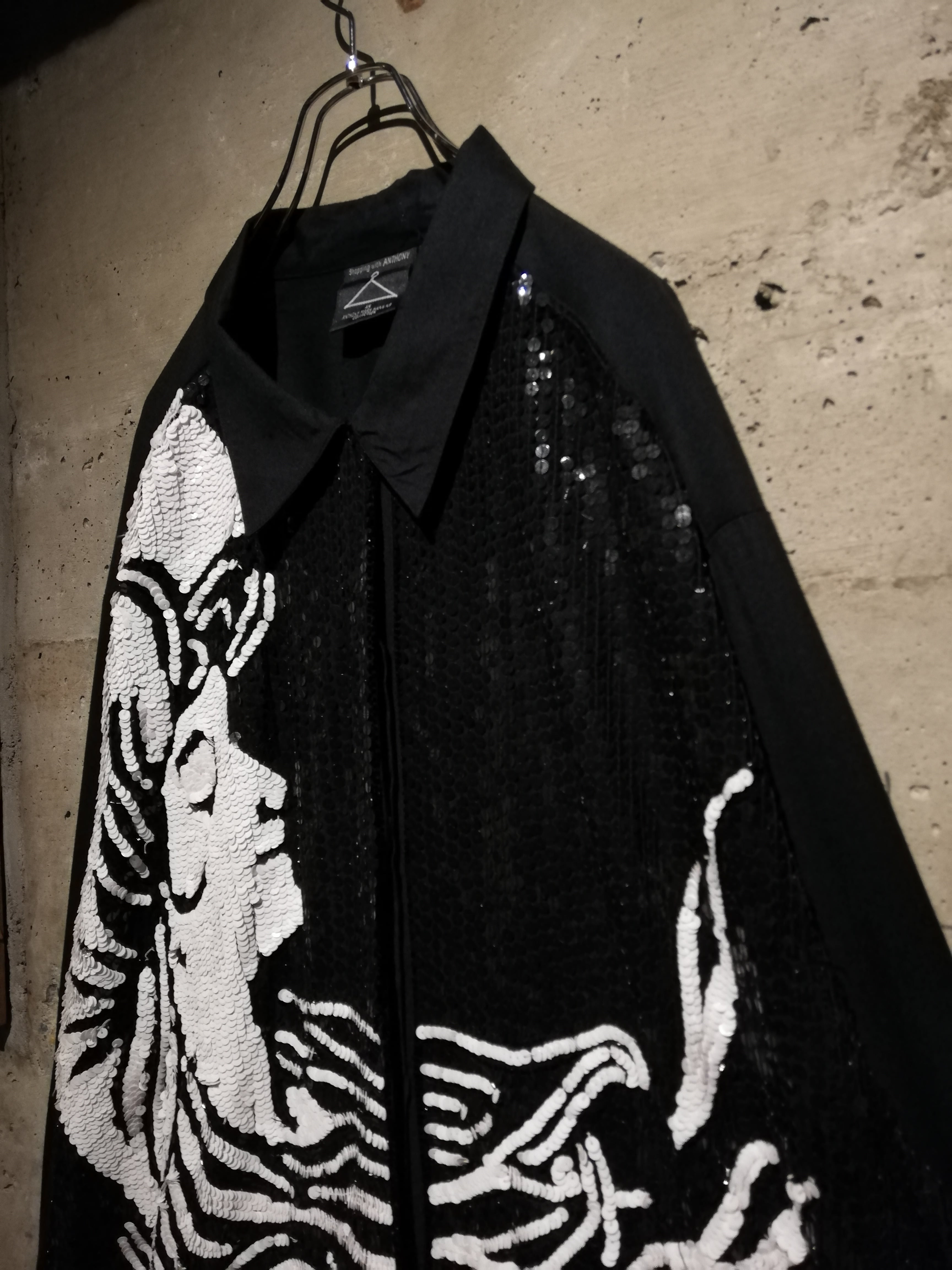 柔らかくサラッとしたレーヨン素材のボディをベースに、フロント全面にみっちりとスパンコールを施し、髪の長い女性を表現した長袖シャツ。