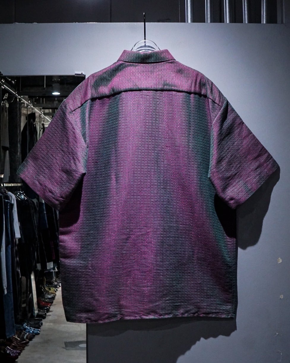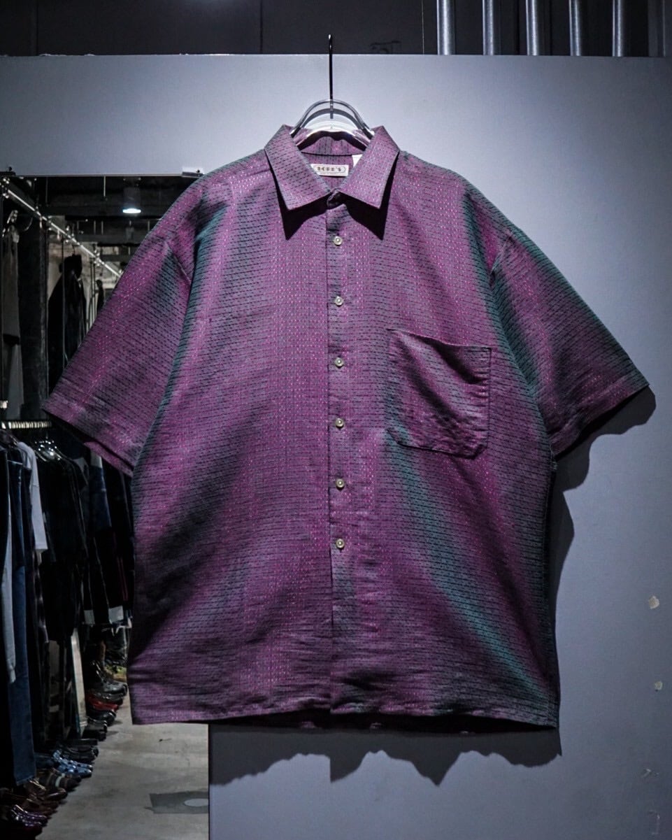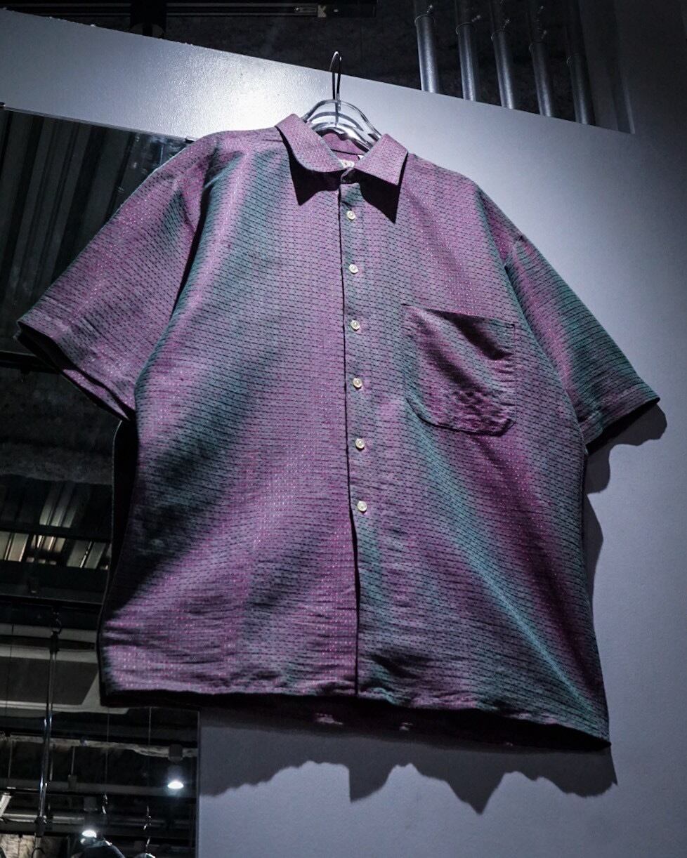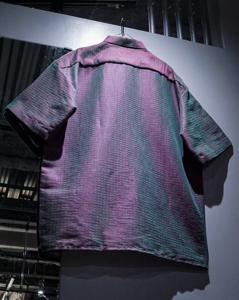 深い紫とエメラルドグリーンに光沢を放つ糸を仕込み、光の当たり具合で色が移り変わる"玉虫"カラーに仕上げたフランス製の半袖シャツ。