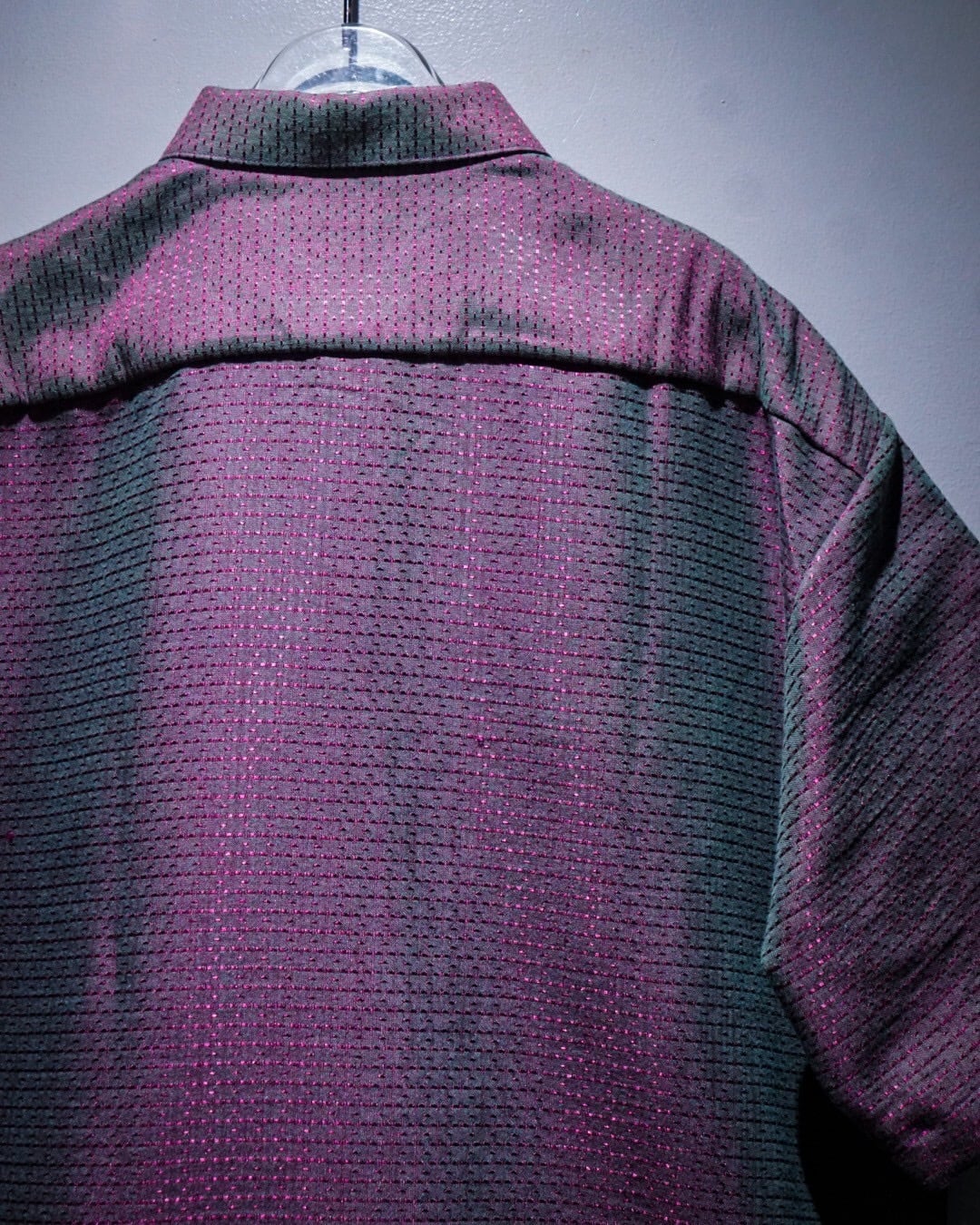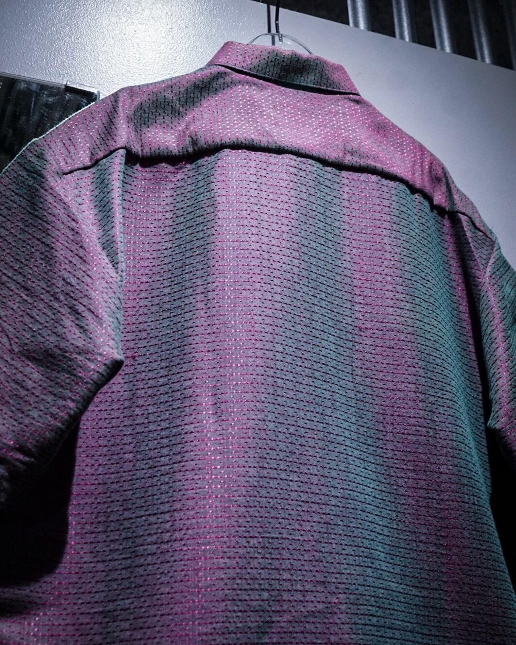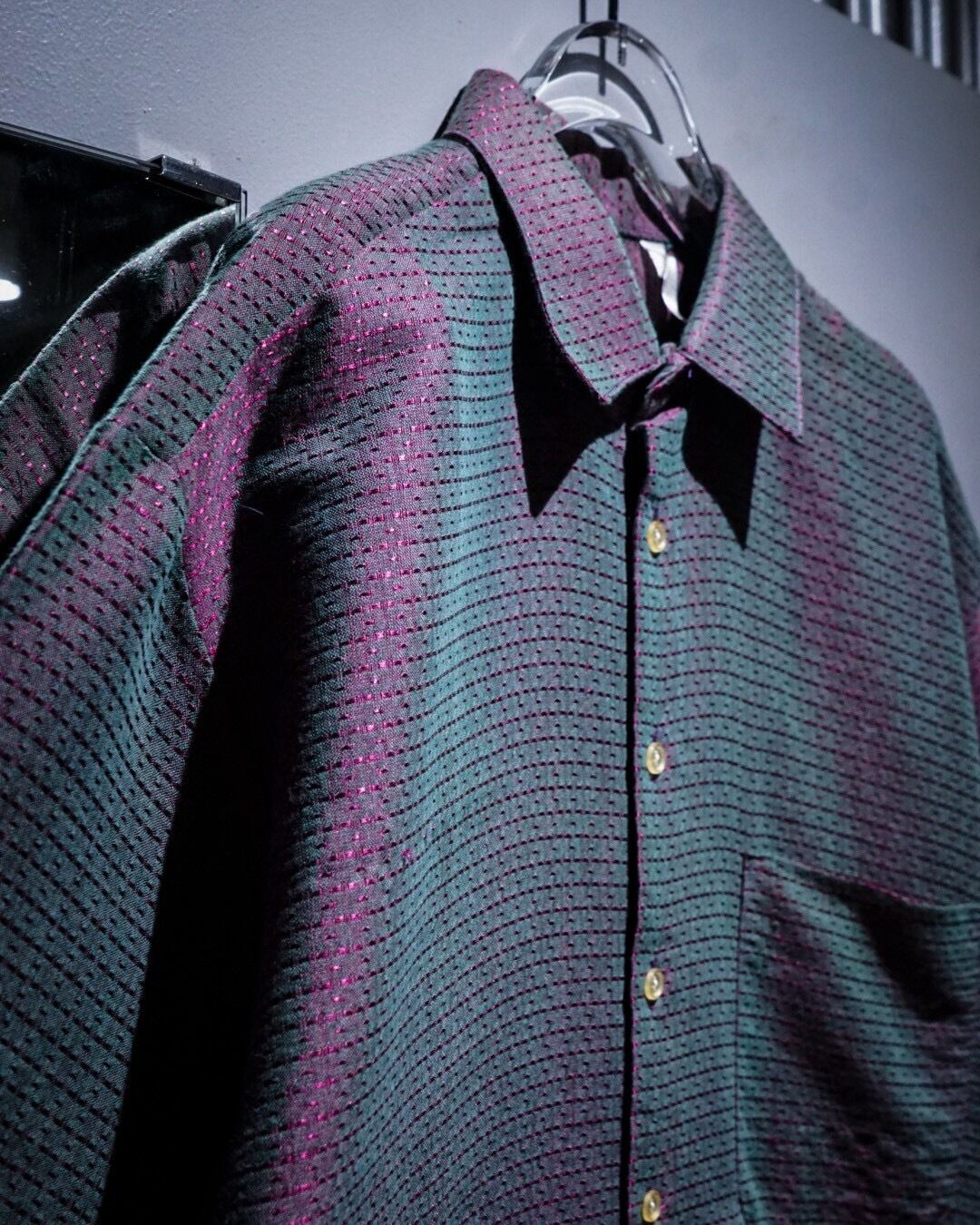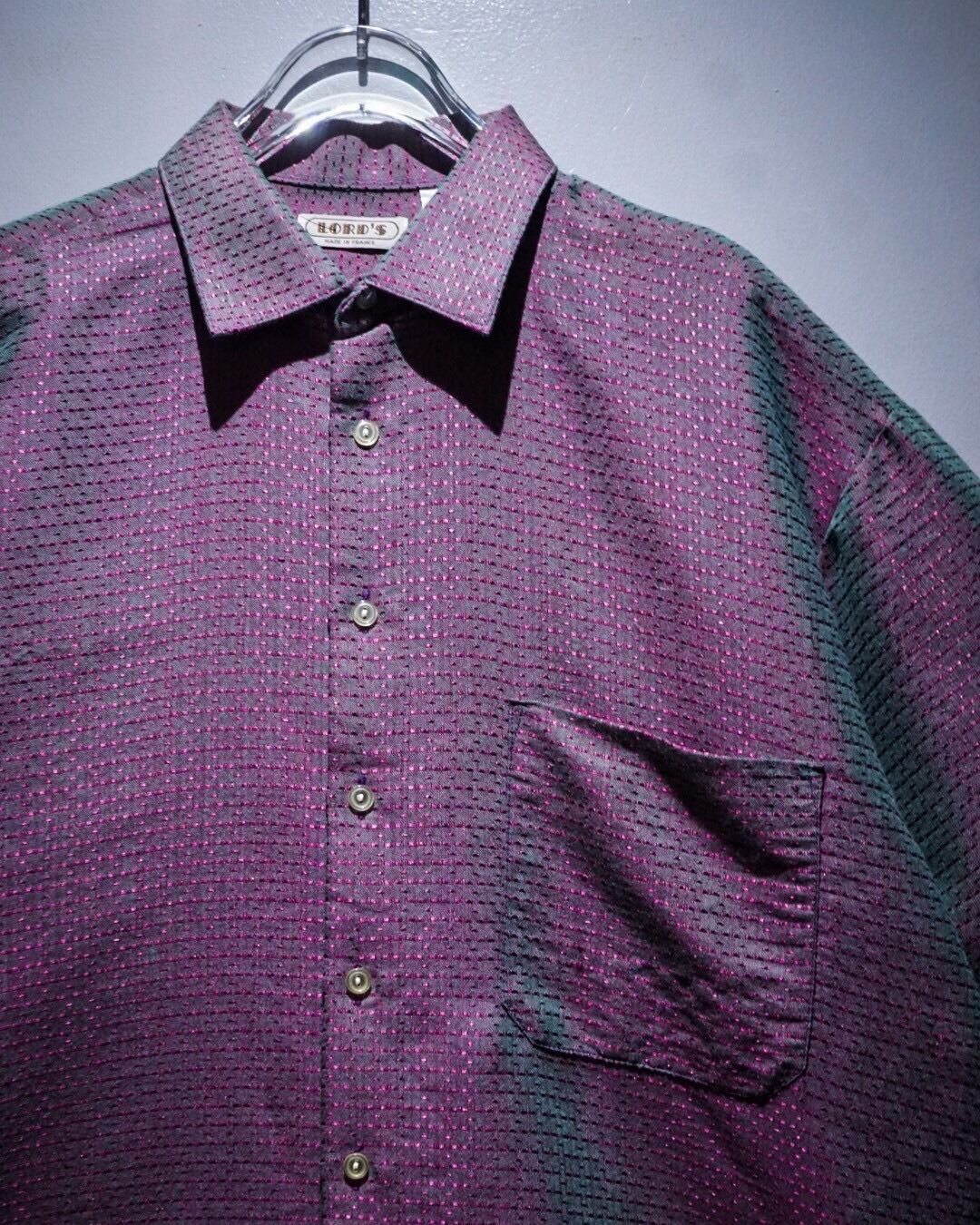 深い紫とエメラルドグリーンに光沢を放つ糸を仕込み、光の当たり具合で色が移り変わる"玉虫"カラーに仕上げたフランス製の半袖シャツ。