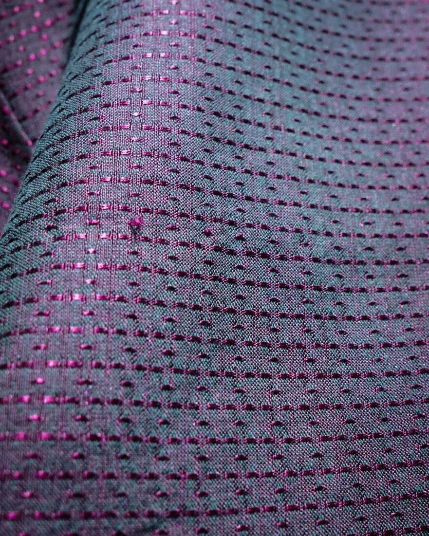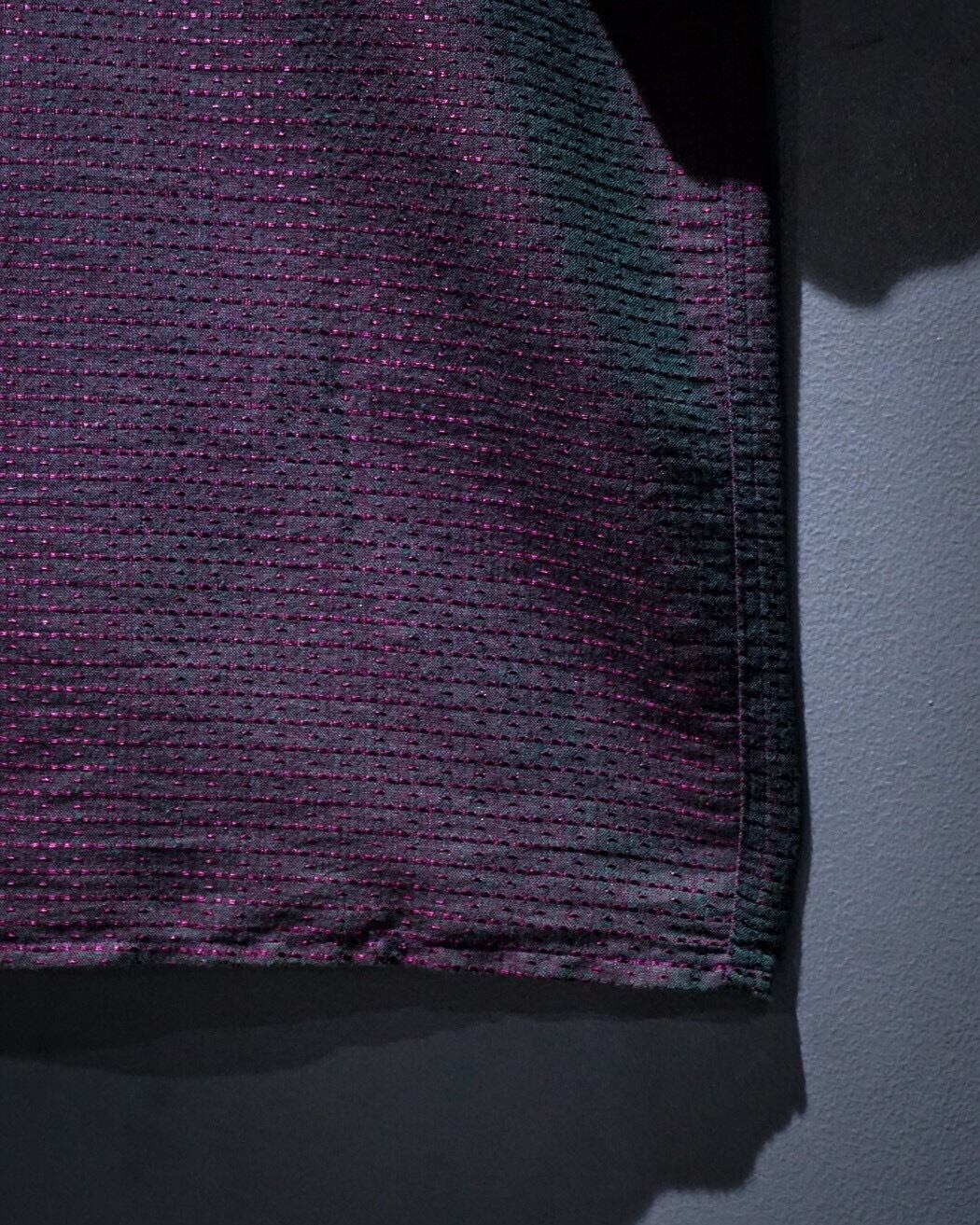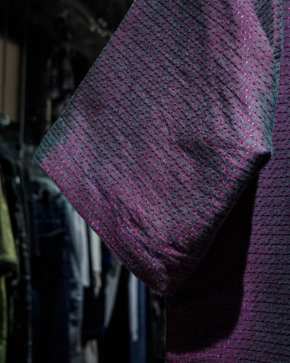 全体に紫のステッチを運針数の大小を交互に変えて走らせることで、ボディの色味と相まりどこか幾何学的なデザインとして昇華した1着。