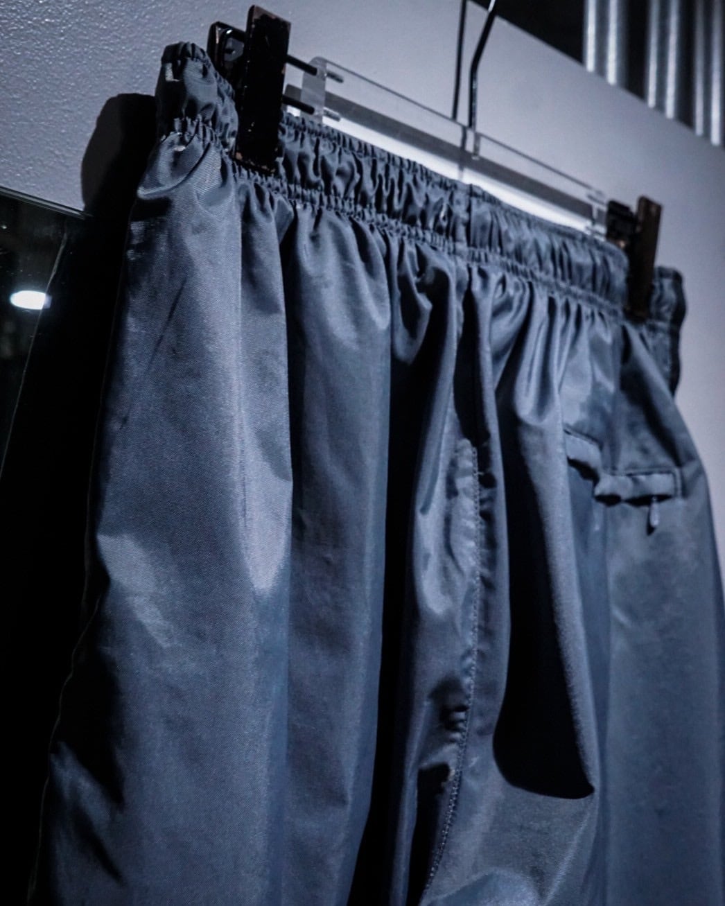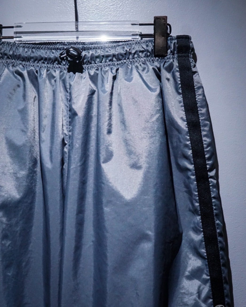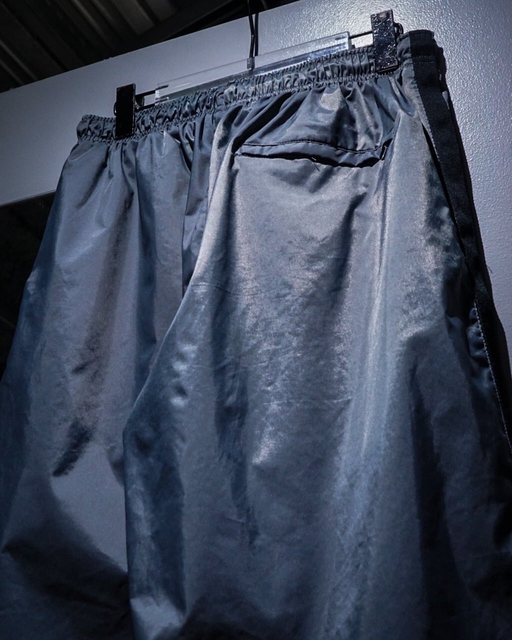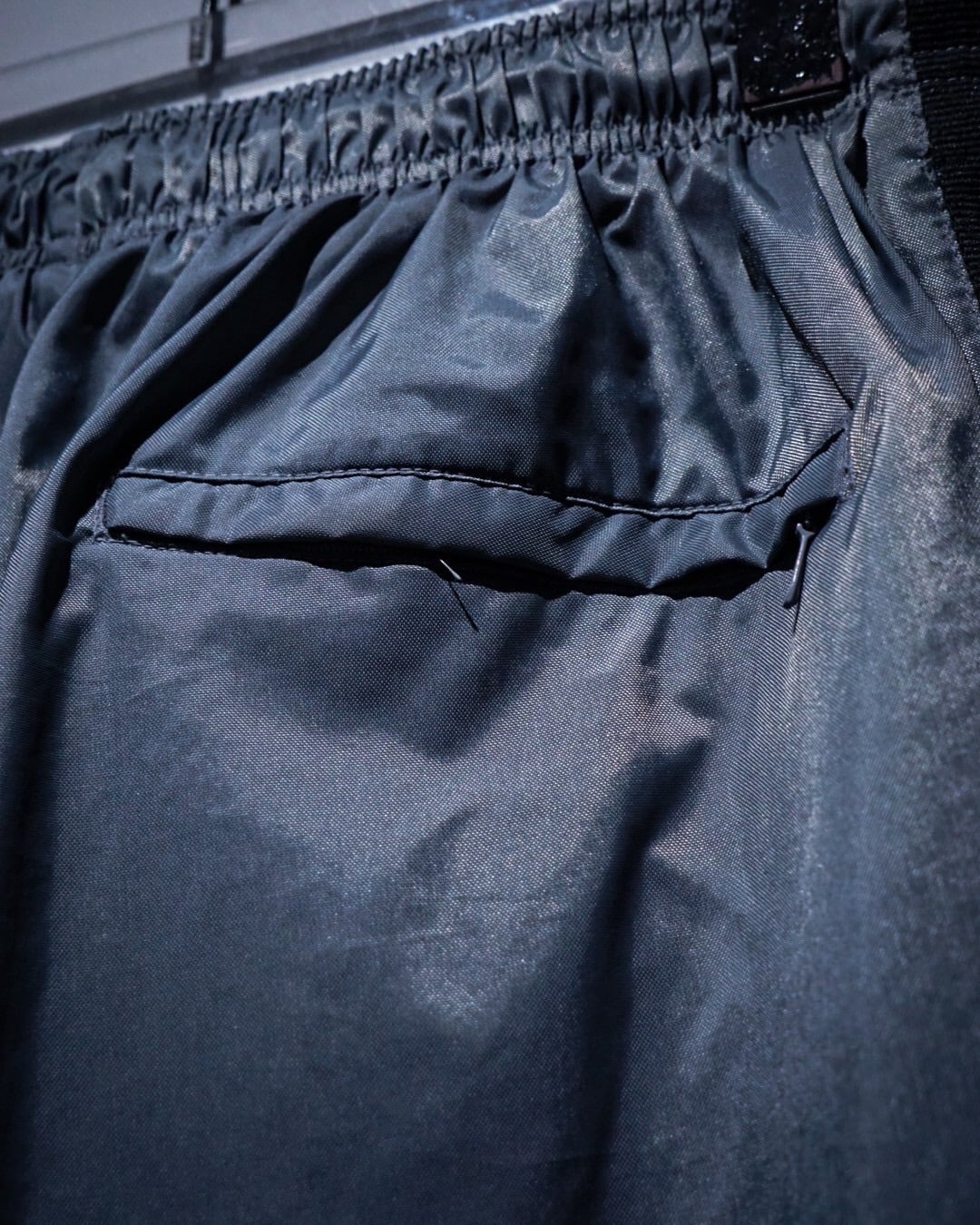 上品な光沢感と柔らかな肌触りのグレーのナイロン素材に、太腿部分までのサイドライン、左裾に施されたスウォッシュロゴ、背面のジップポケットが施された、洗練されたデザインに仕上げられた1本。