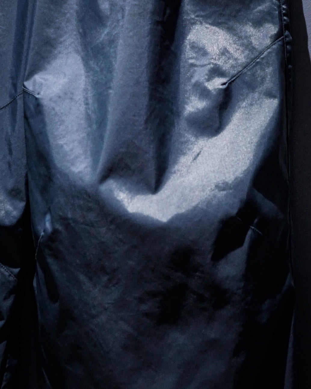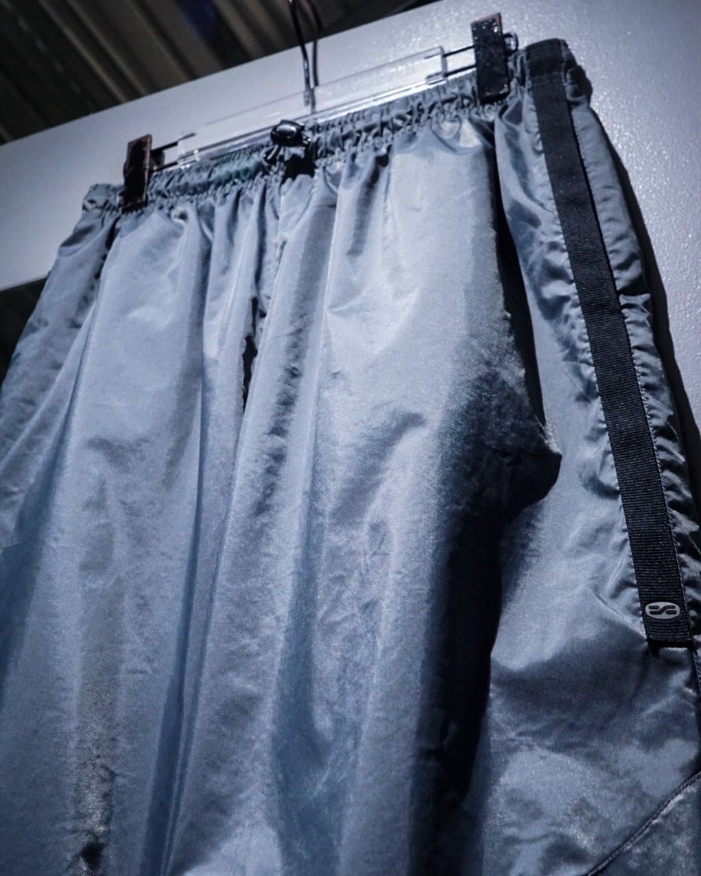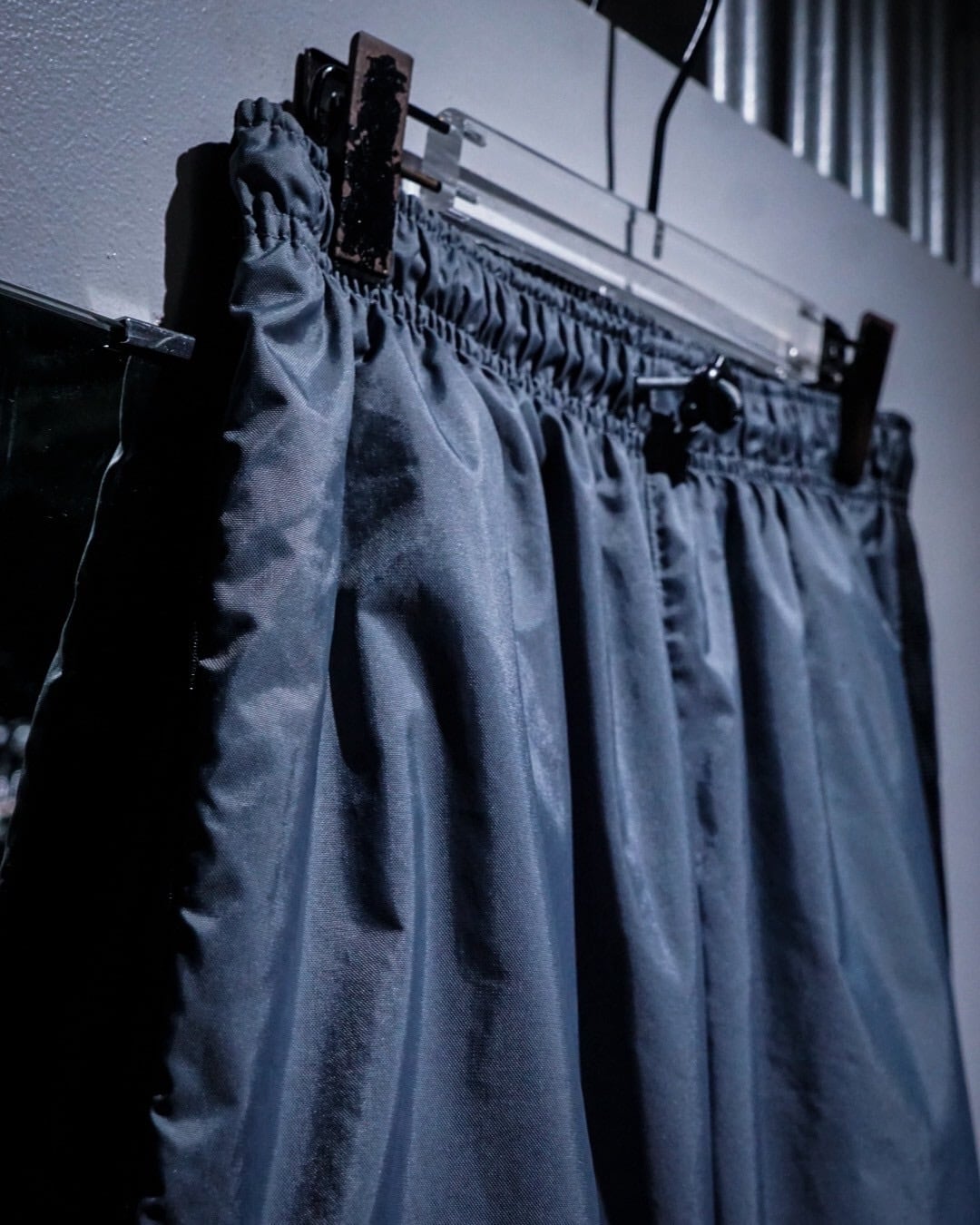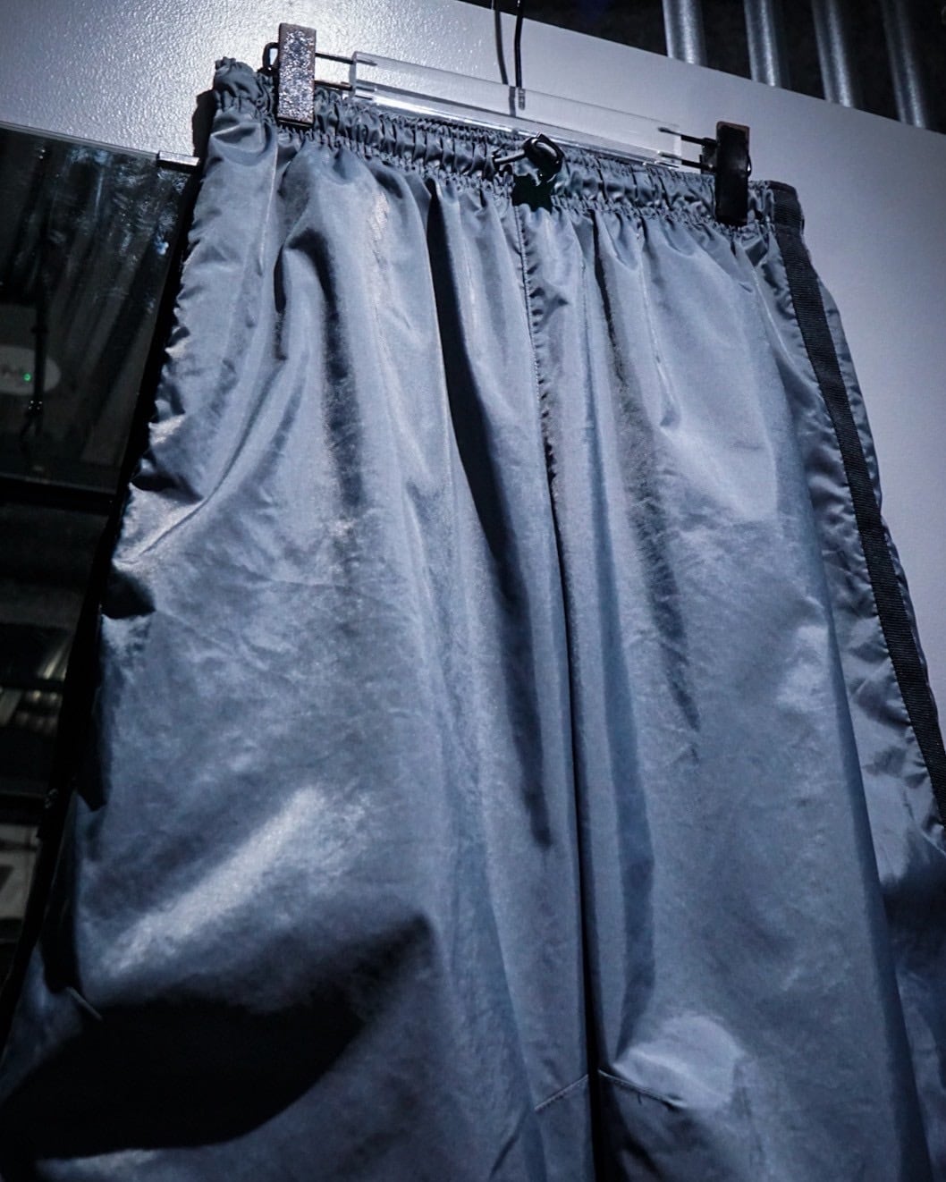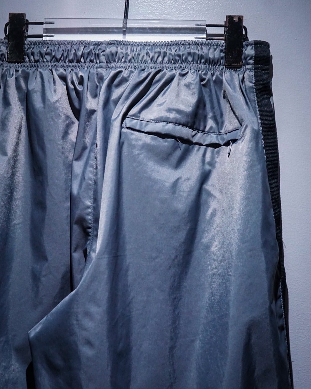 上品な光沢感と柔らかな肌触りのグレーのナイロン素材に、太腿部分までのサイドライン、左裾に施されたスウォッシュロゴ、背面のジップポケットが施された、洗練されたデザインに仕上げられた1本。