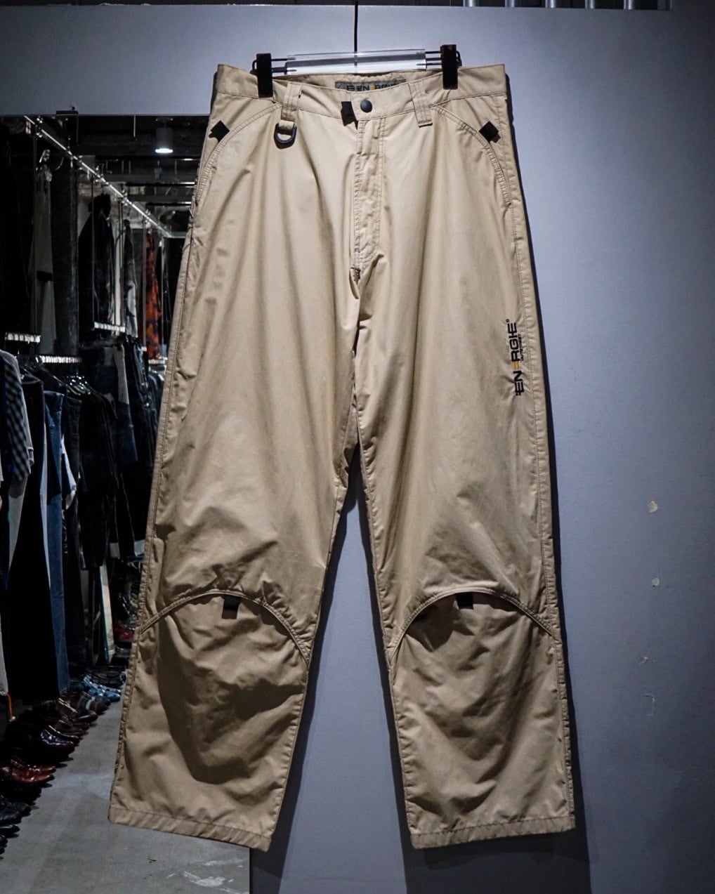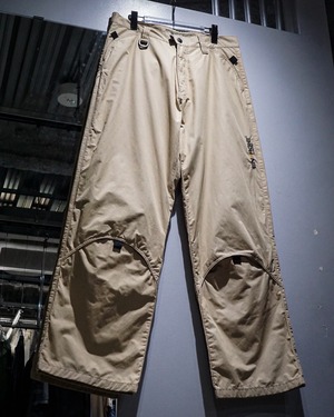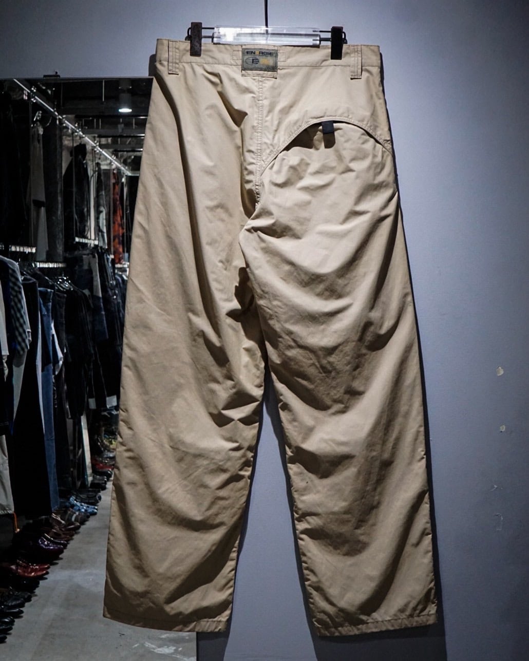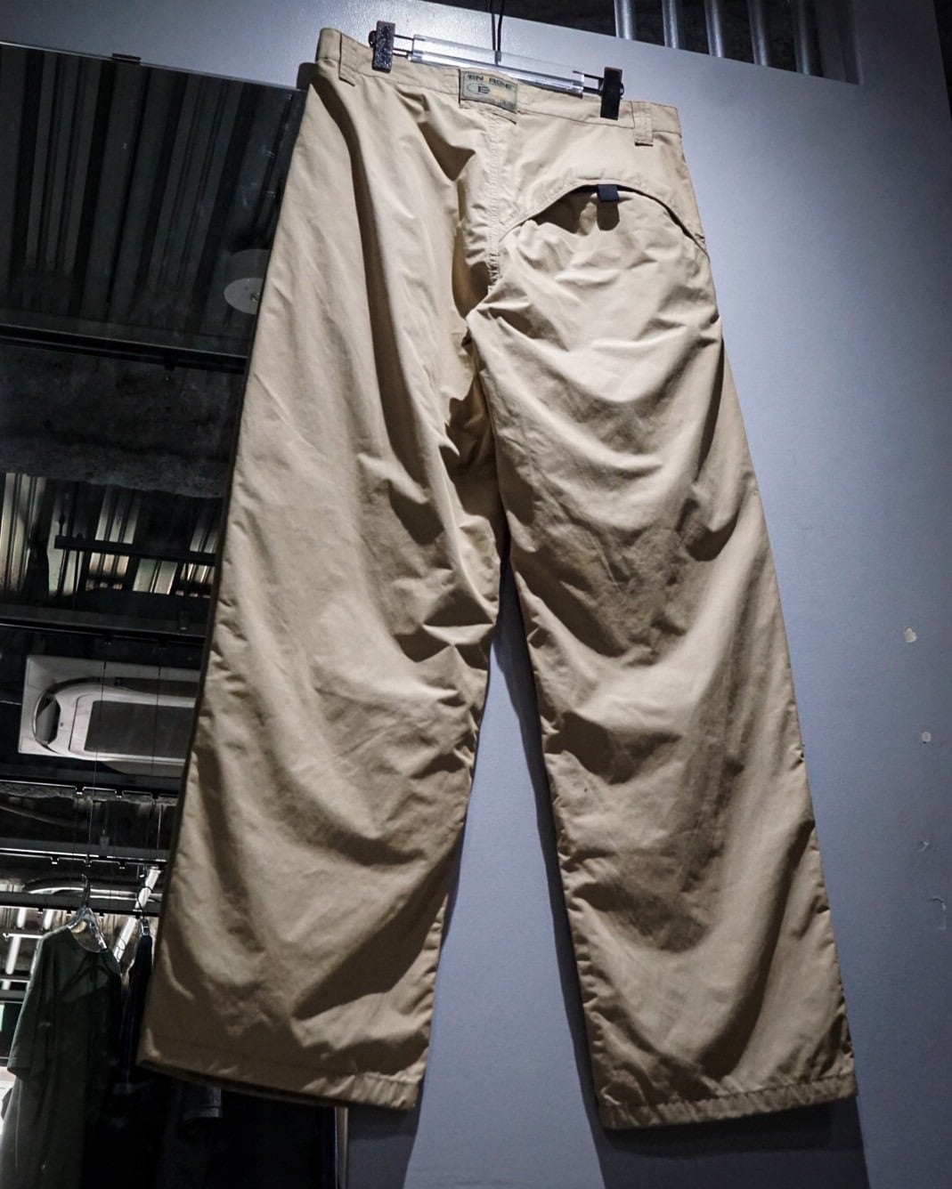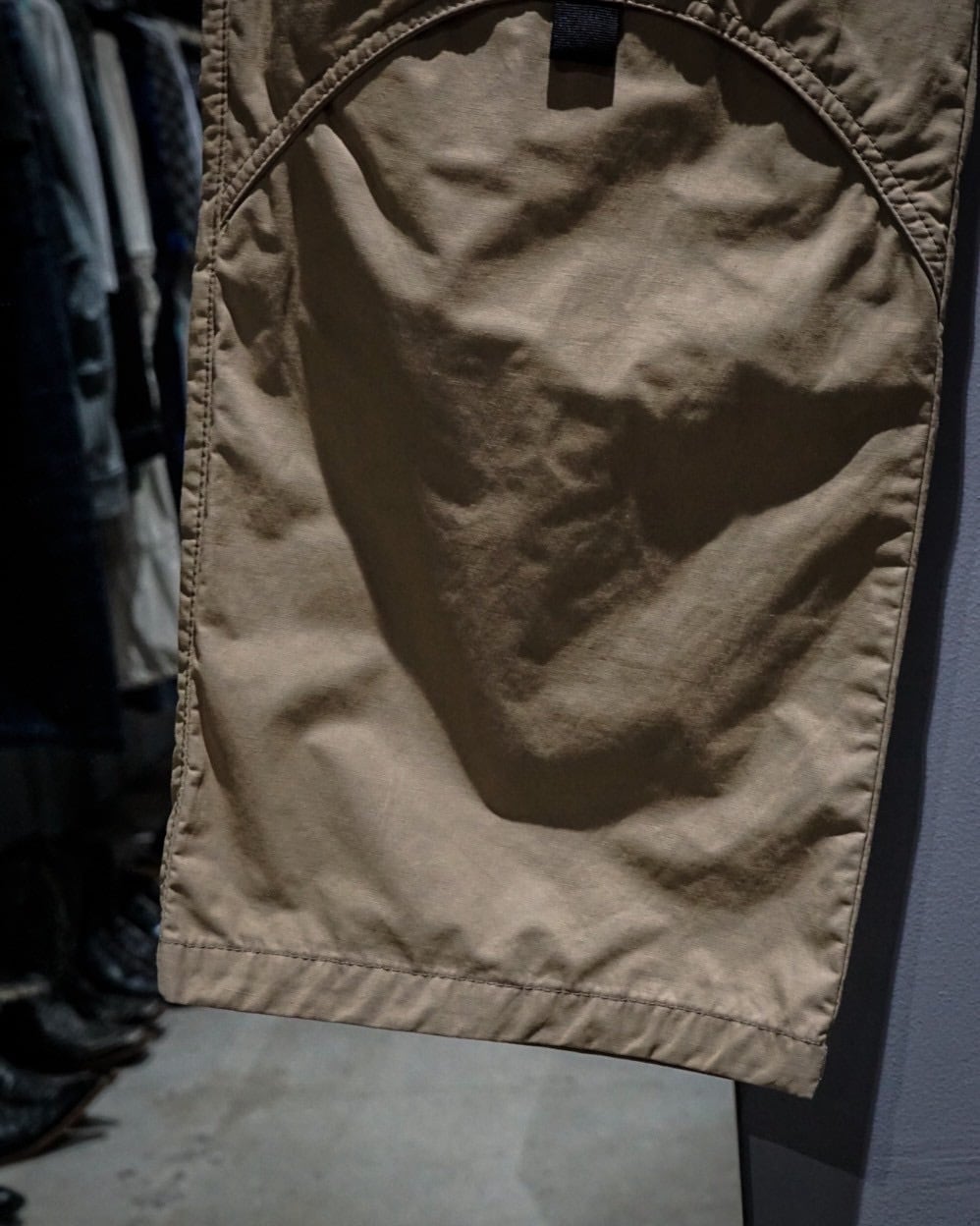両ポケット膝、背面右にはラウンド状の切り替えか施されており、シンプルながら程よく個性的なユーロマインドを感じる1本に仕上がっています。左腿部分にはブランドロゴが施された細部へのこだわりも◎