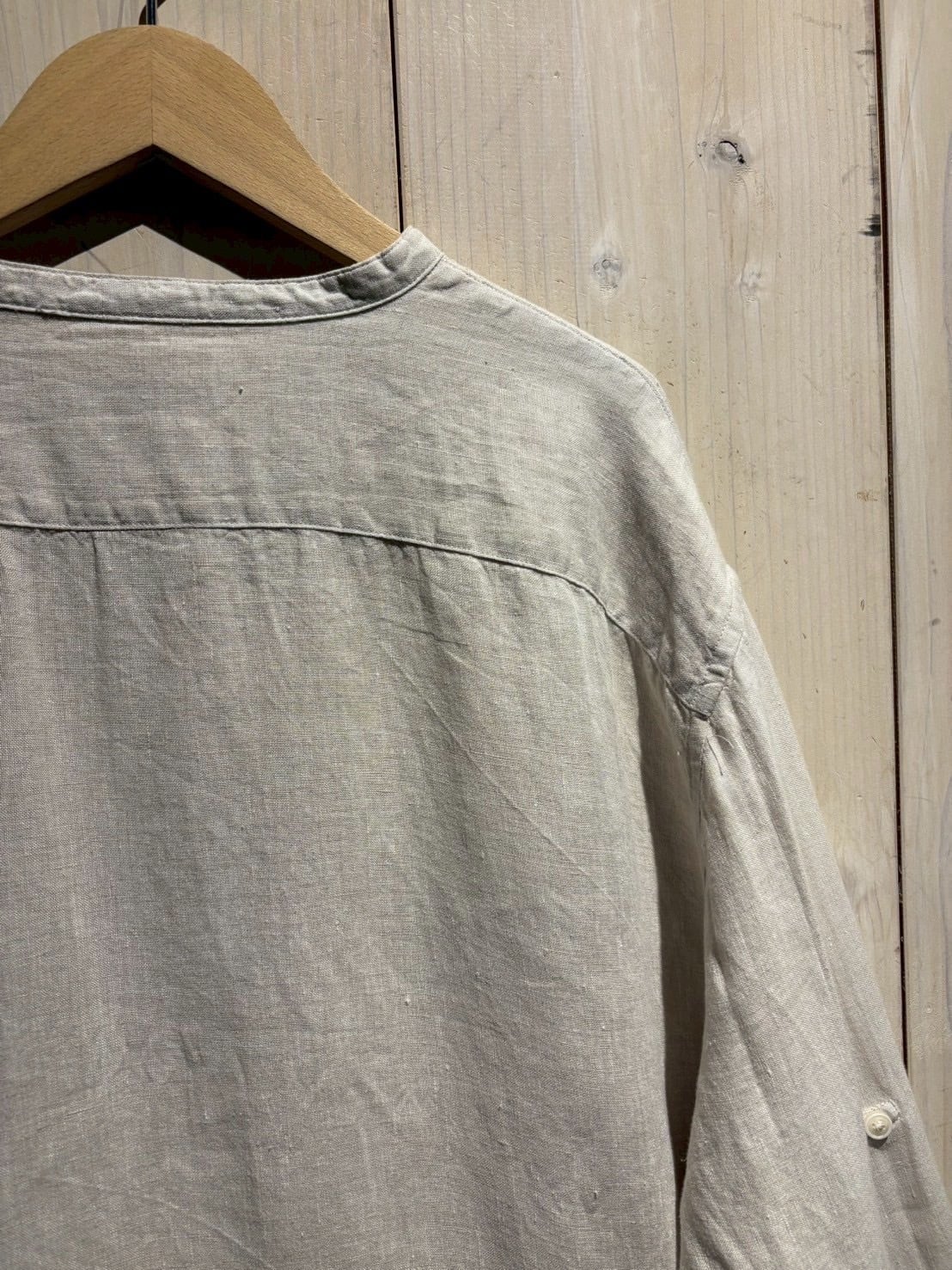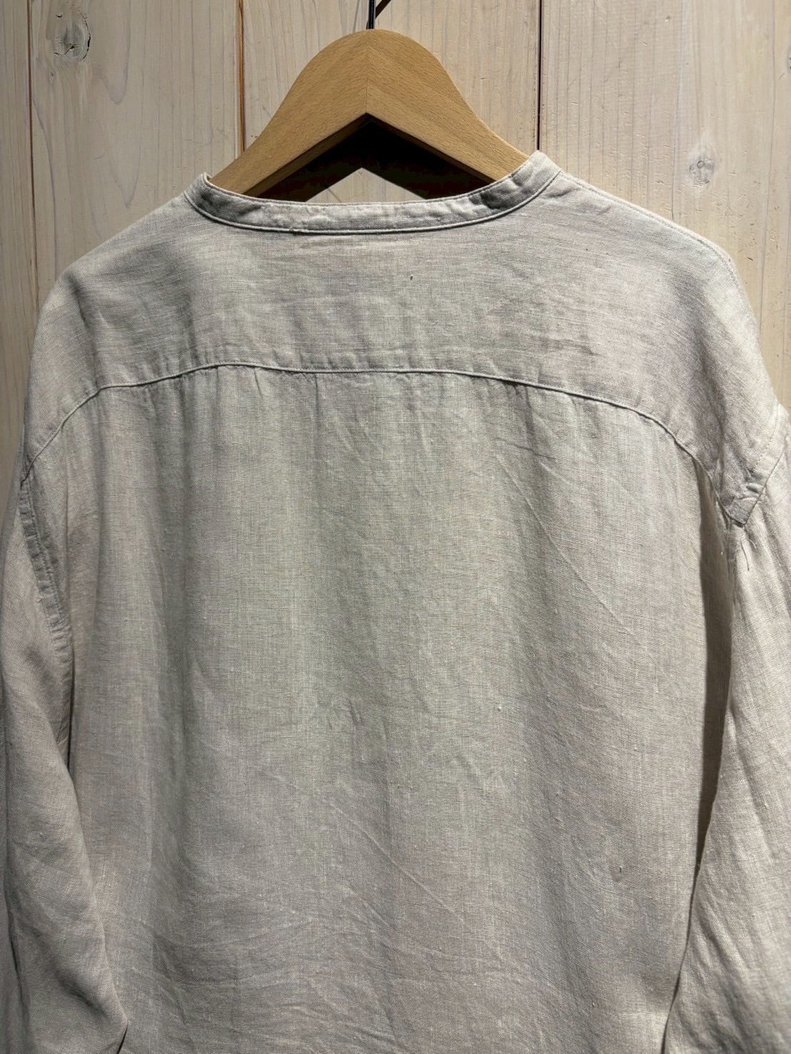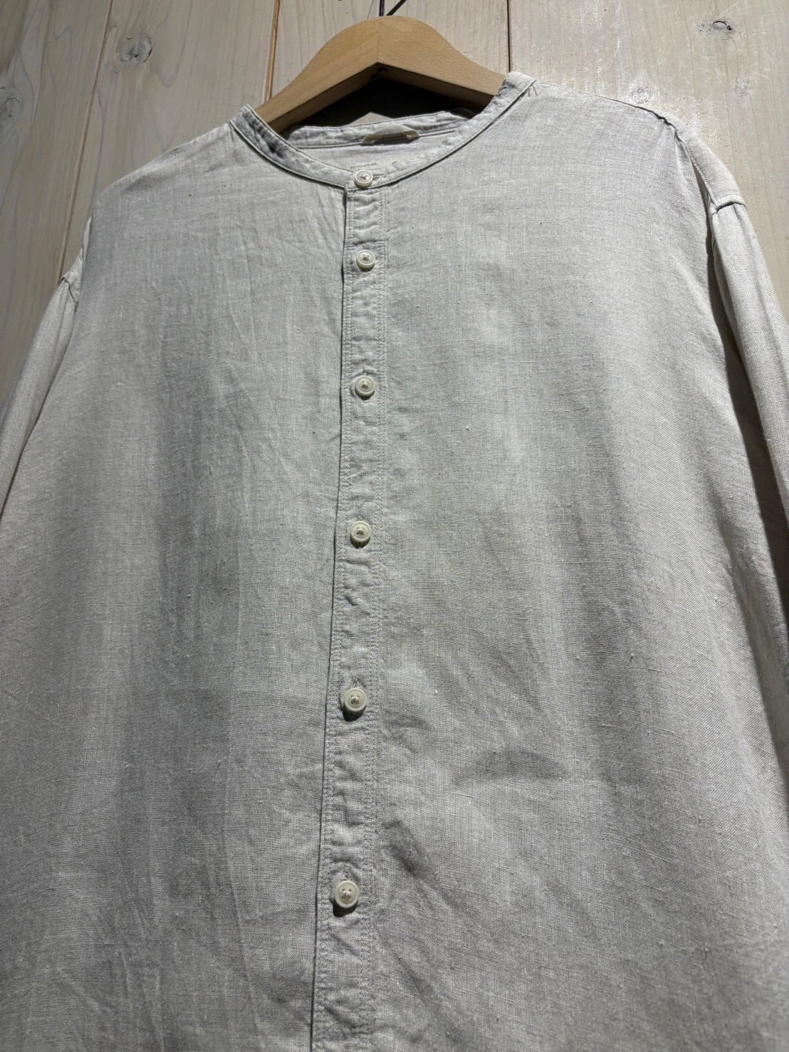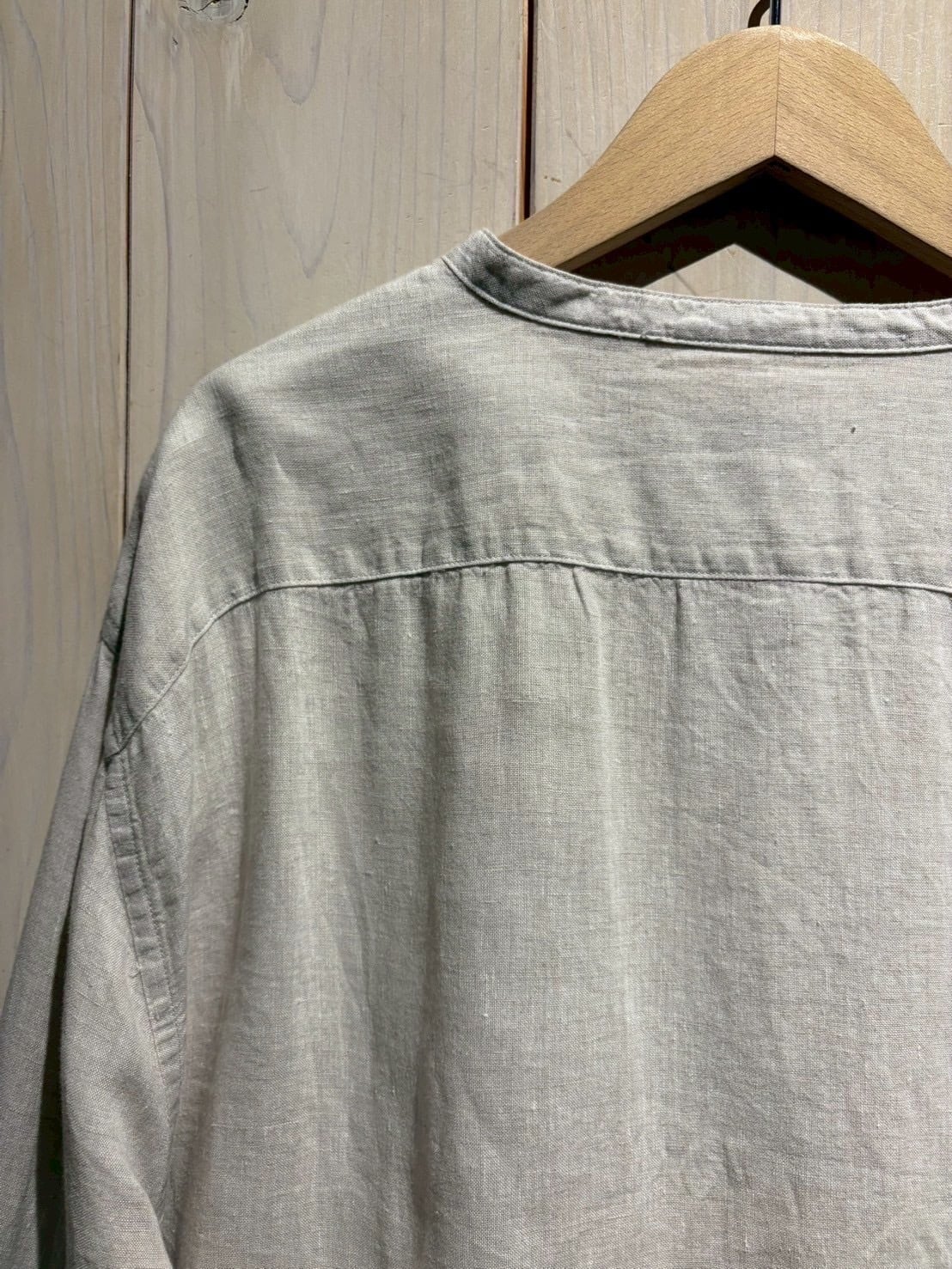 首元はバンドカラーでミニマルな仕上がり。故にリネン独特のナチュラルな風合いが引き立つ、上質な1着。