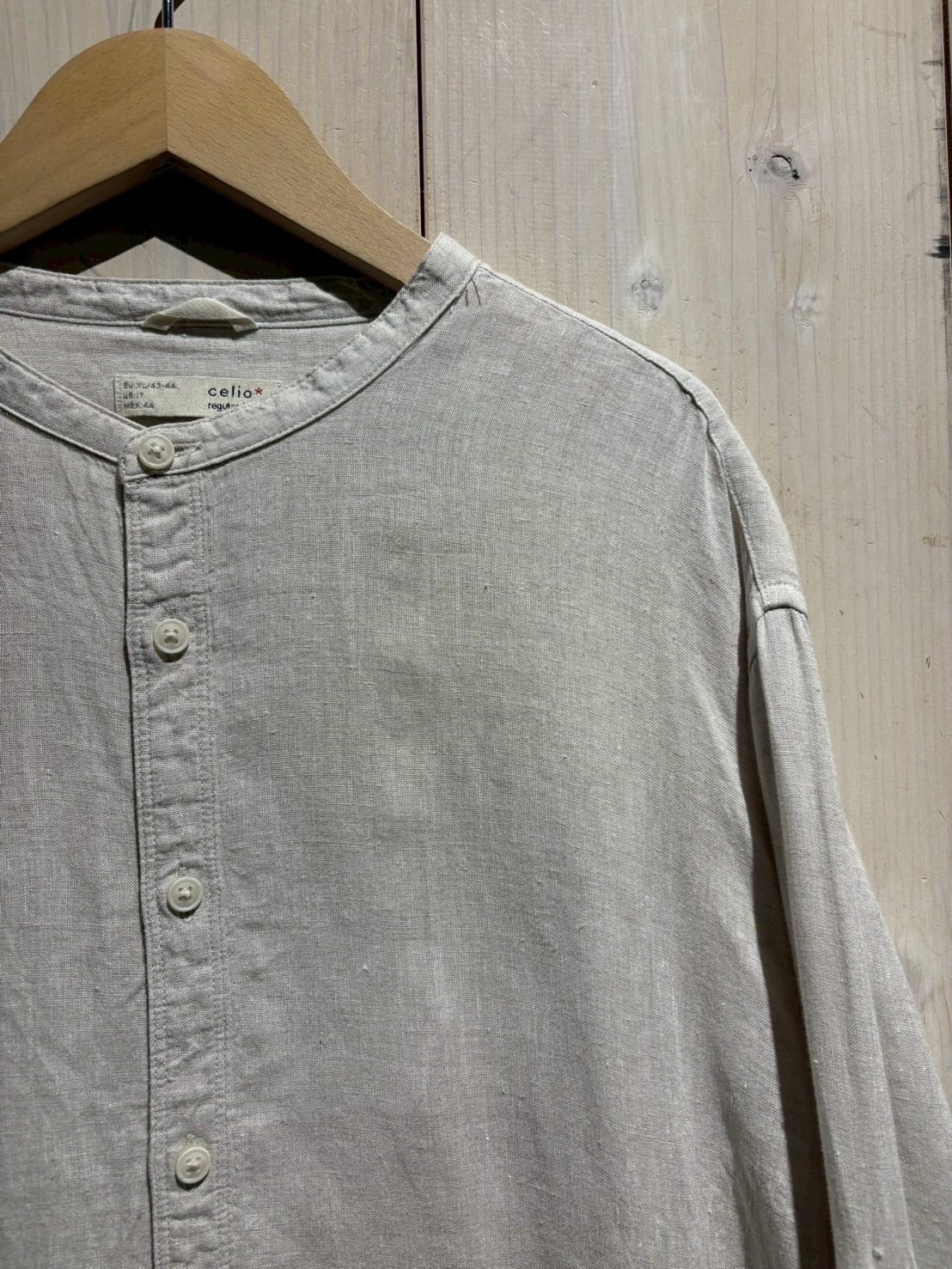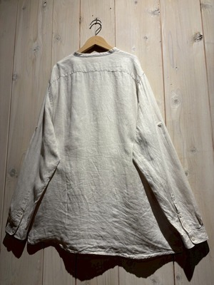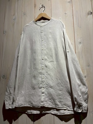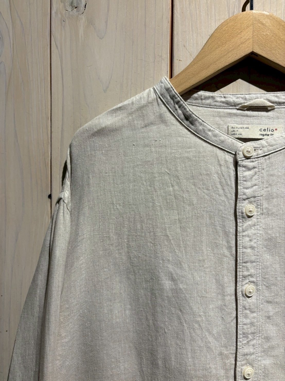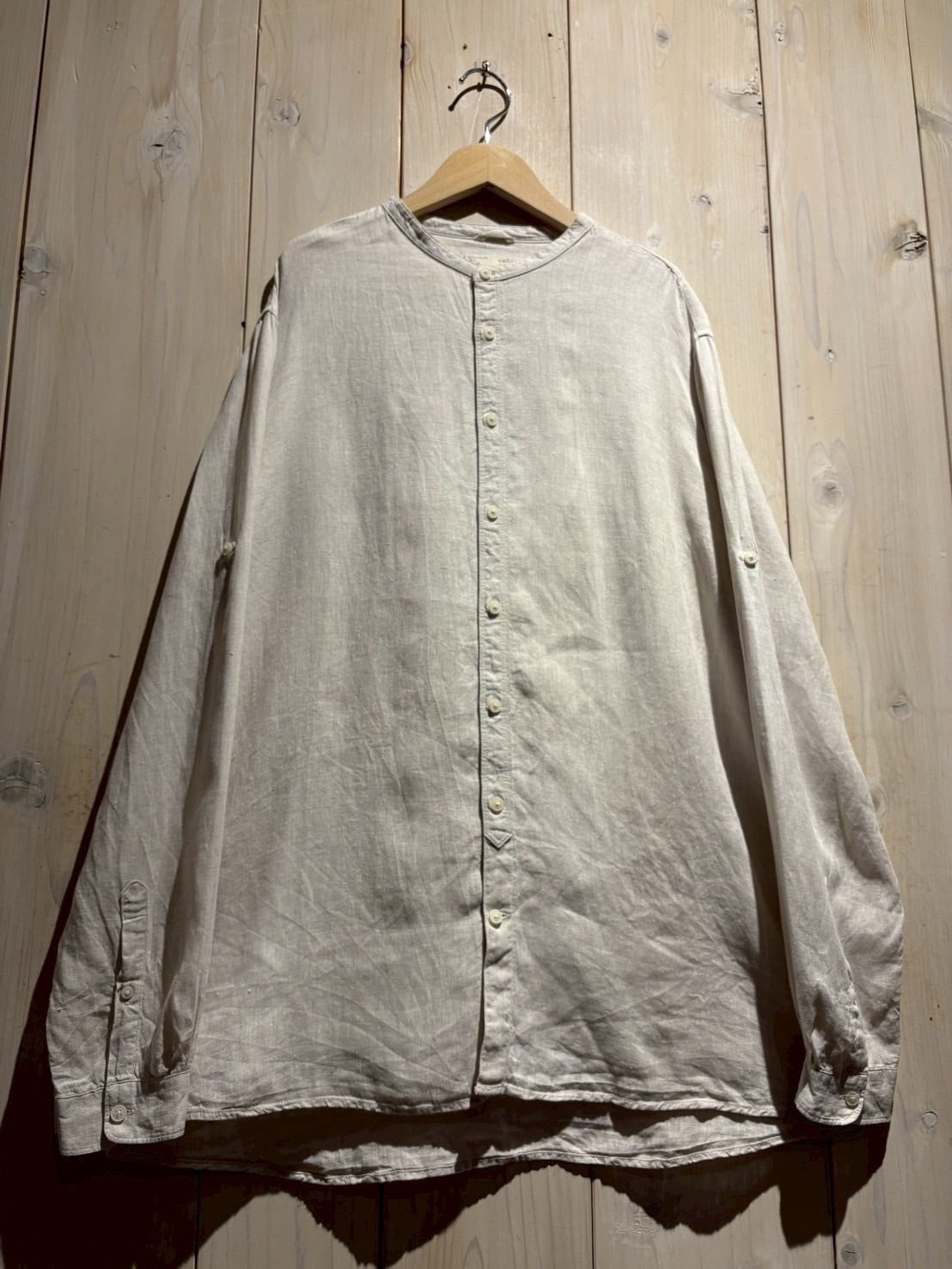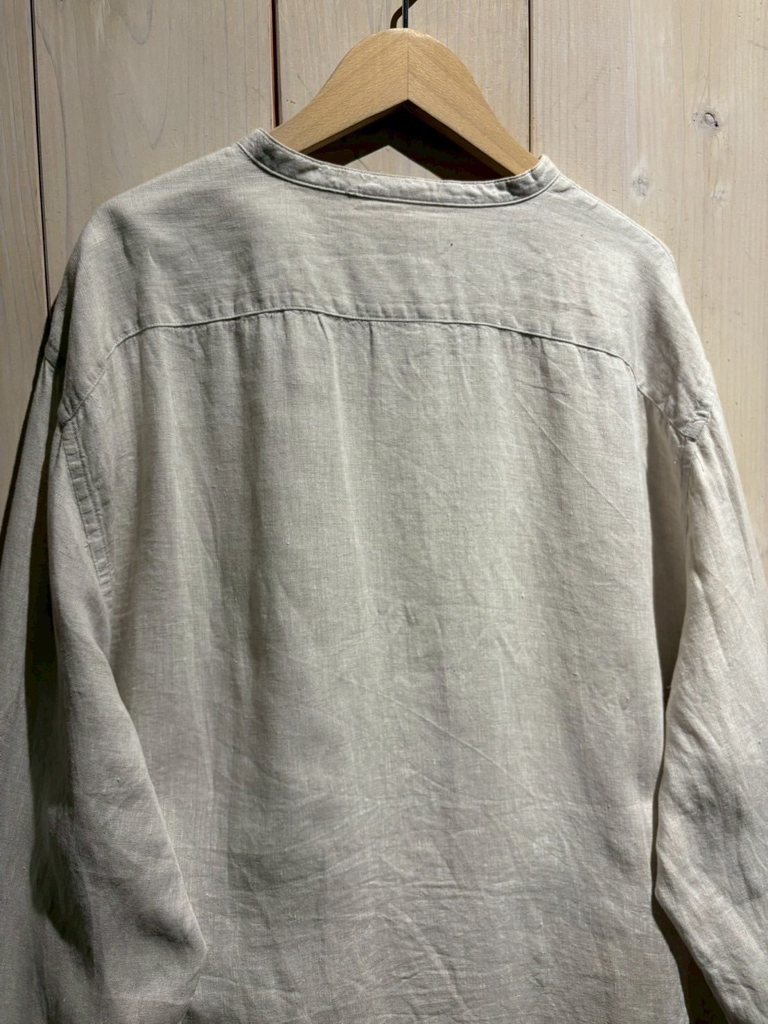 首元はバンドカラーでミニマルな仕上がり。故にリネン独特のナチュラルな風合いが引き立つ、上質な1着。