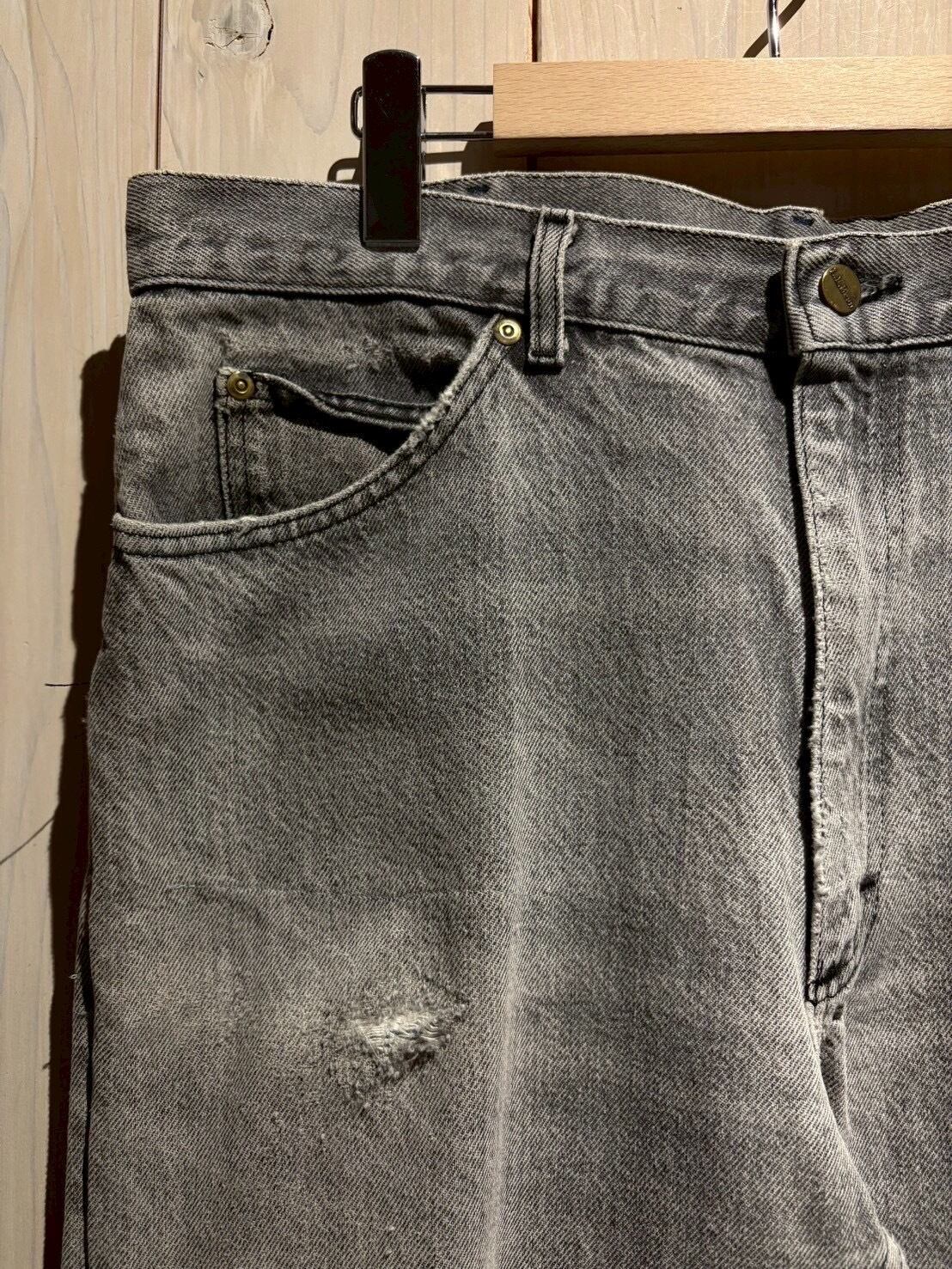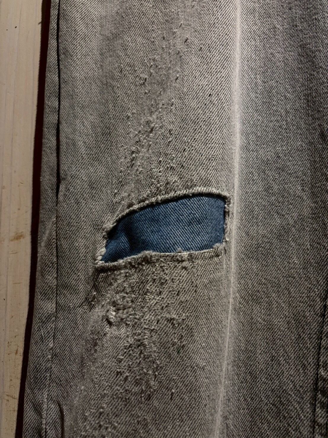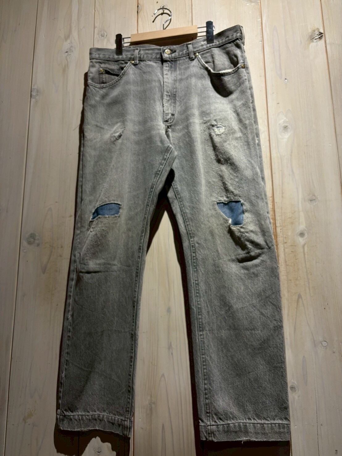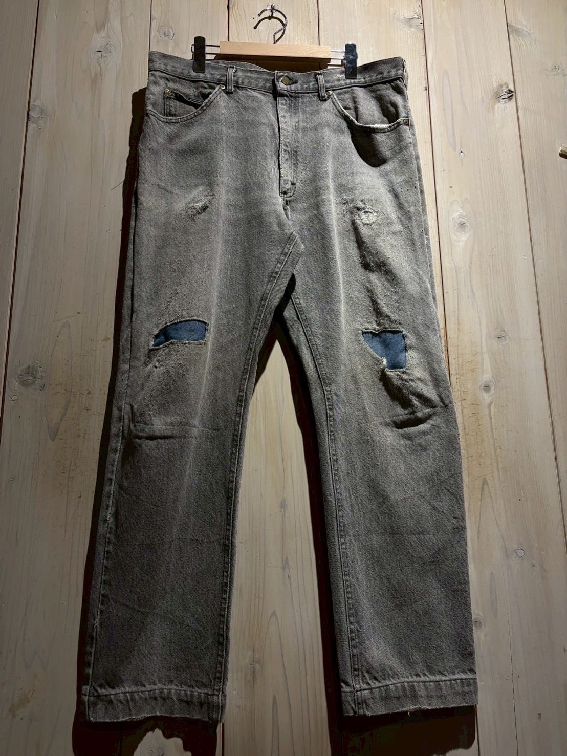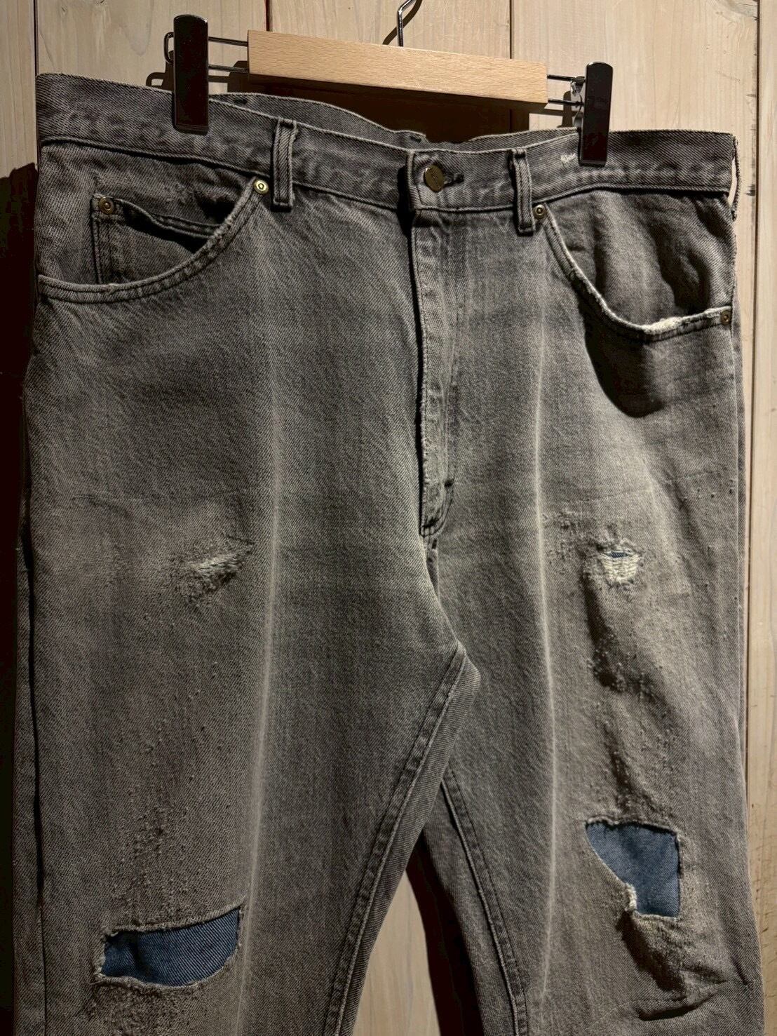経年変化によるボディのフェード、そして前所有者によるリペアが施されたデニムパンツ。