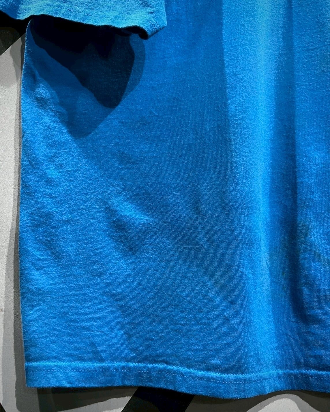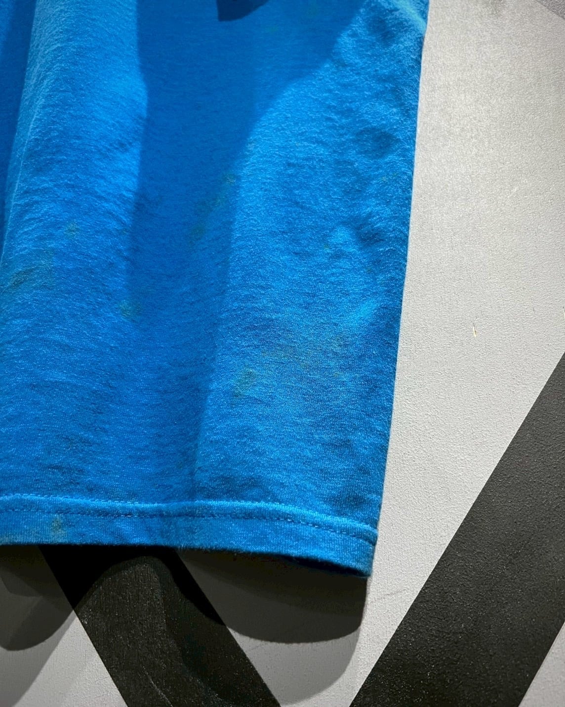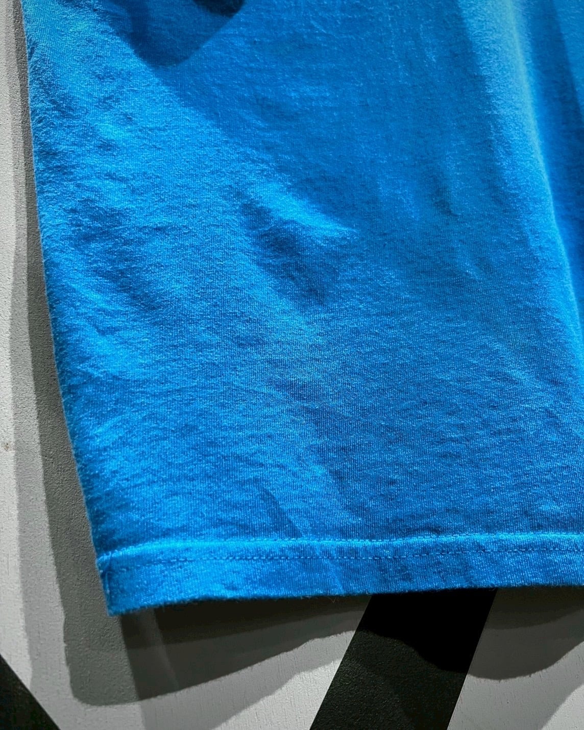 体感XL程度のルーズなサイジング、鮮やかなブルーのボディにパキッとしたプリントのコントラストも◎