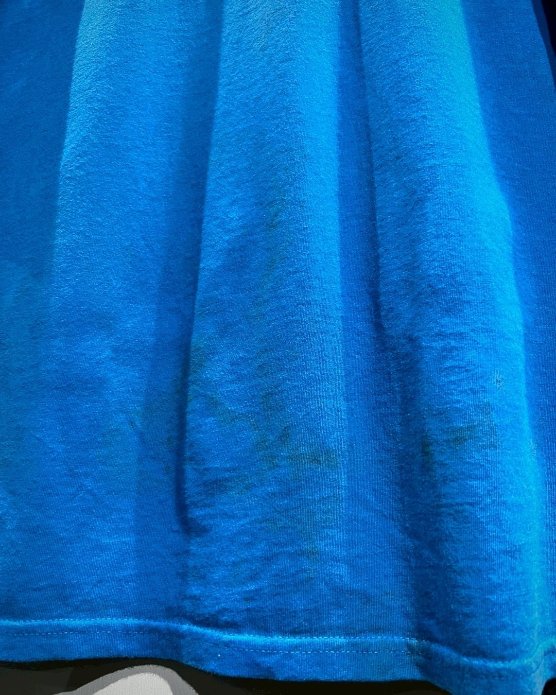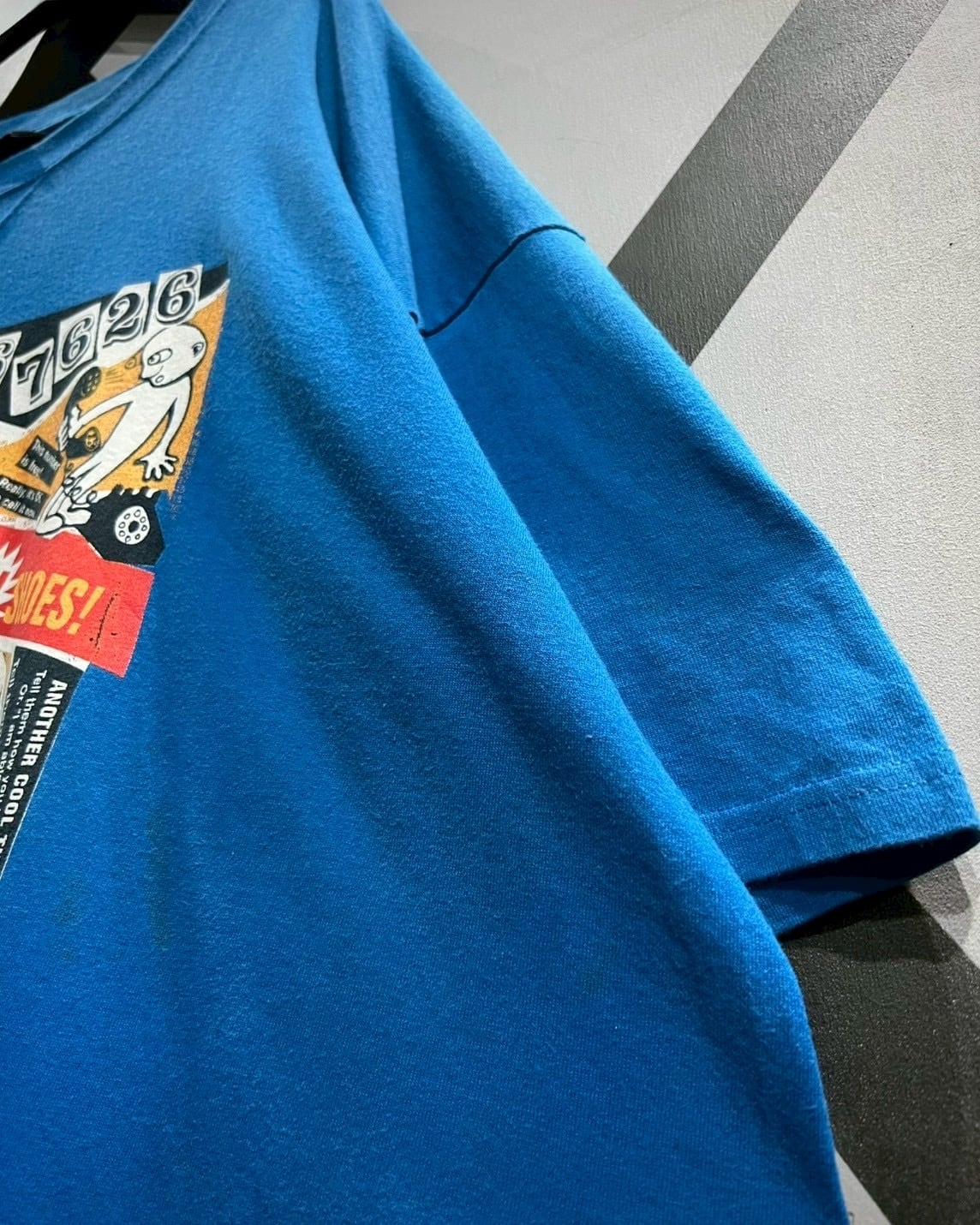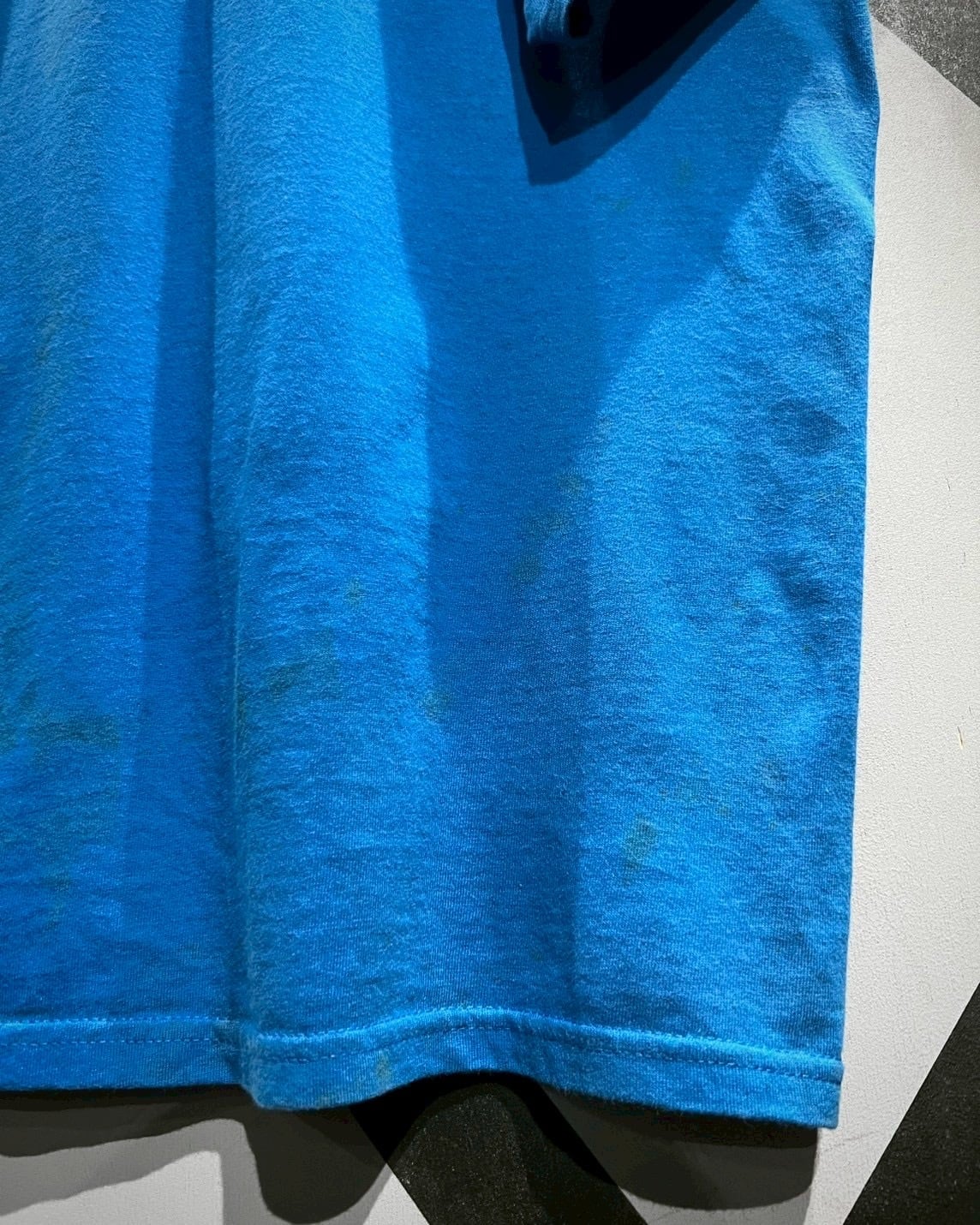 体感XL程度のルーズなサイジング、鮮やかなブルーのボディにパキッとしたプリントのコントラストも◎