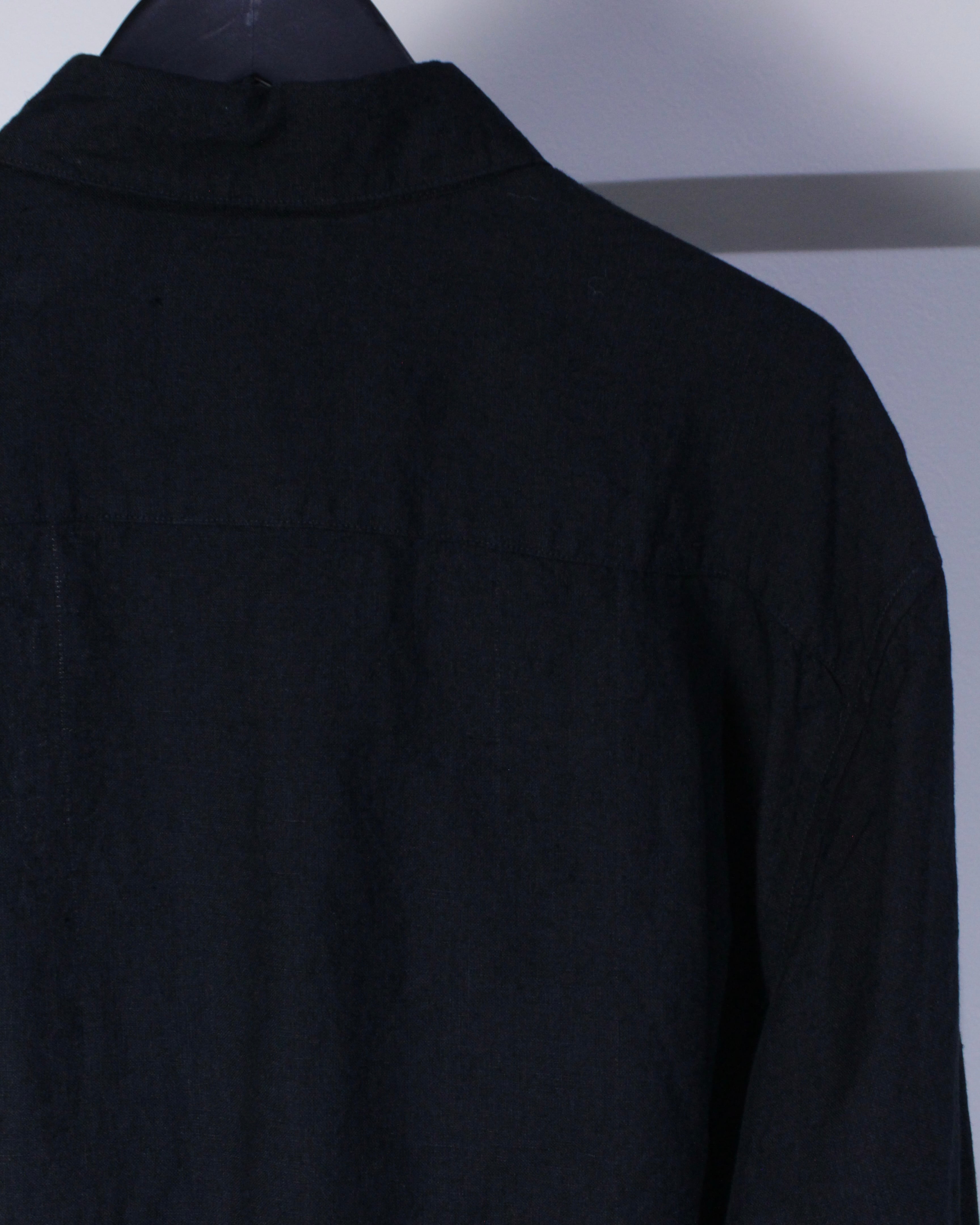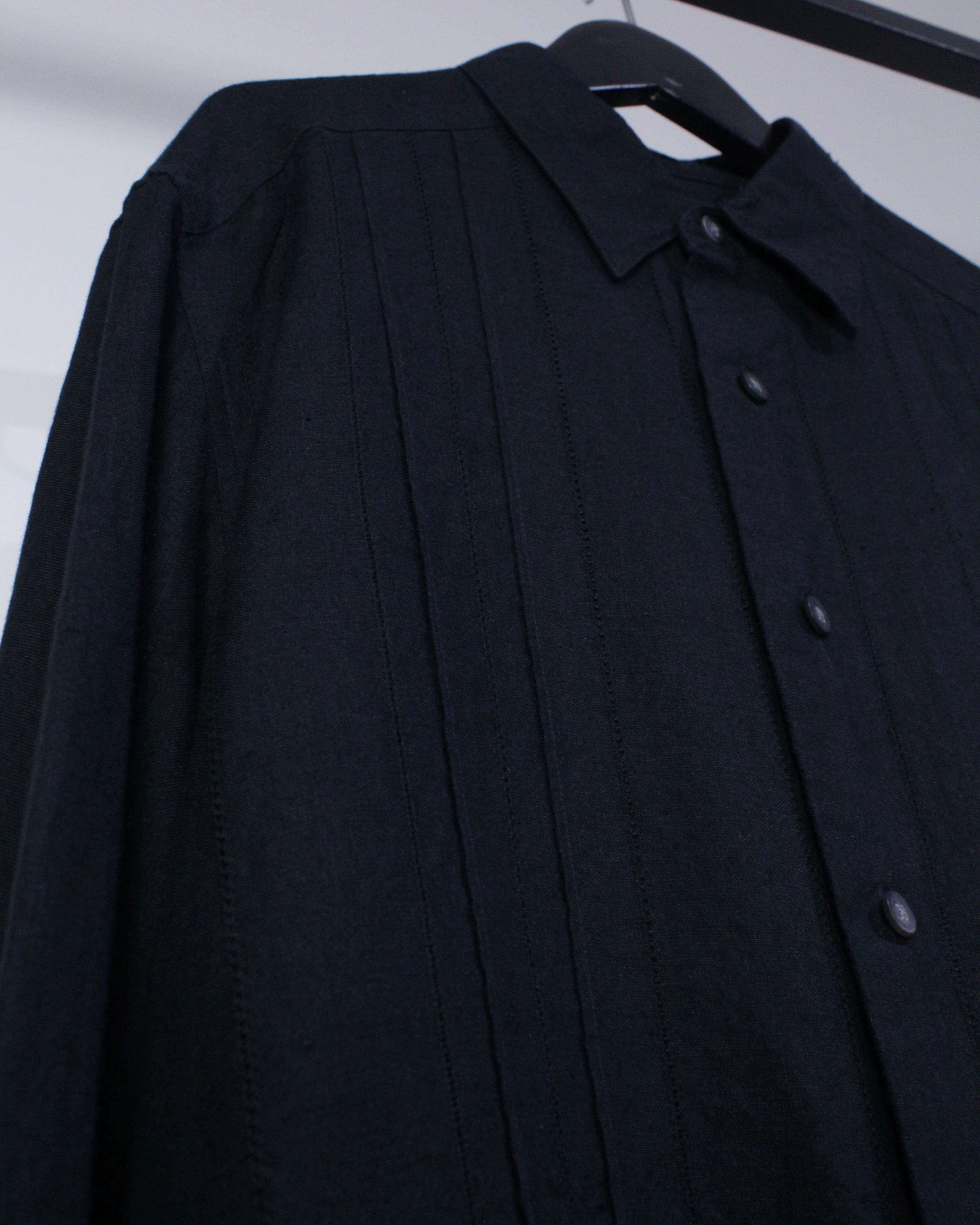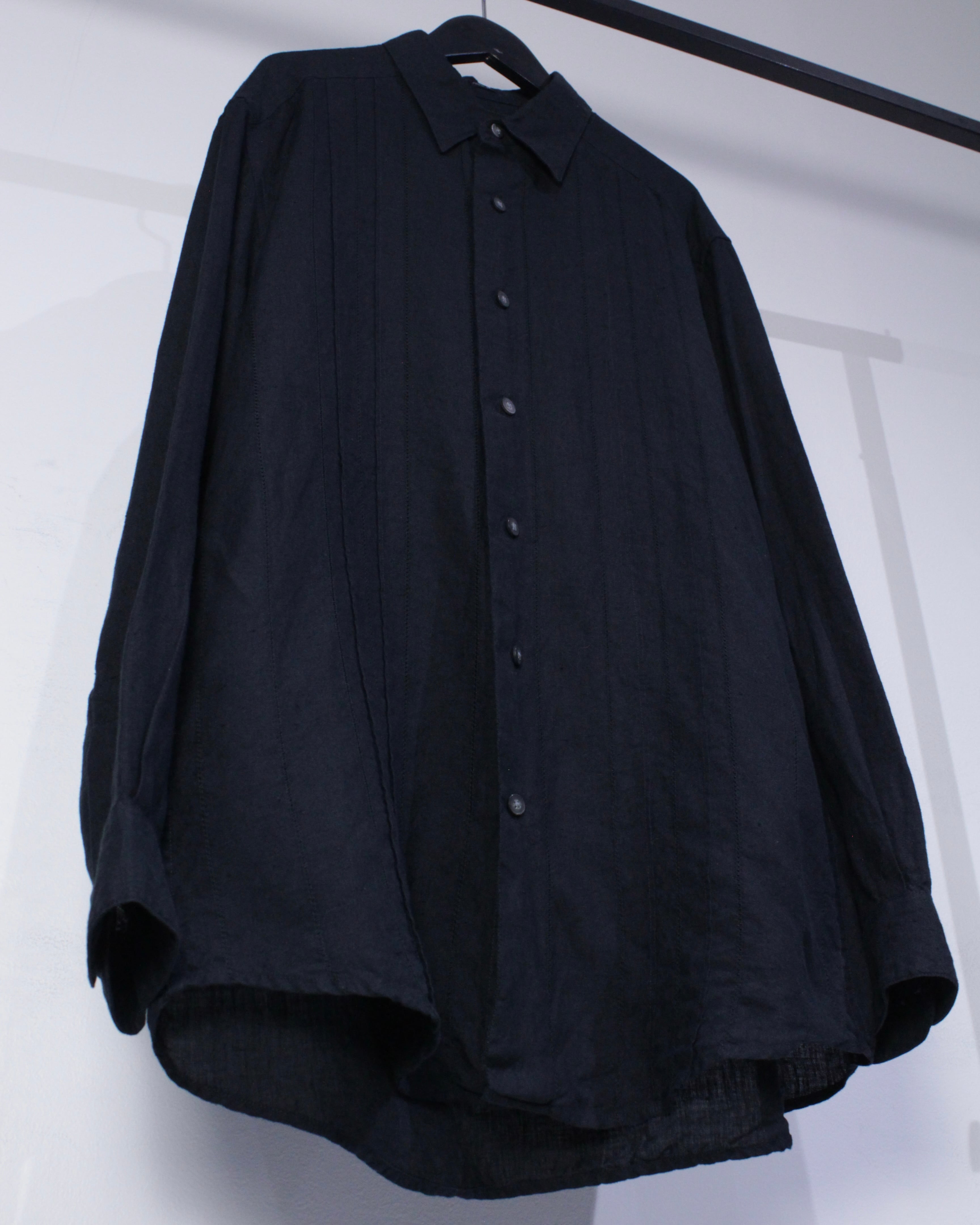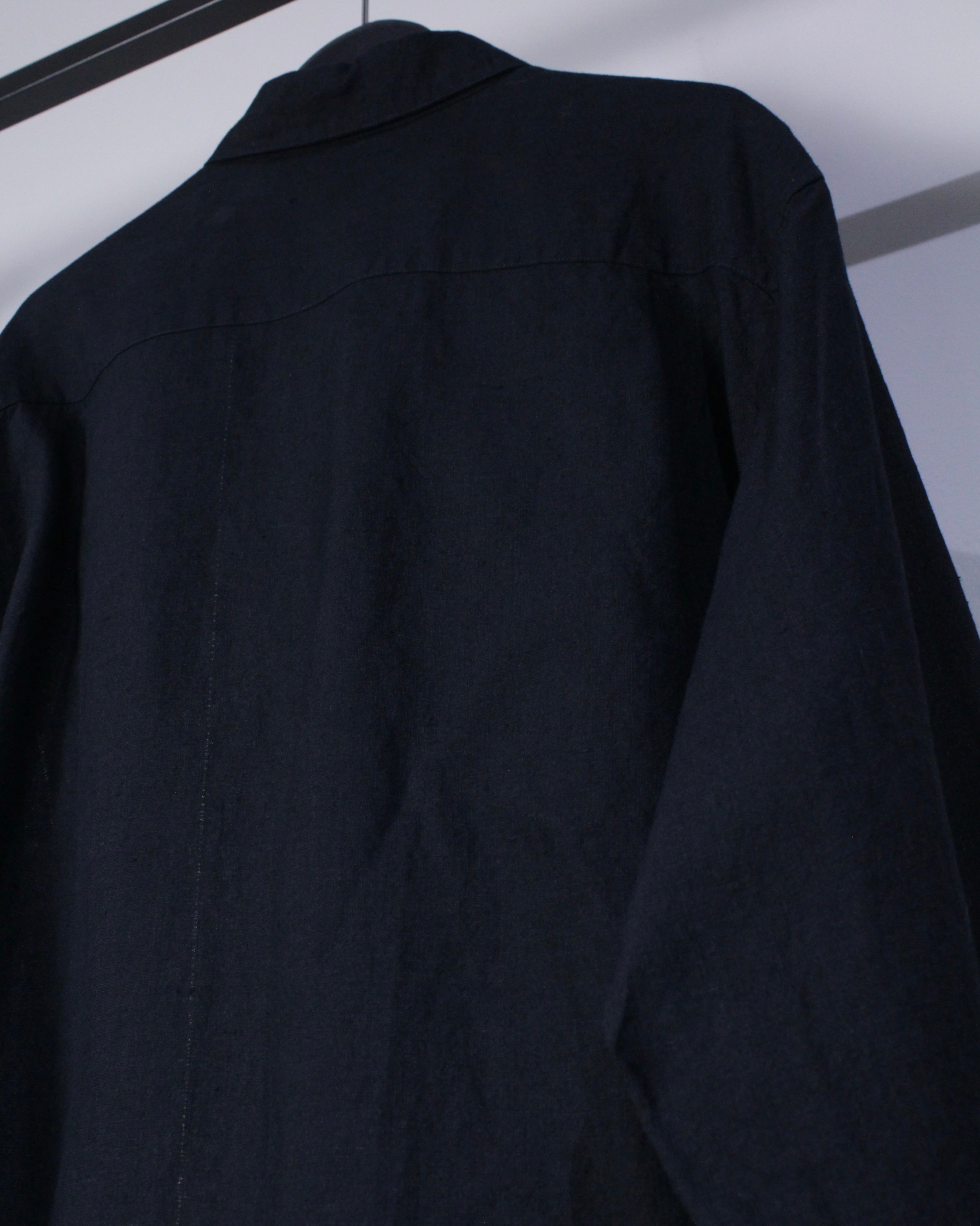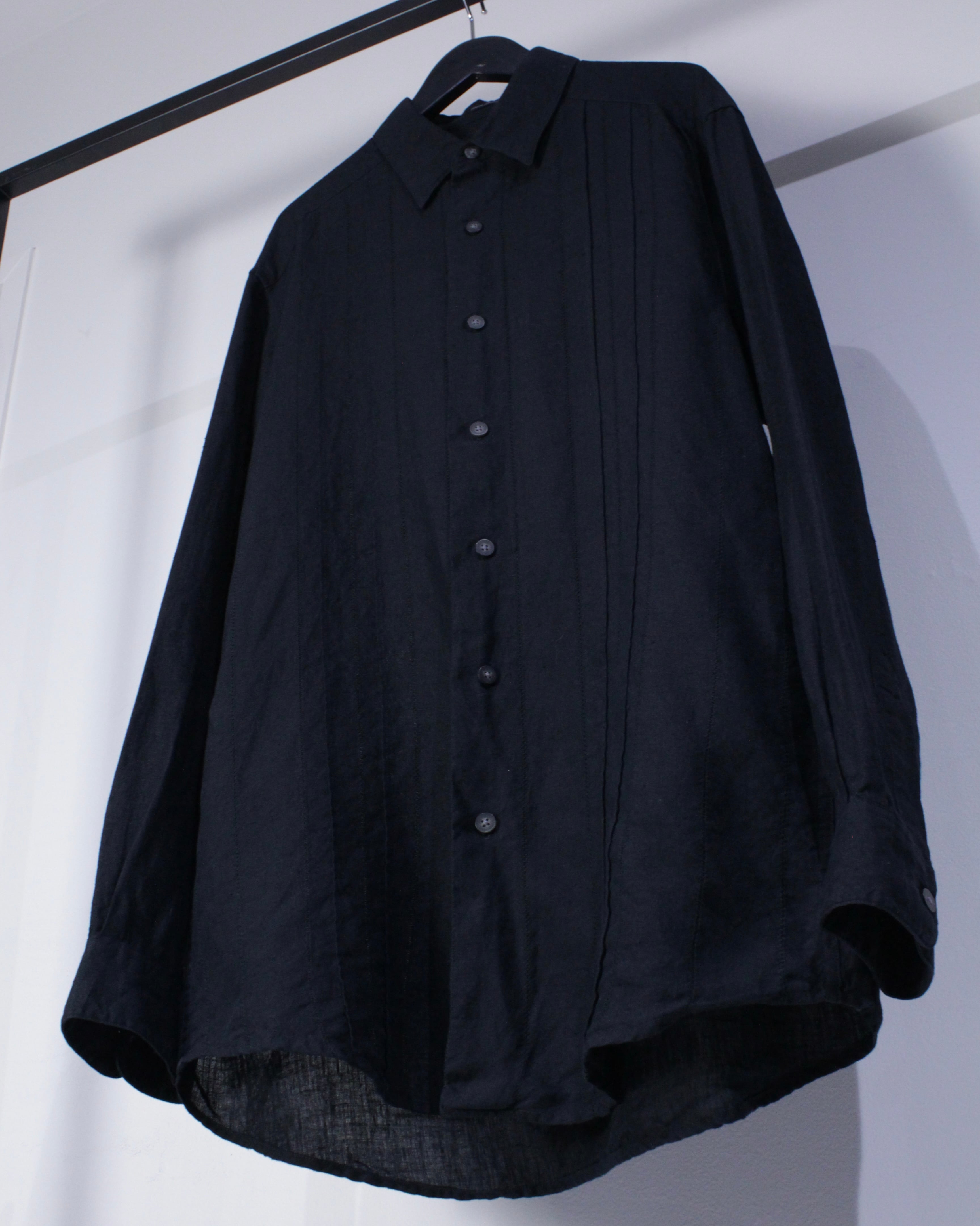 ナチュラルなリネンを用いていながらオールブラックで仕上げる事で、当店らしいモードな雰囲気を纏った1着に。