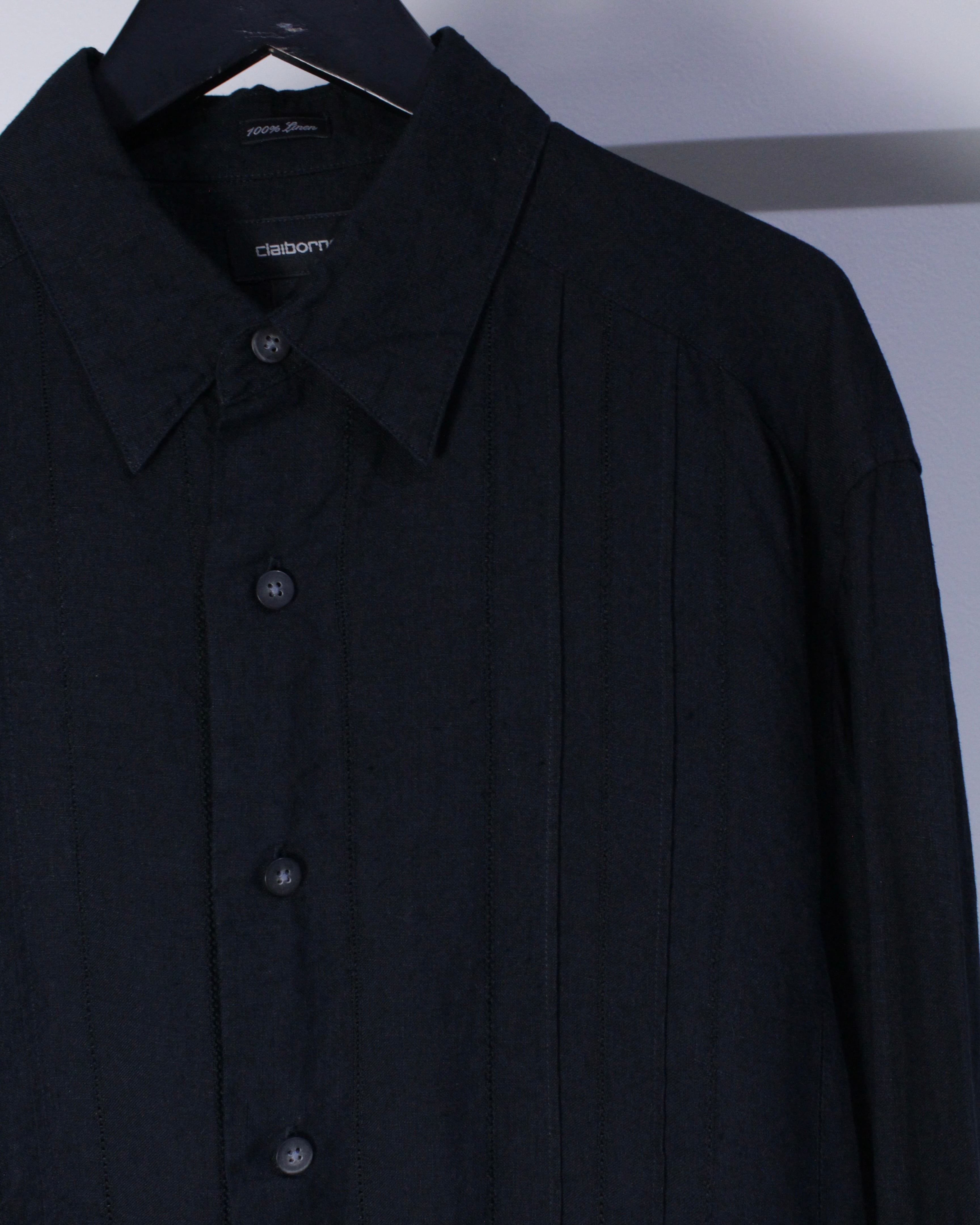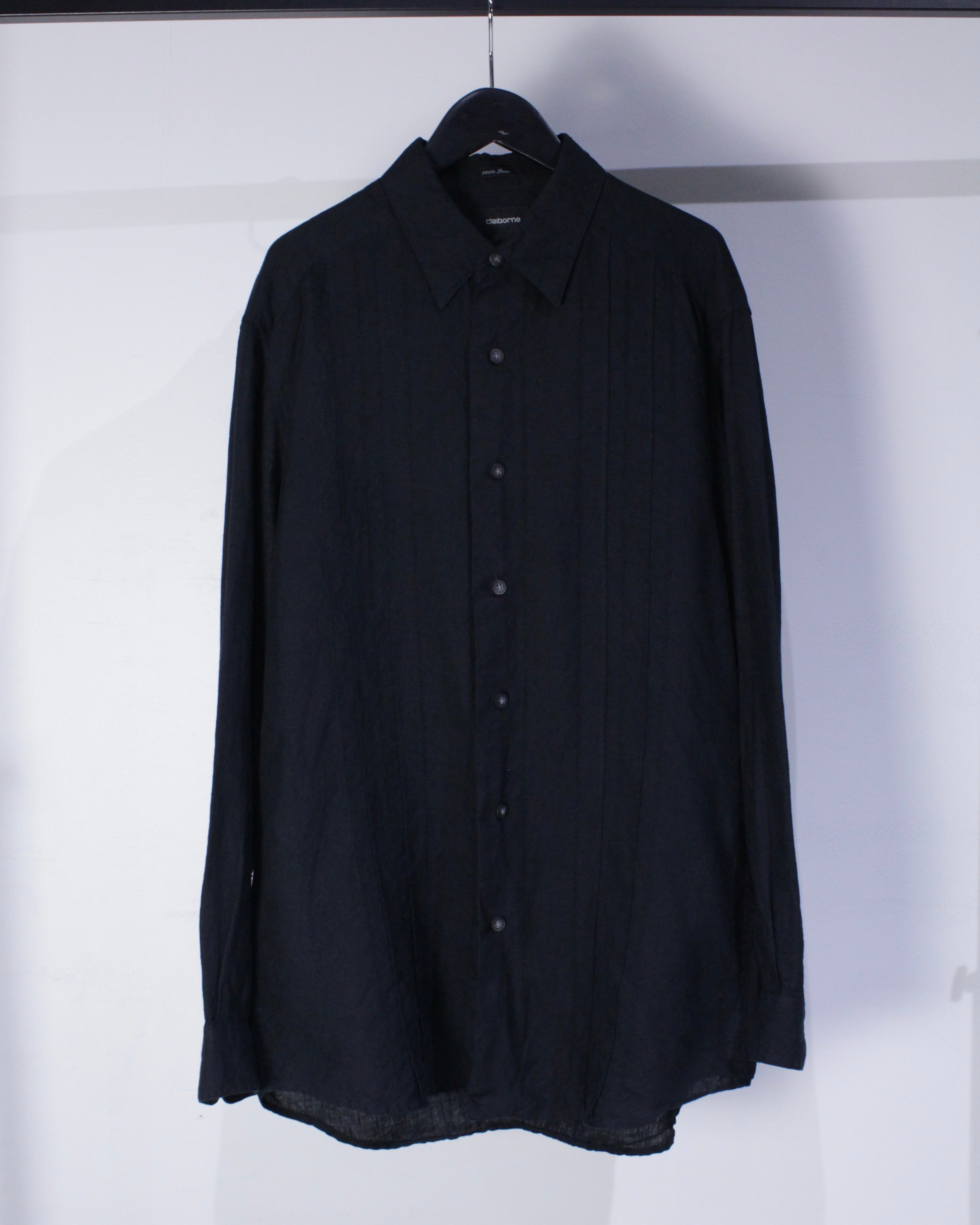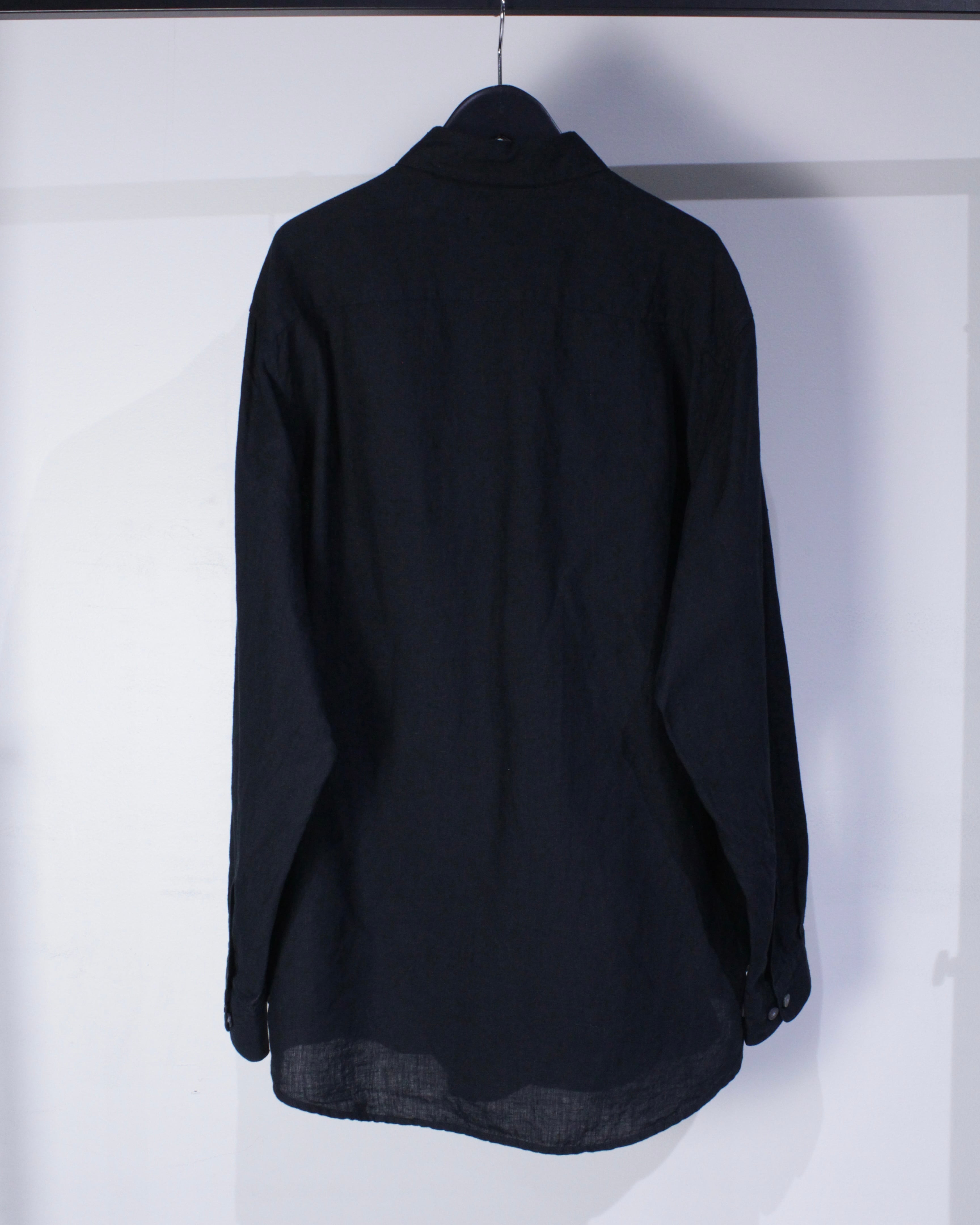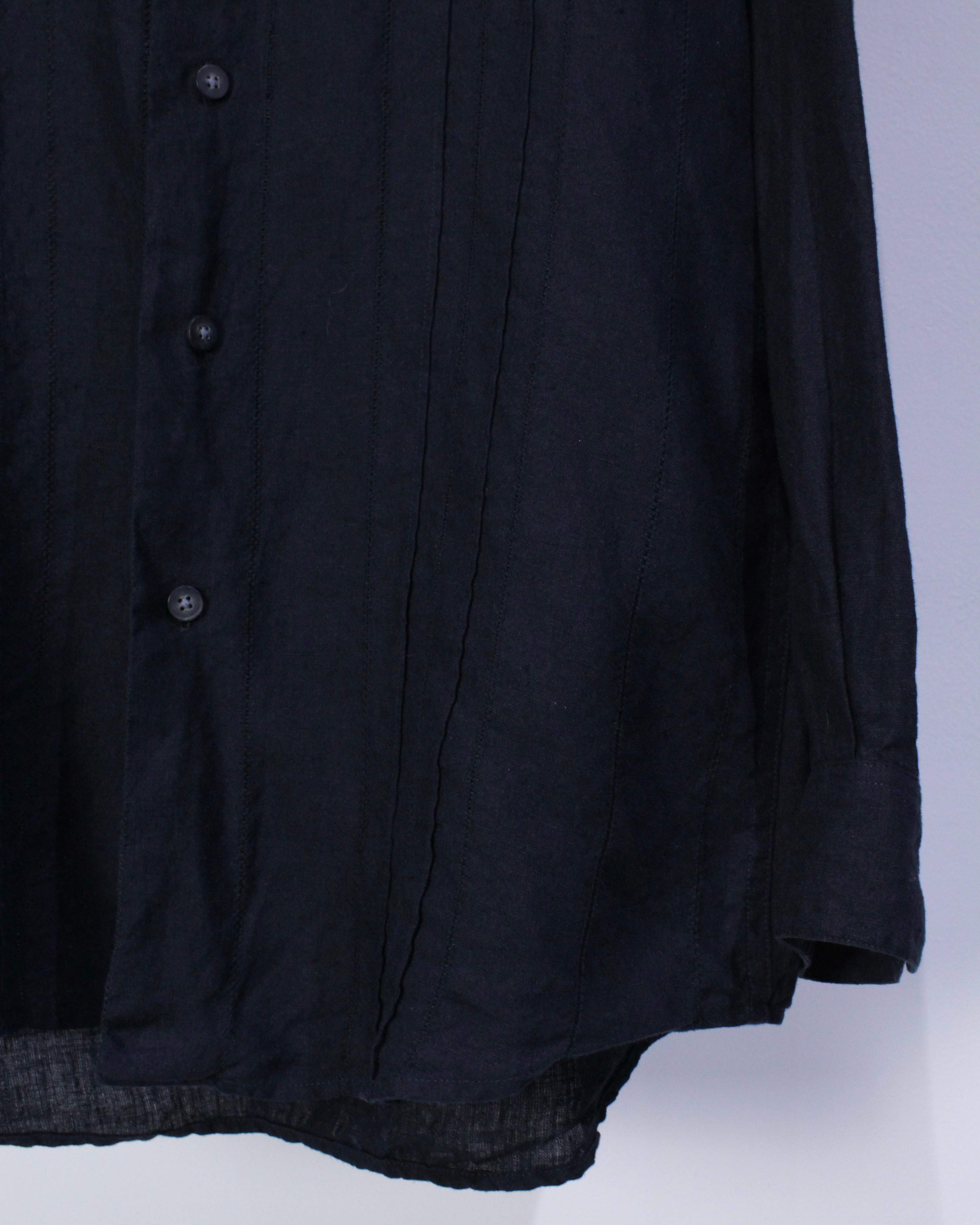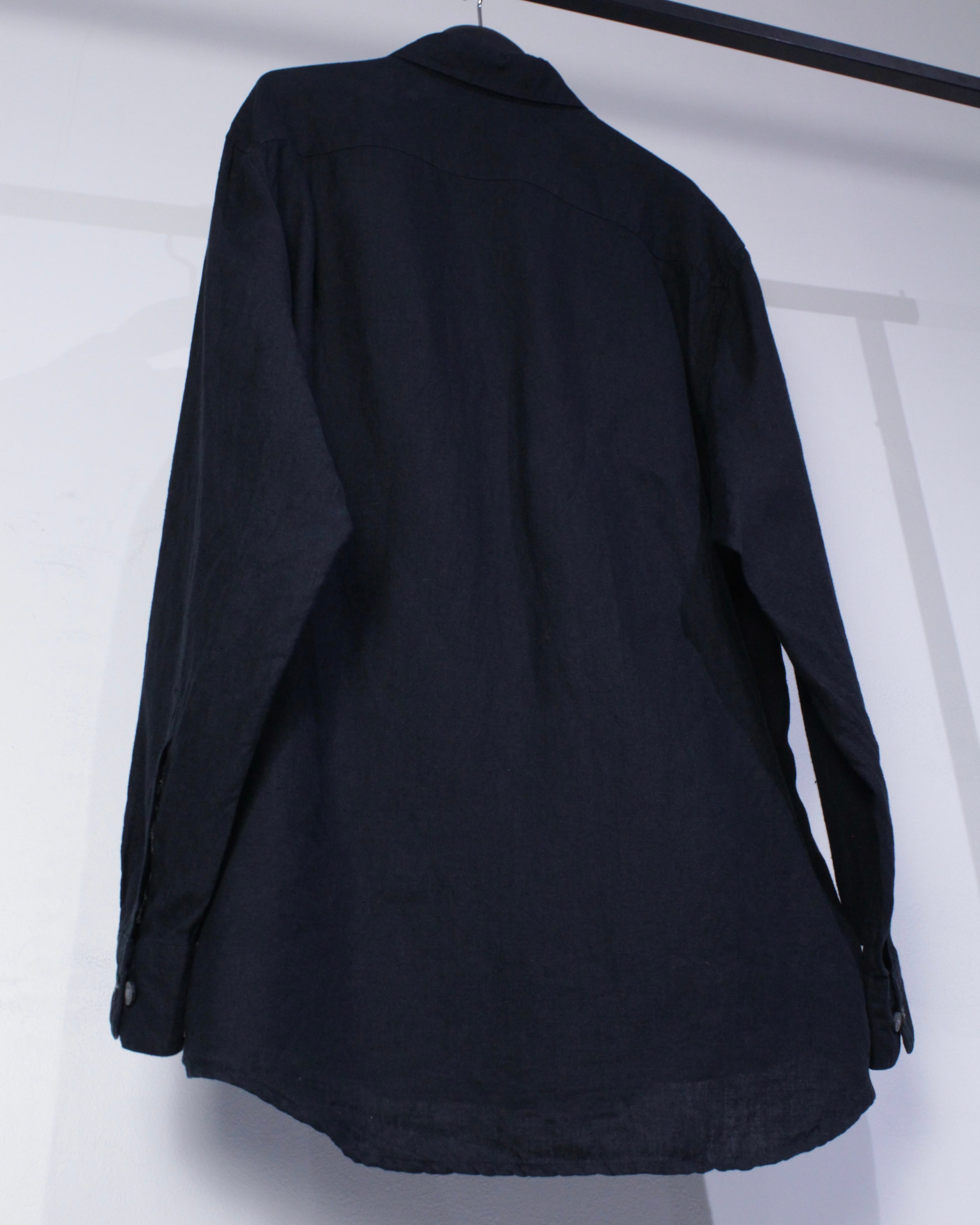 ナチュラルなリネンを用いていながらオールブラックで仕上げる事で、当店らしいモードな雰囲気を纏った1着に。
