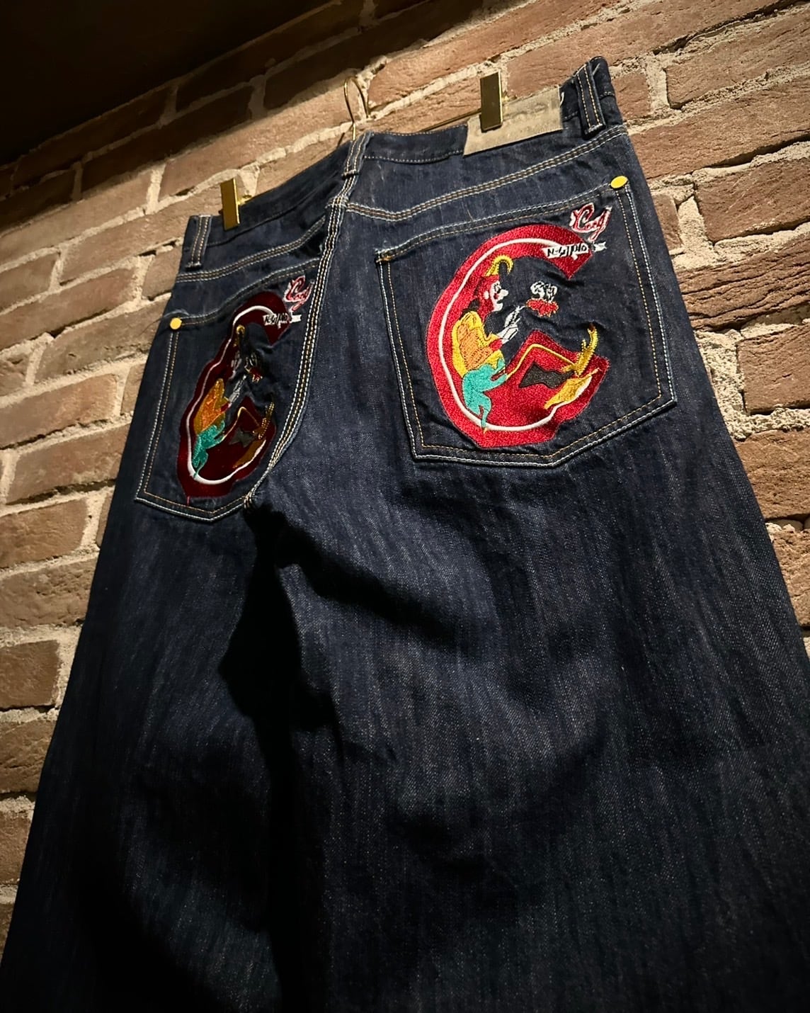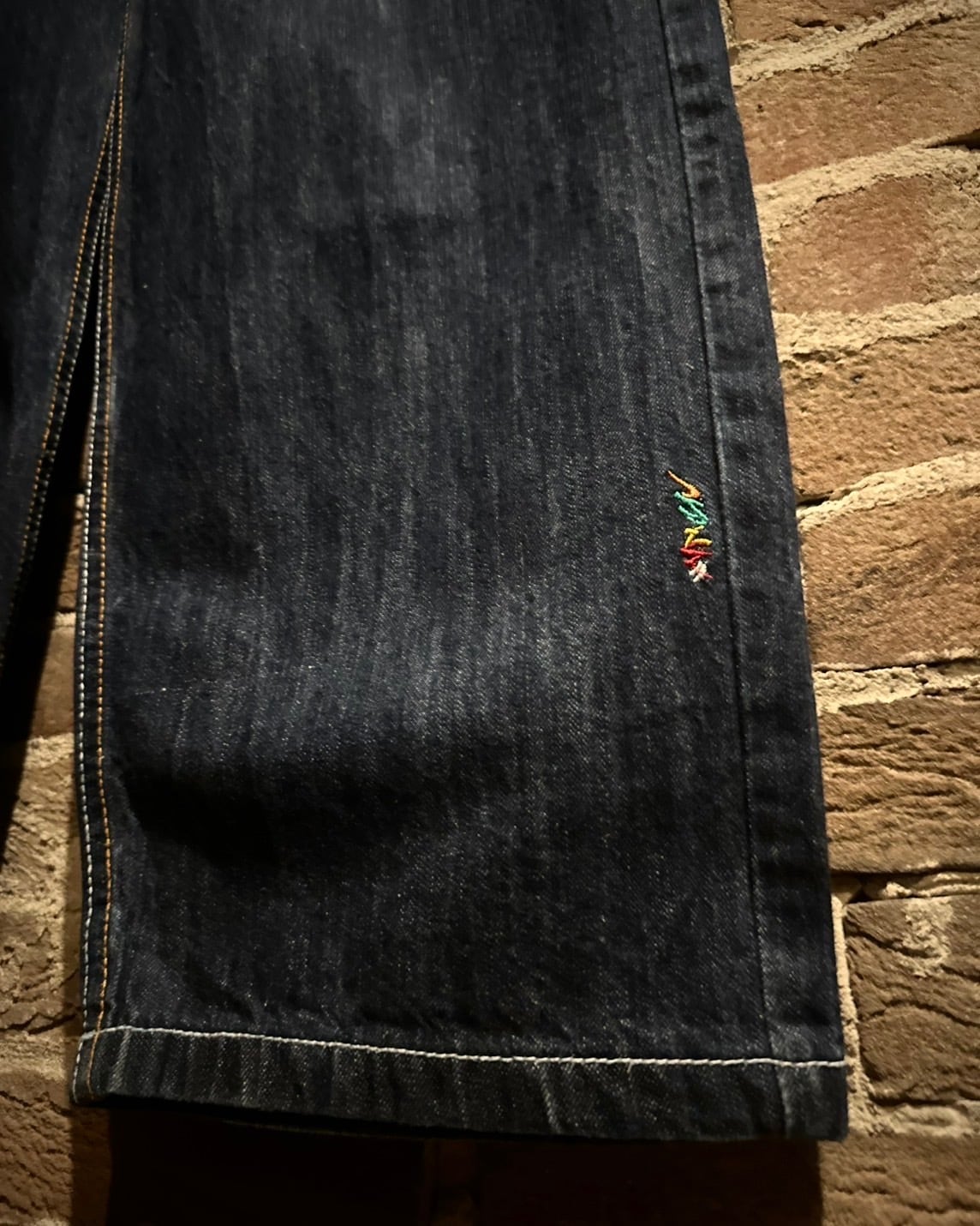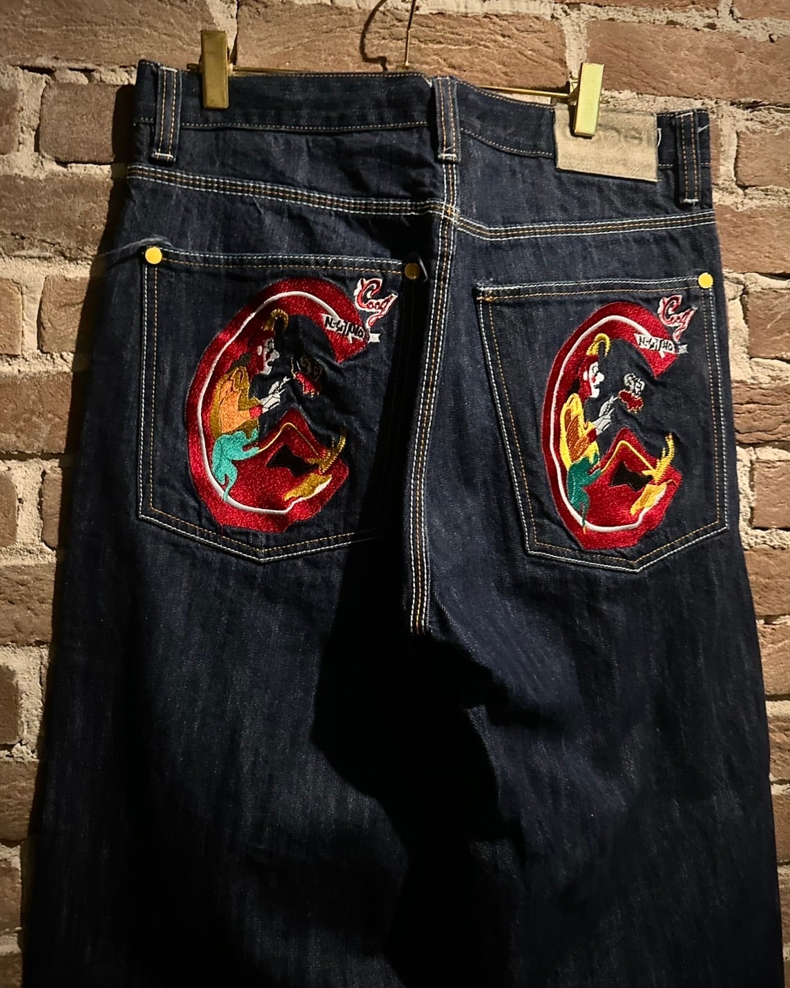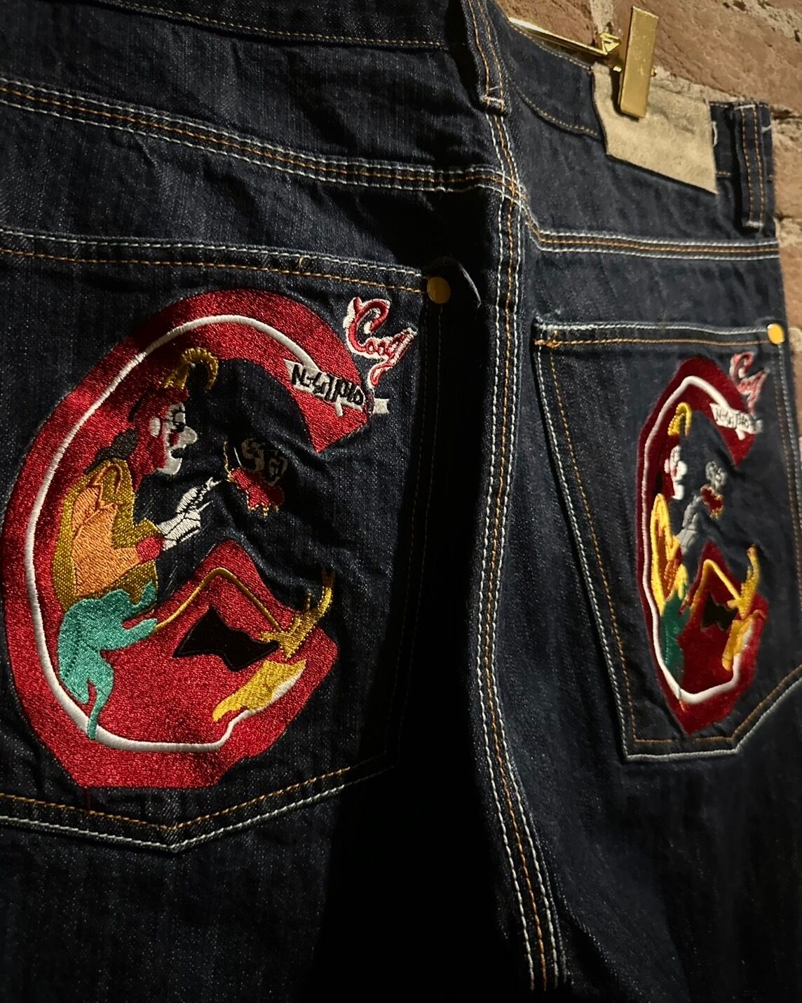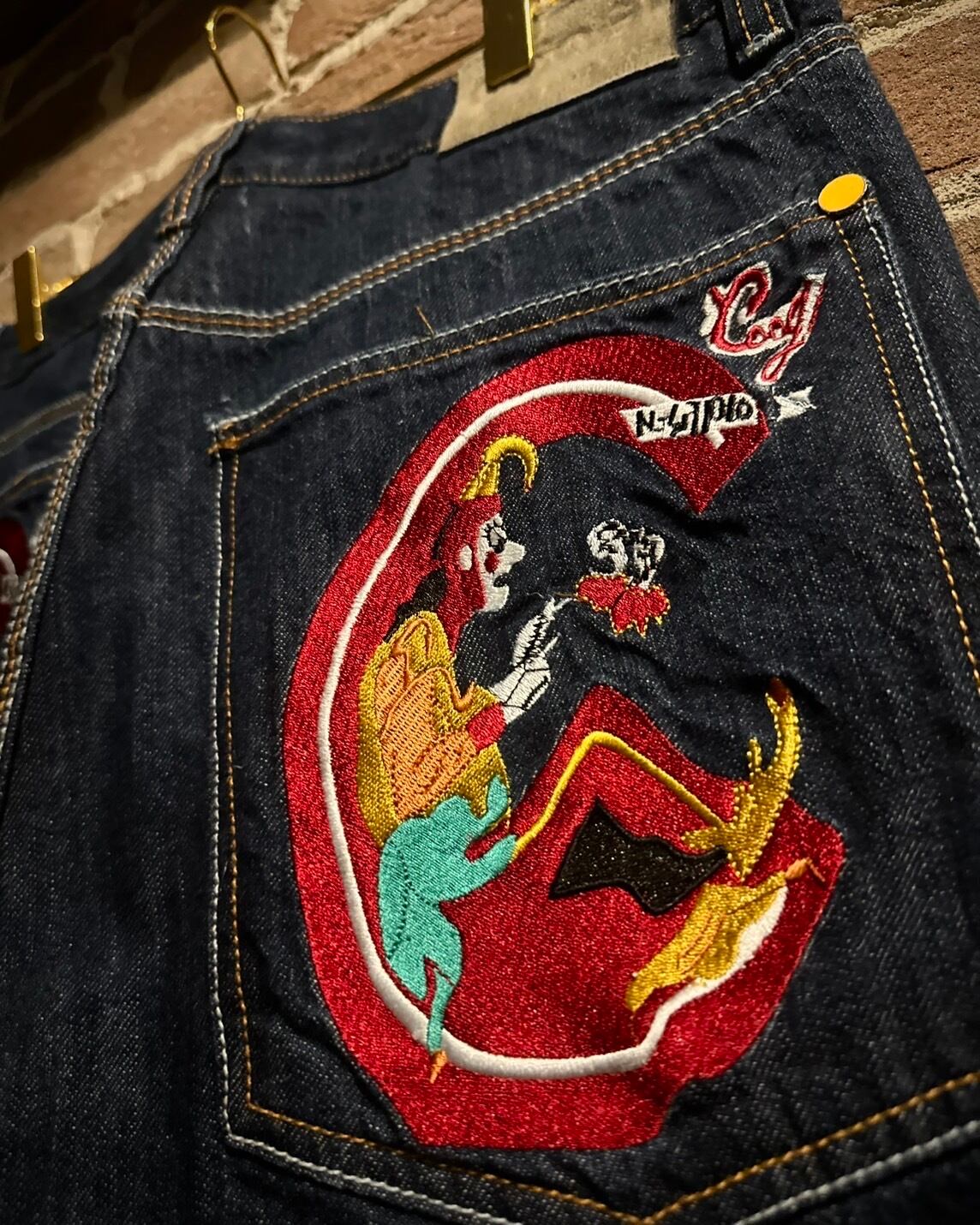 色残りがしっかりとあるインディゴのボディに、バックポケットにピエロを、コインポケットにも同様のデザインを刺繍を刻んだワイドデニムパンツ。