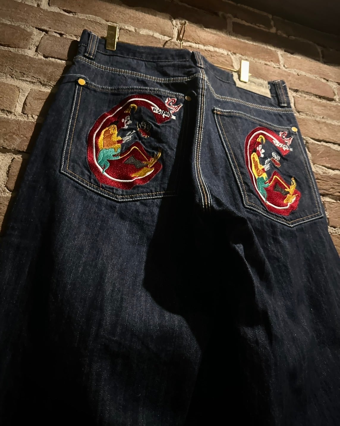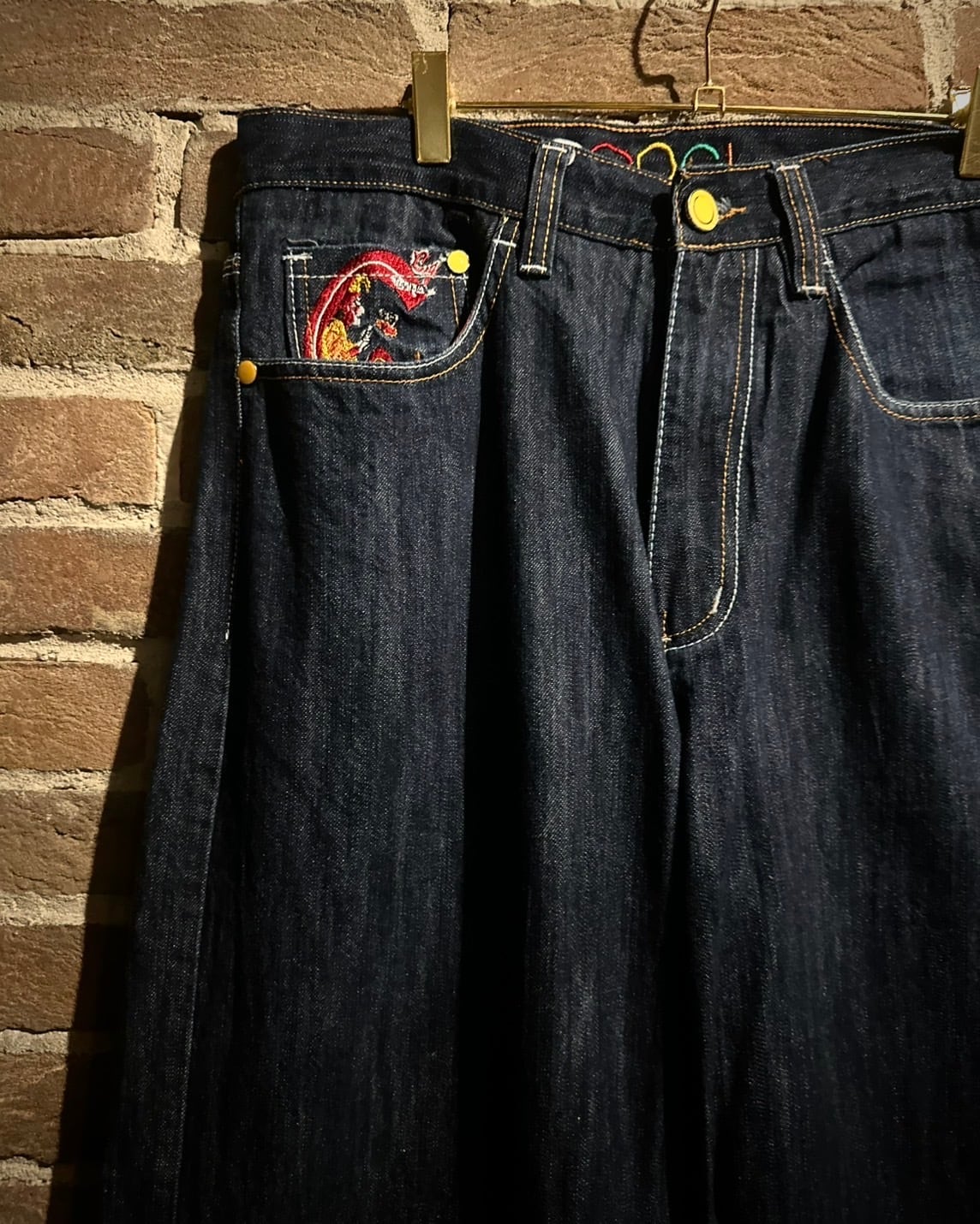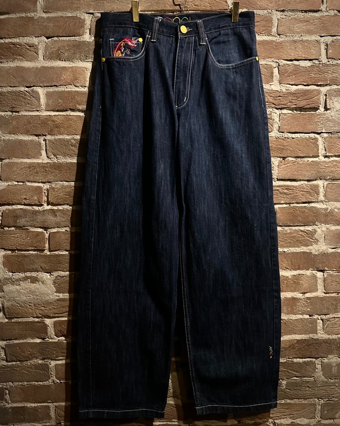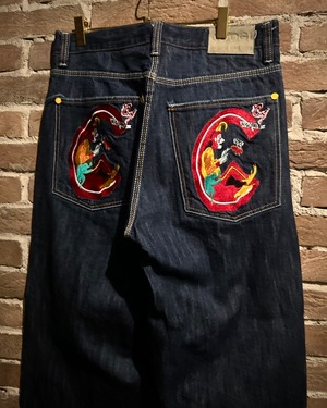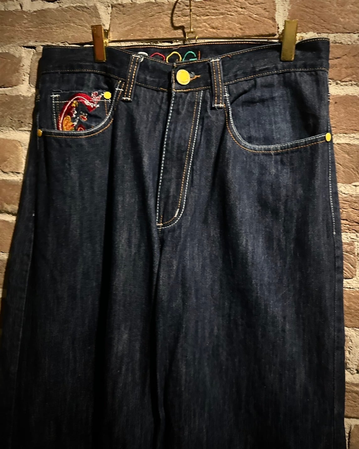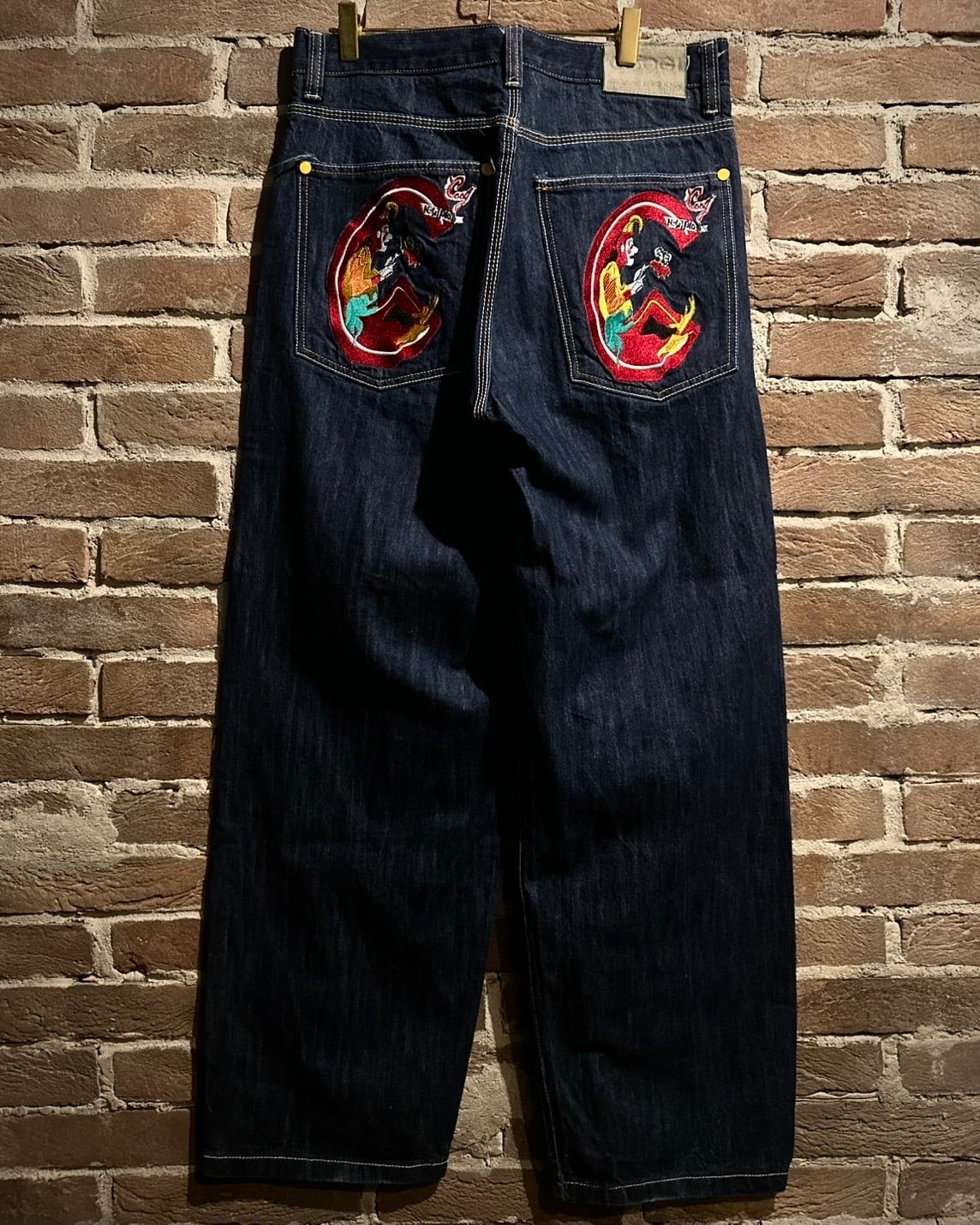 色残りがしっかりとあるインディゴのボディに、バックポケットにピエロを、コインポケットにも同様のデザインを刺繍を刻んだワイドデニムパンツ。