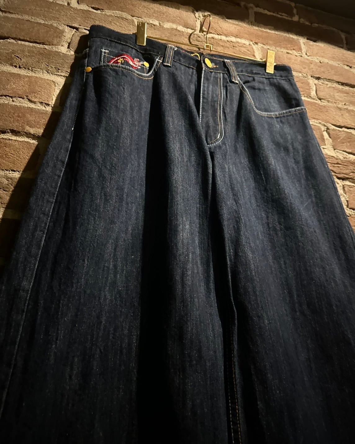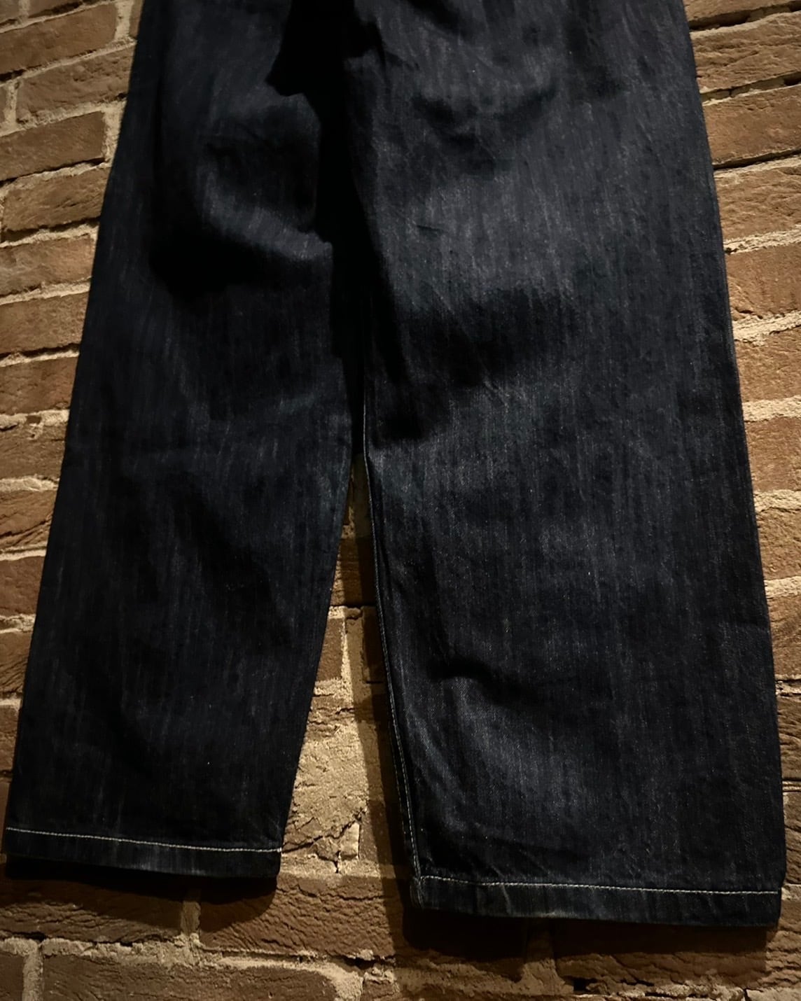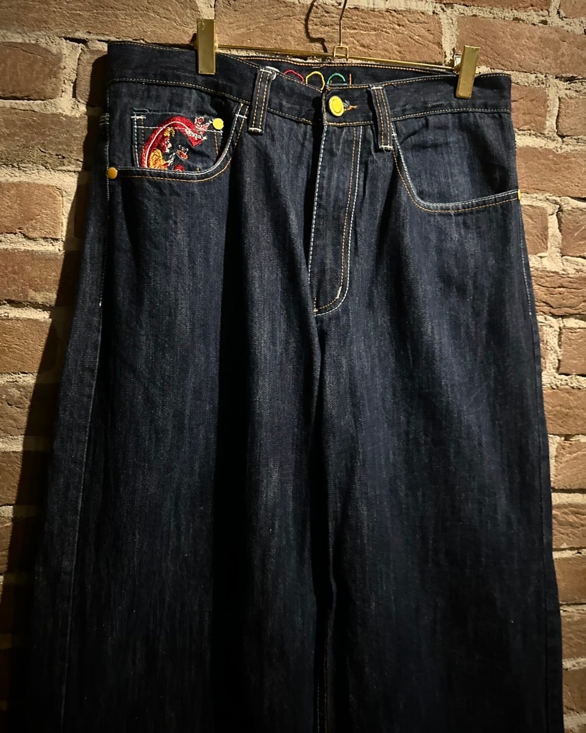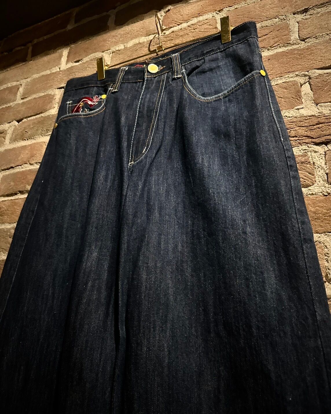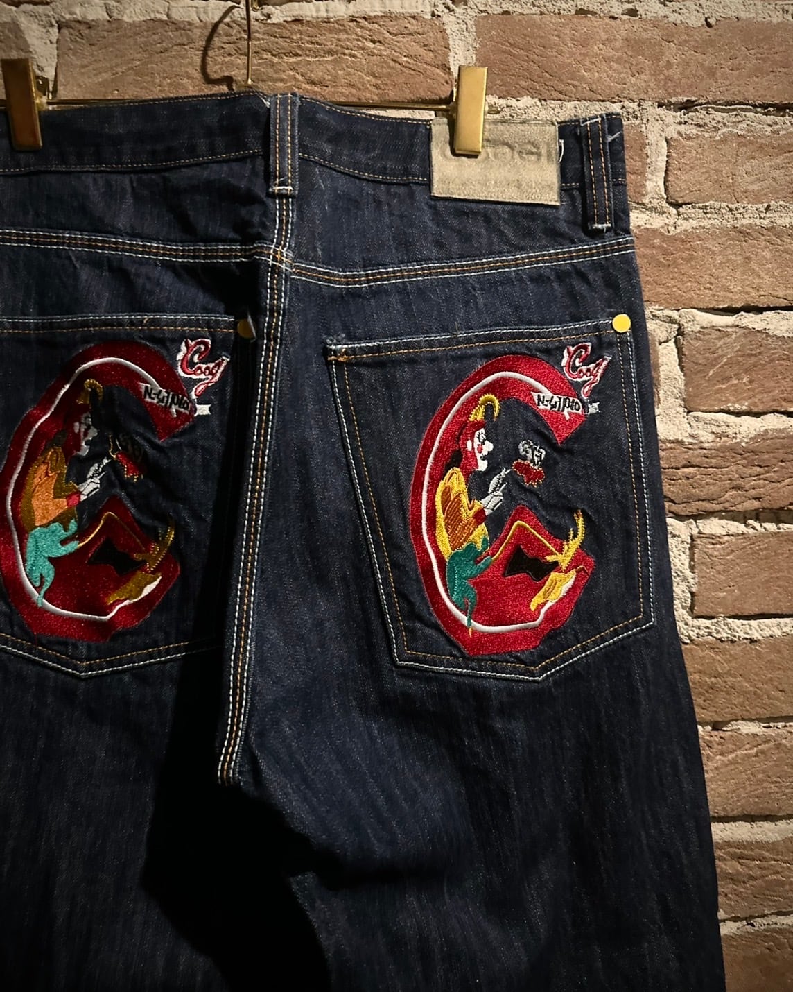色残りがしっかりとあるインディゴのボディに、バックポケットにピエロを、コインポケットにも同様のデザインを刺繍を刻んだワイドデニムパンツ。