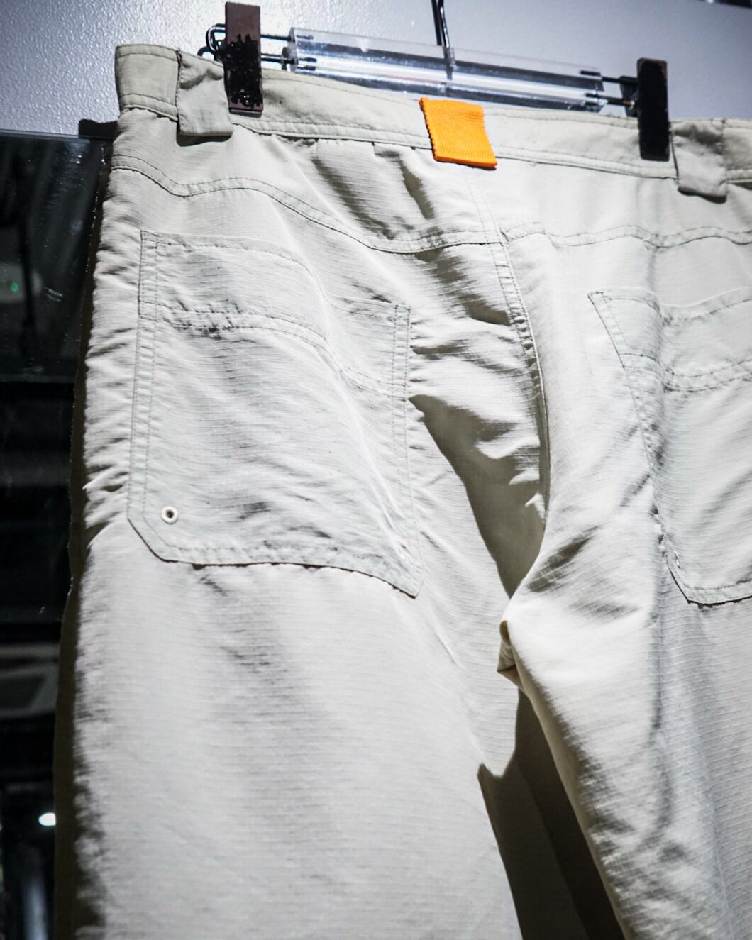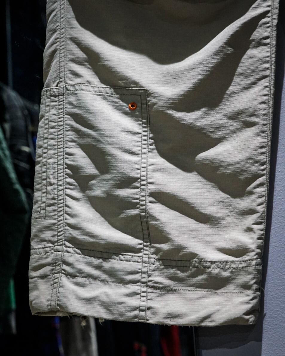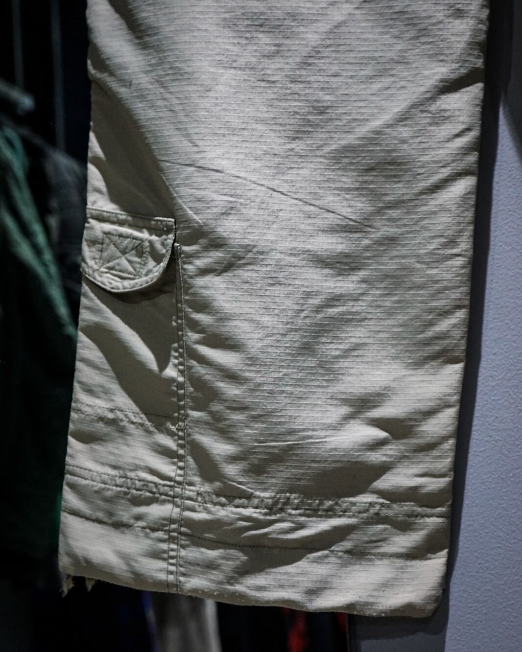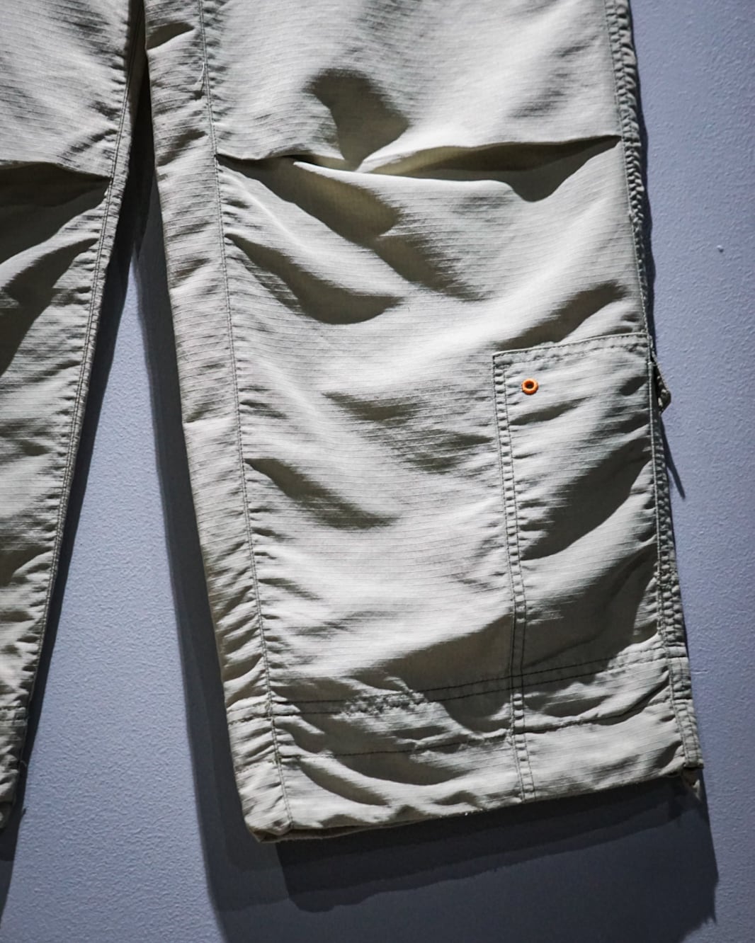 タフかつ強度の高いリップストップナイロンのに、フラップポケットのギミックを載せたナイロンパンツ。