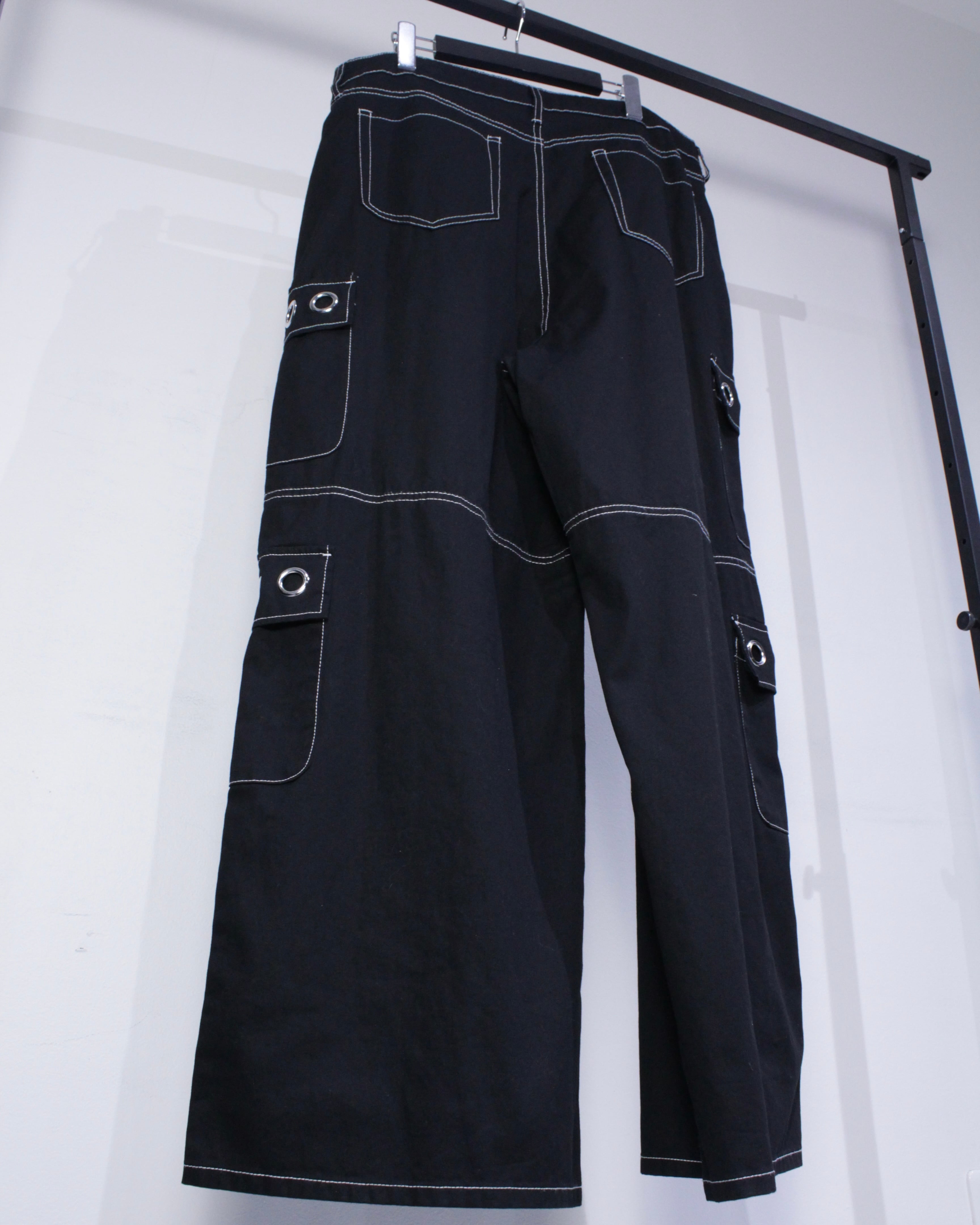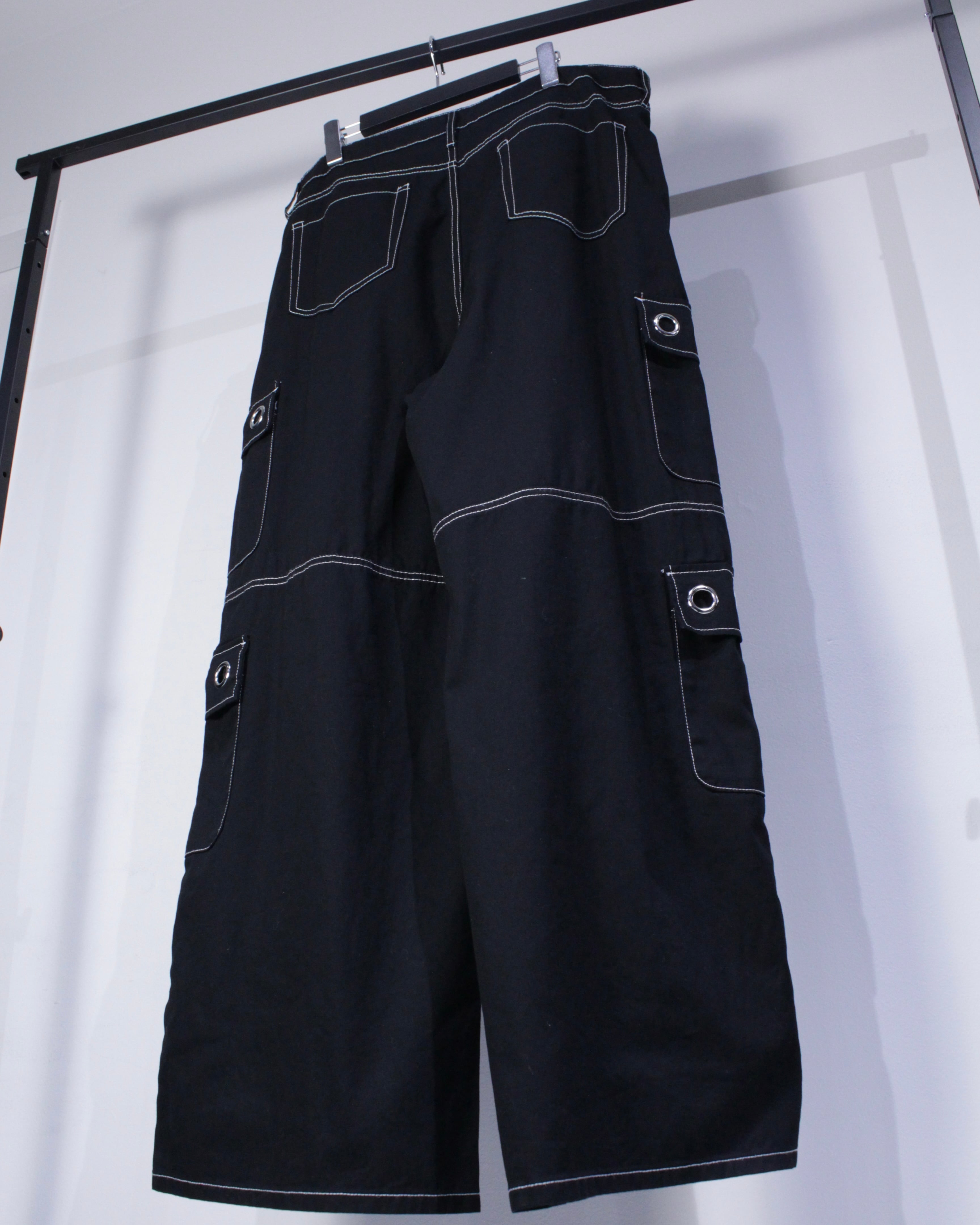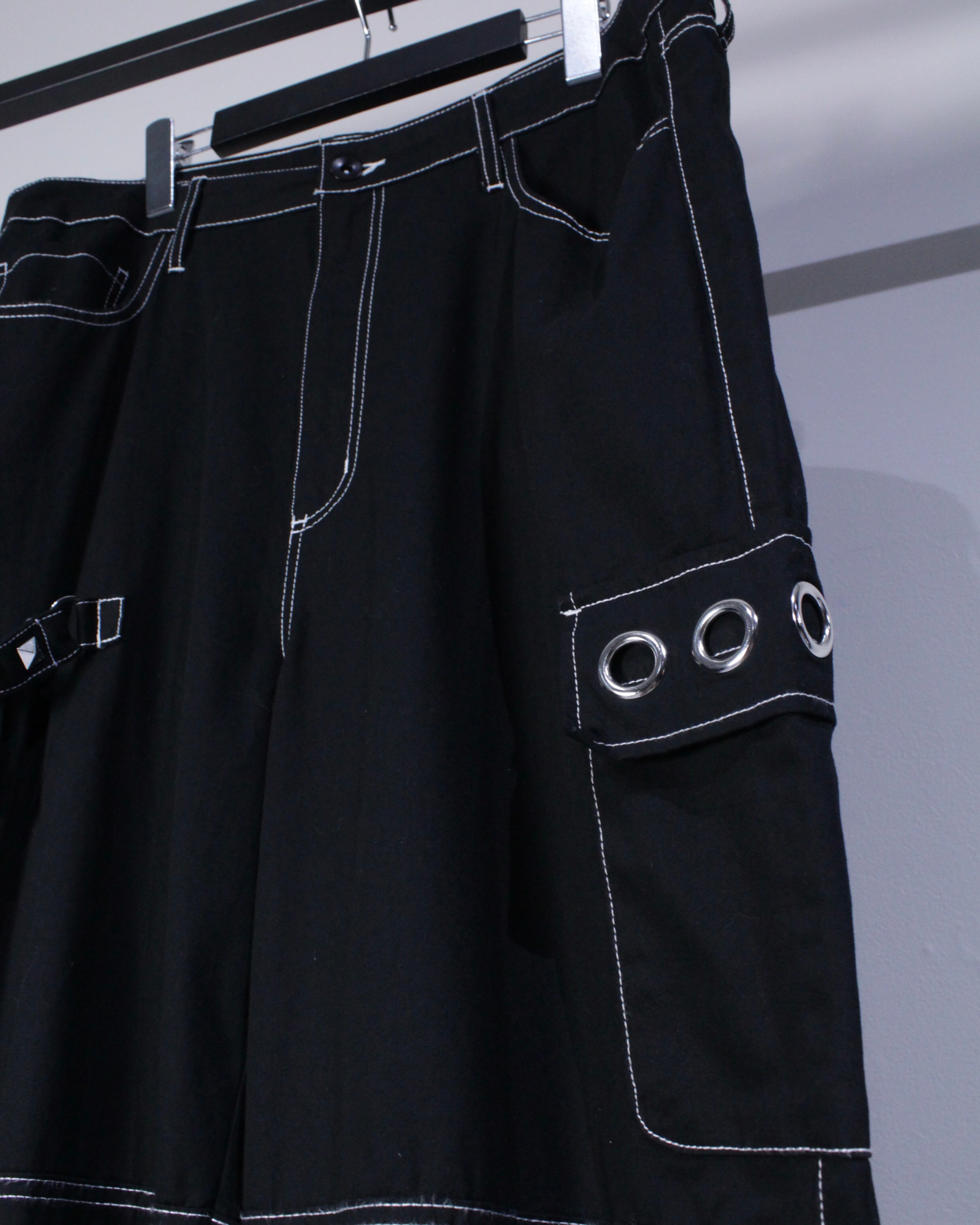 ハリのあるブラックのボディに、様々な装飾を施したカーゴパンツ。