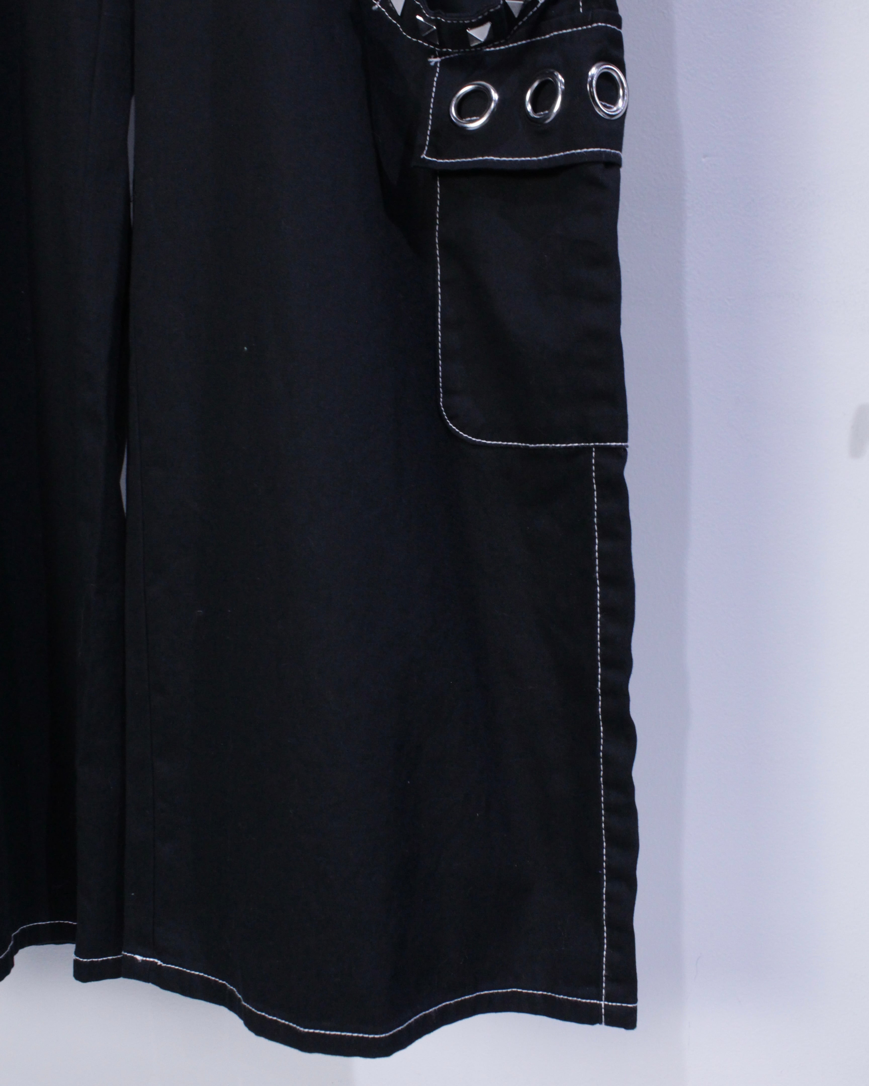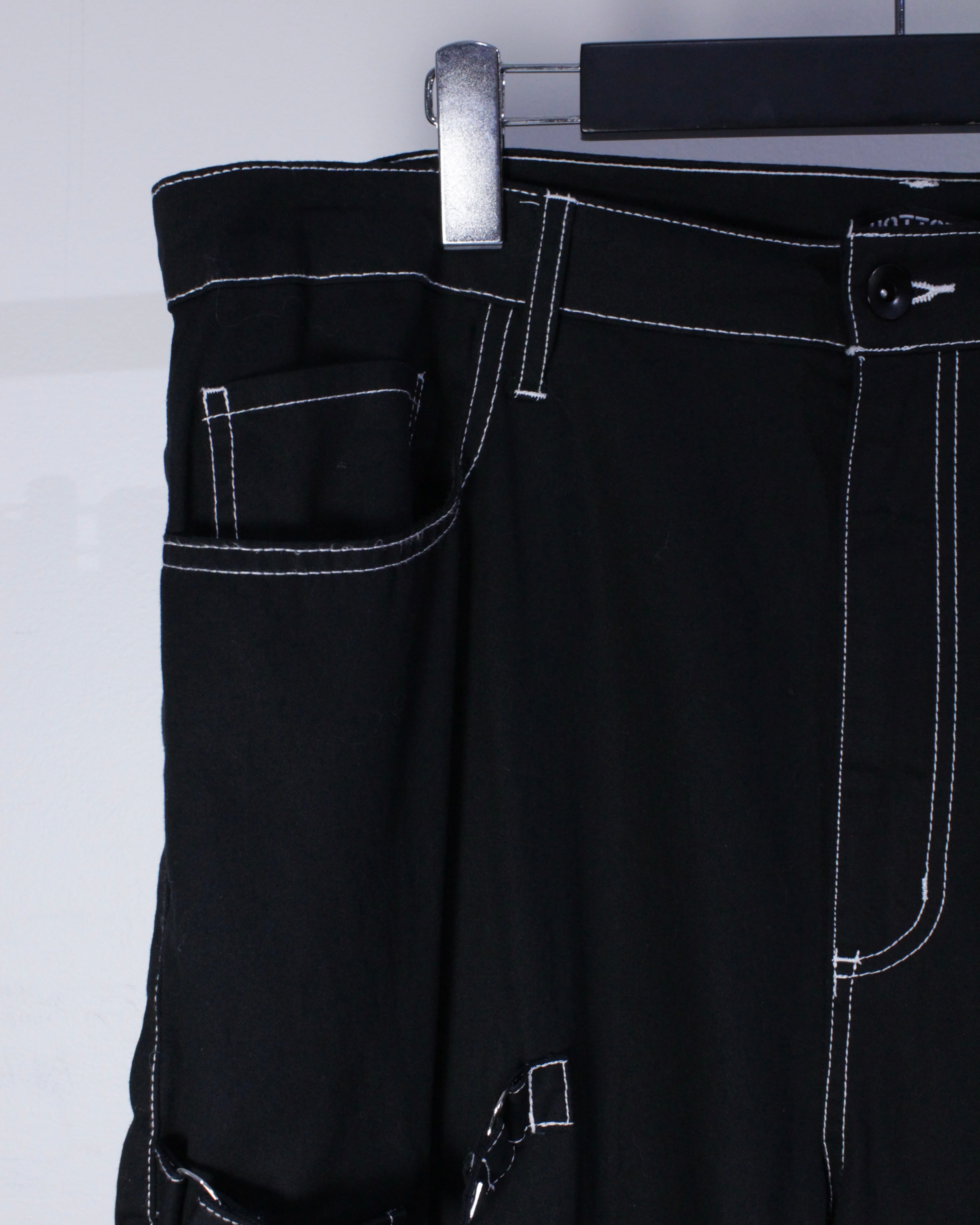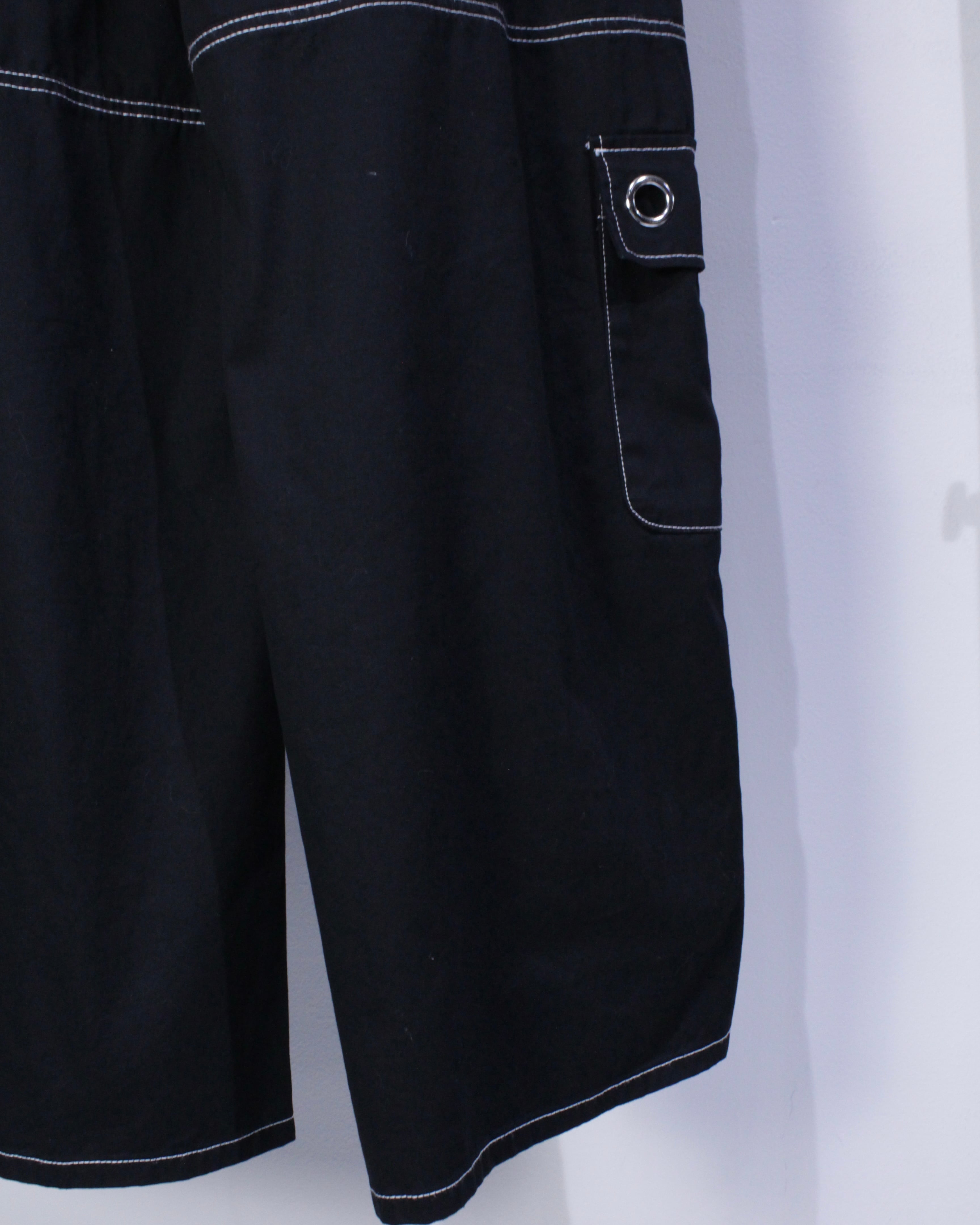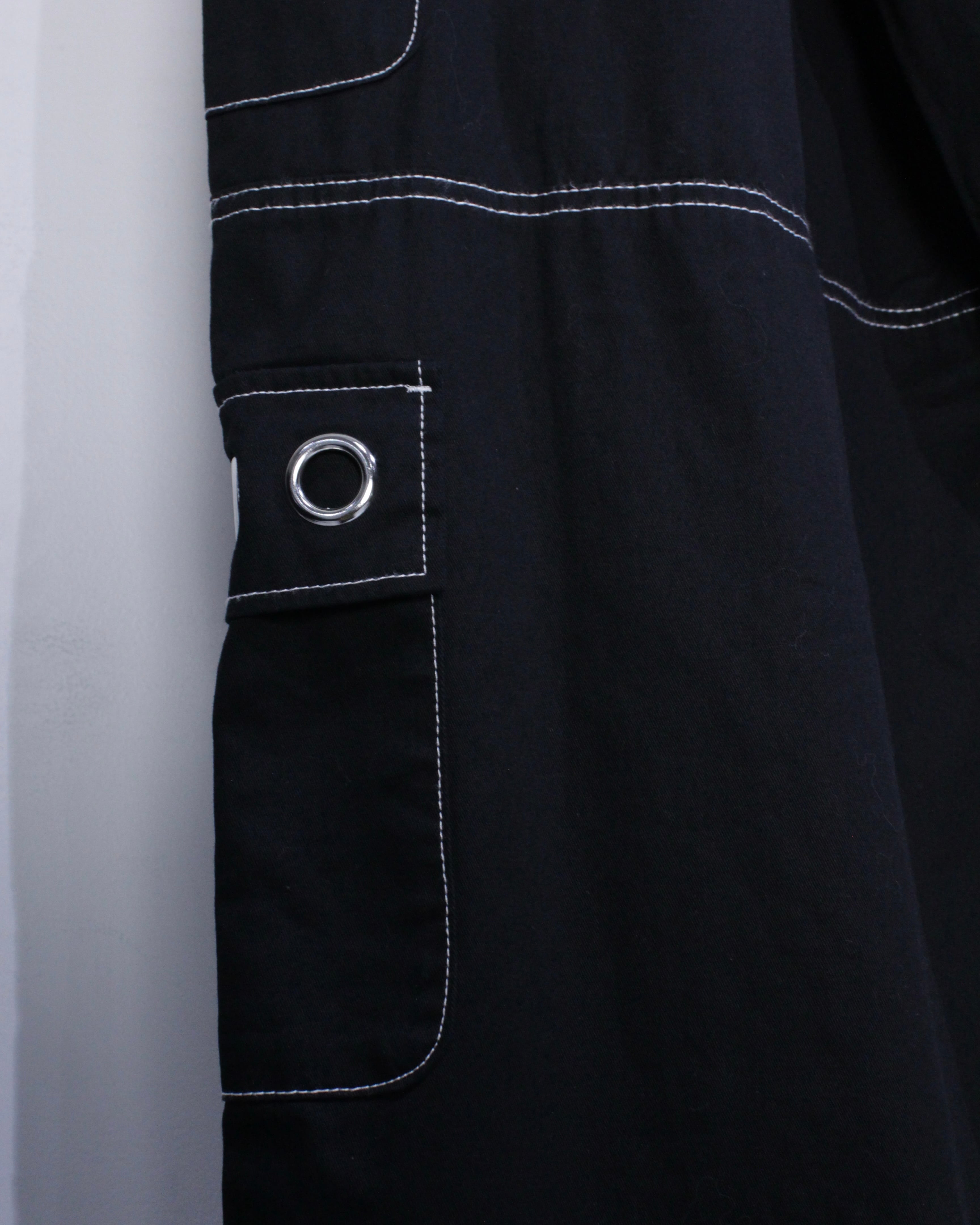 ハリのあるブラックのボディに、様々な装飾を施したカーゴパンツ。