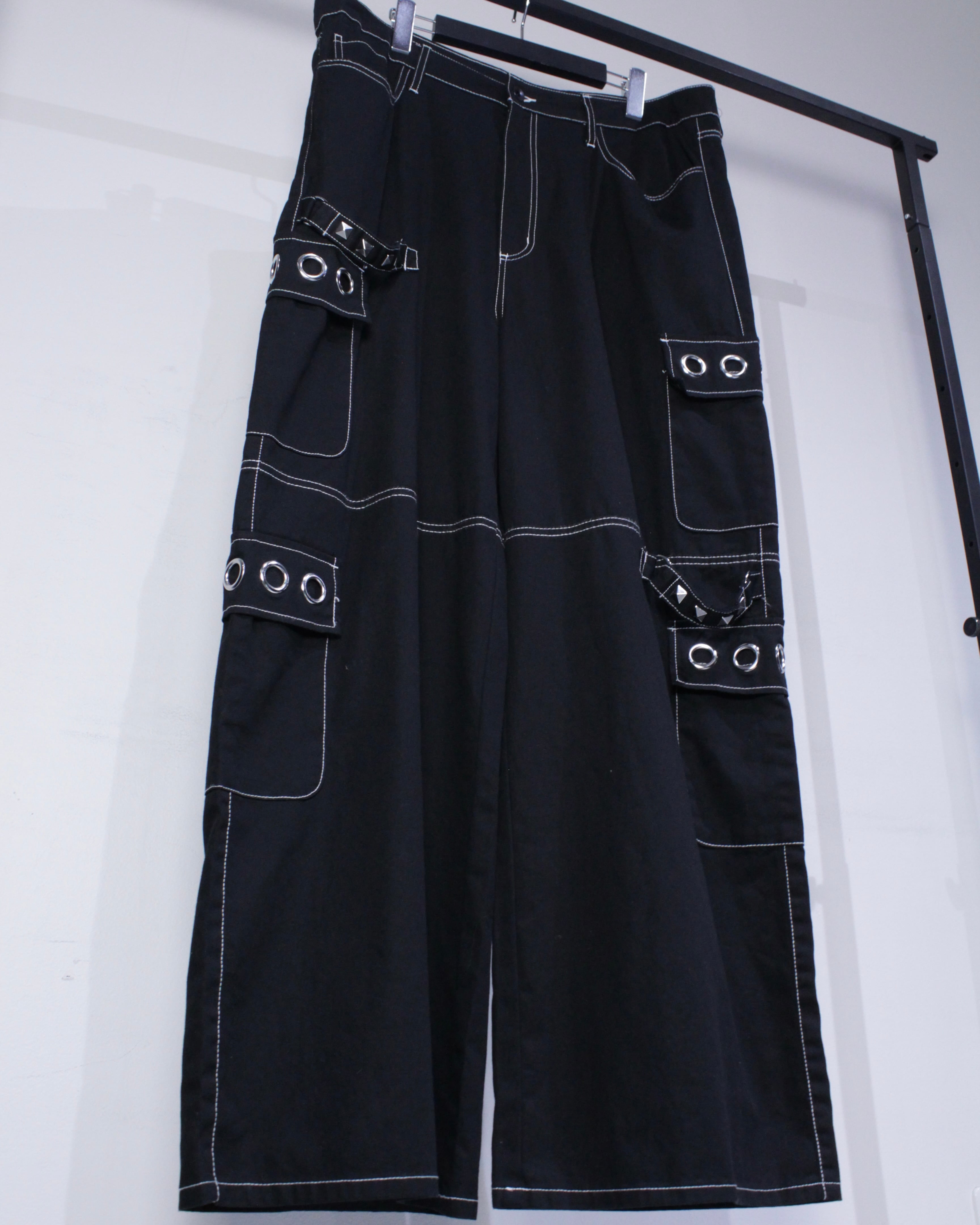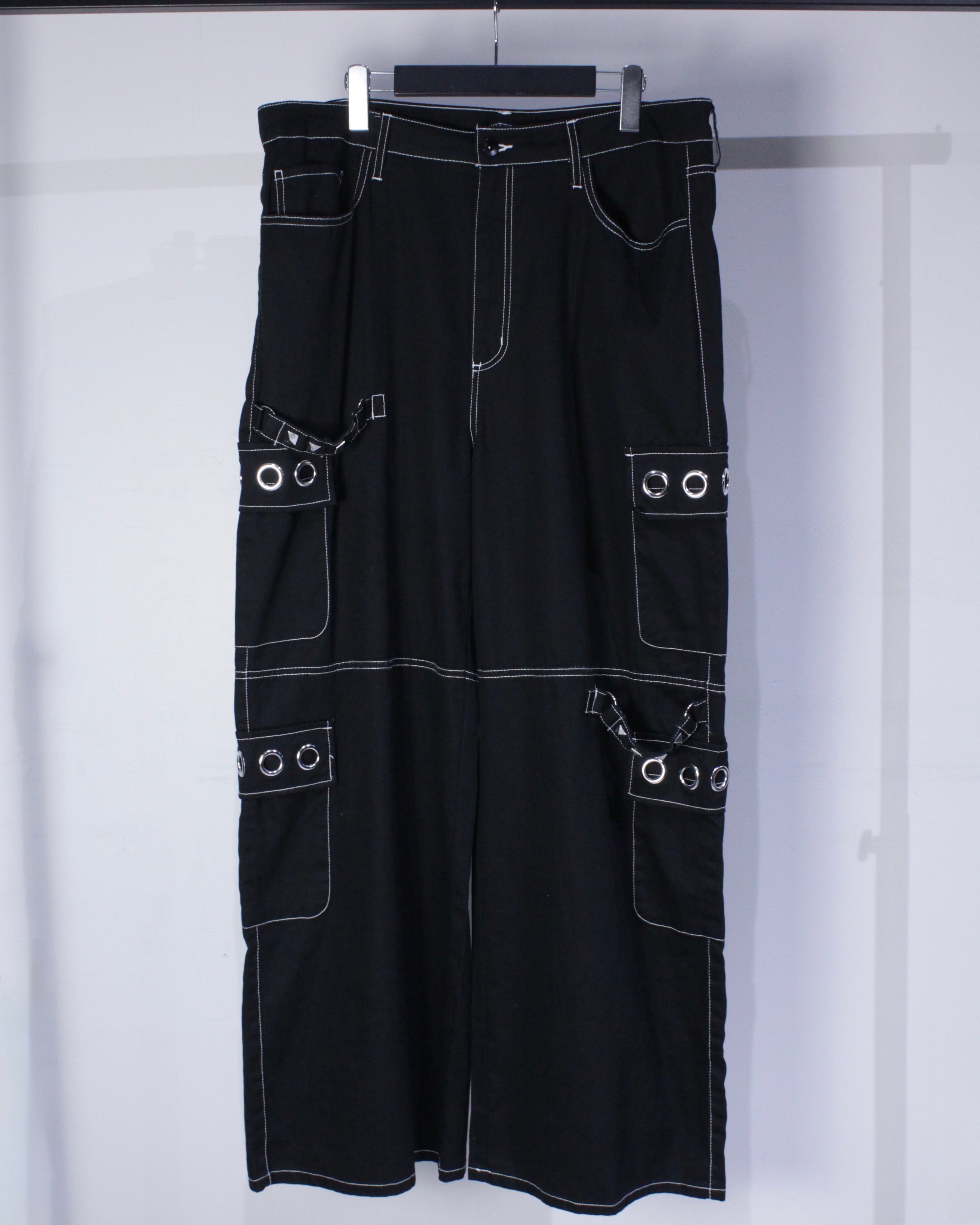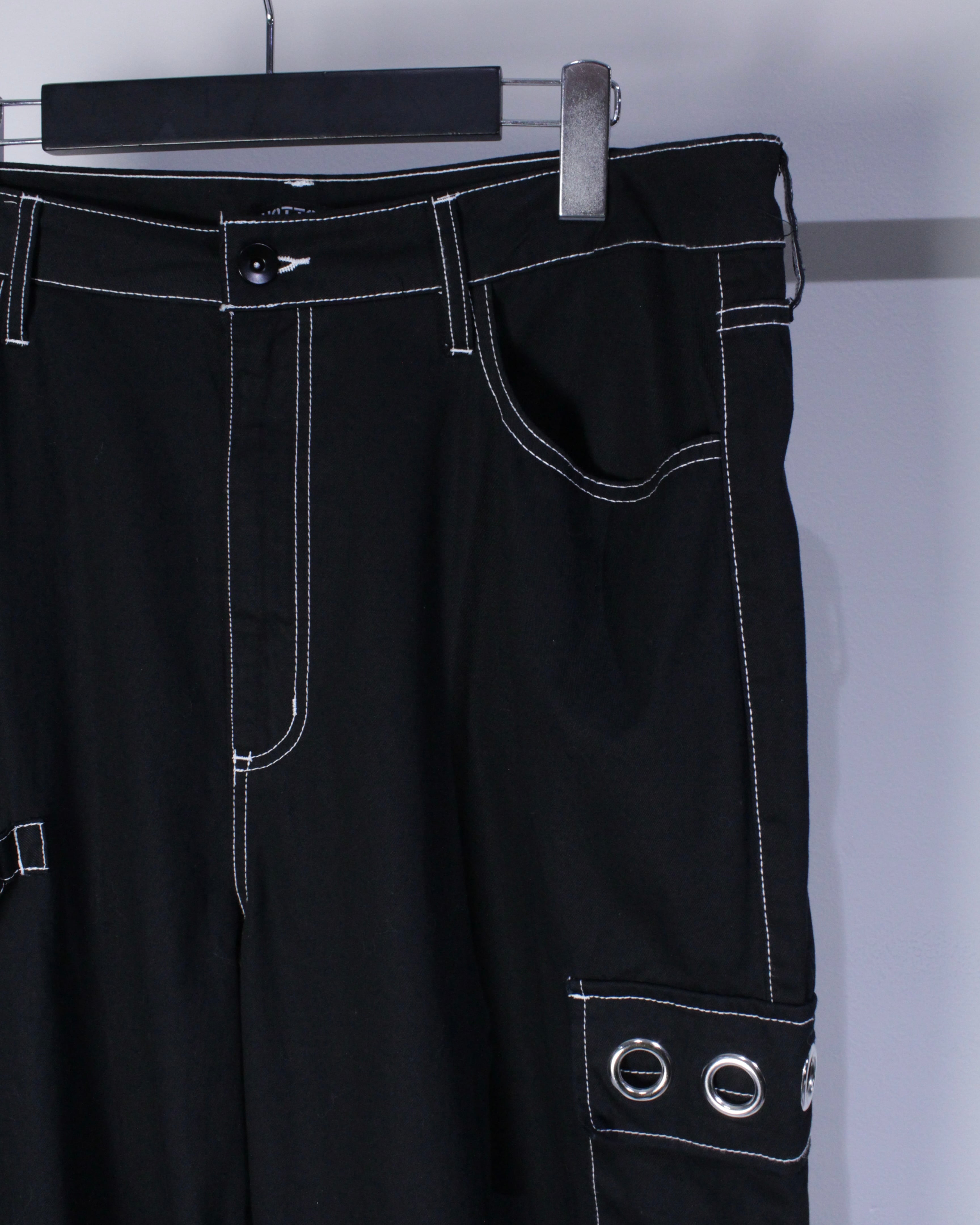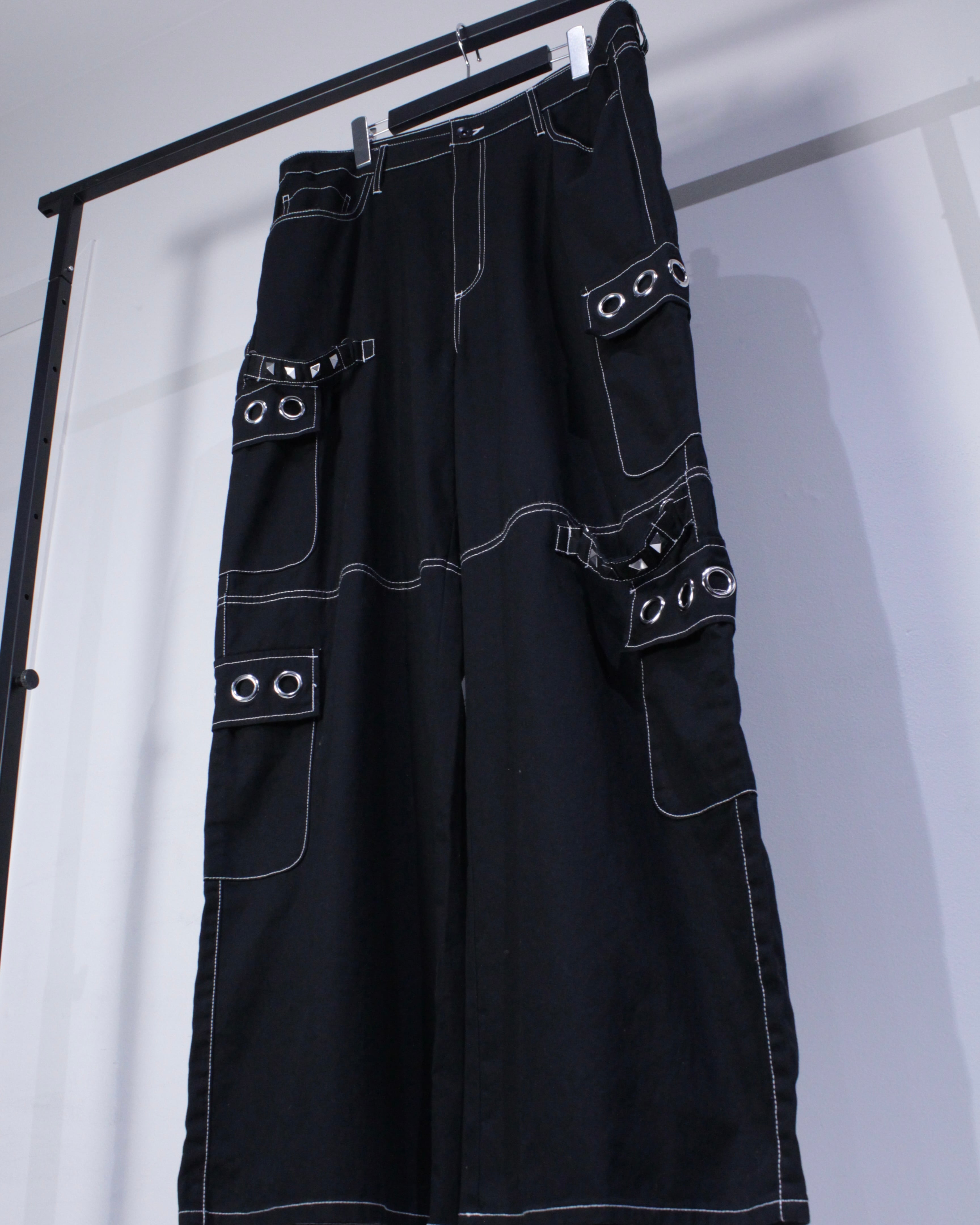 ボディサイドのカーゴポケットのフラップに大きめのアイレット、ベルトにスタッズの装飾。カジュアルなカーゴパンツがパンキッシュかつモードなルックスに仕上がっています。白のステッチのアクセントも◎