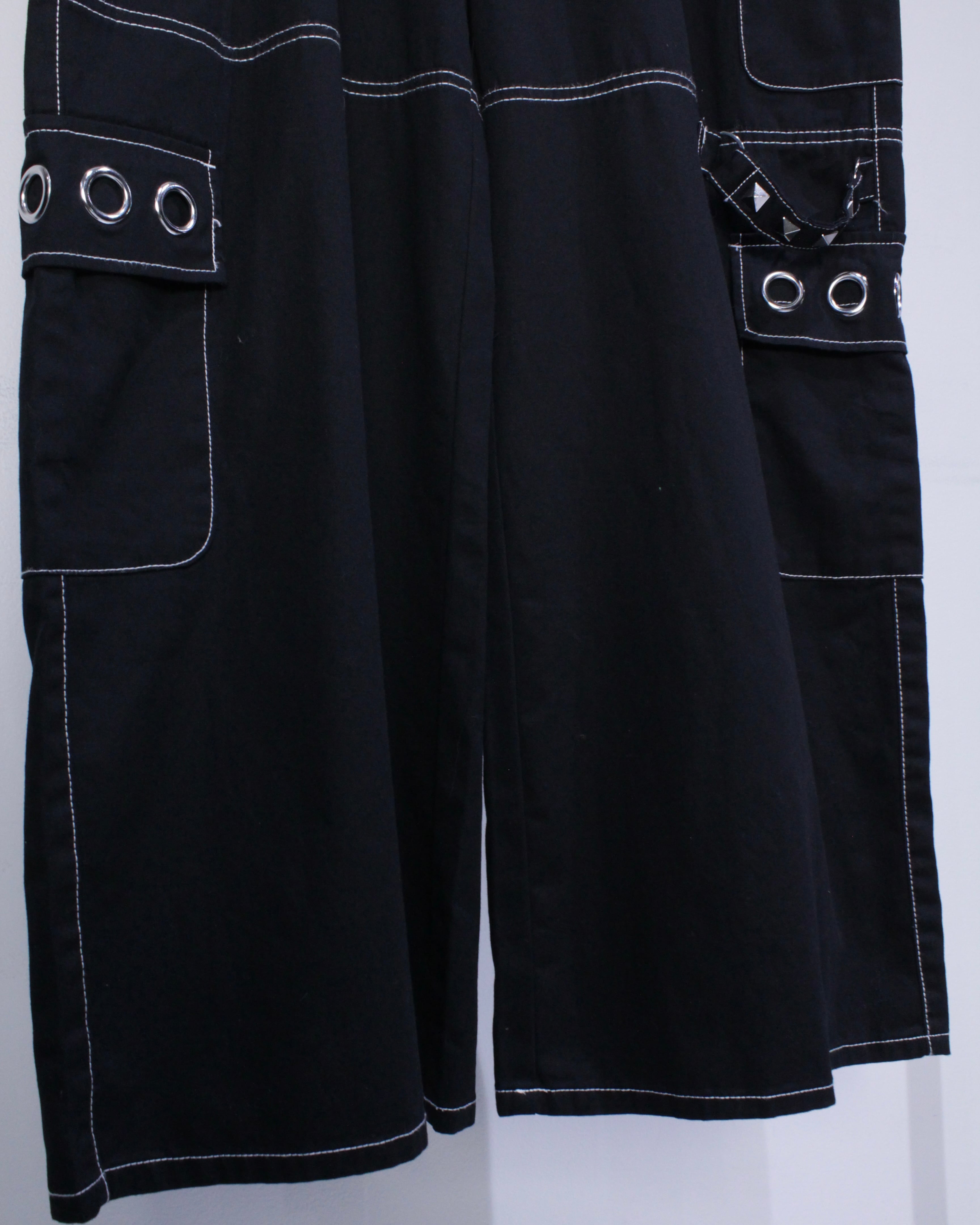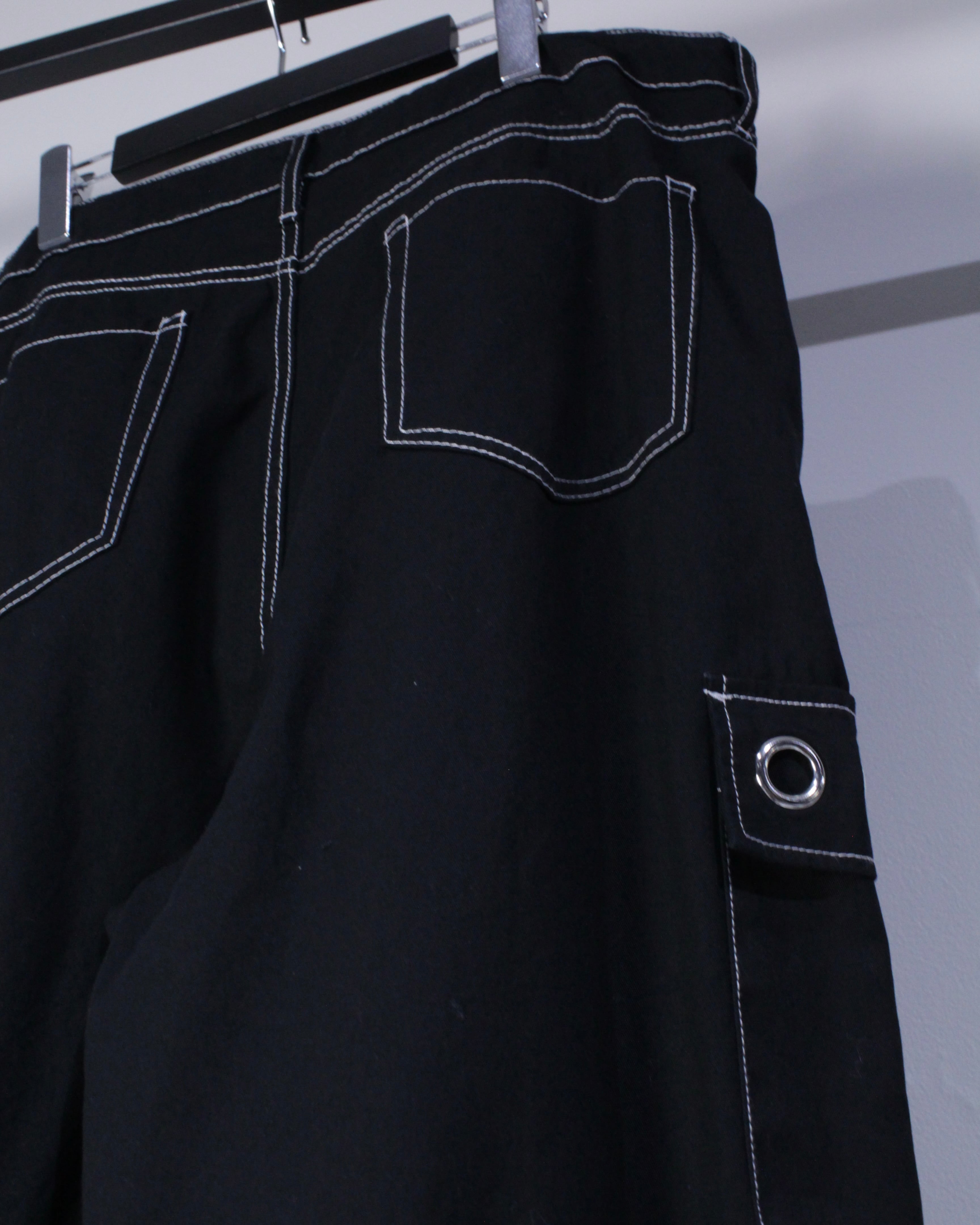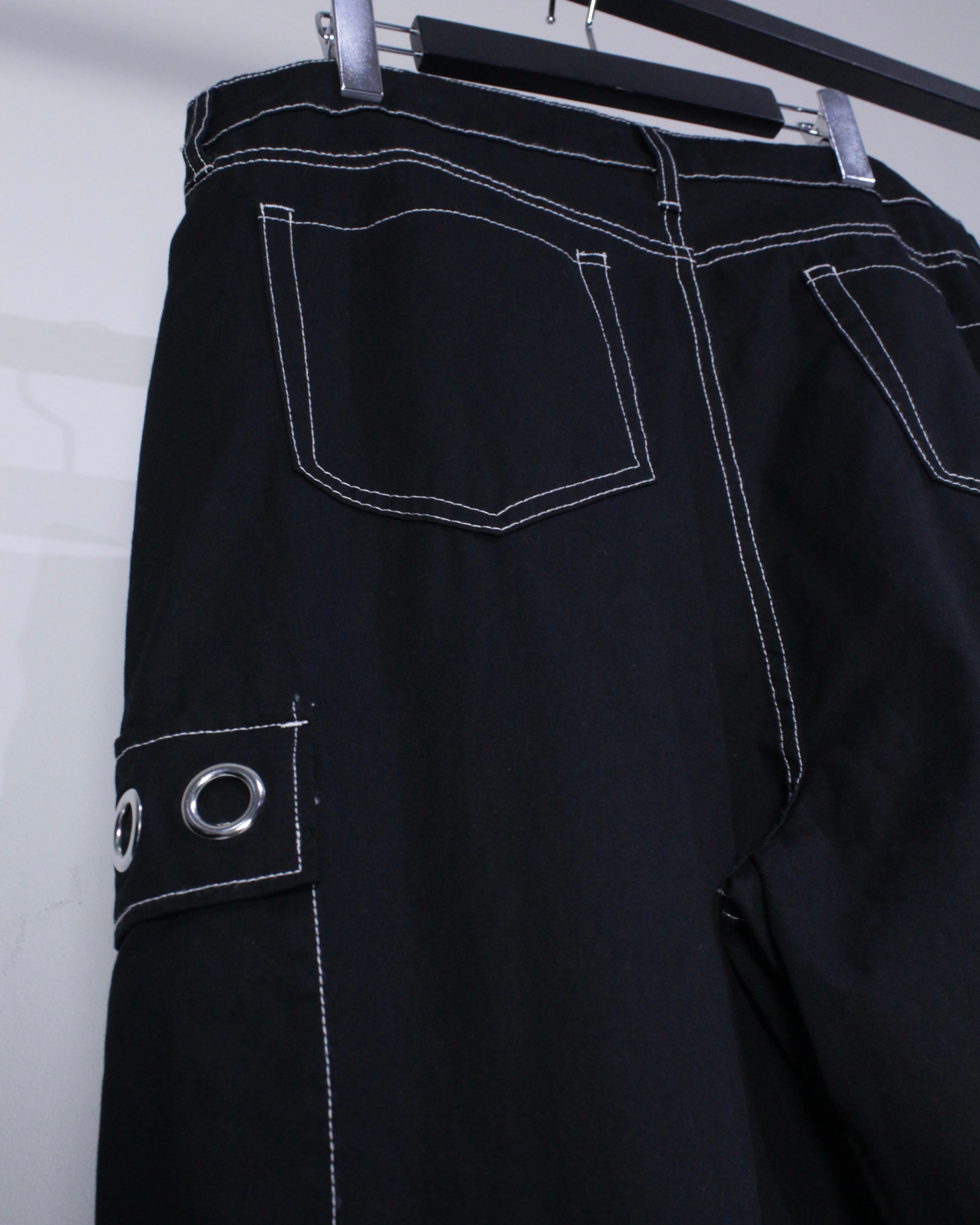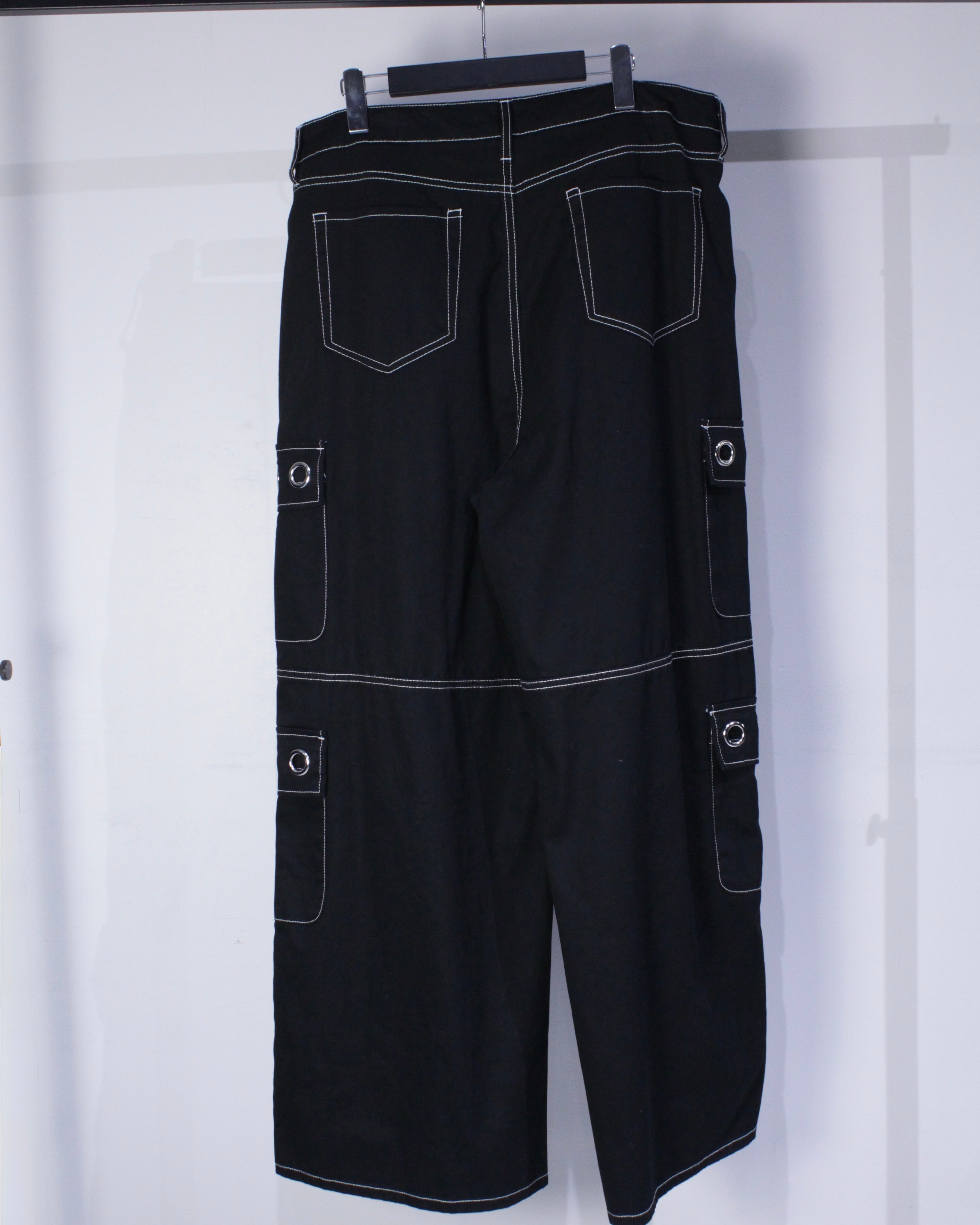 ボディサイドのカーゴポケットのフラップに大きめのアイレット、ベルトにスタッズの装飾。カジュアルなカーゴパンツがパンキッシュかつモードなルックスに仕上がっています。白のステッチのアクセントも◎